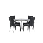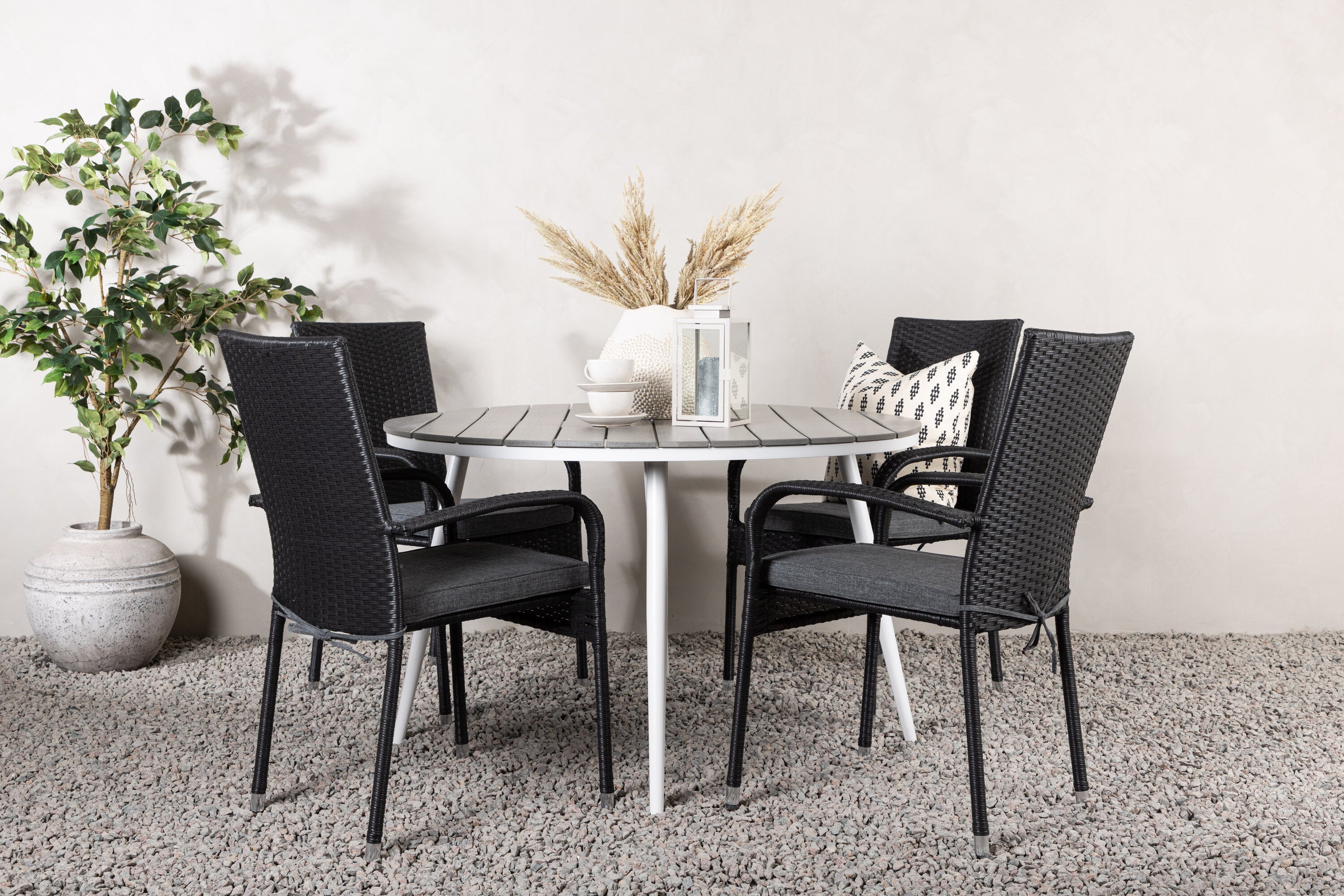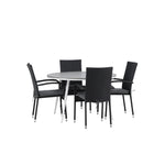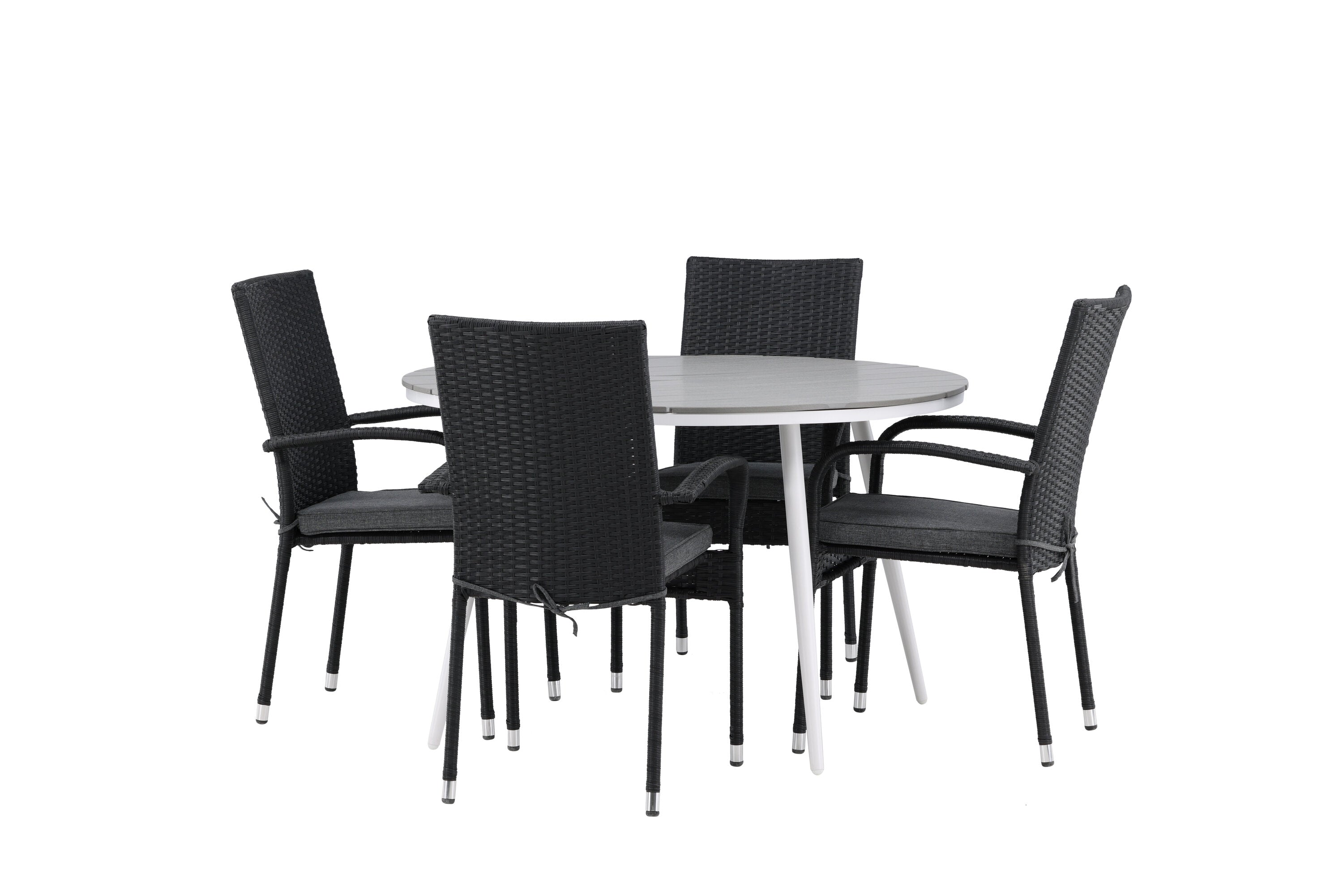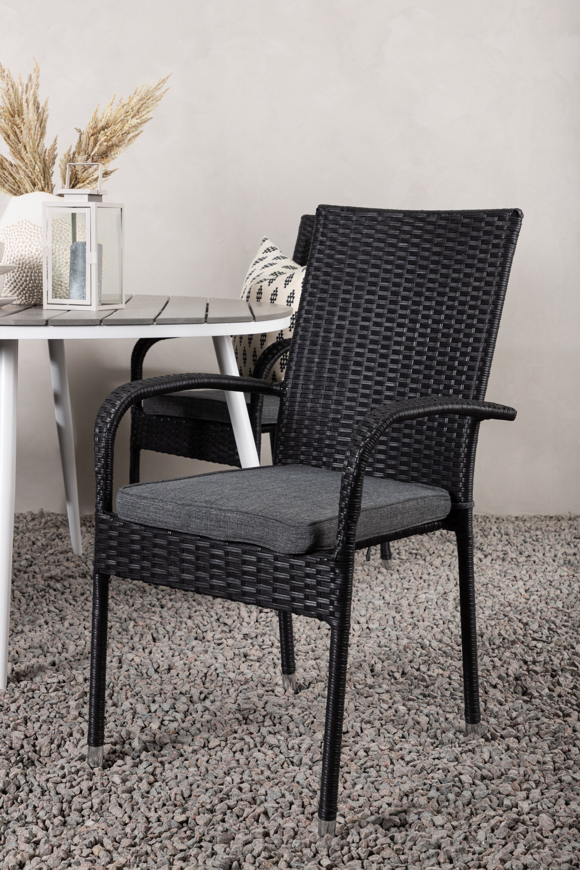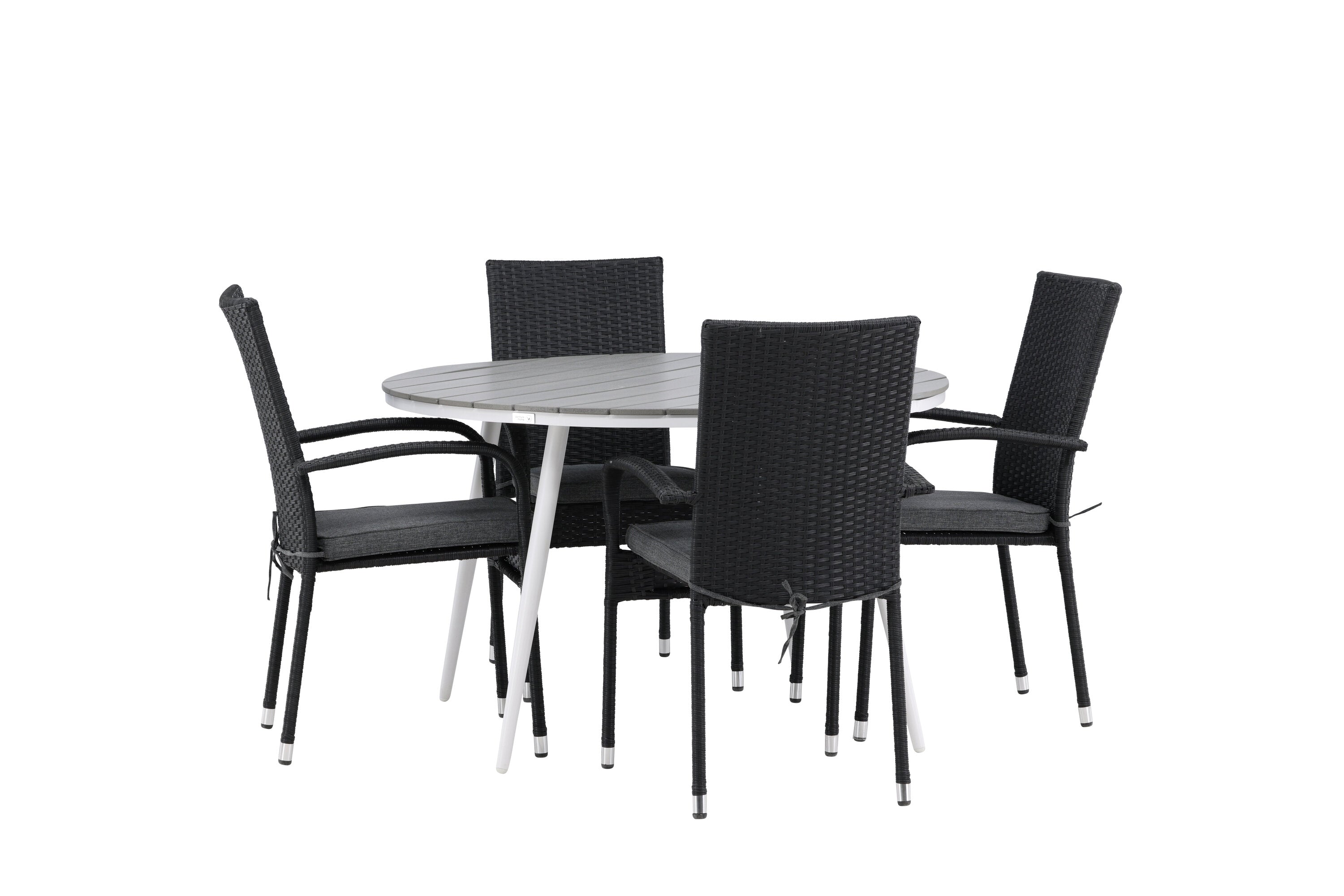 Pohodlně se usaďte v příjemné jídelní skupině, kde nikdo neriskuje, že se dostane na okraj! Jídelní stůl Break má klasický design s kulatou stolní deskou v šedé barvě Aintwood a lehce rozšířenými nohami z bílého hliníku. Rozměry: 120ø cm. Zde v moderní kombinaci s pohodlnými jídelními židlemi ze série Anna. Židle je vyrobena z umělého ratanu, má integrované područky, je stohovatelná a dodává se v lahodné černé barvě, kterou lze snadno sladit s dalším nábytkem. Připravte se letos v létě před nočním životem a vychutnejte si jídlo venku!