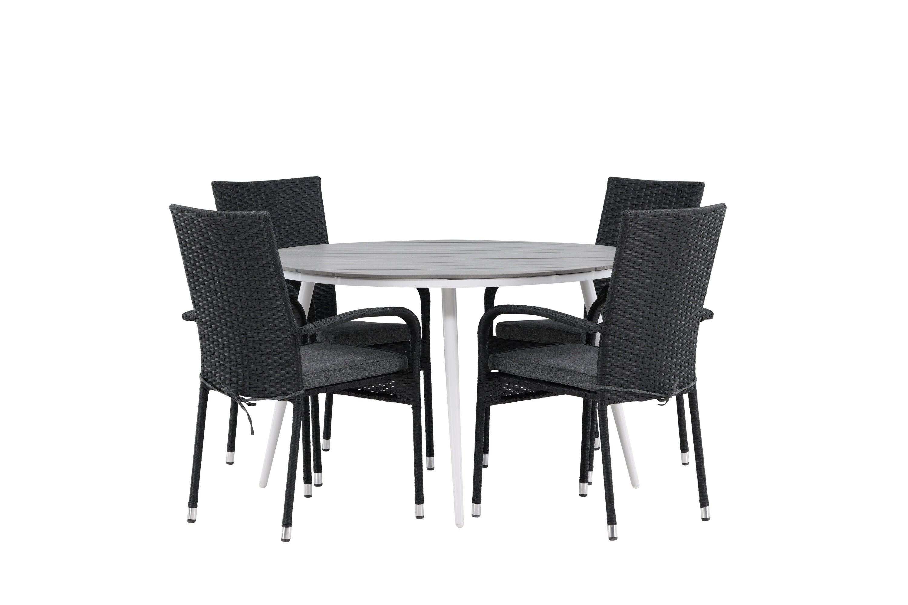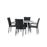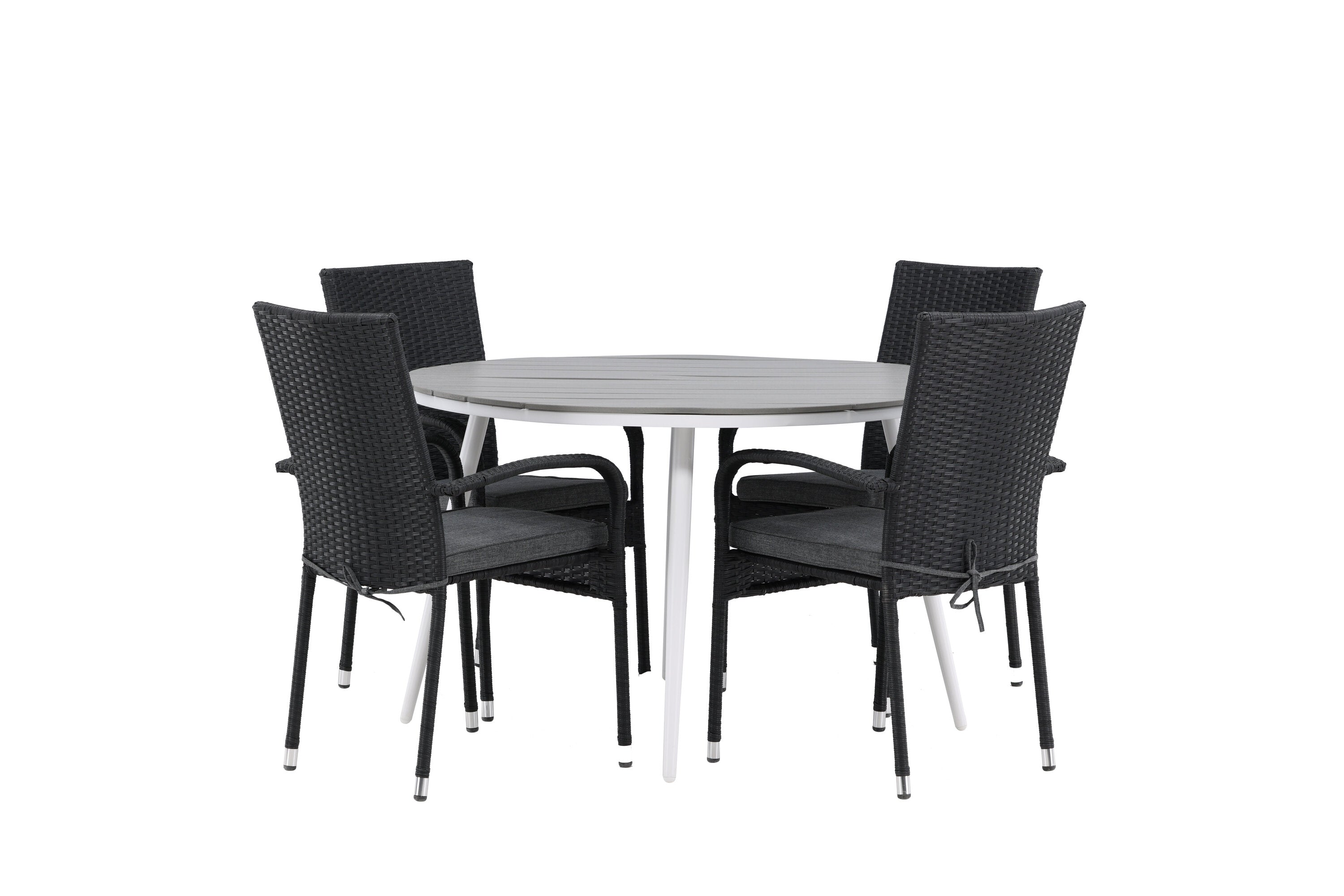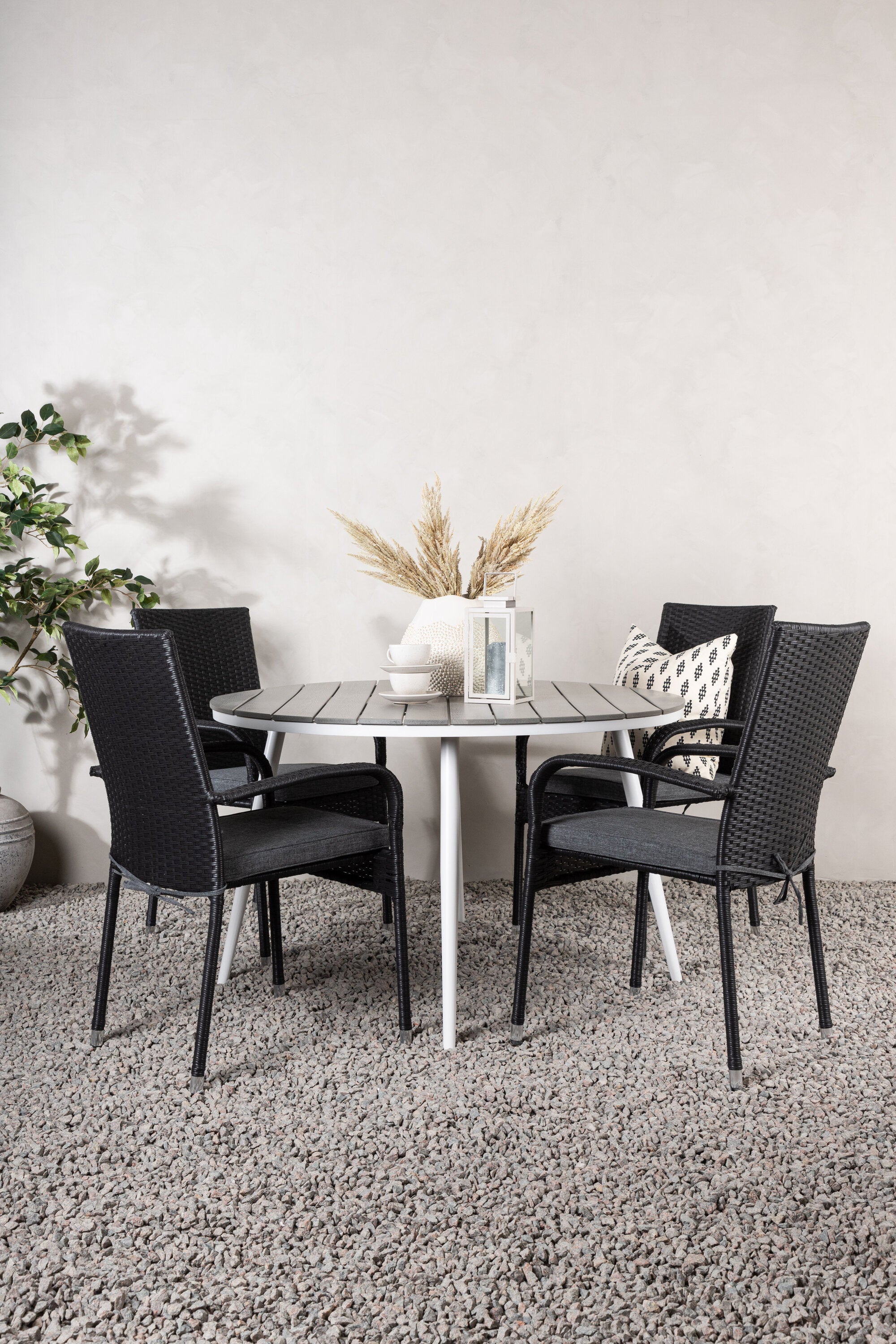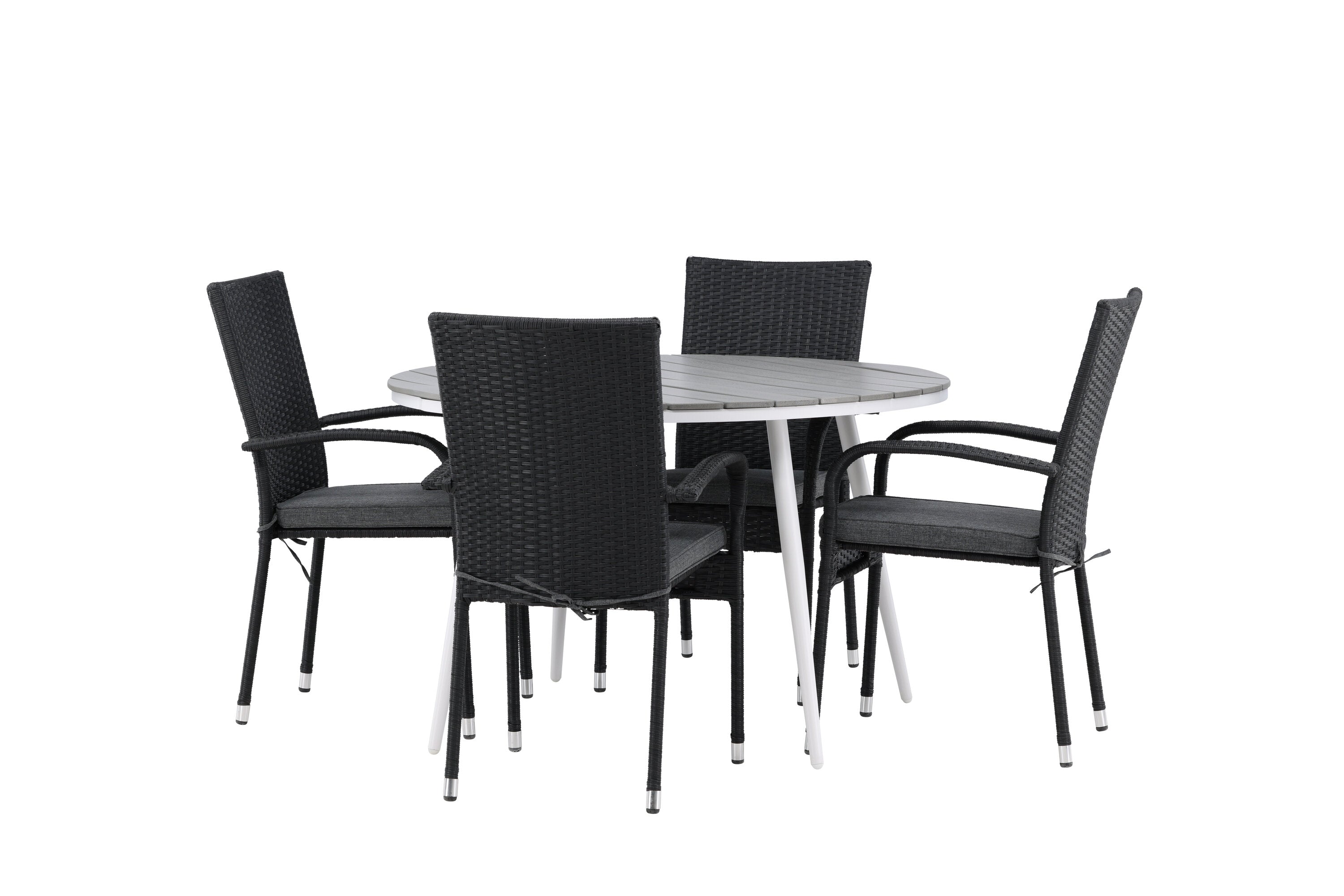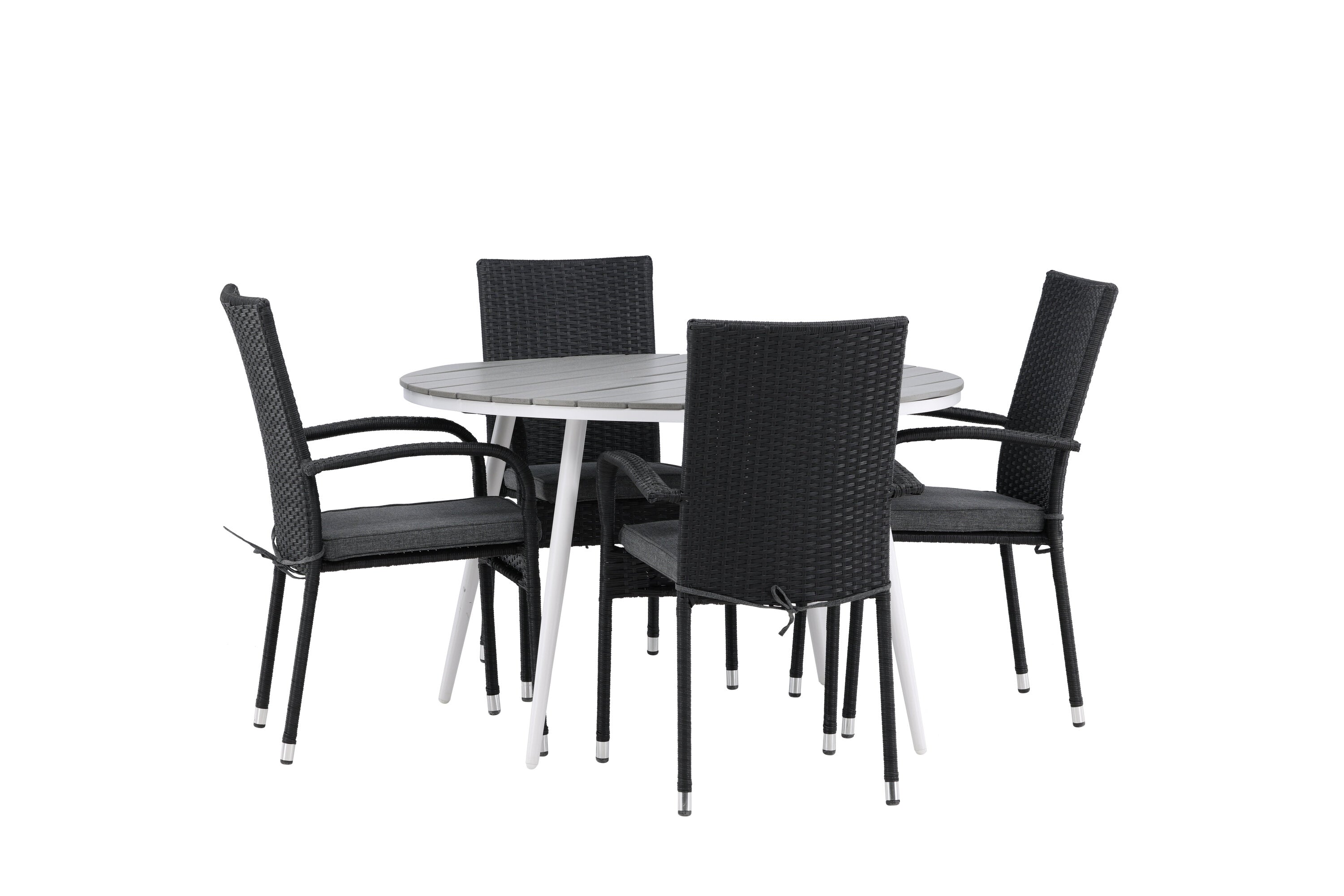 Pohodlně se usaďte v příjemné jídelní skupině, kde nikdo neriskuje, že se dostane na okraj! Jídelní stůl Break má klasický design s kulatou stolní deskou v šedé barvě Aintwood a lehce rozšířenými nohami z bílého hliníku. Rozměry: 120ø cm. Zde v moderní kombinaci s pohodlnými jídelními židlemi ze série Anna. Židle je vyrobena z umělého ratanu, má integrované područky, je stohovatelná a dodává se v lahodné černé barvě, kterou lze snadno sladit s dalším nábytkem. Připravte se letos v létě před nočním životem a vychutnejte si jídlo venku!