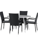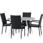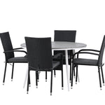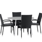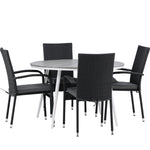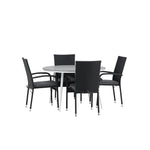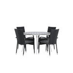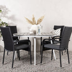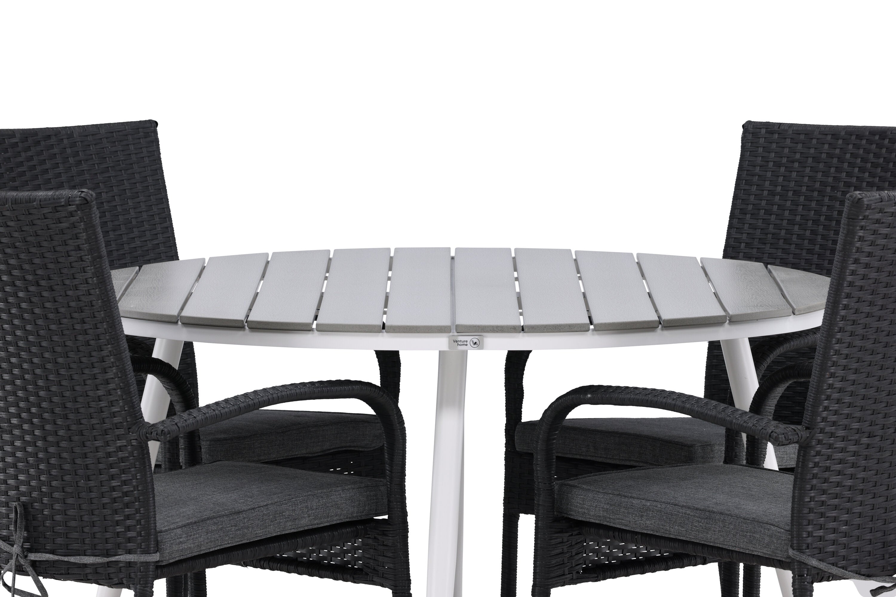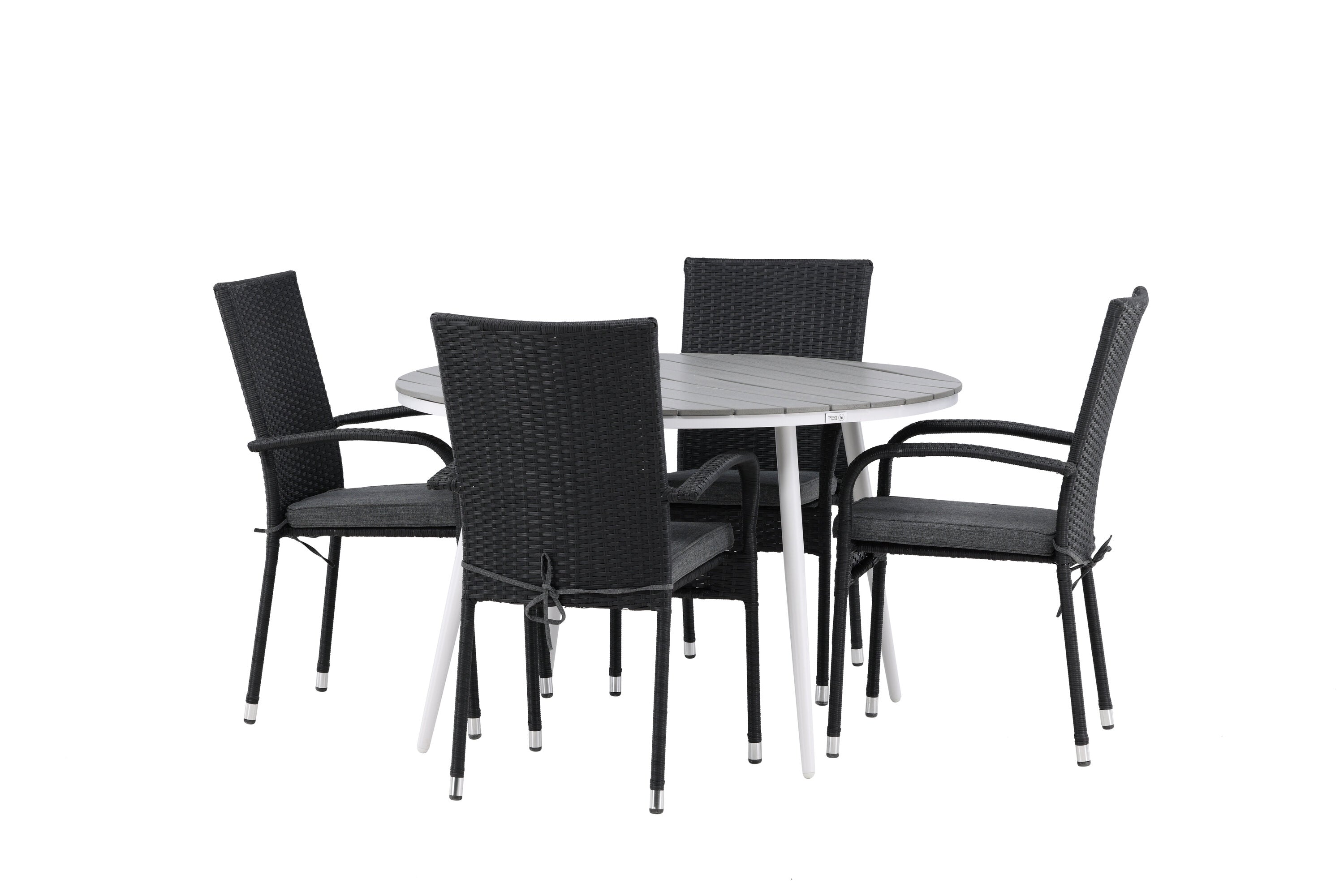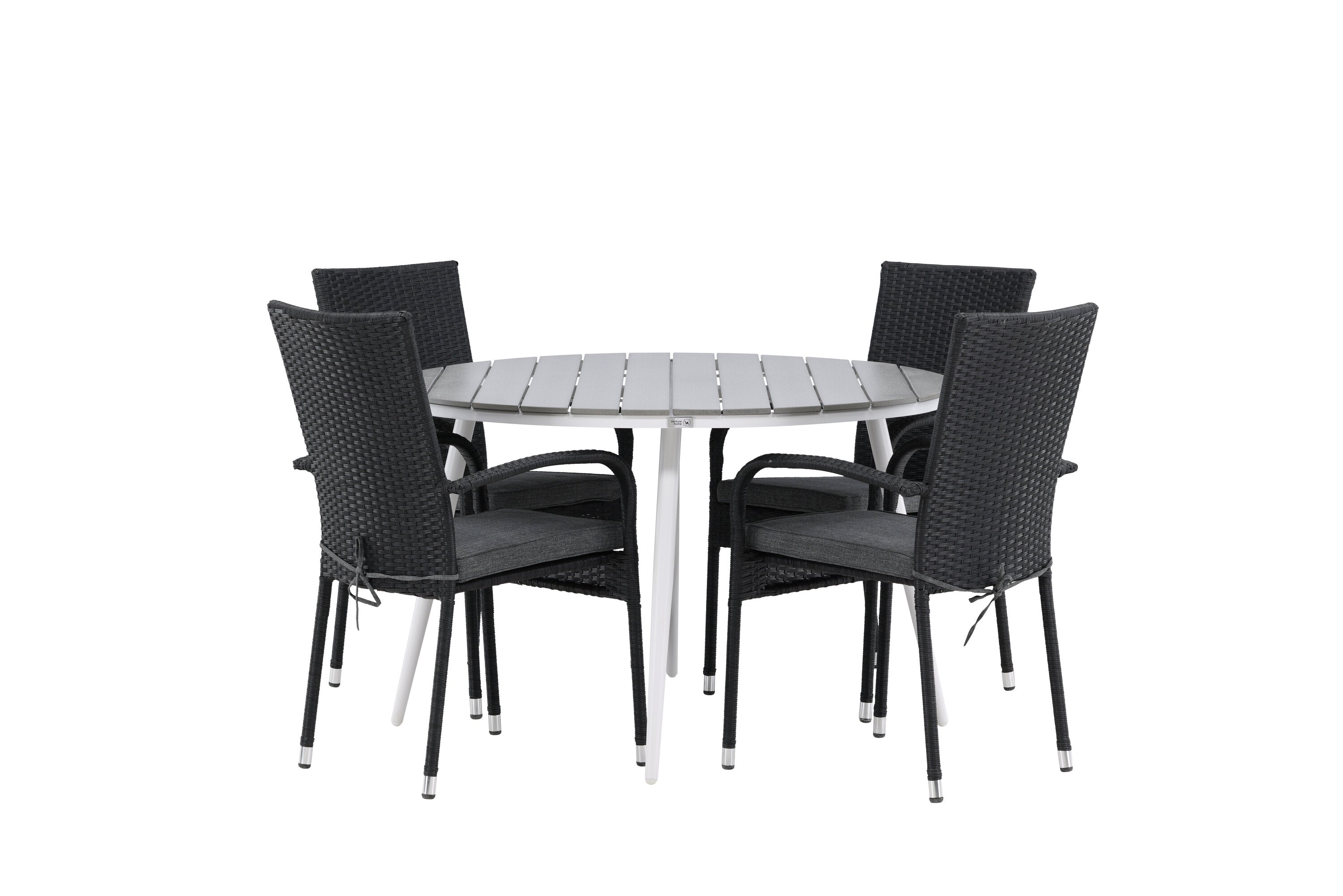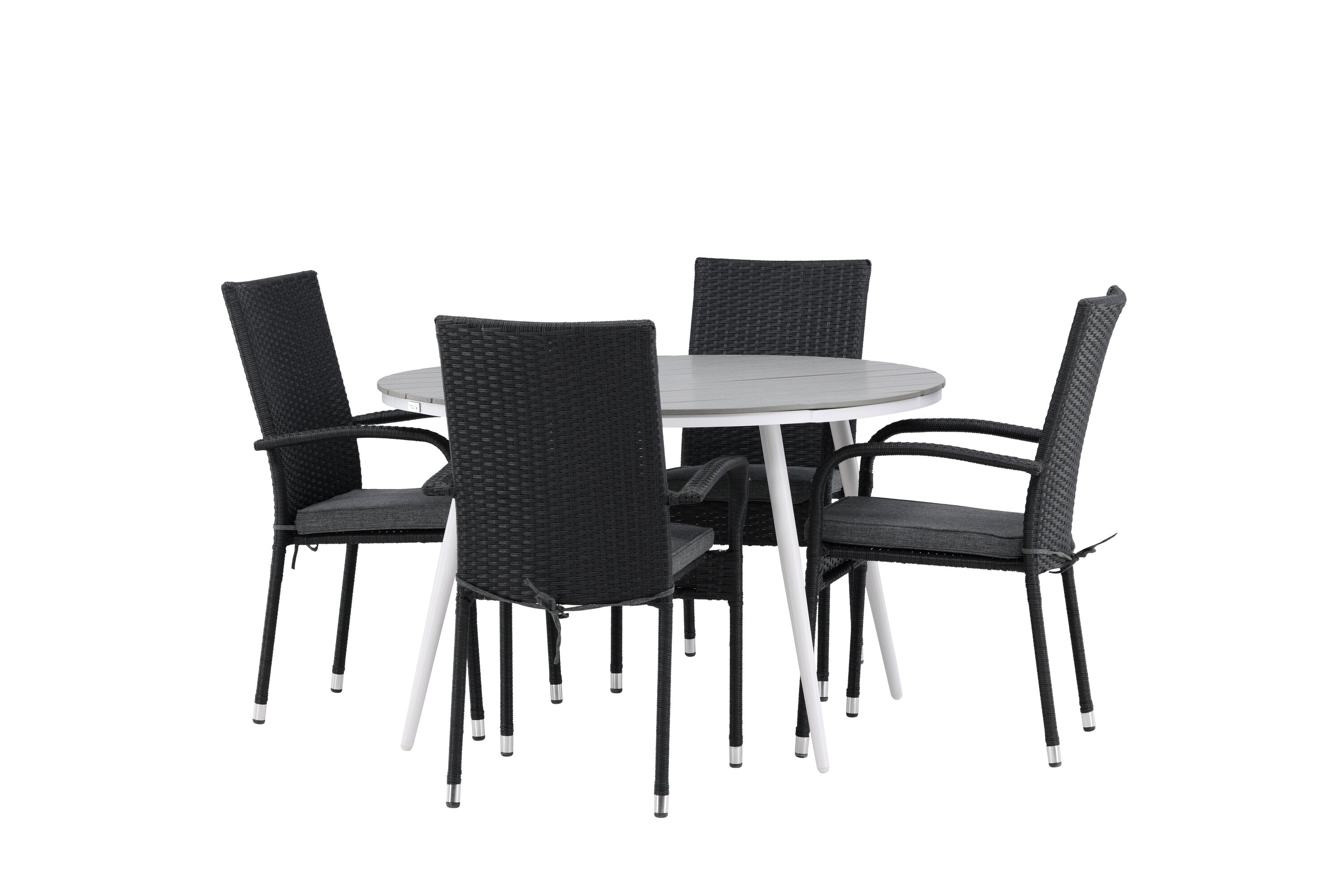 Pohodlně se usaďte v příjemné jídelní skupině, kde nikdo neriskuje, že se dostane na okraj! Jídelní stůl Break má klasický design s kulatou stolní deskou v šedé barvě Aintwood a lehce rozšířenými nohami z bílého hliníku. Rozměry: 120ø cm. Zde v moderní kombinaci s pohodlnými jídelními židlemi ze série Anna. Židle je vyrobena z umělého ratanu, má integrované područky, je stohovatelná a dodává se v lahodné černé barvě, kterou lze snadno sladit s dalším nábytkem. Připravte se letos v létě před nočním životem a vychutnejte si jídlo venku!