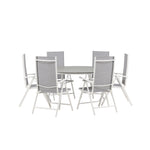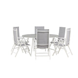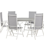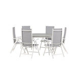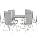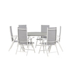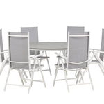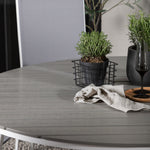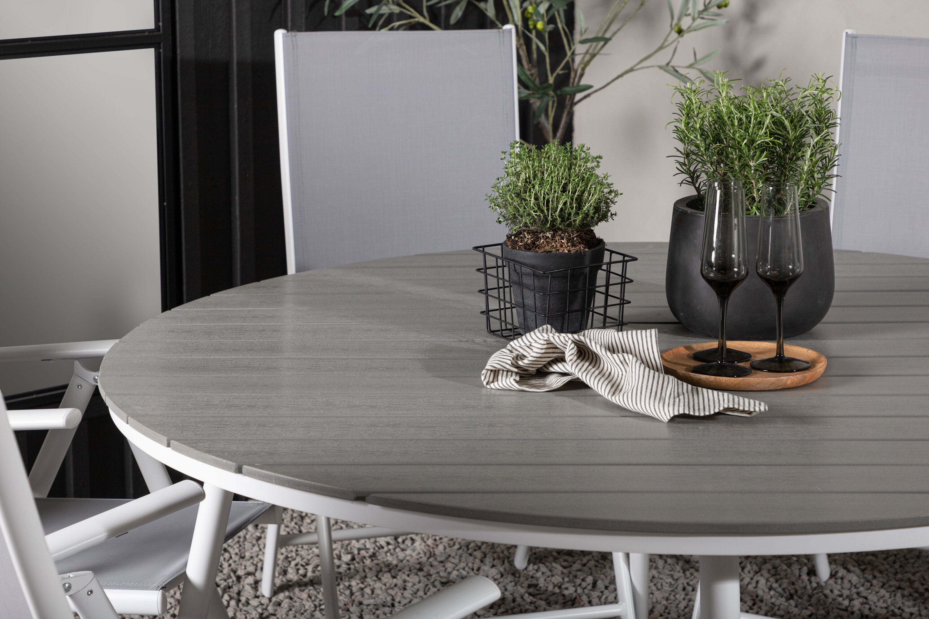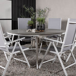 Vhodná skupina potravin ze série Break je přesně to, co terasa toto léto potřebuje! Jídelní stůl Break má kruhovou desku stolu v šedé barvě Aintwood a klasický bílý hliníkový podvozek. Zde společně se 6 jídelními židlemi ze stejné série. Židle je šedá 5-polohová židle s područkami pro větší pohodlí a bílou hliníkovou rámovou konstrukcí. Opěradlo je sklopné pro optimální pohodlí a relaxaci. Tady sedíte dlouho a užívejte si!