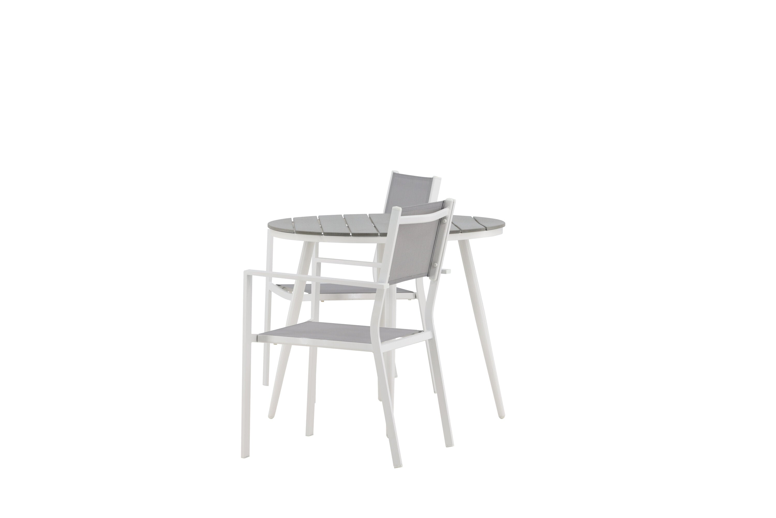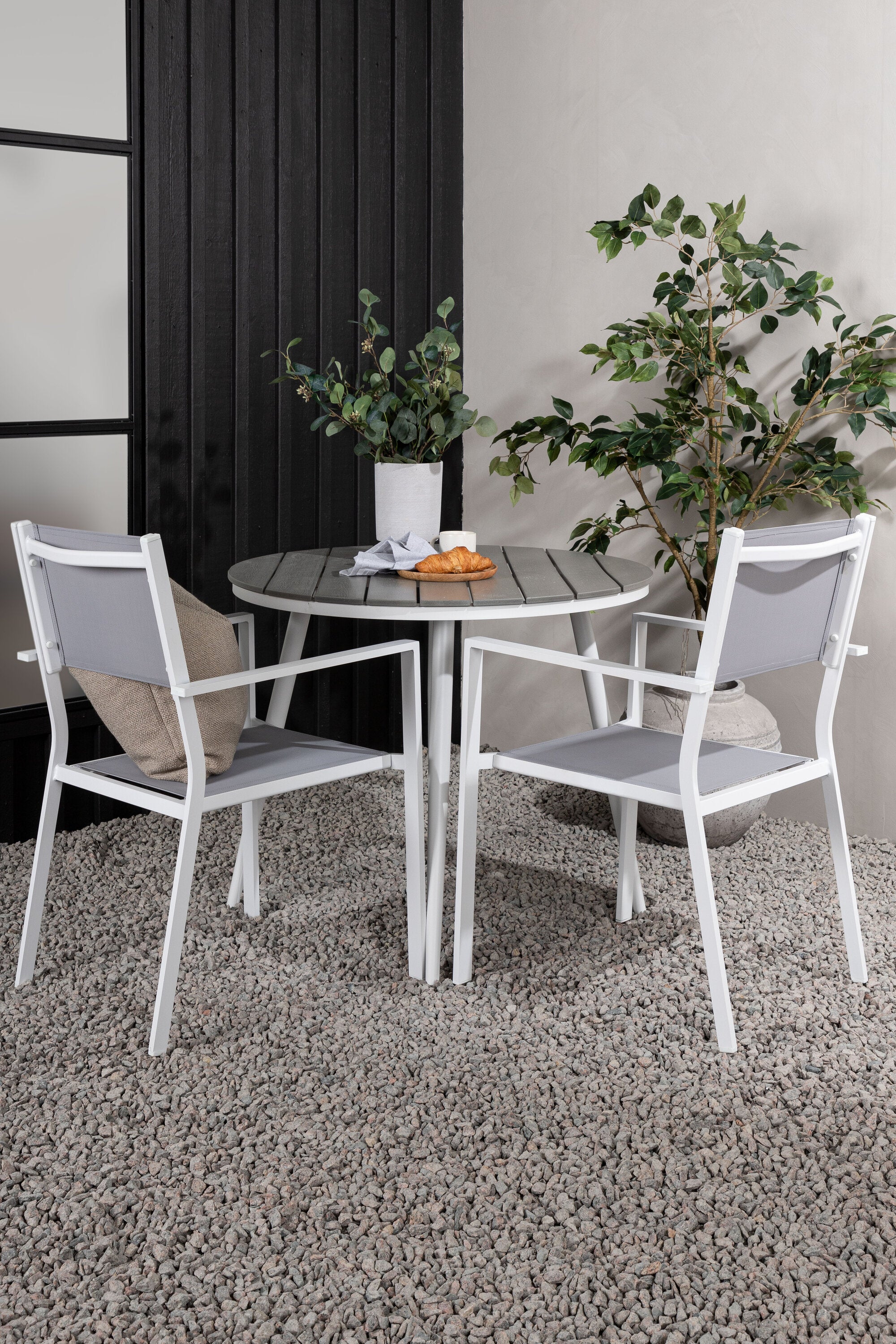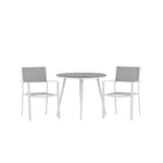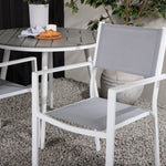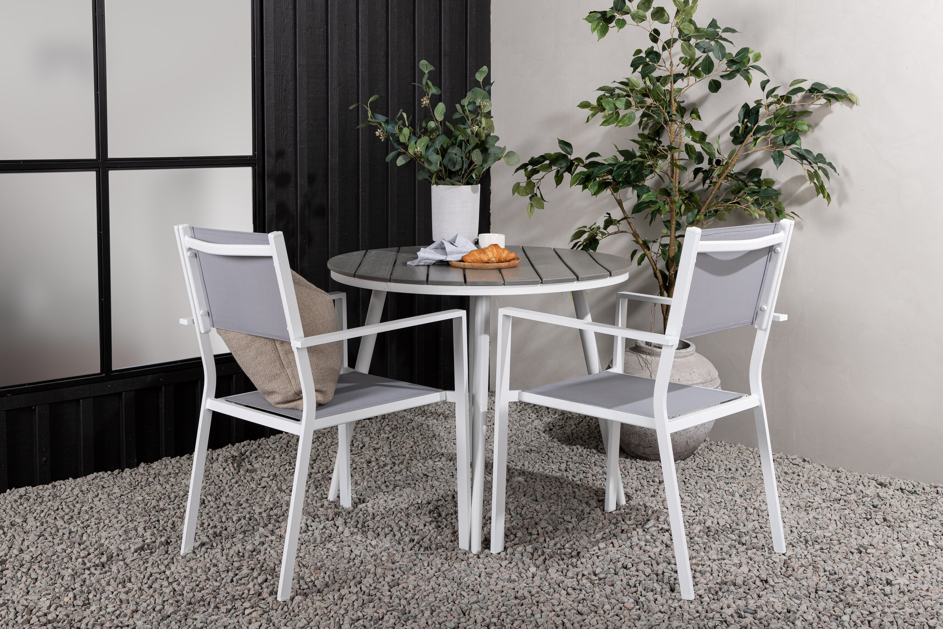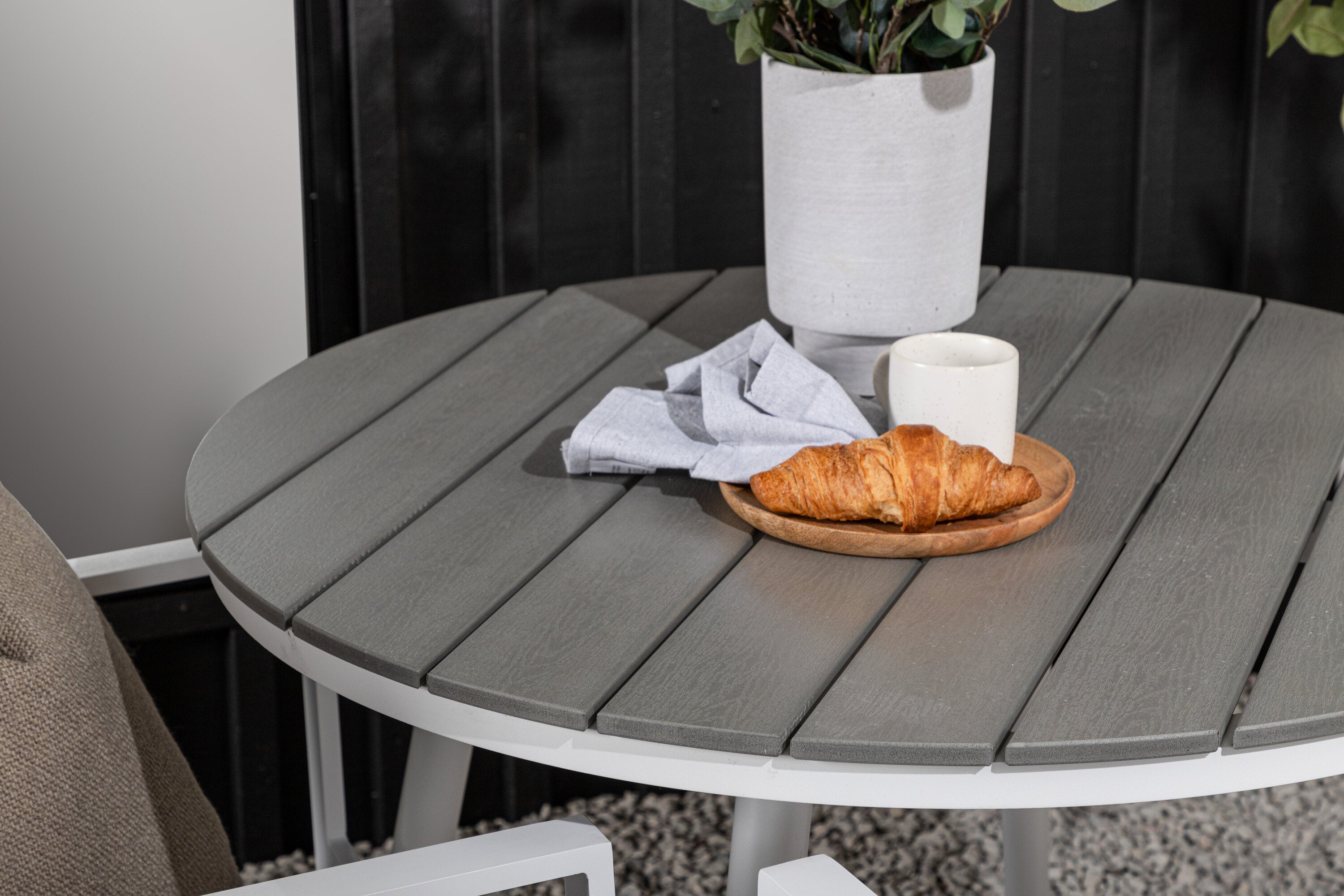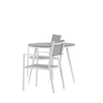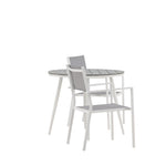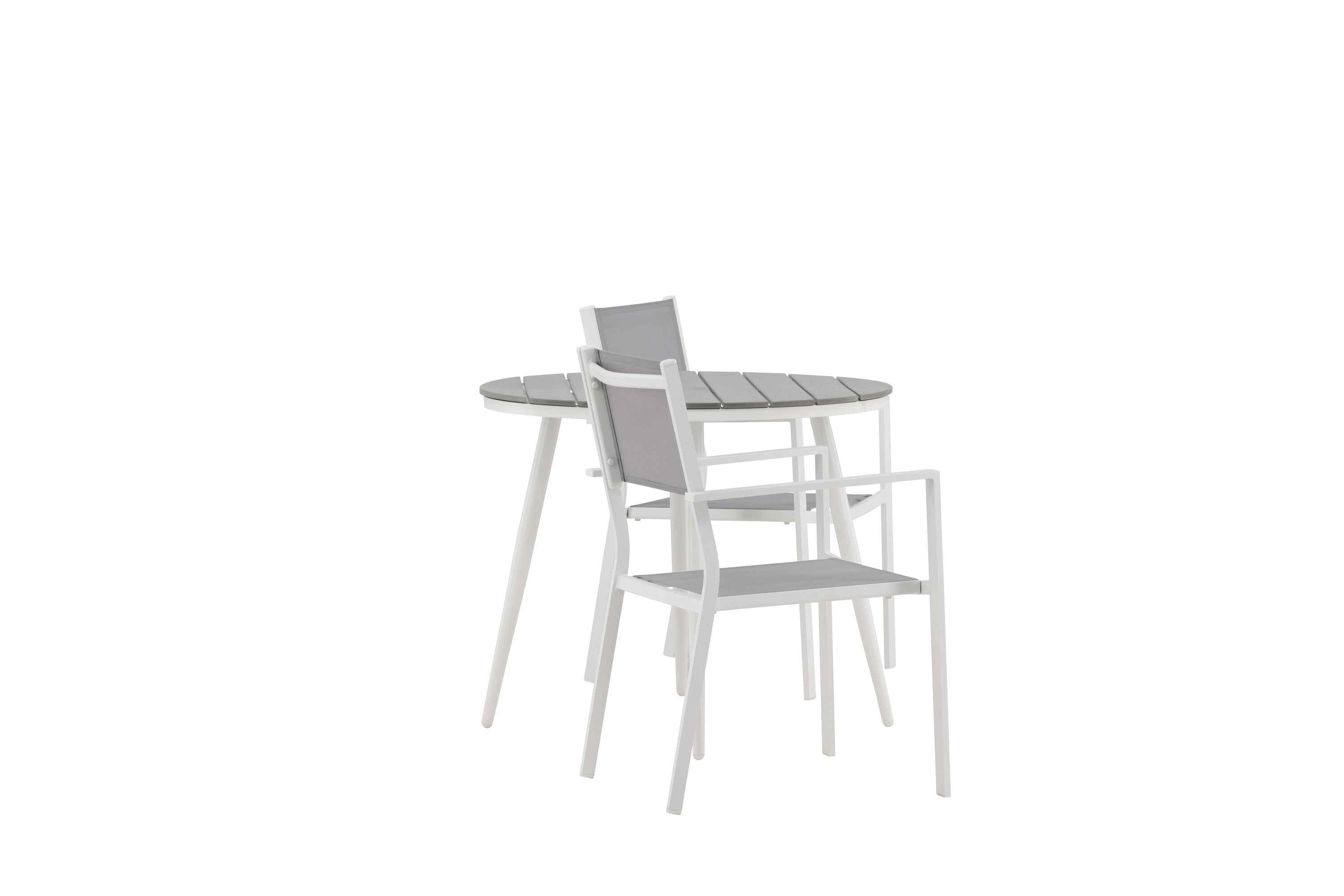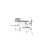 Zvoucí skupina jídla pro dva, která zaručeně prodlouží příjemné chvíle tohoto léta! Stůl Break má kulatou desku stolu v šedé barvě Aintwood a klasický bílý hliníkový podvozek. Rozměry: 90ø cm. Zde společně s trendy jídelními židlemi ze série Copacabana v moderním designu. Židle jsou stohovatelné se sedákem z textilie a rámem z hliníku. Vytvořte si okouzlující místo pro všechny letní příležitosti!