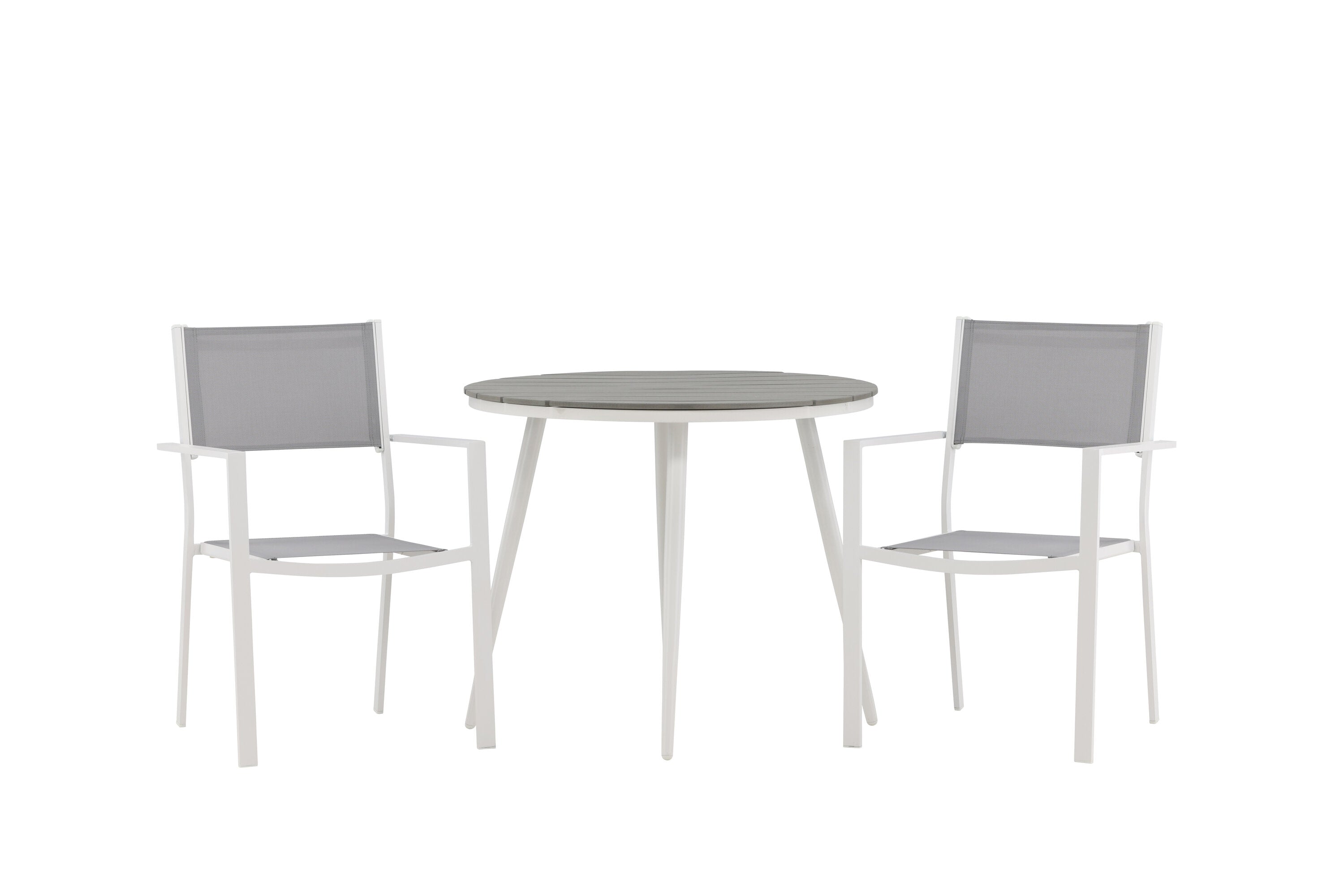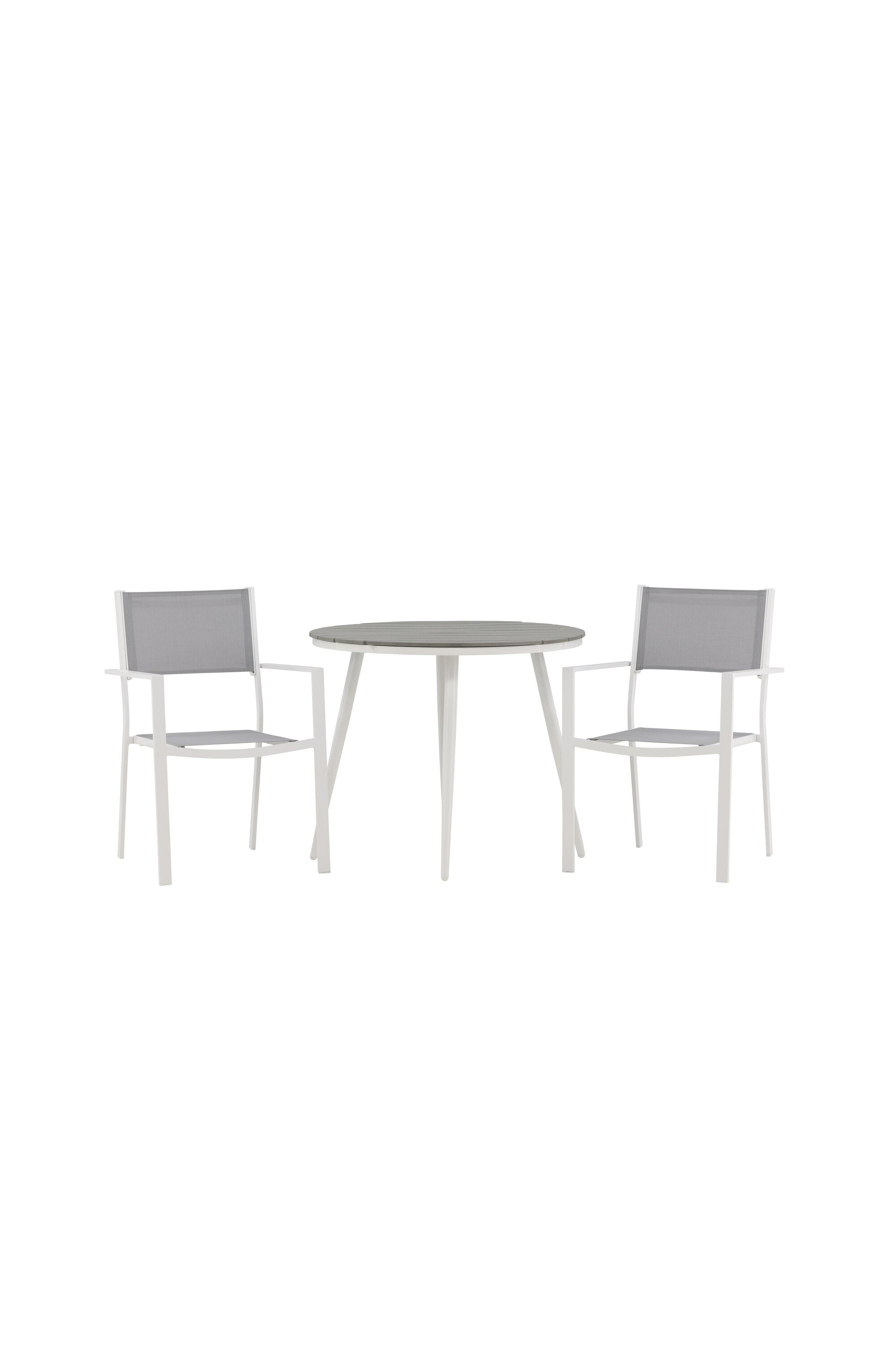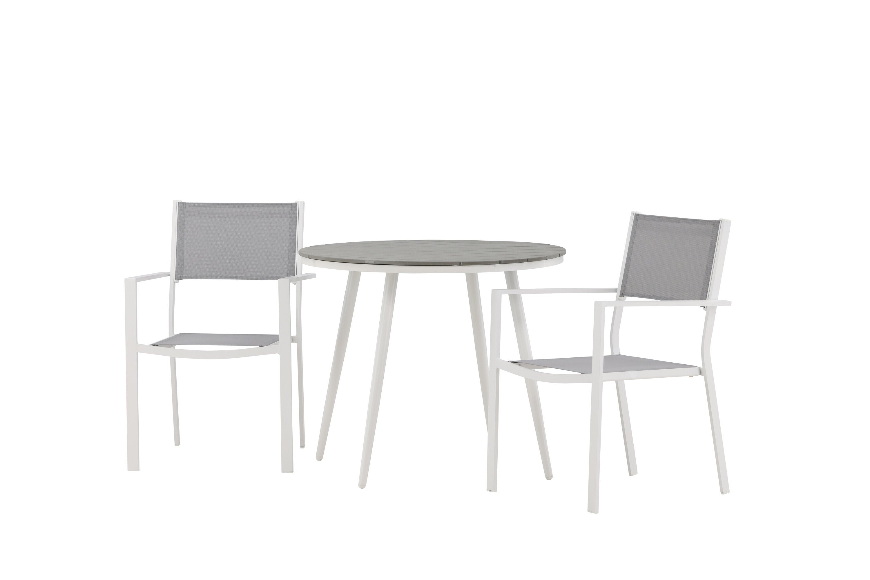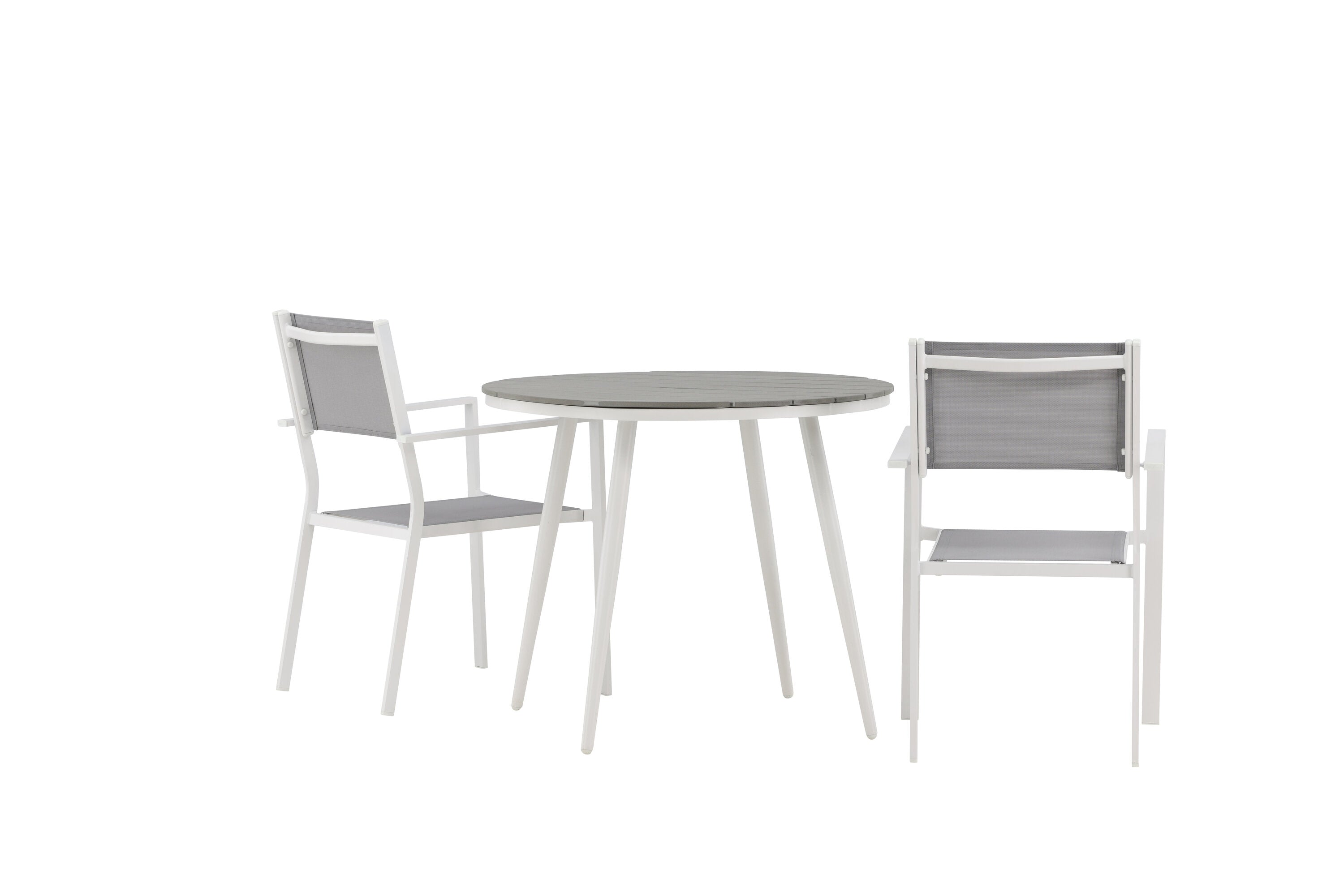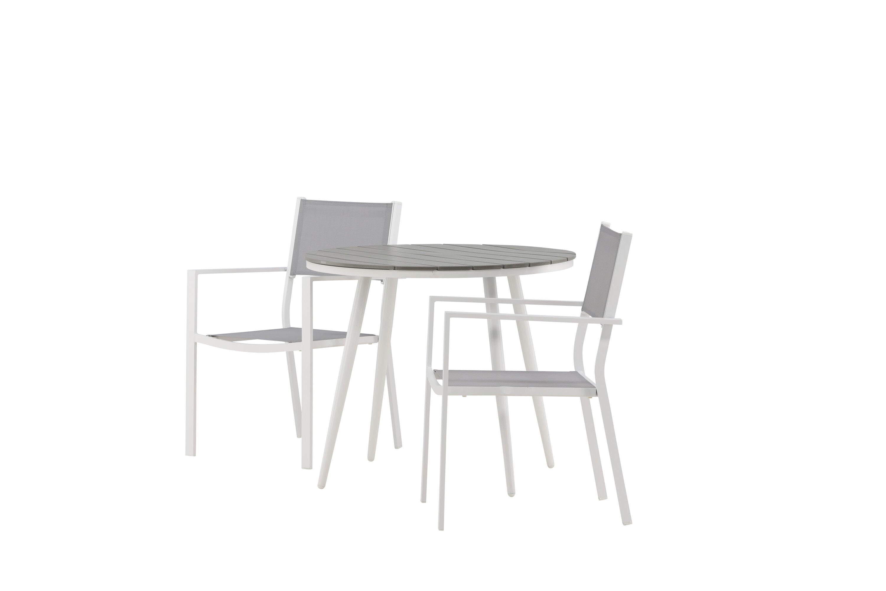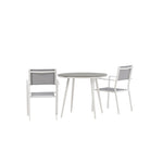 Zvoucí skupina jídla pro dva, která zaručeně prodlouží příjemné chvíle tohoto léta! Stůl Break má kulatou desku stolu v šedé barvě Aintwood a klasický bílý hliníkový podvozek. Rozměry: 90ø cm. Zde společně s trendy jídelními židlemi ze série Copacabana v moderním designu. Židle jsou stohovatelné se sedákem z textilie a rámem z hliníku. Vytvořte si okouzlující místo pro všechny letní příležitosti!