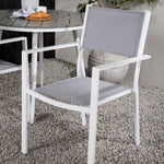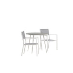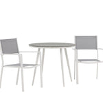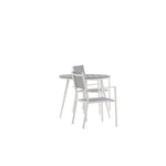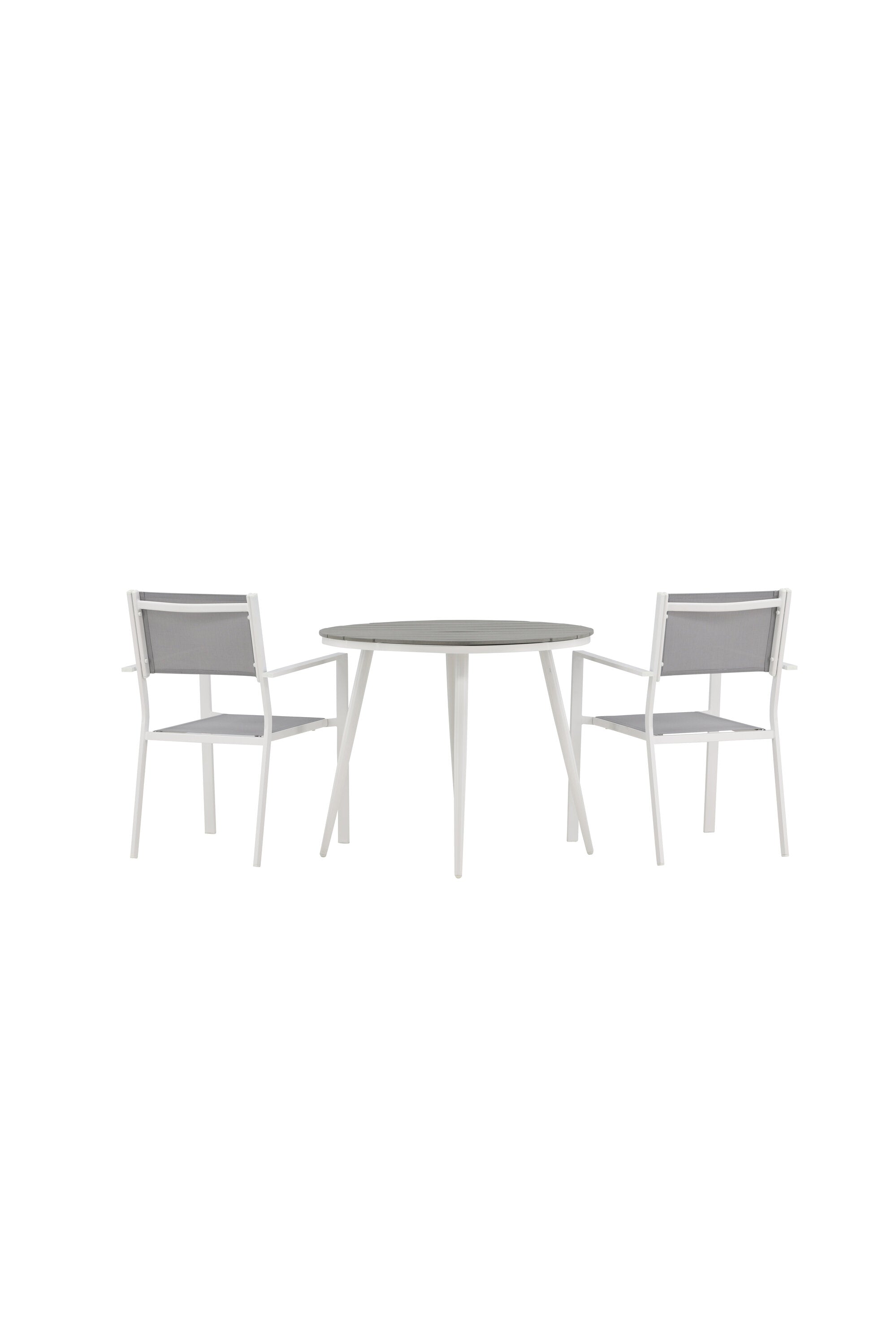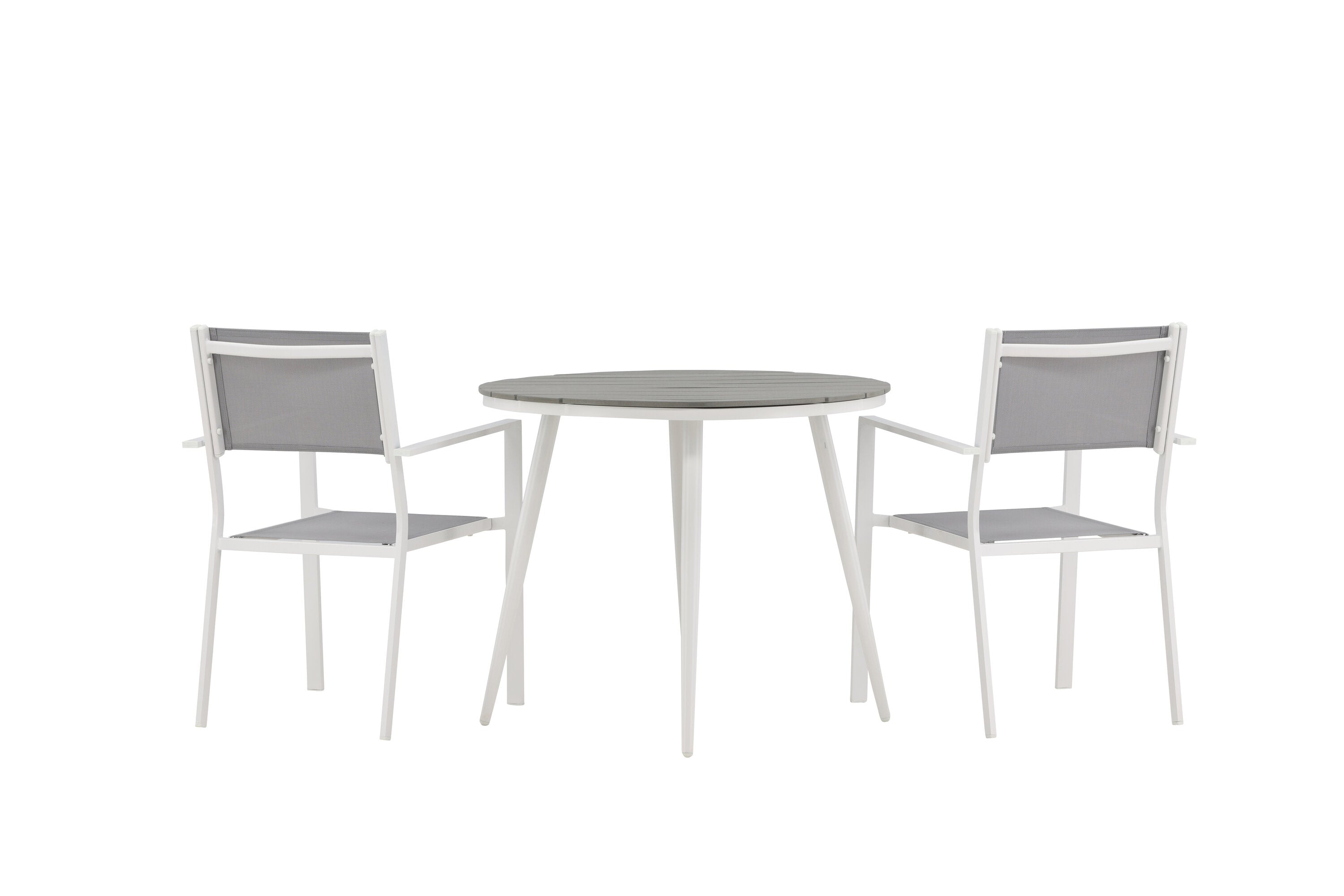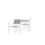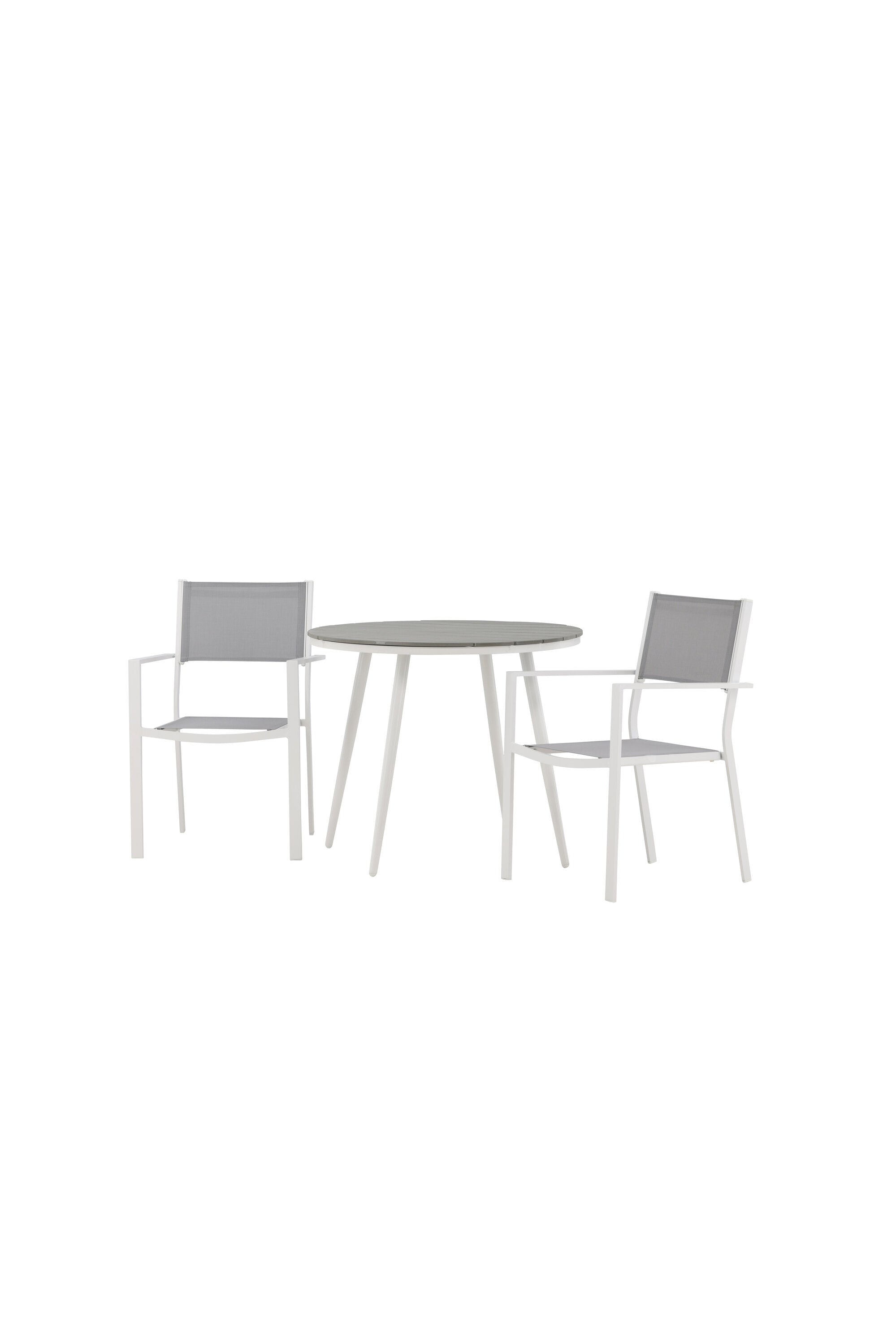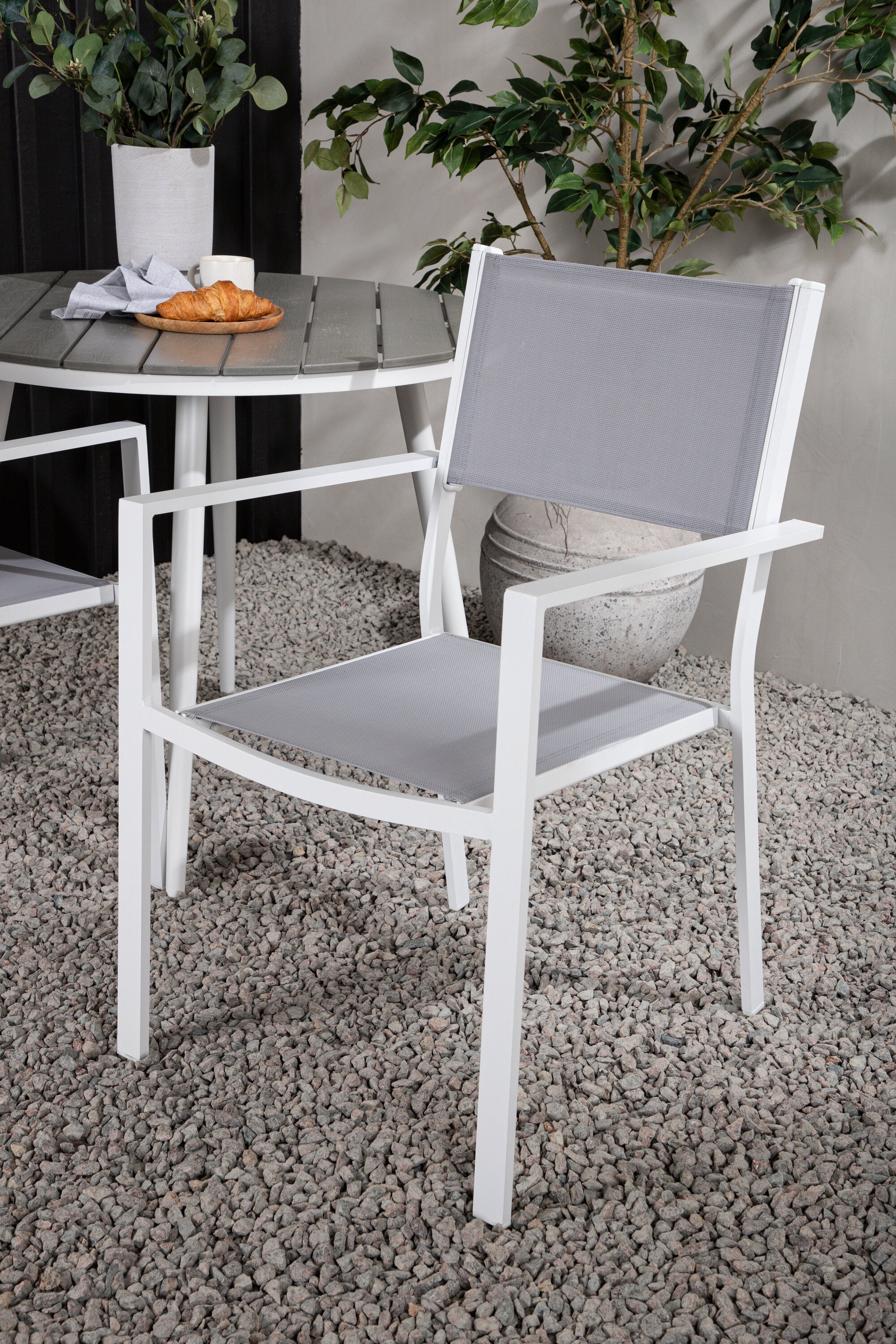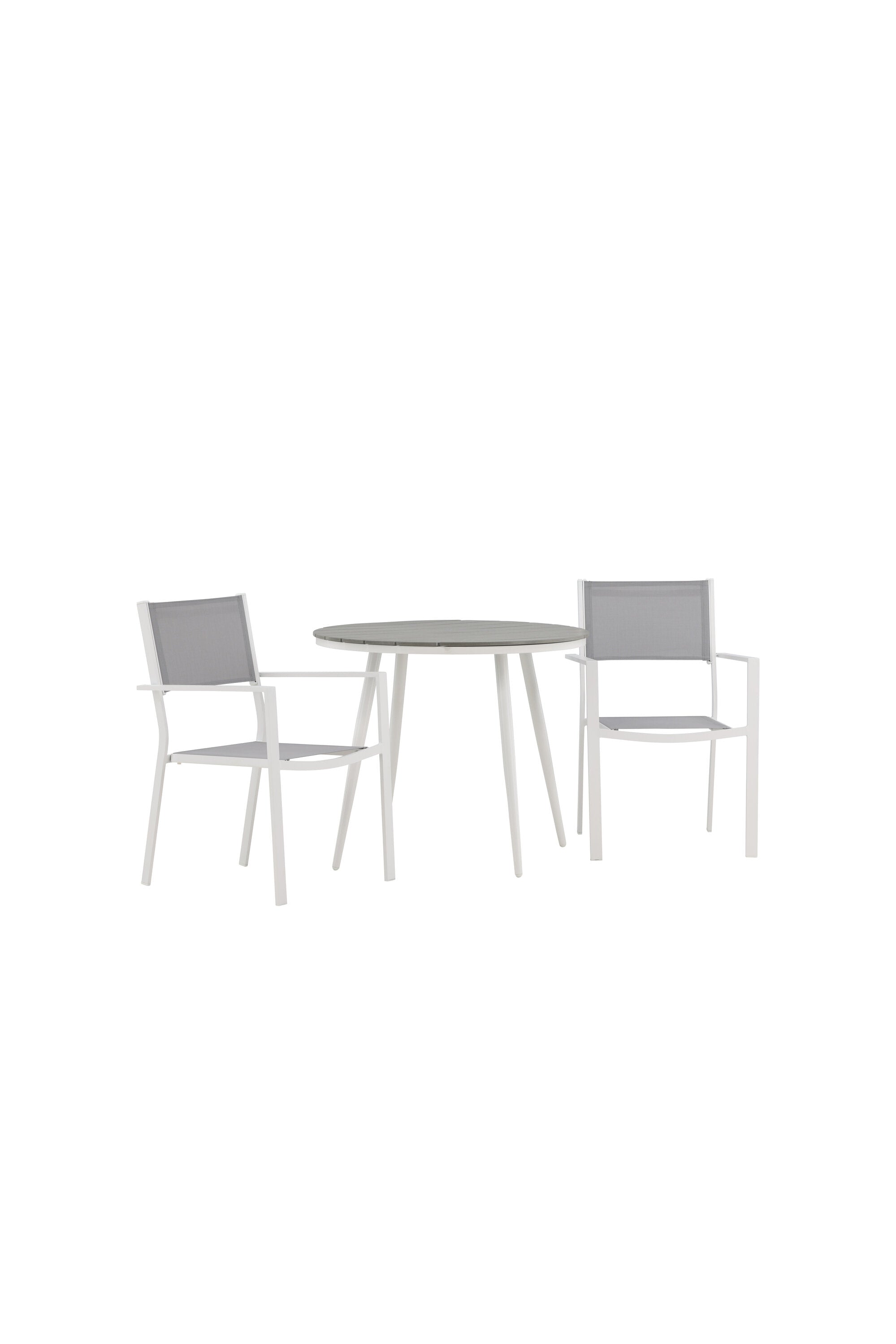 Zvoucí skupina jídla pro dva, která zaručeně prodlouží příjemné chvíle tohoto léta! Stůl Break má kulatou desku stolu v šedé barvě Aintwood a klasický bílý hliníkový podvozek. Rozměry: 90ø cm. Zde společně s trendy jídelními židlemi ze série Copacabana v moderním designu. Židle jsou stohovatelné se sedákem z textilie a rámem z hliníku. Vytvořte si okouzlující místo pro všechny letní příležitosti!