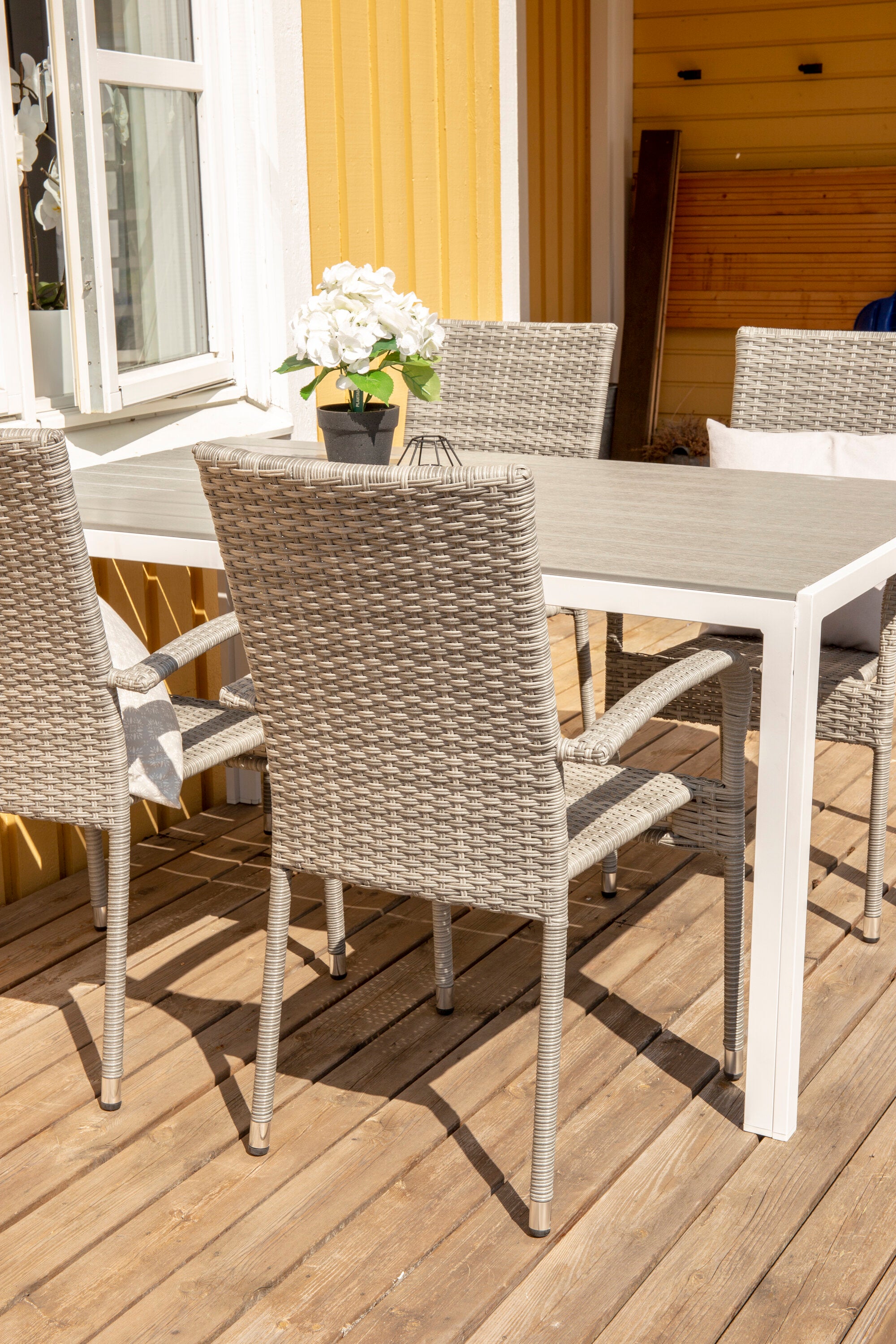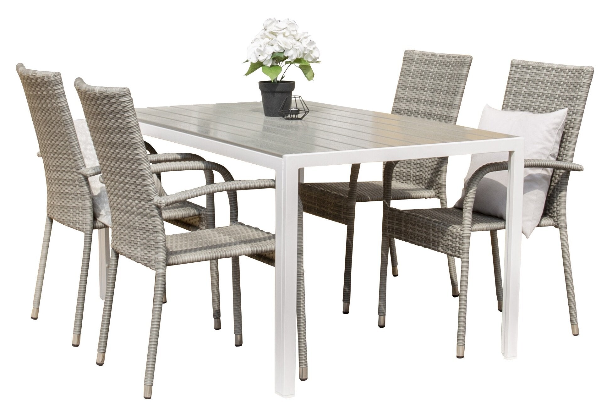 Nedělejte kompromisy mezi stylem a pohodlím! Obdélníkový jídelní stůl Break má rovné tvary v klasickém severském designu s deskou stolu z šedé překližky a nohami stolu z bílého hliníku. Zde společně s pohodlnými jídelními židlemi ze série Anna. Židle má hliníkový rám a je čalouněná pleteným umělým ratanem šedé barvy. Prodlužte si letní jídla při posezení v pohodlné a útulné jídelně! Rozměry stolu: 150x90cm.