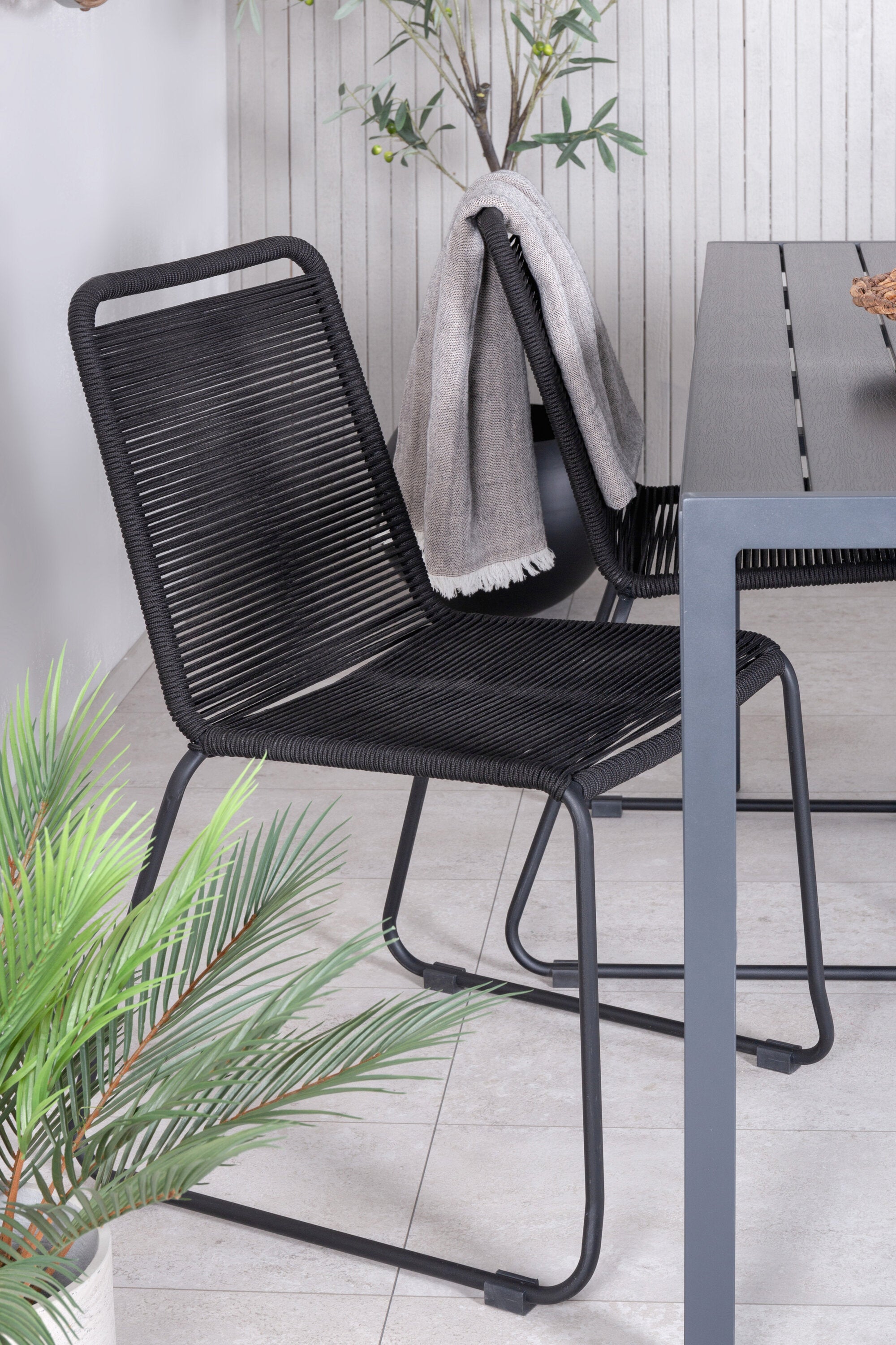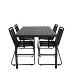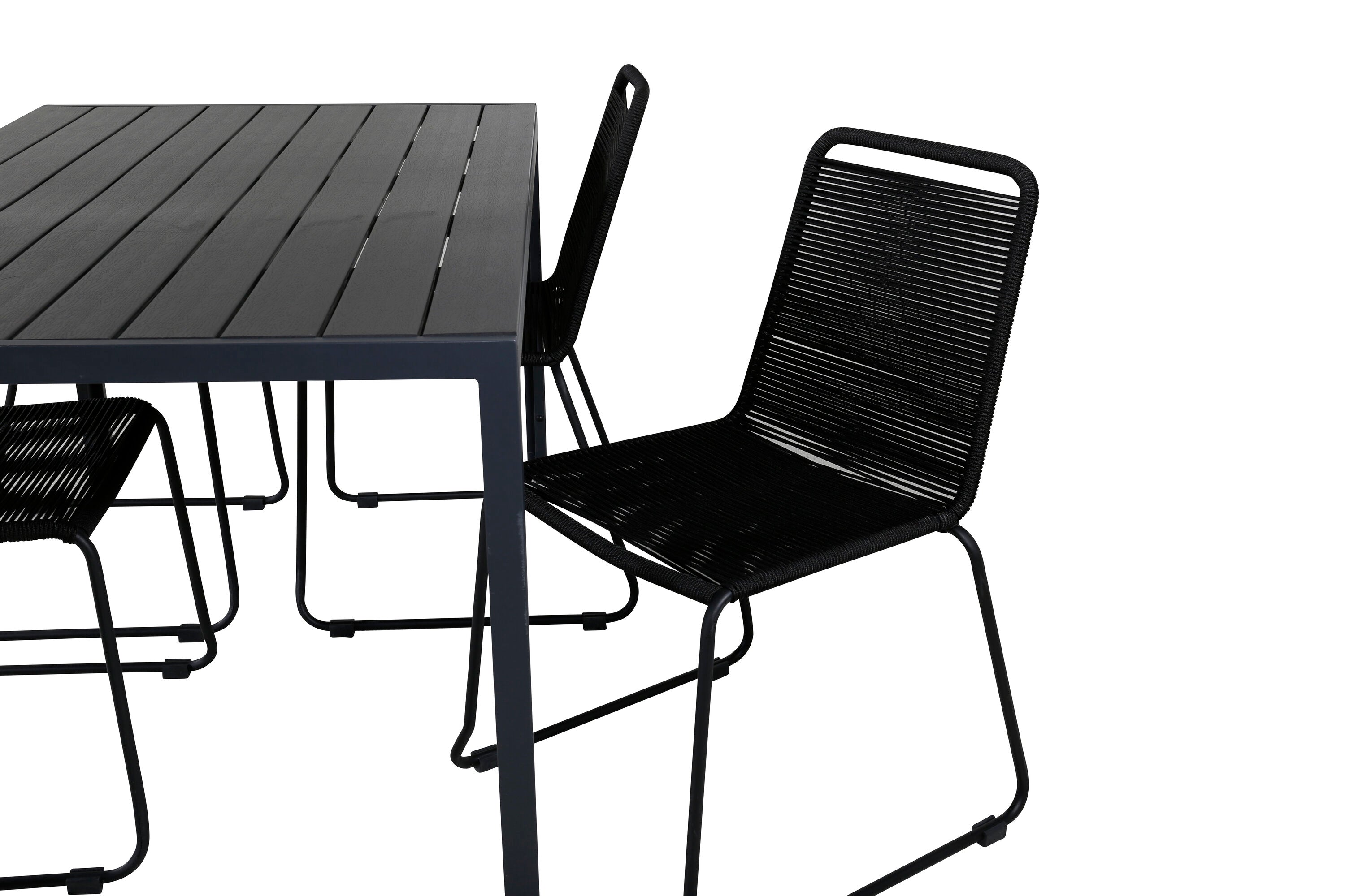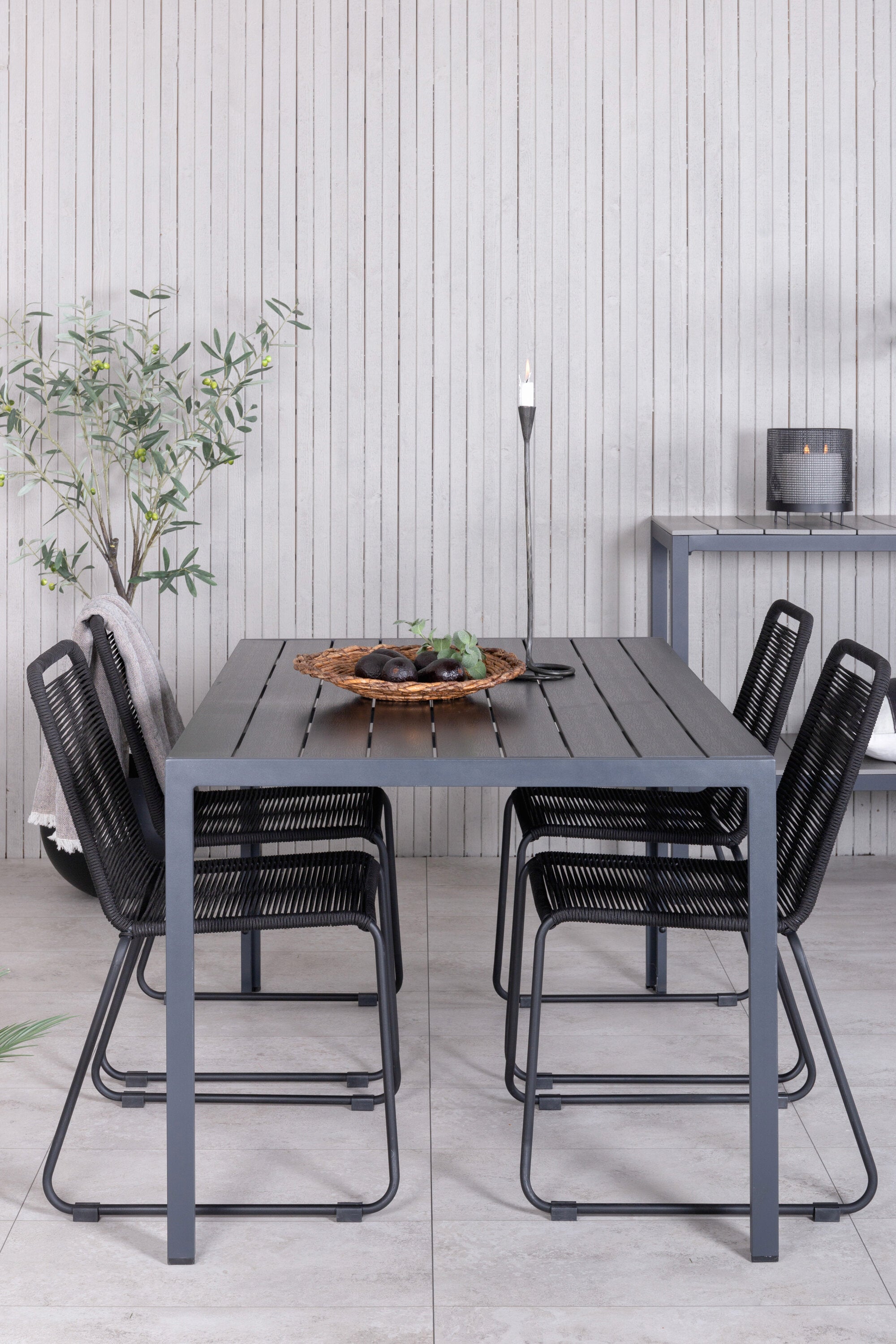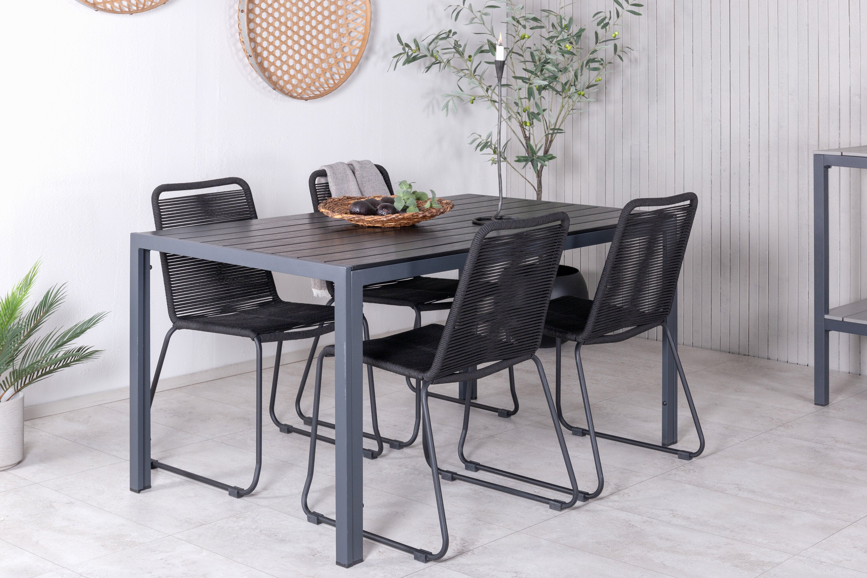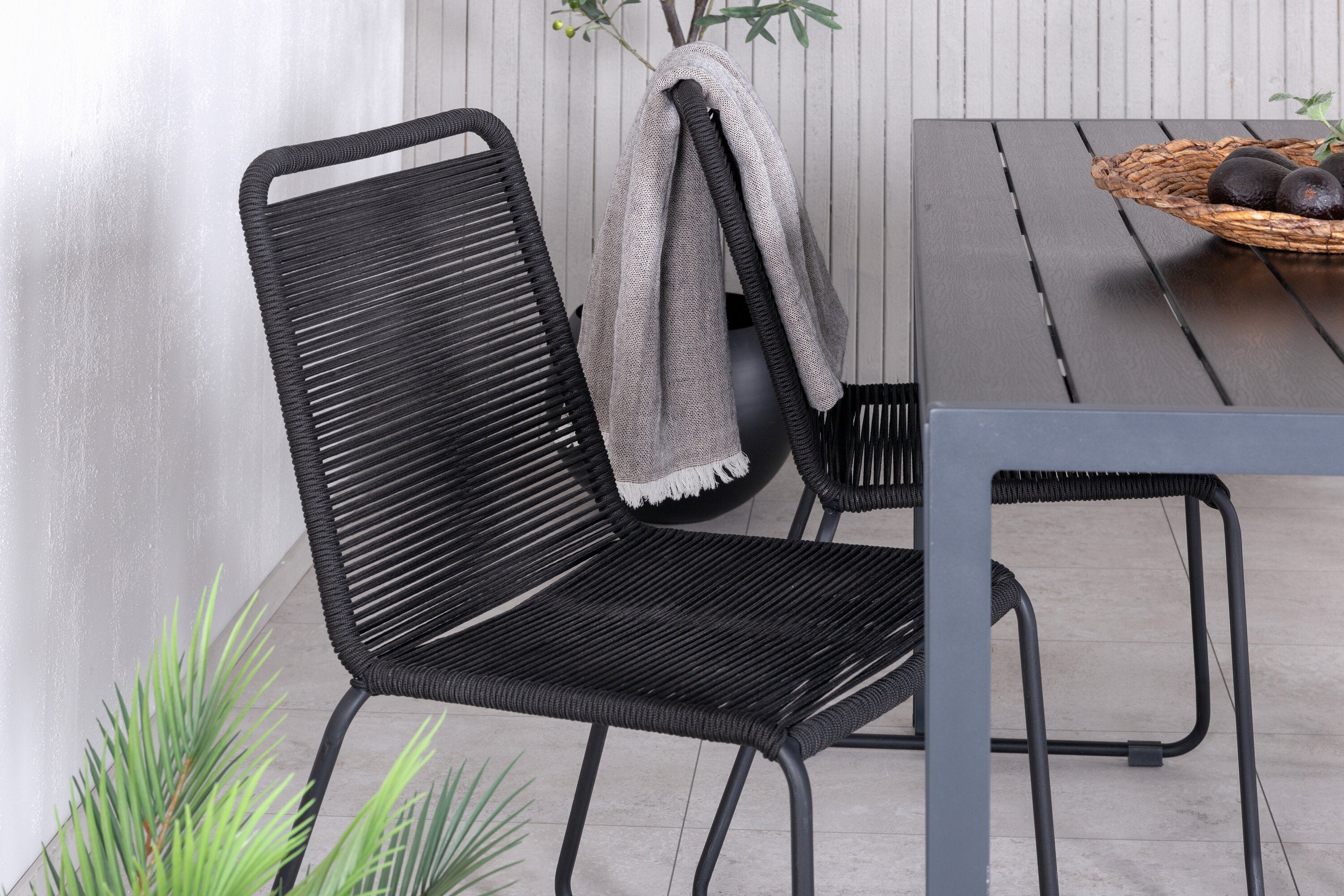 Vytvořte si stylovou atmosféru ve venkovním prostoru pomocí poutavé skupiny jídel v moderním duchu! Naše oblíbené jídelní židle Lindos svým minimalistickým designem opravdu udávají tón. Židle jsou stohovatelné pro praktické skladování a jsou vyrobeny v úzké, černé hliníkové konstrukci se sedákem z černého tkaného lana. Zde spolu s naším obdélníkovým jídelním stolem zlom v přímé severské podobě. Deska stolu je z černé překližky a hliníkového podvozku. Jednoduše dobře promyšlená skupina potravin, se kterou snadno vytvoříte okouzlující venkovní prostředí!