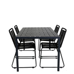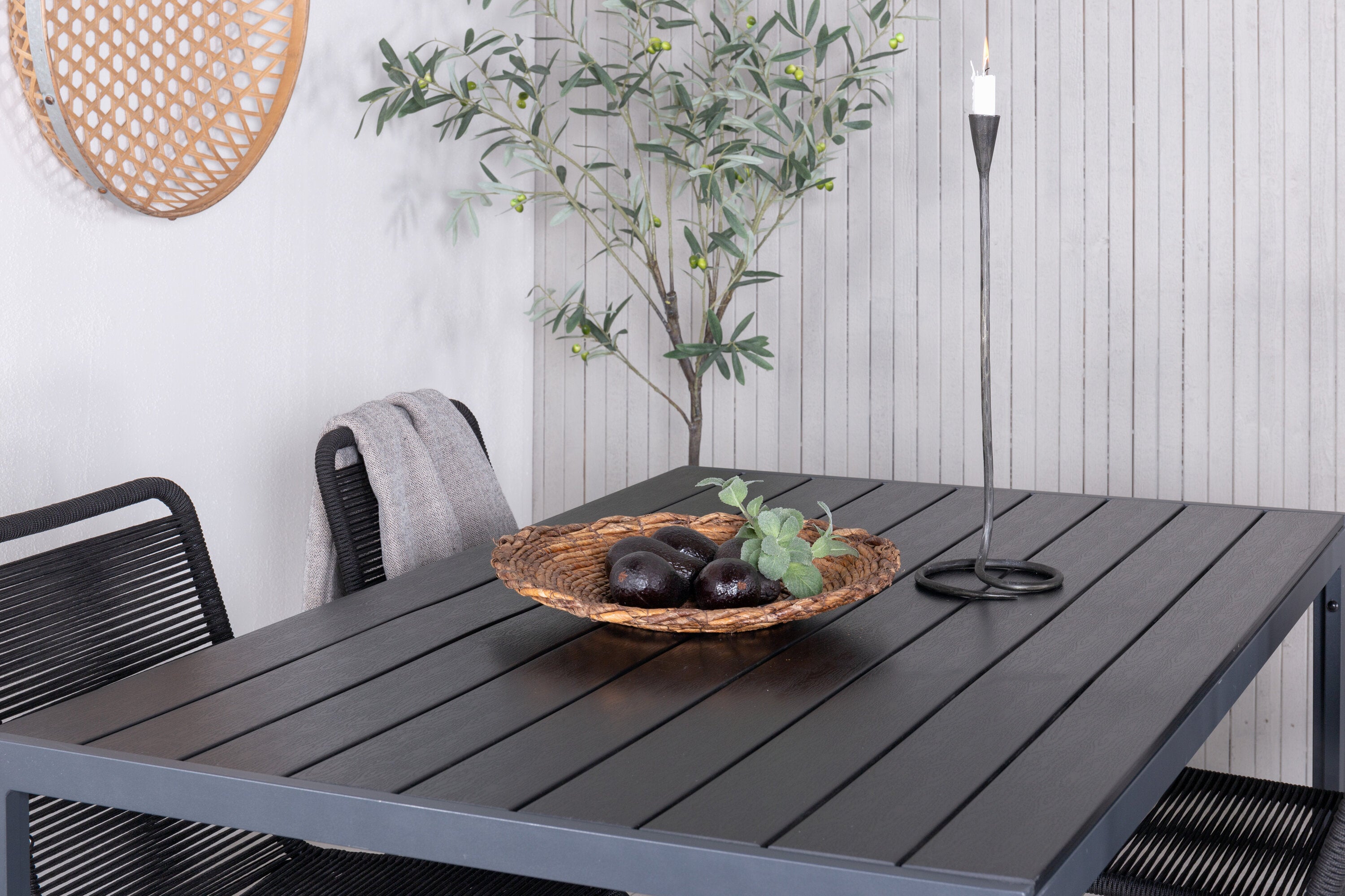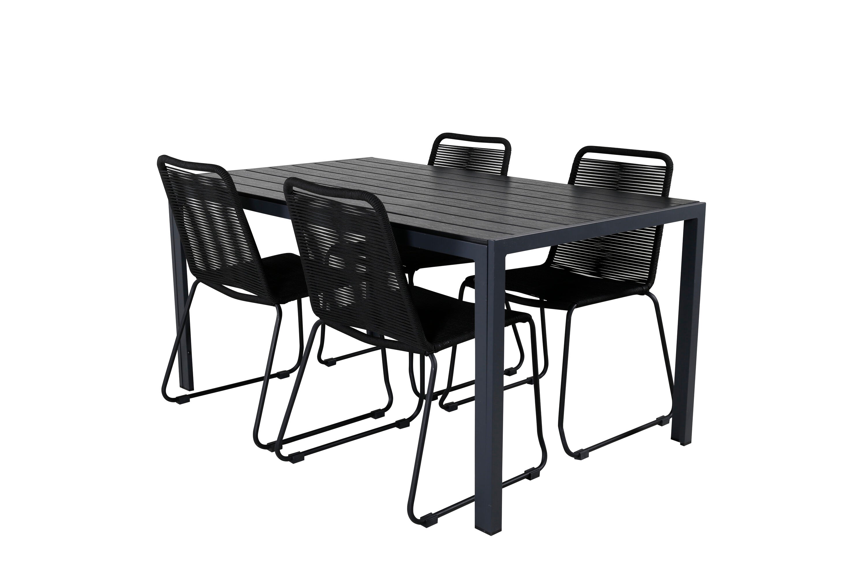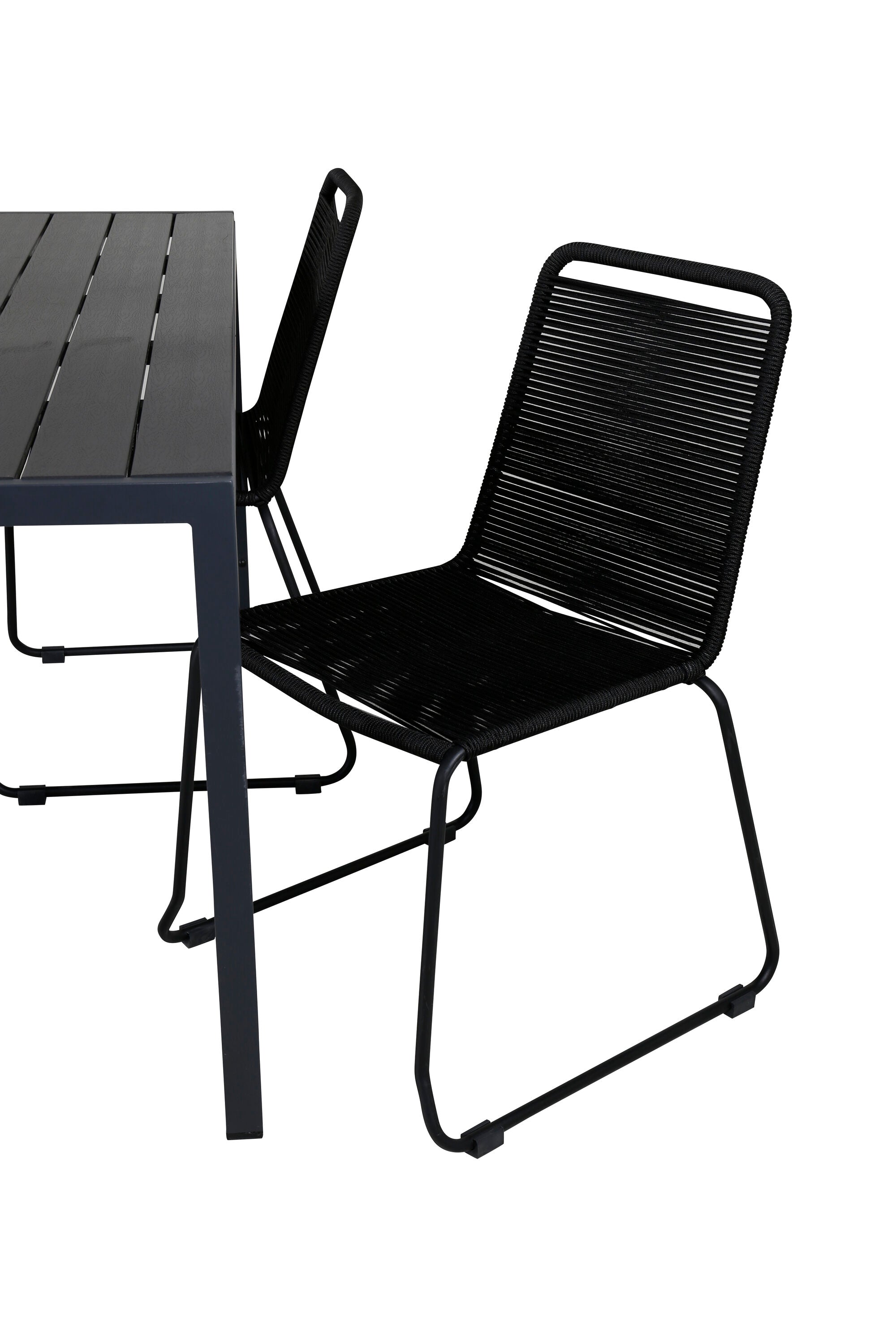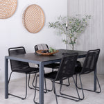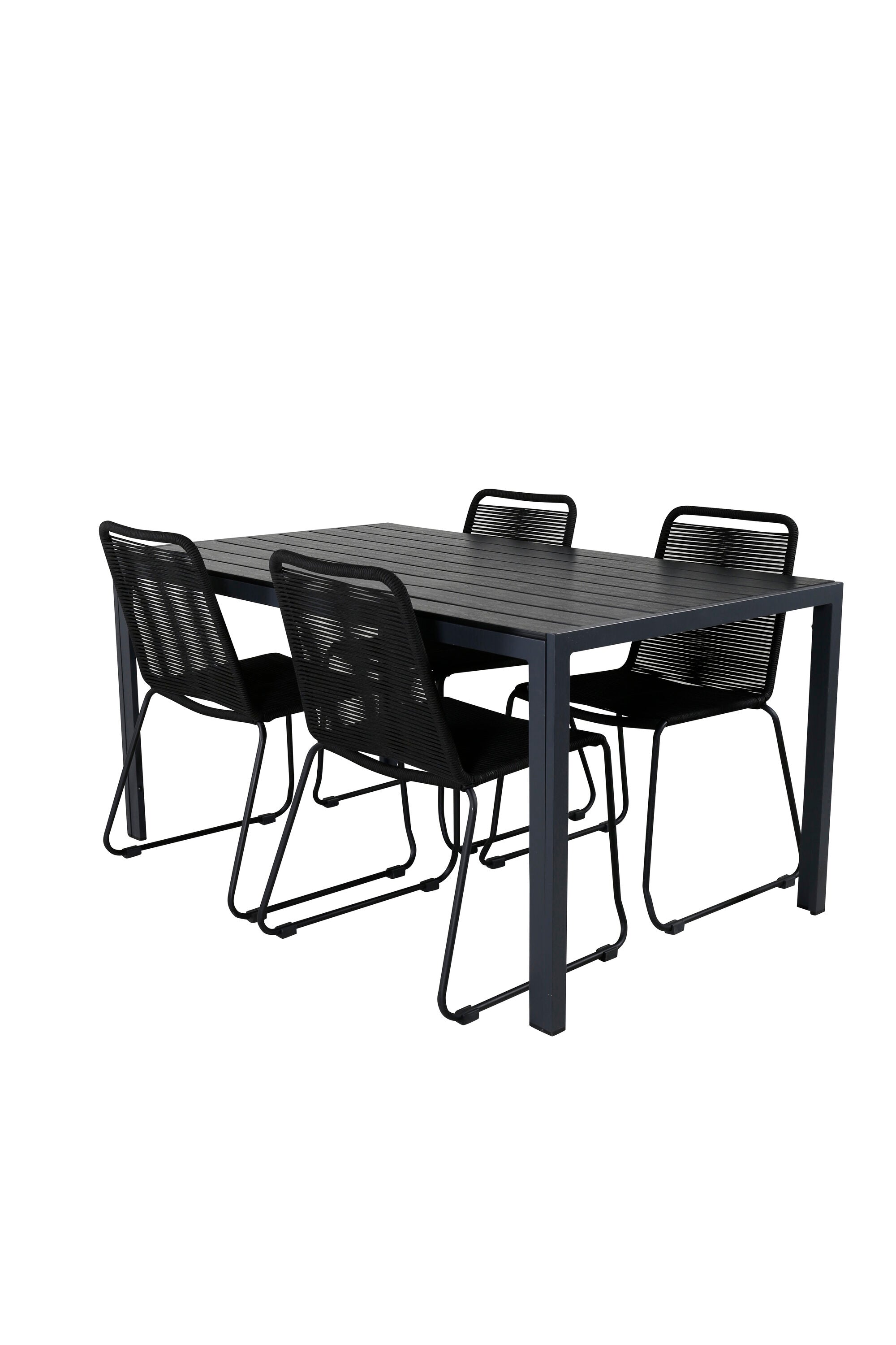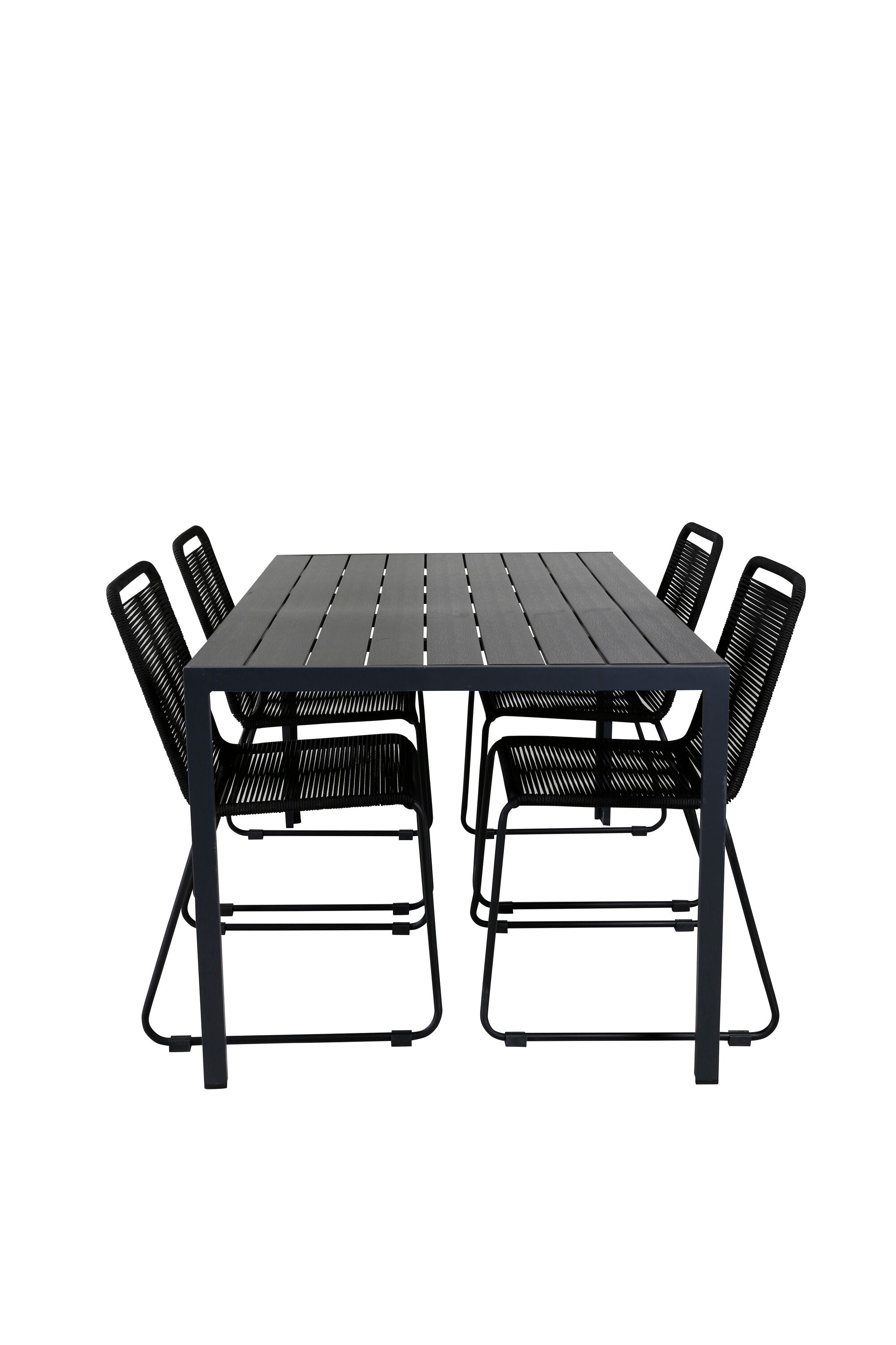 Vytvořte si stylovou atmosféru ve venkovním prostoru pomocí poutavé skupiny jídel v moderním duchu! Naše oblíbené jídelní židle Lindos svým minimalistickým designem opravdu udávají tón. Židle jsou stohovatelné pro praktické skladování a jsou vyrobeny v úzké, černé hliníkové konstrukci se sedákem z černého tkaného lana. Zde spolu s naším obdélníkovým jídelním stolem zlom v přímé severské podobě. Deska stolu je z černé překližky a hliníkového podvozku. Jednoduše dobře promyšlená skupina potravin, se kterou snadno vytvoříte okouzlující venkovní prostředí!