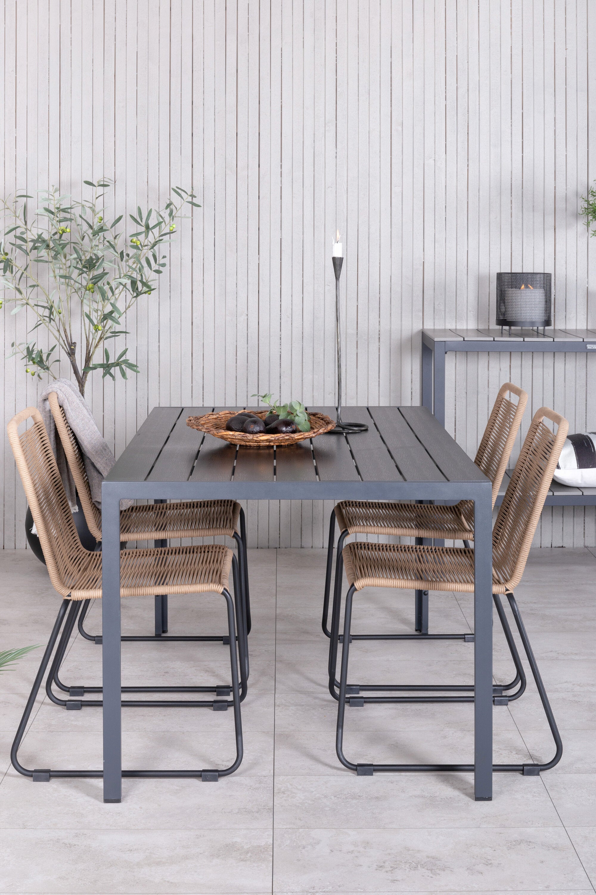 Náš obdélníkový jídelní stůl Break má klasický design s rovnými severskými tvary. Deska stolu je z černé překližky a hliníkového podvozku. Zde společně s trendy jídelními židlemi ze série Lindos v zemité barvě. Židle jsou stohovatelné pro praktické skladování a jsou vyrobeny v úzké, černé hliníkové konstrukci s béžovým sedákem z tkaného lana. Pozvěte na mnoho společenských okamžiků před námi!