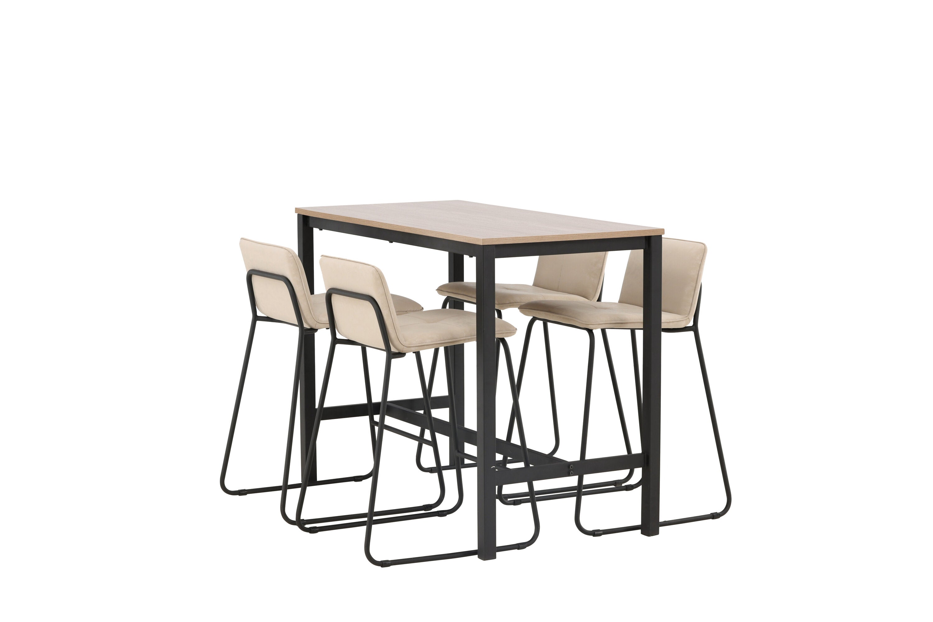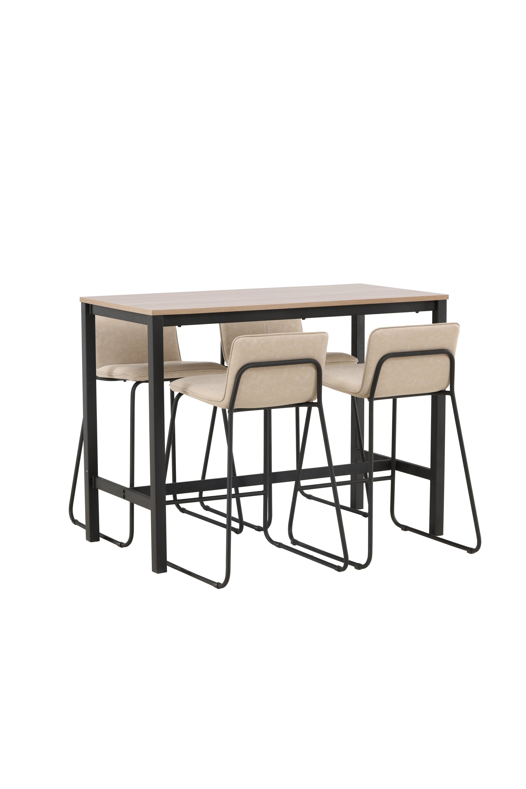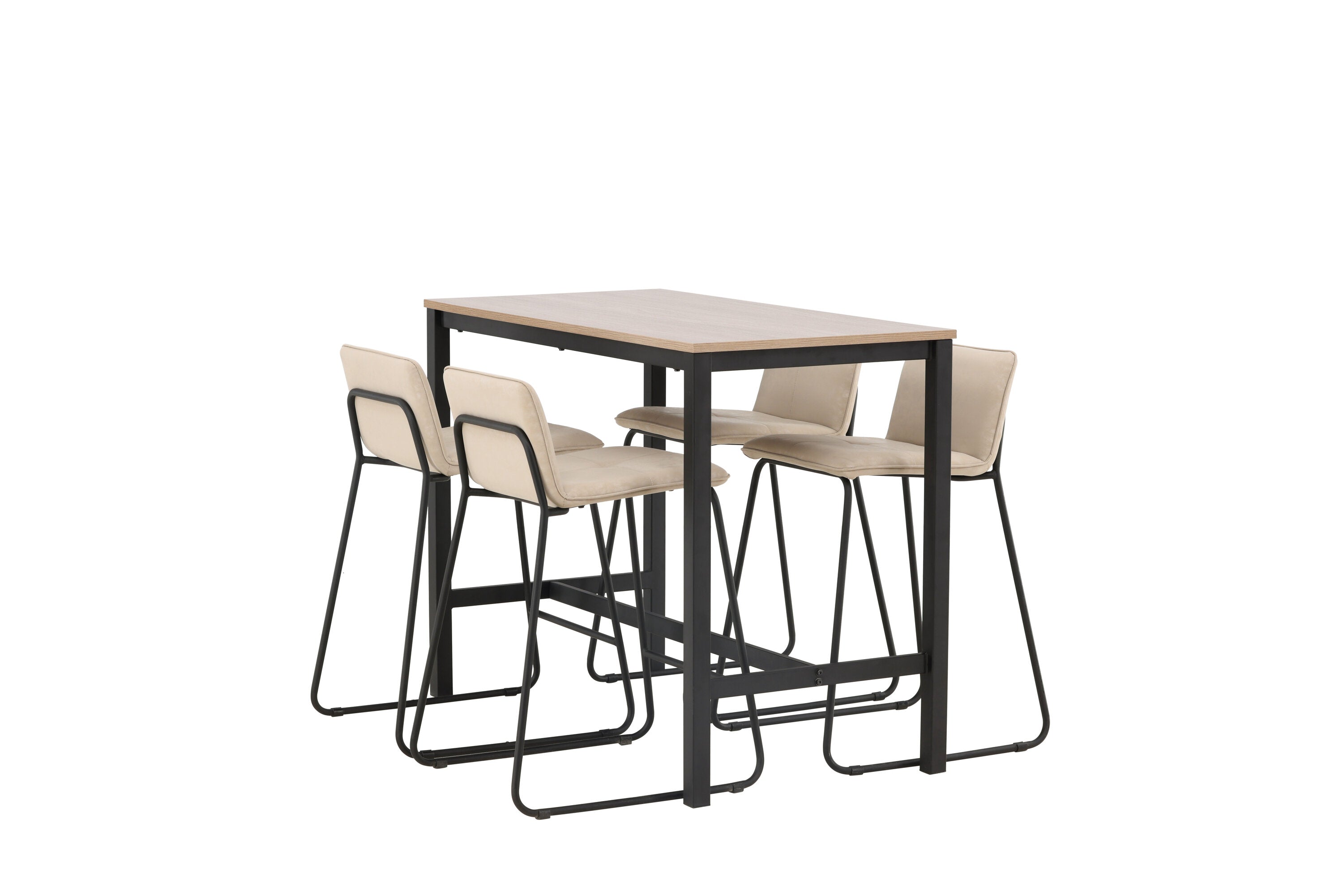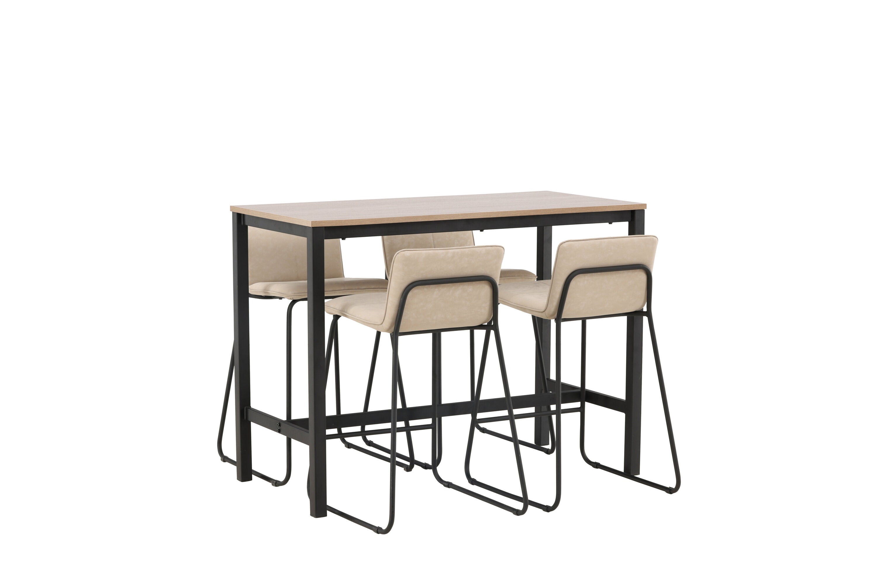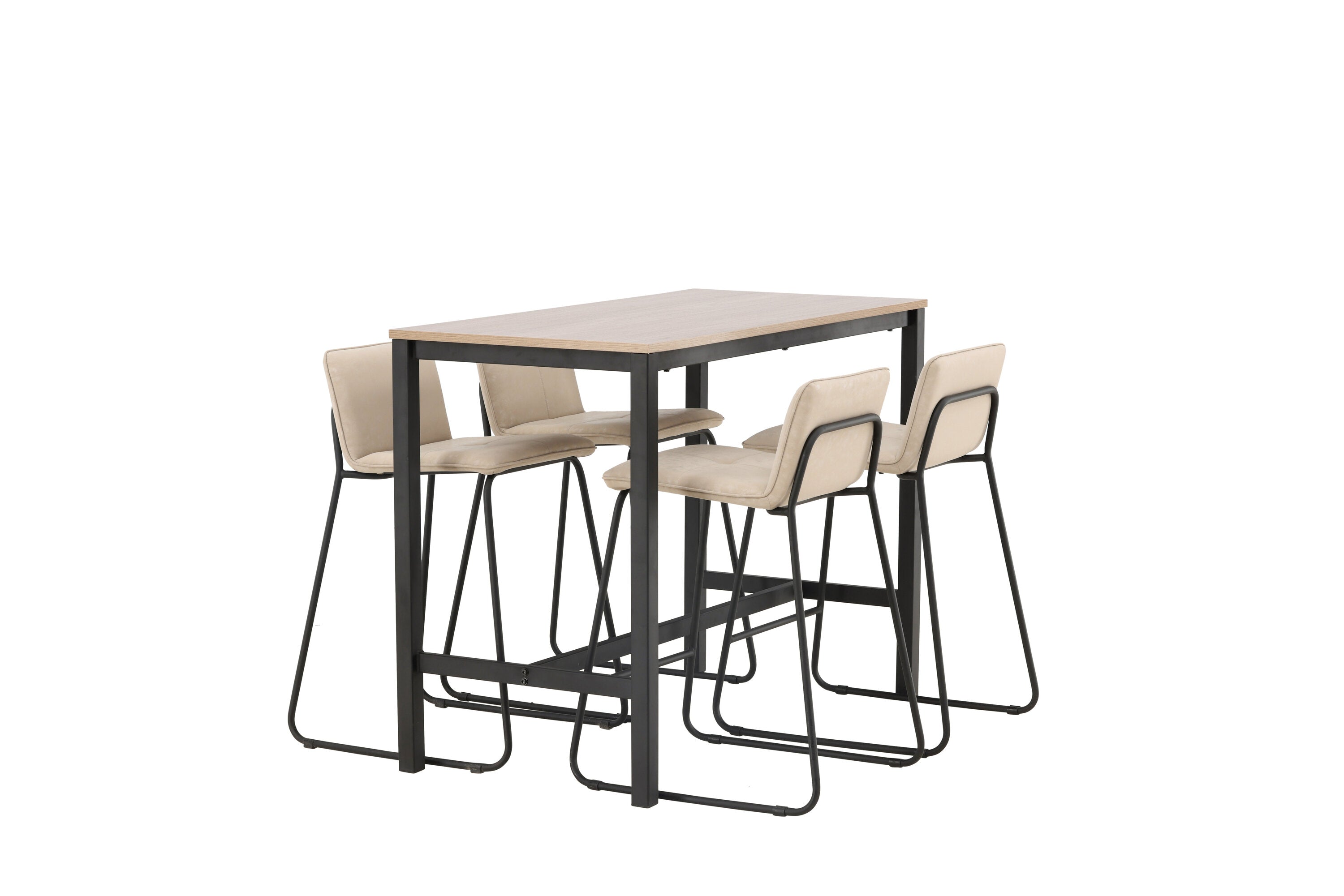Barové židle Bisbee v kombinaci s barovým stolem Camden dodají kuchyni trendy! Tato barová skupina má 4 místa a zemité barvy působí v místnosti útulným a hřejivým dojmem. Barový stůl má rovné severské tvary a klasický design, který obstojí ve zkoušce času. Stůl má desku z MDF v barvě ořechu a rovné nohy stolu z černé oceli s rámem pro podnožku. Barová židle má minimalistický sedák z čalouněné béžové látky z mikrovlákna a integrovanou podnožku z černé oceli a je tak stylová, jako je pohodlná na sezení. Umístěte do kuchyně nebo tam, kde je potřeba další sezení a prodlužte příjemné společné chvíle!