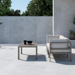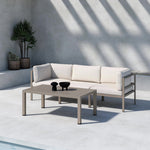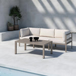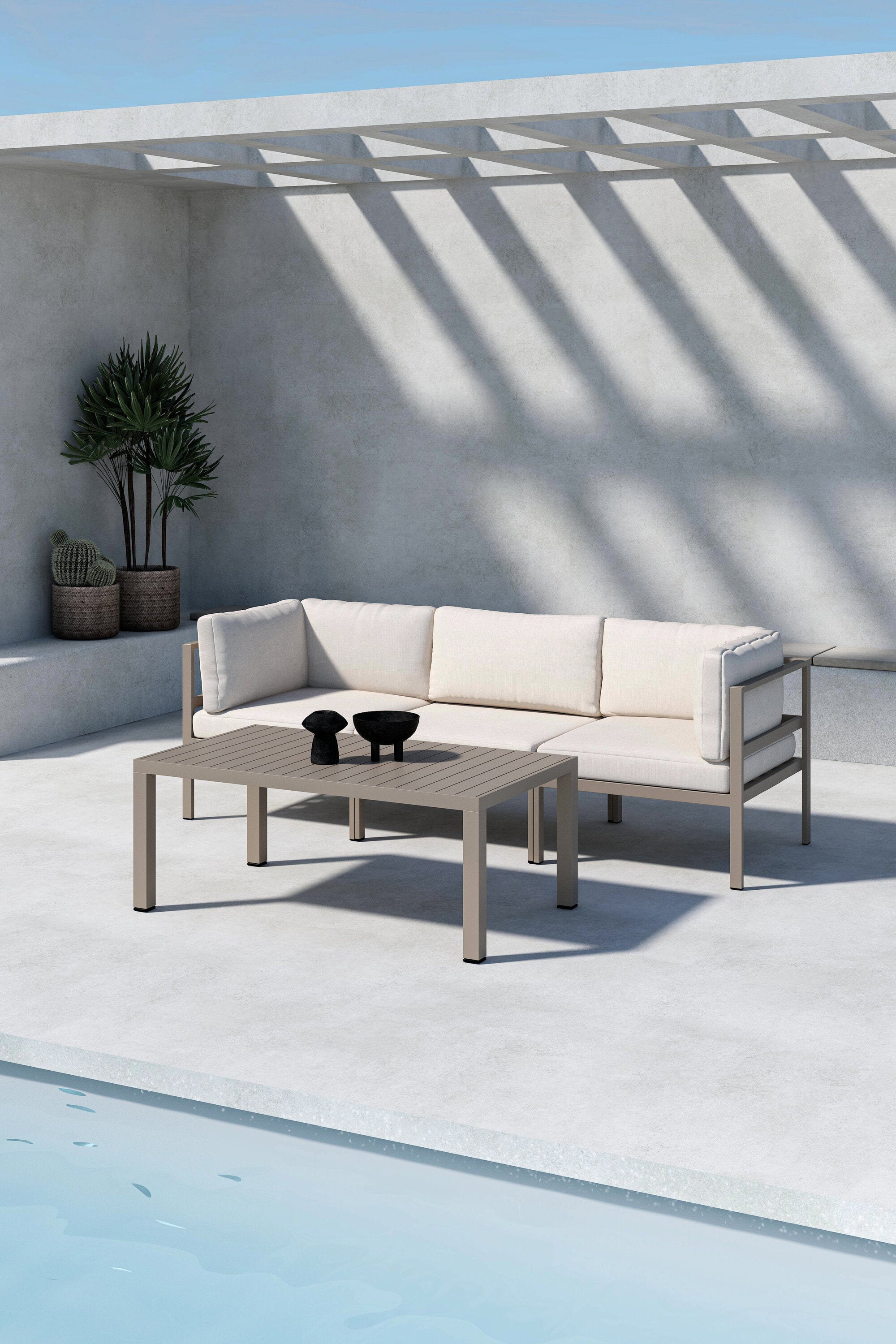 Její flexibilní design usnadňuje přizpůsobení umístění pohovky vašemu prostoru. Odpovídající konferenční stolek v hnědém hliníku je praktický a snadno se čistí a je ideální pro podávání nápojů, občerstvení a dekorací.