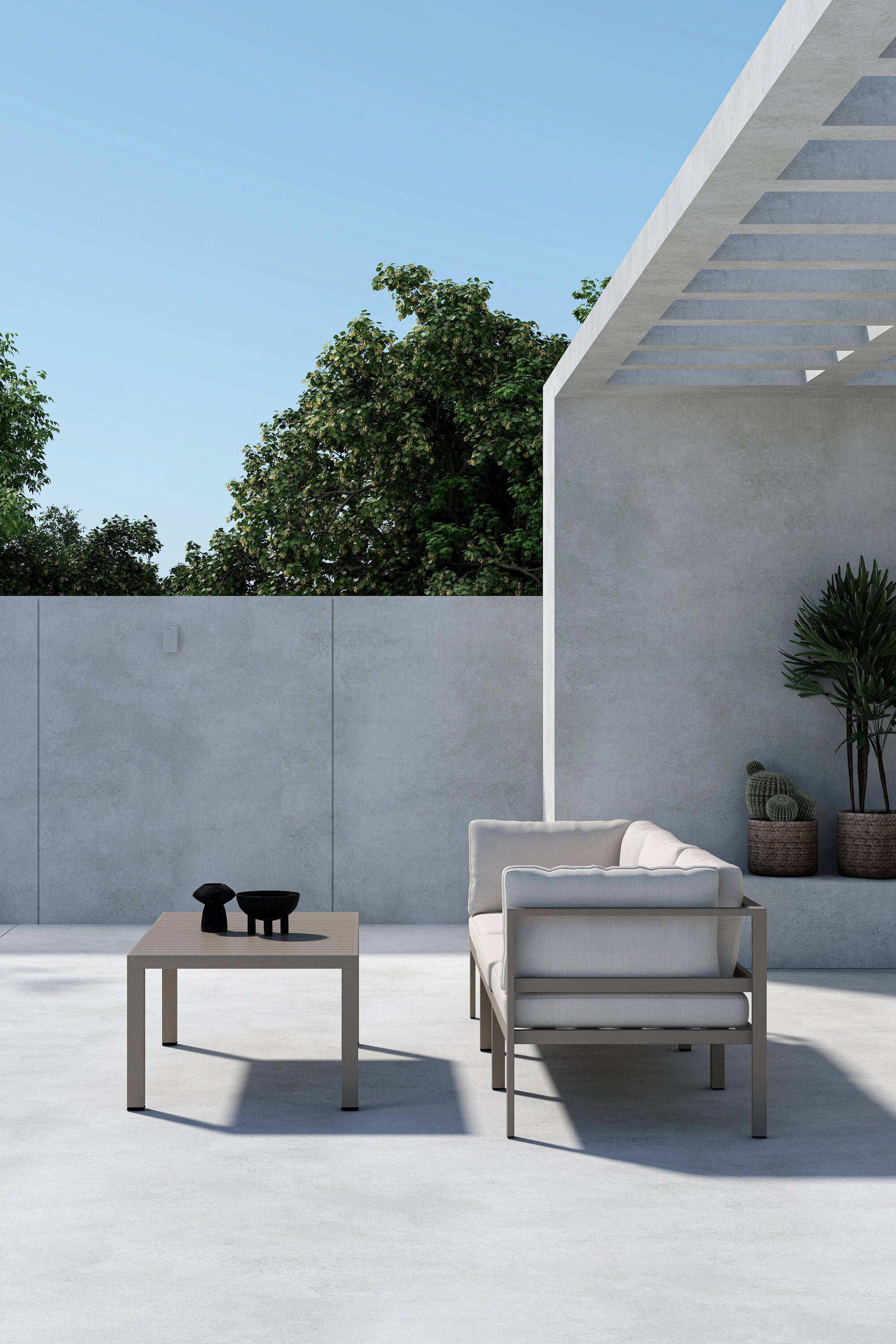 Rám je vyroben z hnědého hliníku, což je materiál odolný proti povětrnostním vlivům a korozi, který vyžaduje minimální údržbu. Sedáky jsou potaženy béžovou tkaninou Olefin, odolným a vodoodpudivým materiálem, který si zachovává svou barvu a kvalitu v průběhu času.