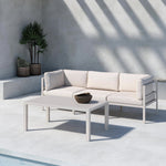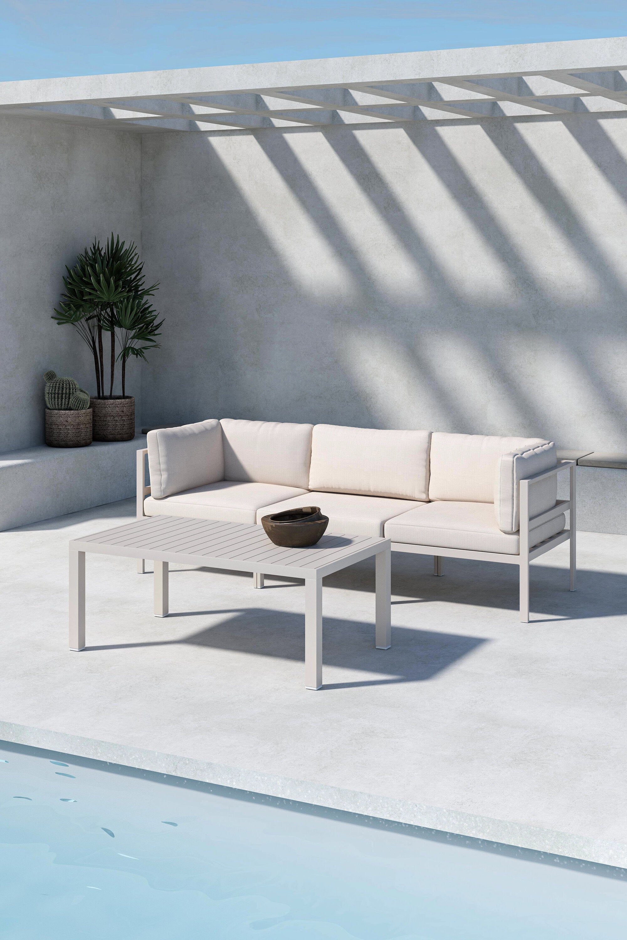 Rohová a střední část mohou být uspořádány různými způsoby, aby vyhovovaly vašemu venkovnímu prostoru. Odpovídající konferenční stolek v béžovém hliníku se snadno čistí a je praktický pro podávání nápojů a občerstvení.