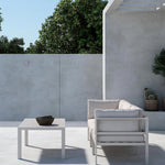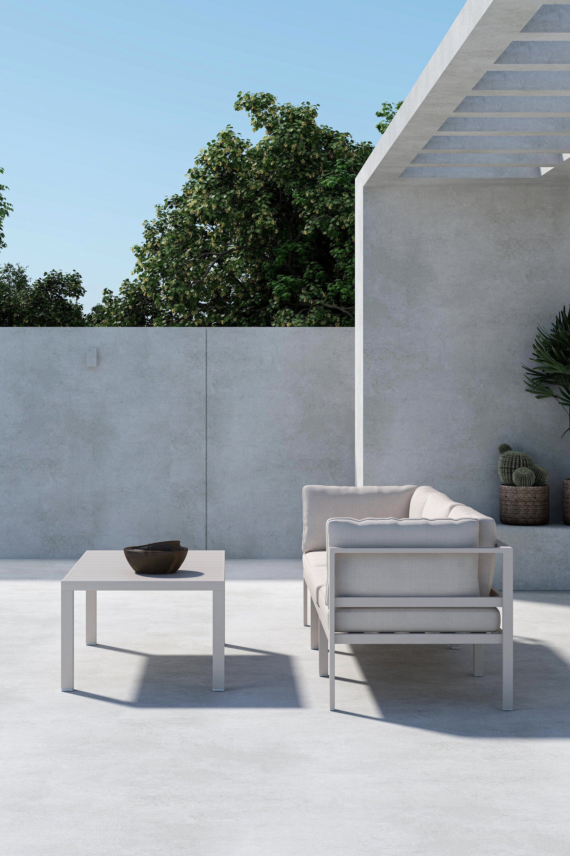 Rám je vyroben z béžového hliníku, což je nerezový materiál nenáročný na údržbu, který odolává počasí a větru. Sedáky jsou potaženy béžovou olefinovou látkou, UV odolným a voděodpudivým materiálem, který si zachovává svou barvu a kvalitu v průběhu času.