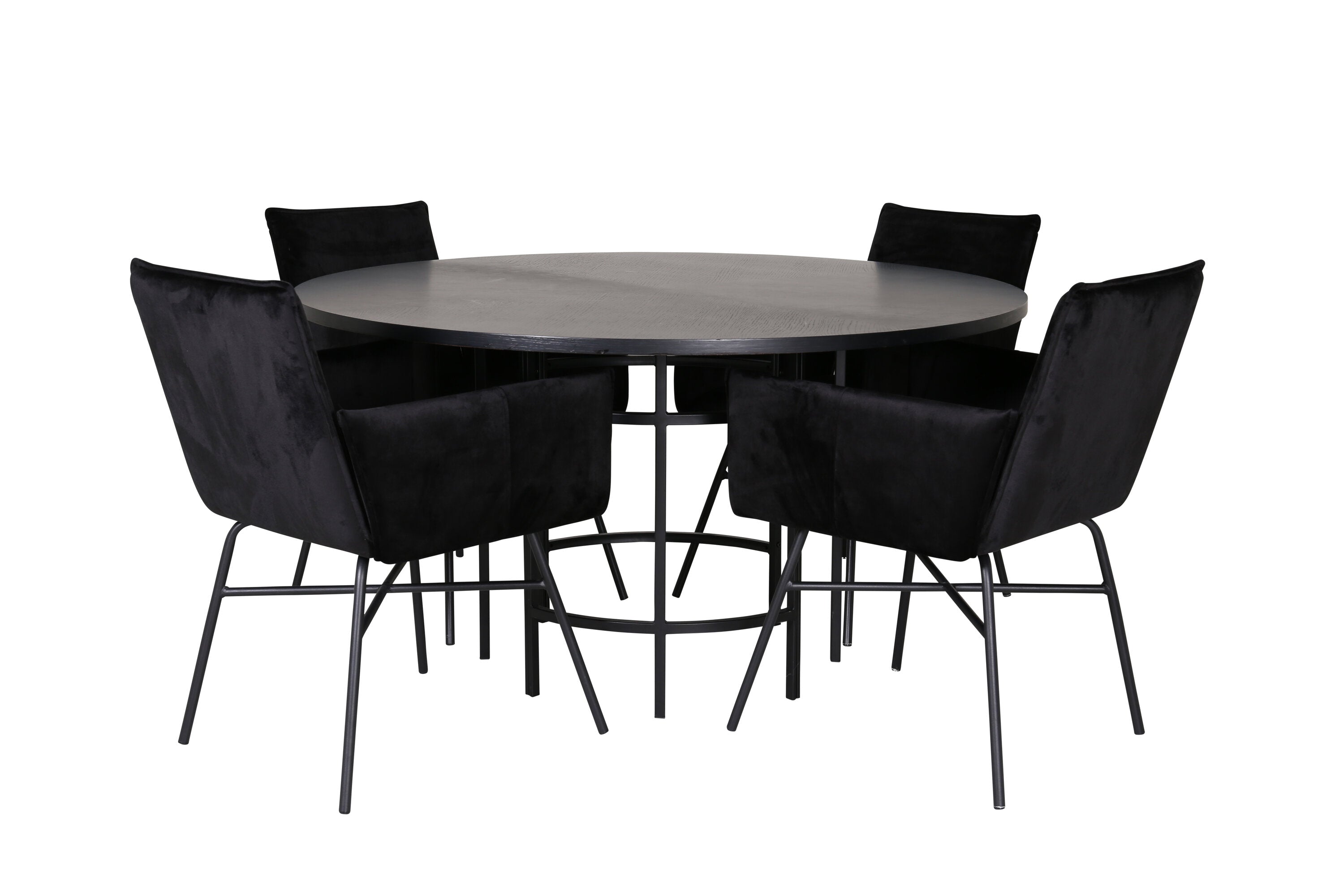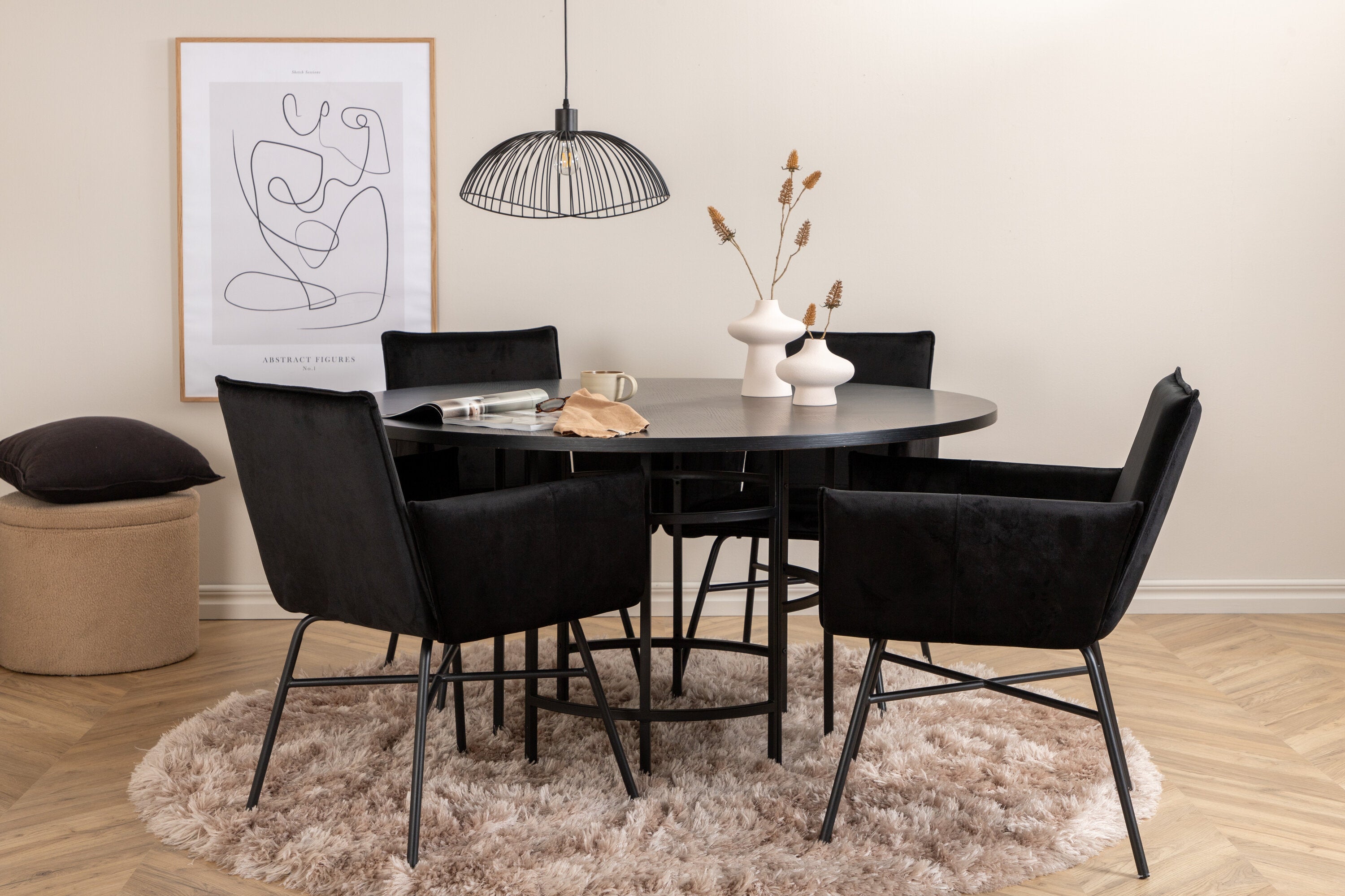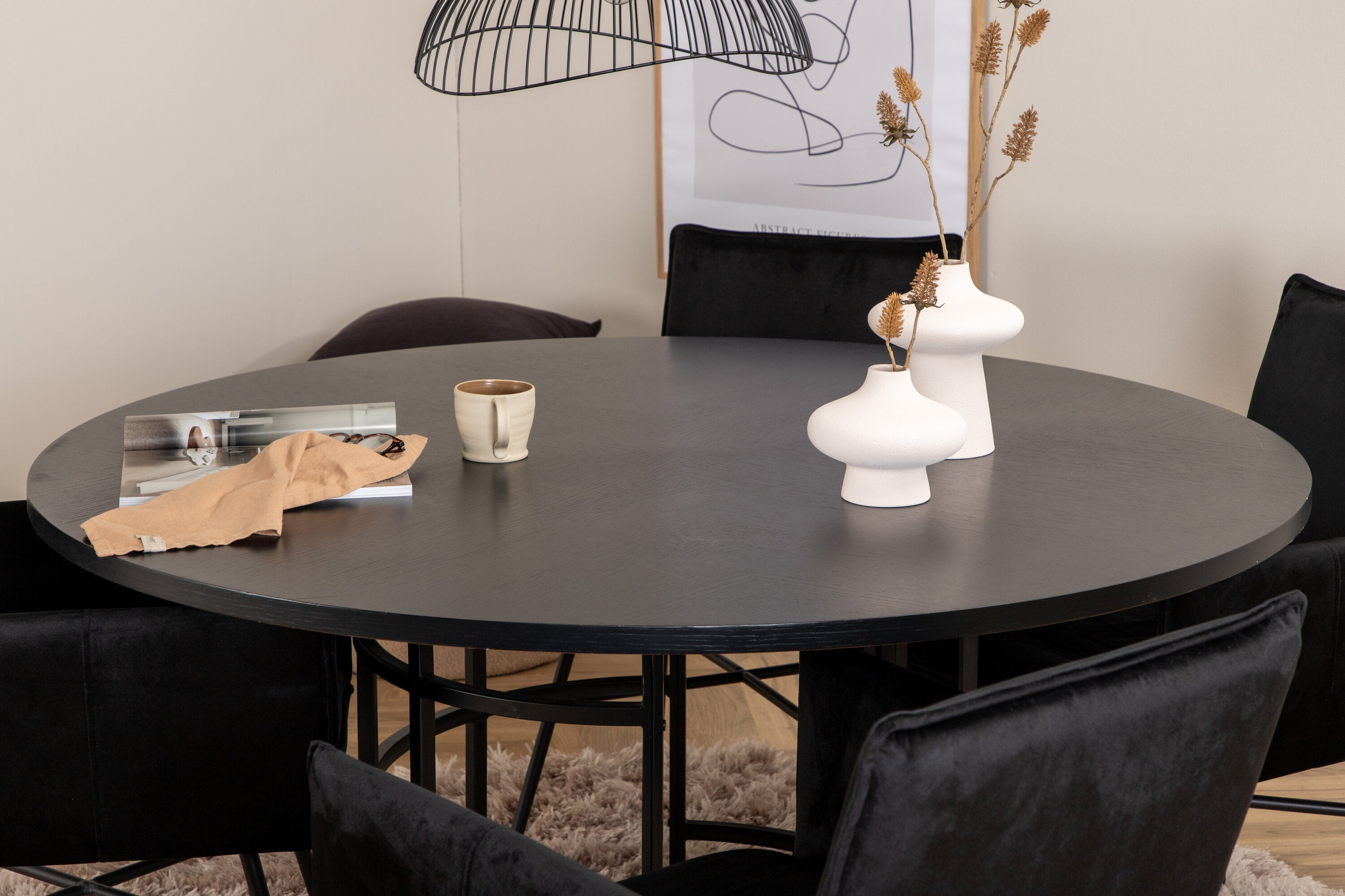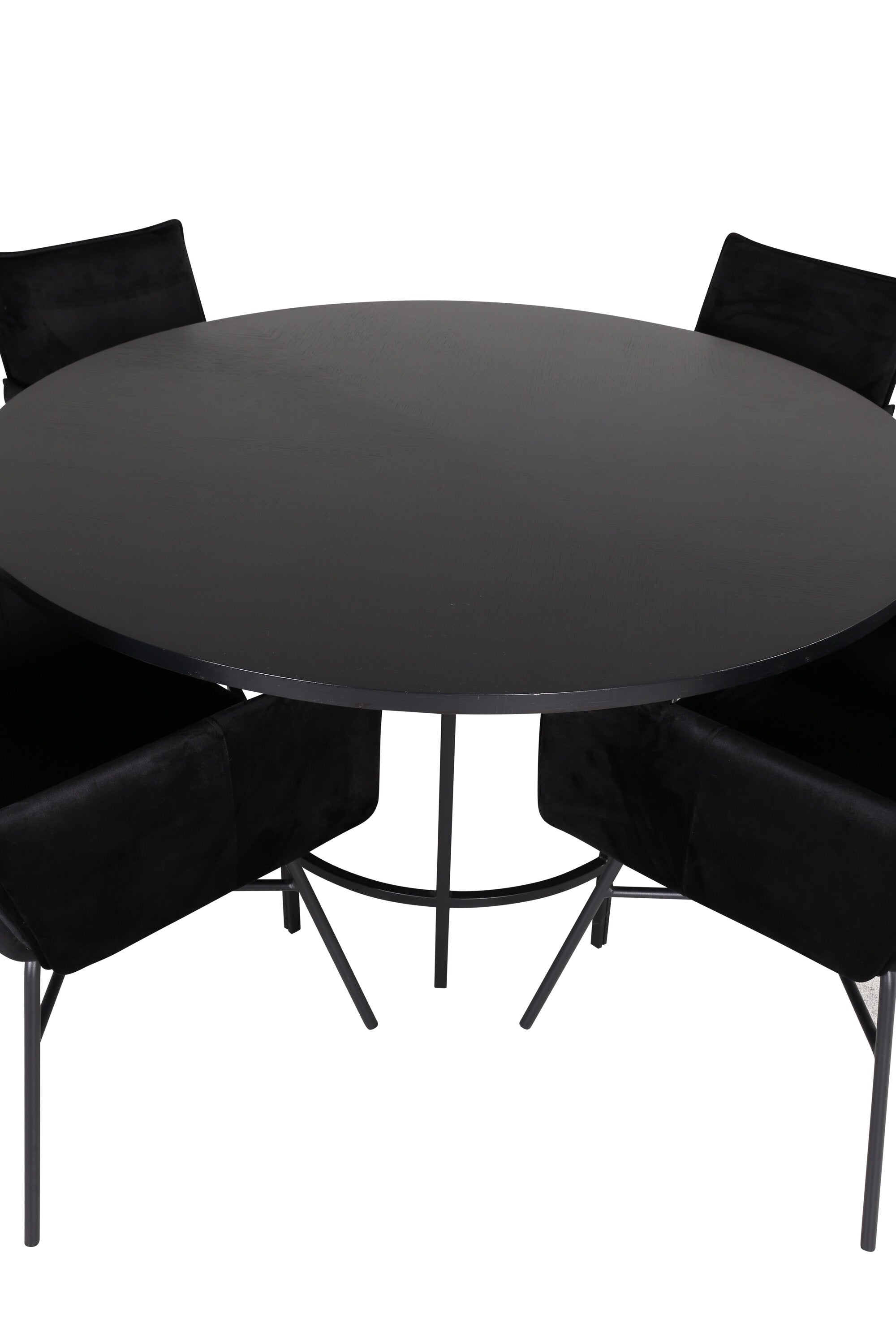 Copenhagen, náš oblíbený kulatý jídelní stůl s krásnou stolní deskou z černé MDF s dýhou a dekorativním podvozkem válcového tvaru v černém kovu. Stůl je konzistentně v elegantní černé barvě, která dodává místnosti pompézní a namyšlený výraz, ale také snadno sladíte s jiným dekorem. Rozměry stolu: Průměr: 140 cm, Výška: 74 cm. Zde je sladěn se 4 jídelními židlemi Petra v luxusním designu. Židle mají pohodlnou hloubku sedáku se sedákem z černého sametu a úzkými nohami židle ze železa. Rozměry židle: Výška: 87 cm, výška sedáku: 48 cm, šířka: 57 cm, hloubka: 60 cm. Příjemná skupina jídel pro všechny příležitosti!