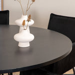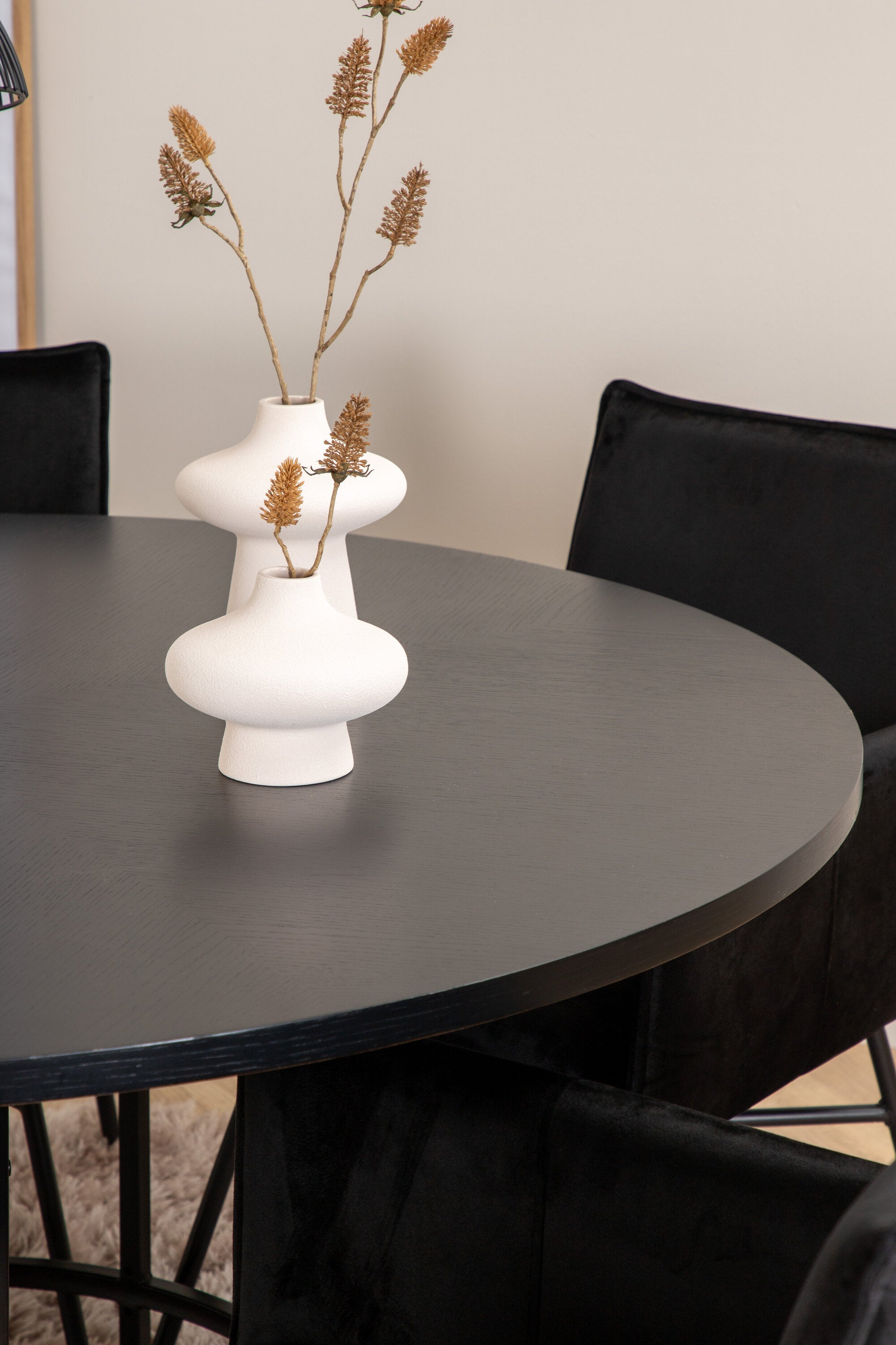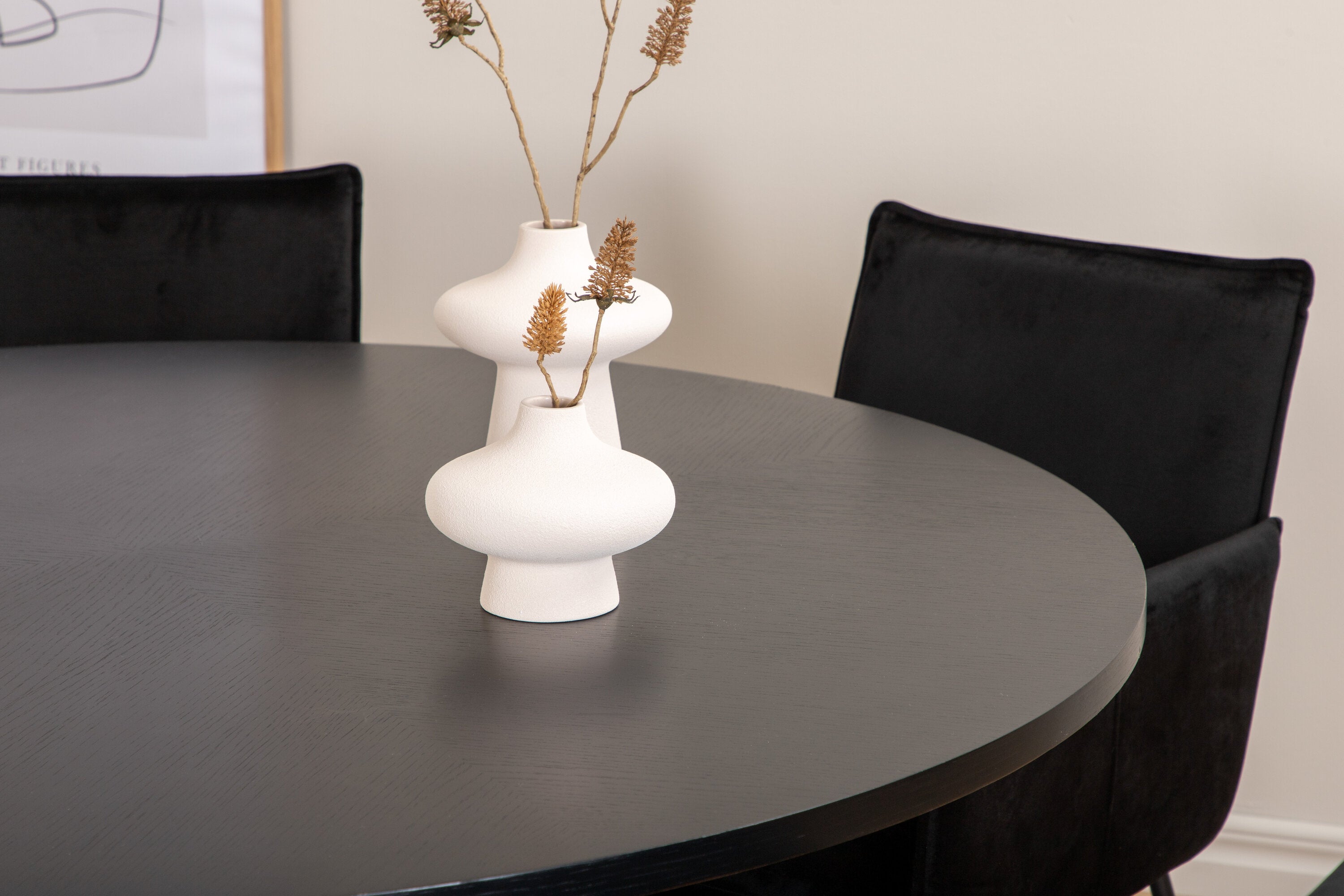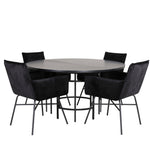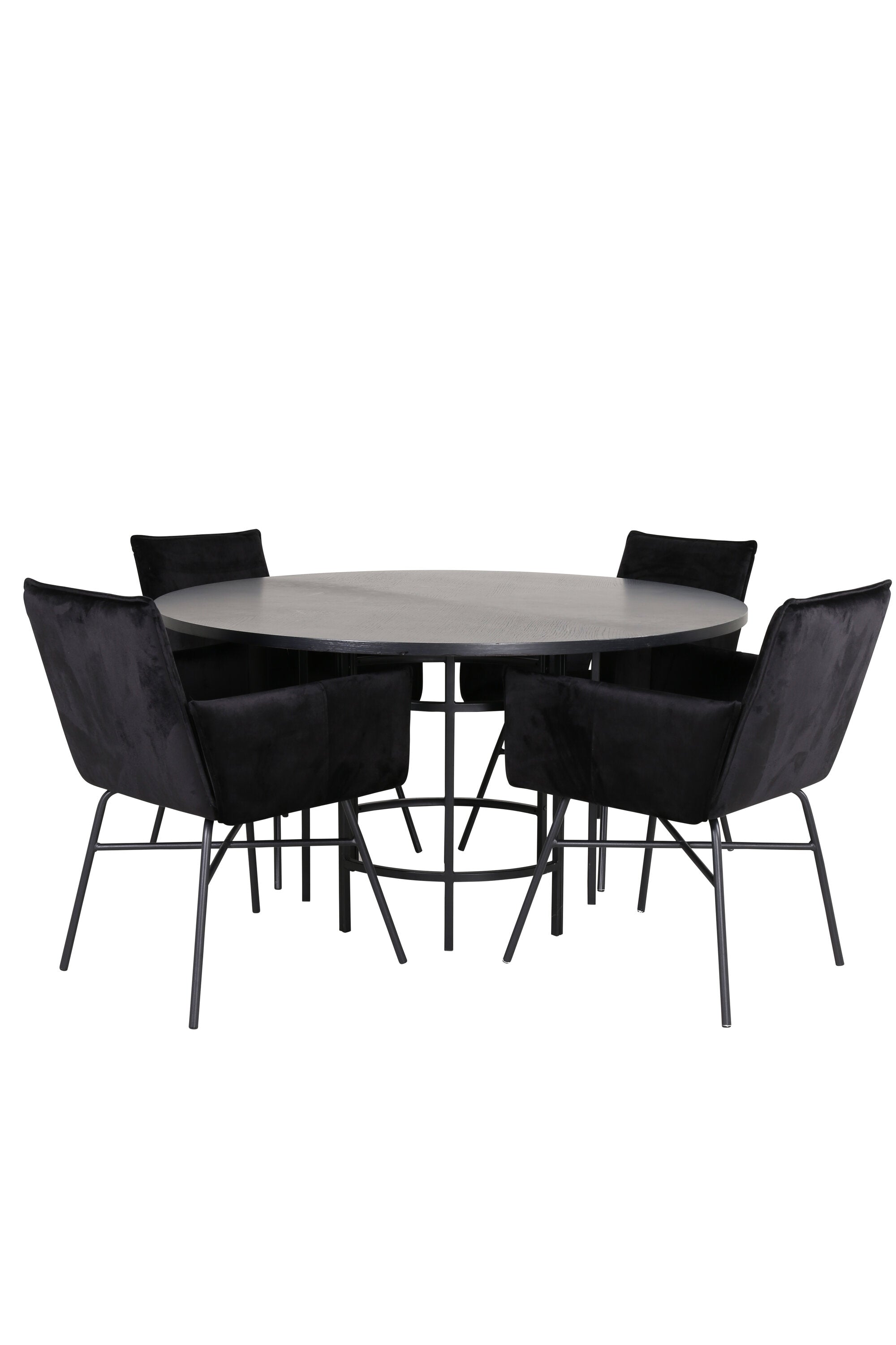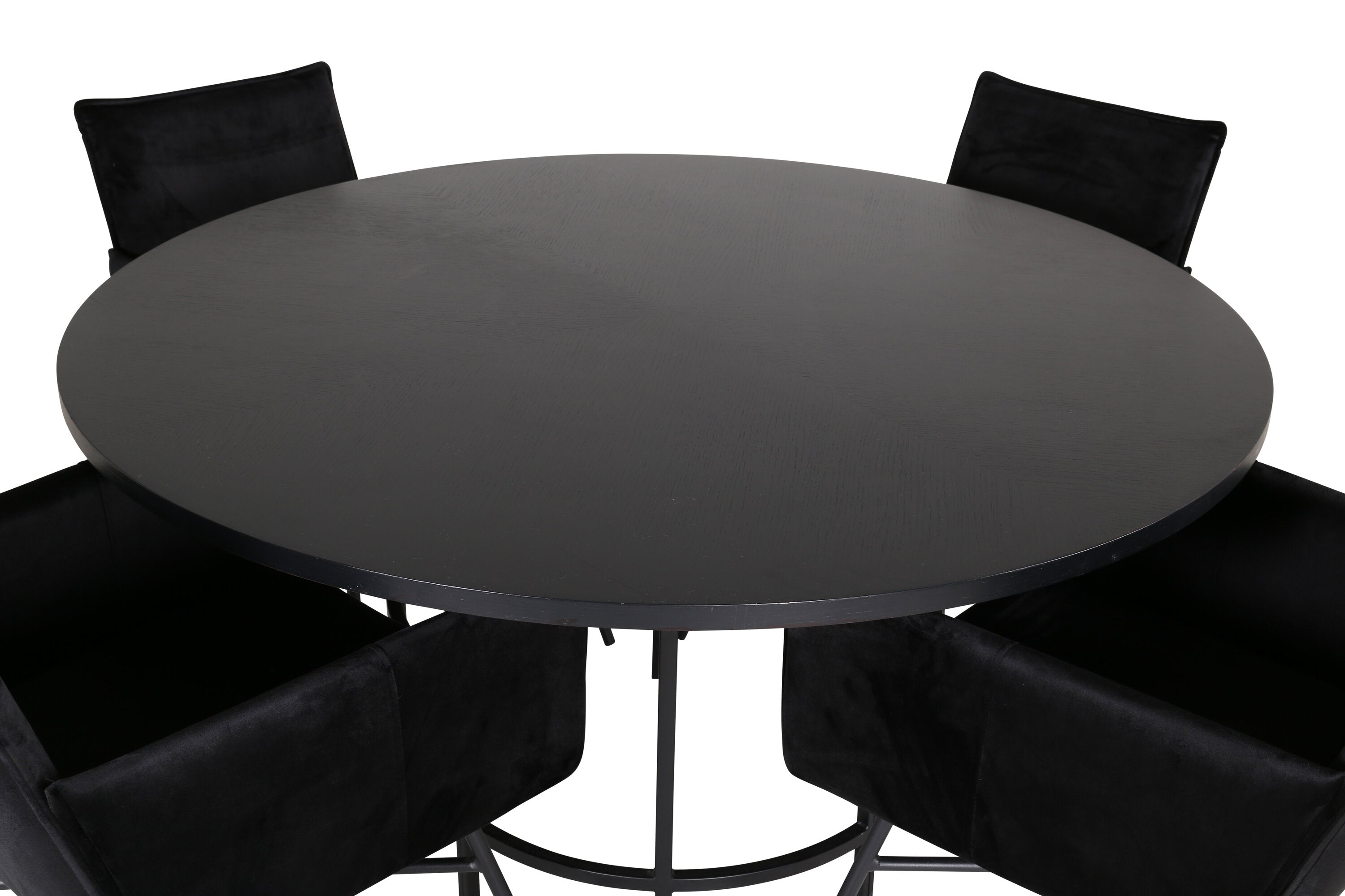 Copenhagen, náš oblíbený kulatý jídelní stůl s krásnou stolní deskou z černé MDF s dýhou a dekorativním podvozkem válcového tvaru v černém kovu. Stůl je konzistentně v elegantní černé barvě, která dodává místnosti pompézní a namyšlený výraz, ale také snadno sladíte s jiným dekorem. Rozměry stolu: Průměr: 140 cm, Výška: 74 cm. Zde je sladěn se 4 jídelními židlemi Petra v luxusním designu. Židle mají pohodlnou hloubku sedáku se sedákem z černého sametu a úzkými nohami židle ze železa. Rozměry židle: Výška: 87 cm, výška sedáku: 48 cm, šířka: 57 cm, hloubka: 60 cm. Příjemná skupina jídel pro všechny příležitosti!