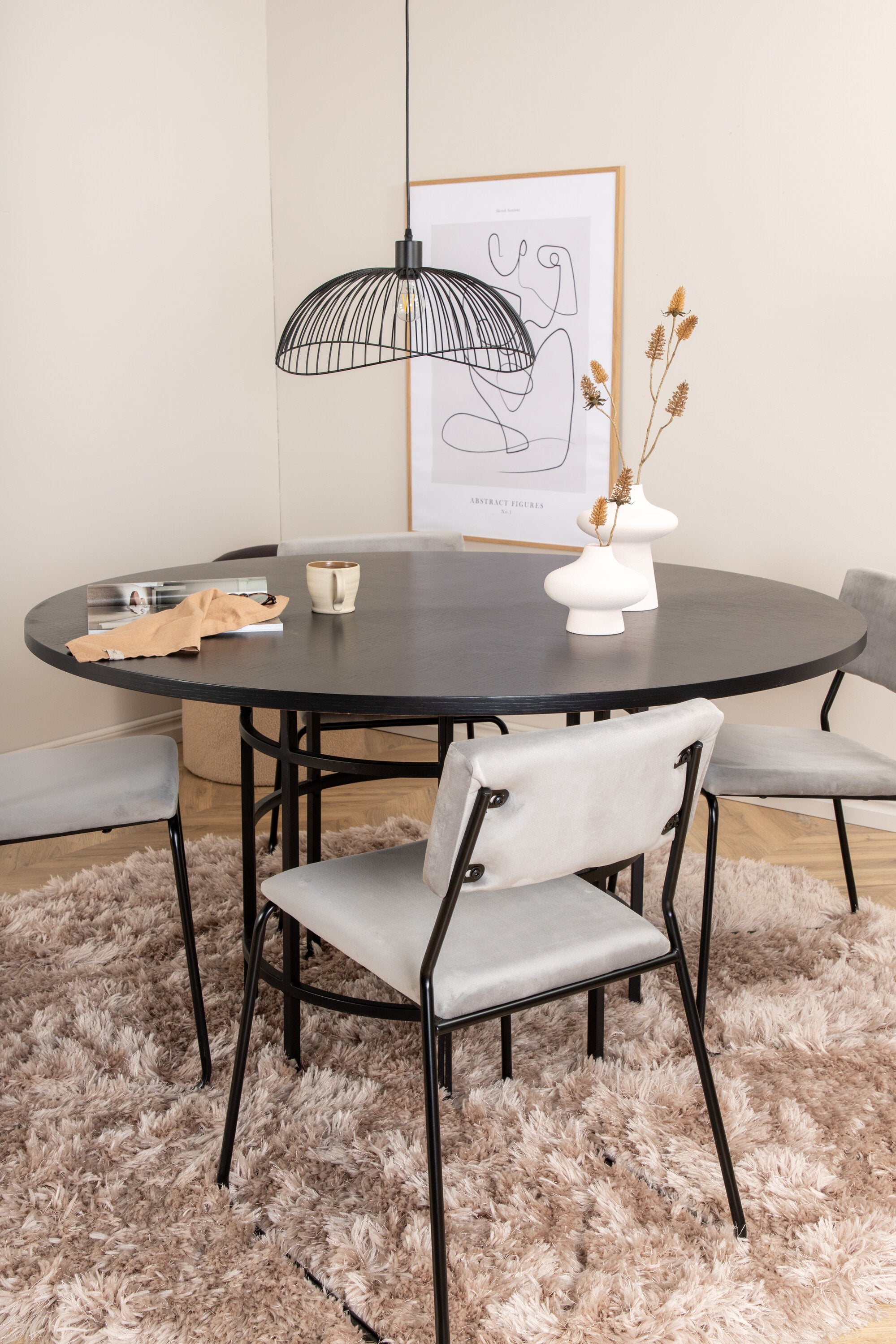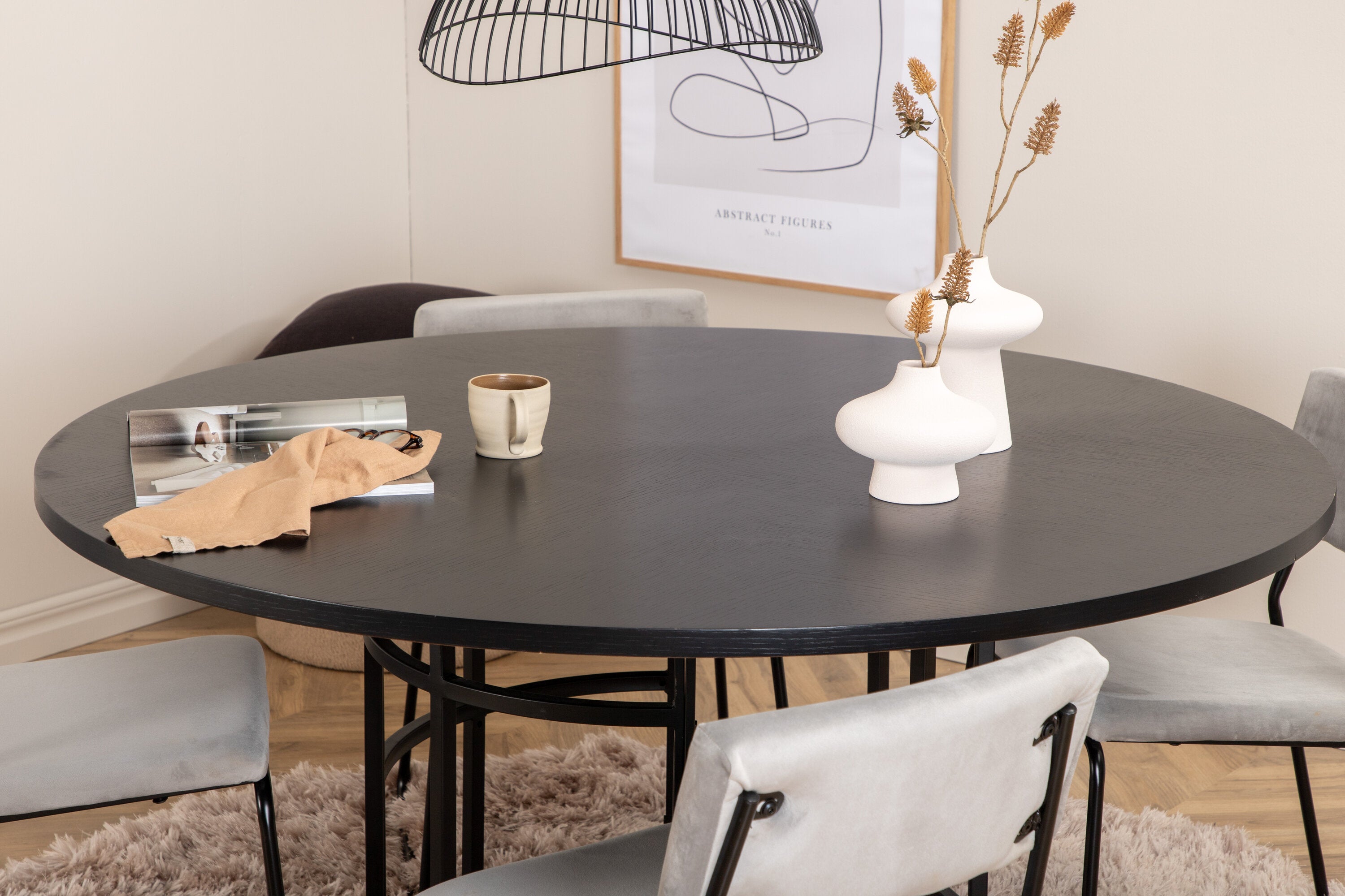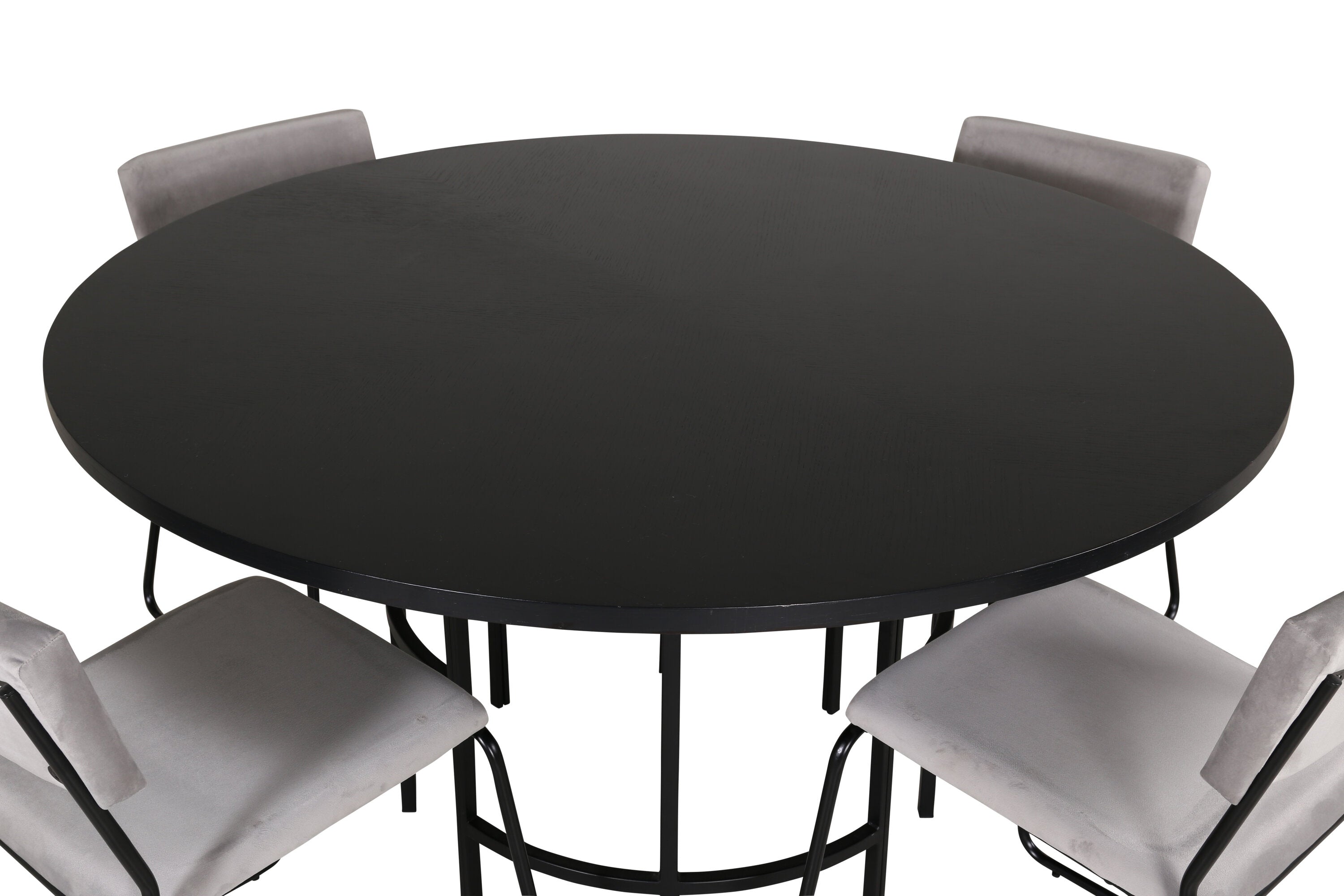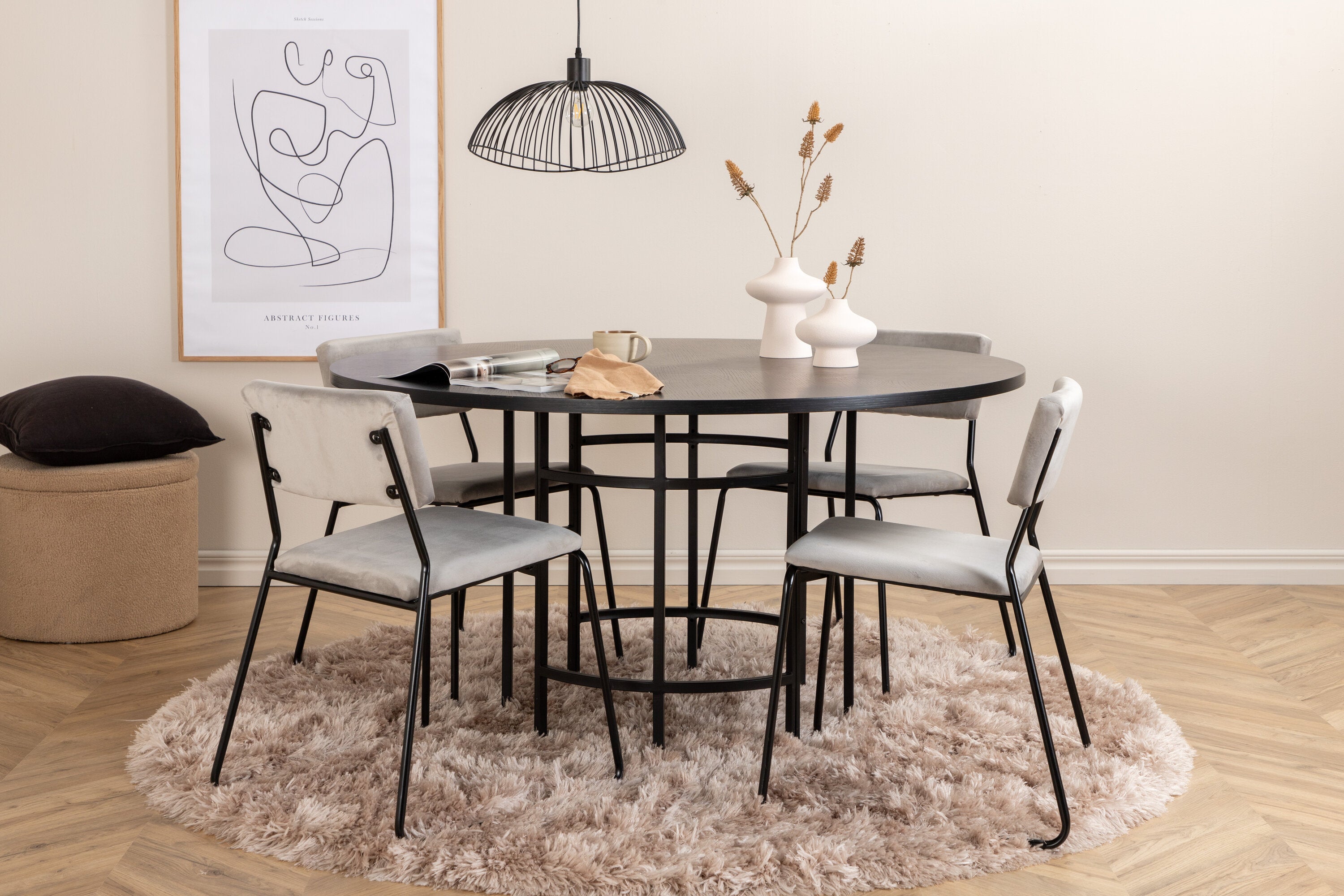 Spojte industriální vzhled s minimalistickým dekorem! Jídelní stůl Copenhagen má trendový design v konzistentně černé barvě se stolovou deskou z MDF s dýhou a dekorativním kovovým podvozkem válcového tvaru. Rozměry stolu: Průměr: 140 cm, Výška: 74 cm. Zde sladěné se 4 stylovými jídelními židlemi ze série Kenth. Nohy židle jsou úzké ze železa a pohodlná sedadla ze světle šedé sametové látky. Rozměry židle: Výška: 76 cm, výška sedáku: 48,5 cm, šířka: 40 cm, hloubka: 52 cm. Vytvořte okouzlující středobod, ve kterém můžete shromáždit rodinu a přátele!