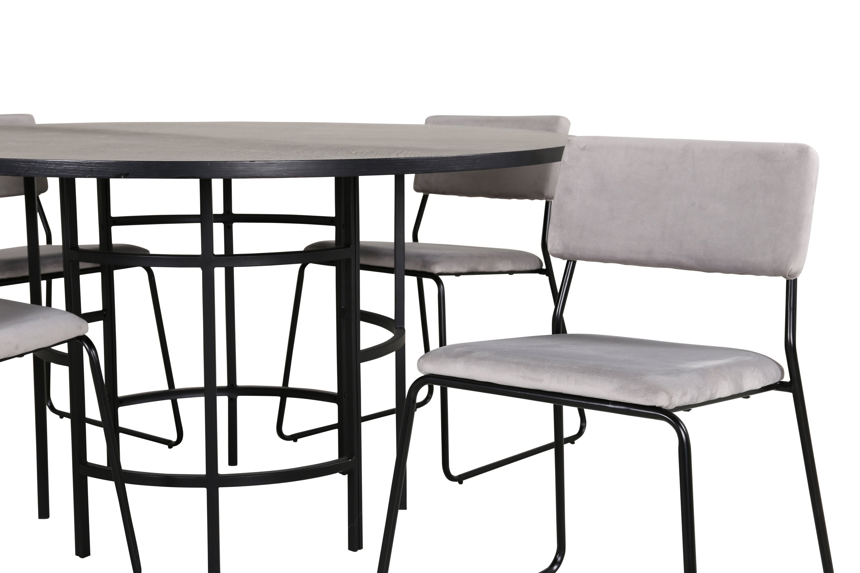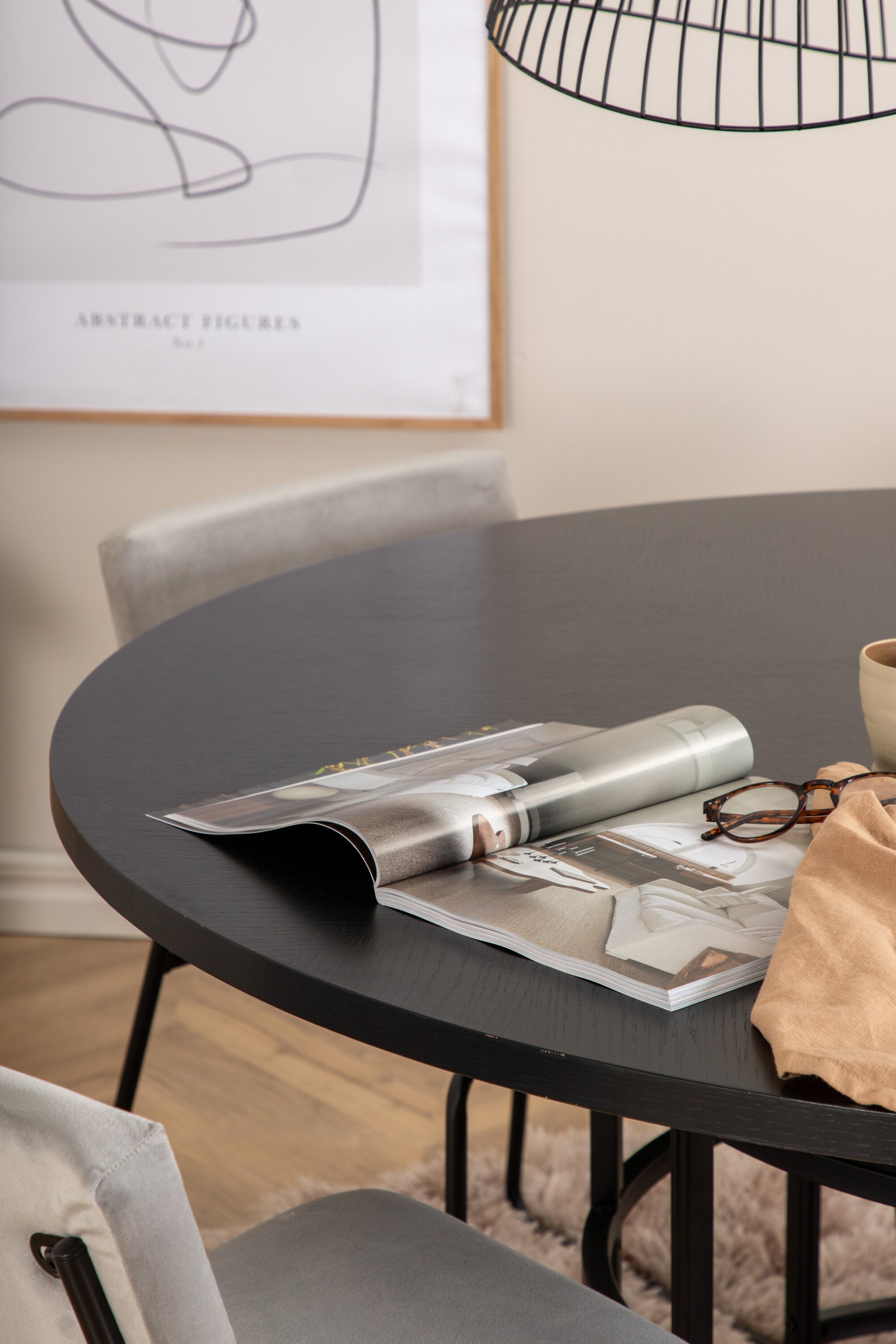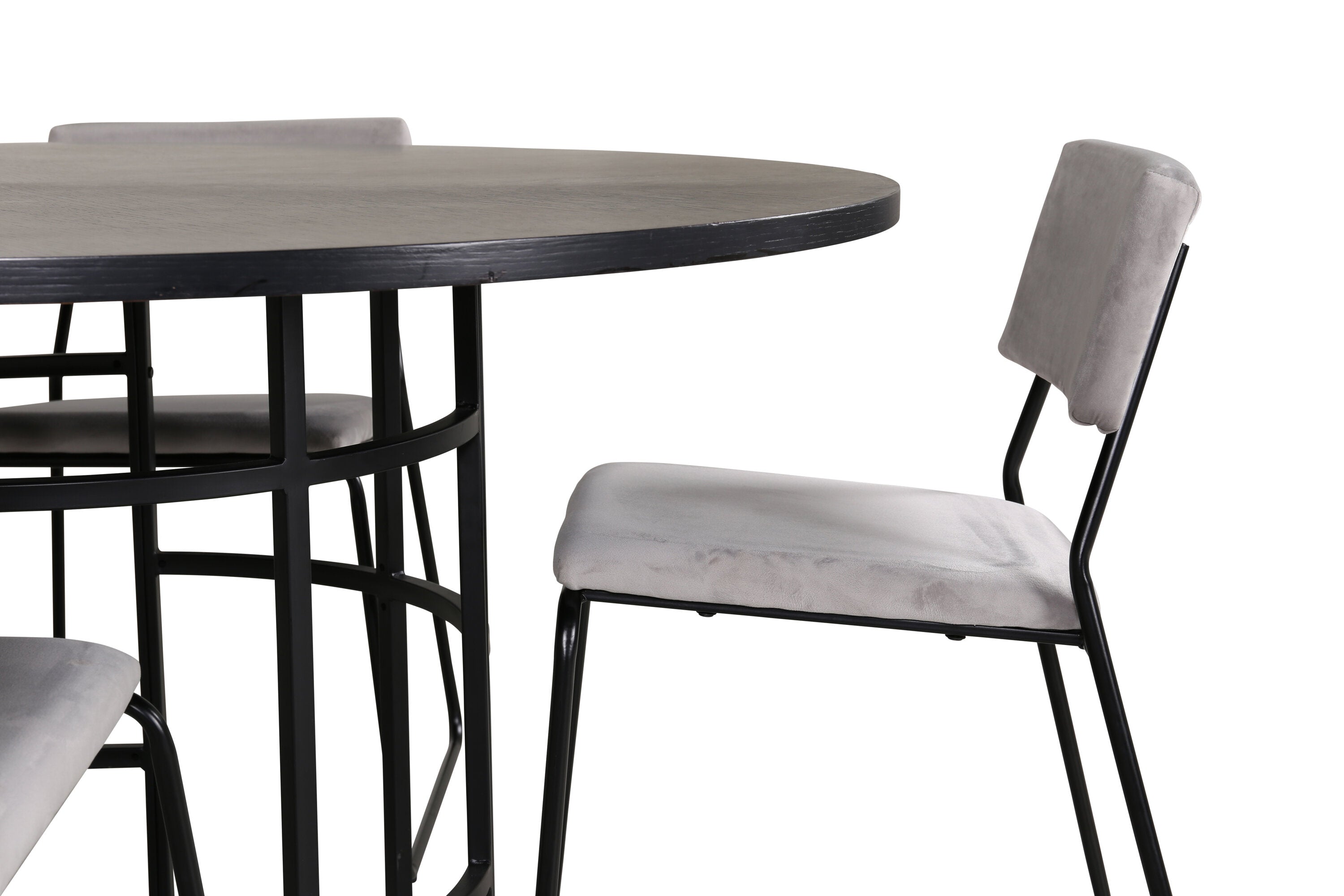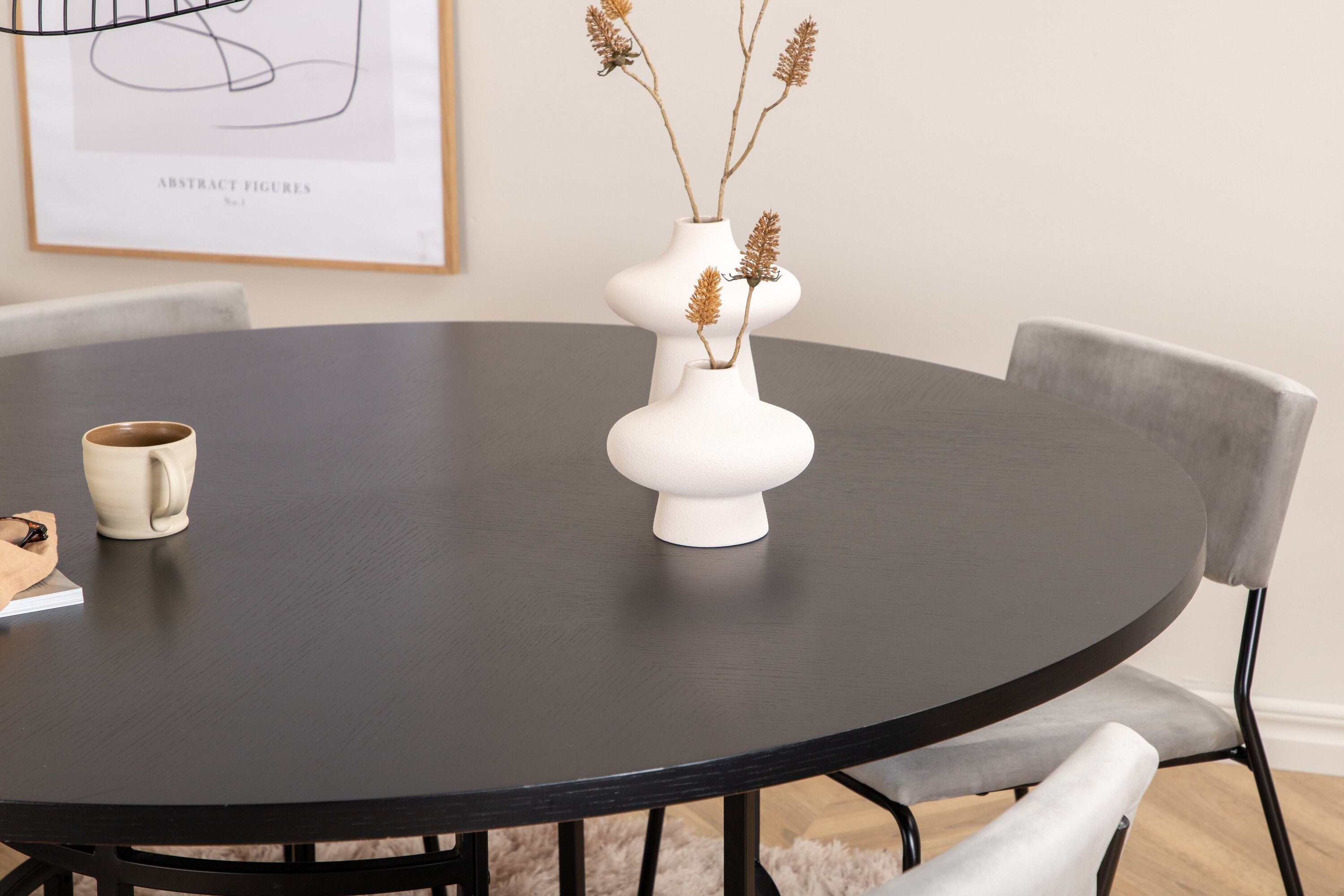 Spojte industriální vzhled s minimalistickým dekorem! Jídelní stůl Copenhagen má trendový design v konzistentně černé barvě se stolovou deskou z MDF s dýhou a dekorativním kovovým podvozkem válcového tvaru. Rozměry stolu: Průměr: 140 cm, Výška: 74 cm. Zde sladěné se 4 stylovými jídelními židlemi ze série Kenth. Nohy židle jsou úzké ze železa a pohodlná sedadla ze světle šedé sametové látky. Rozměry židle: Výška: 76 cm, výška sedáku: 48,5 cm, šířka: 40 cm, hloubka: 52 cm. Vytvořte okouzlující středobod, ve kterém můžete shromáždit rodinu a přátele!