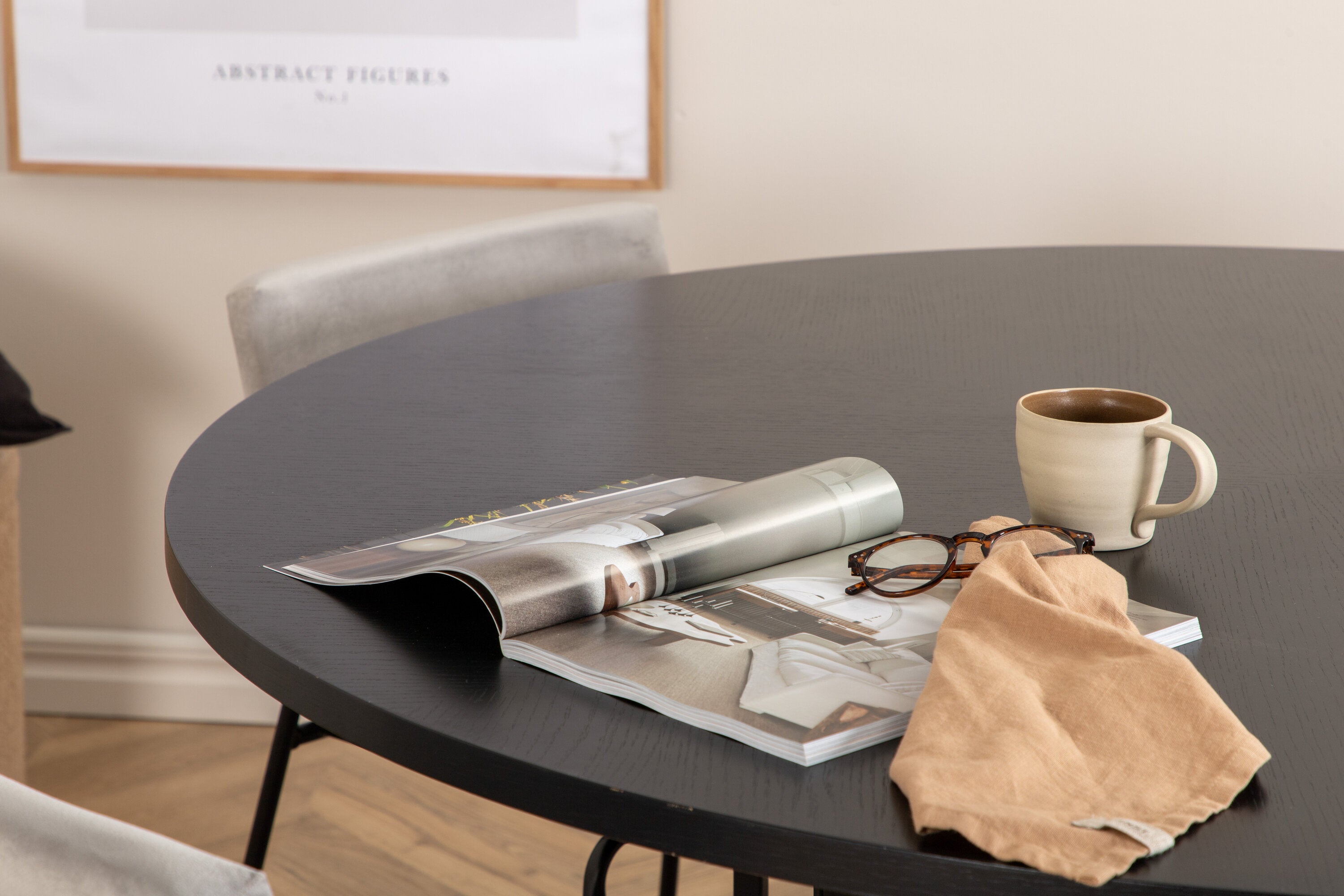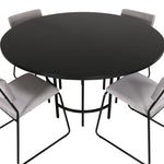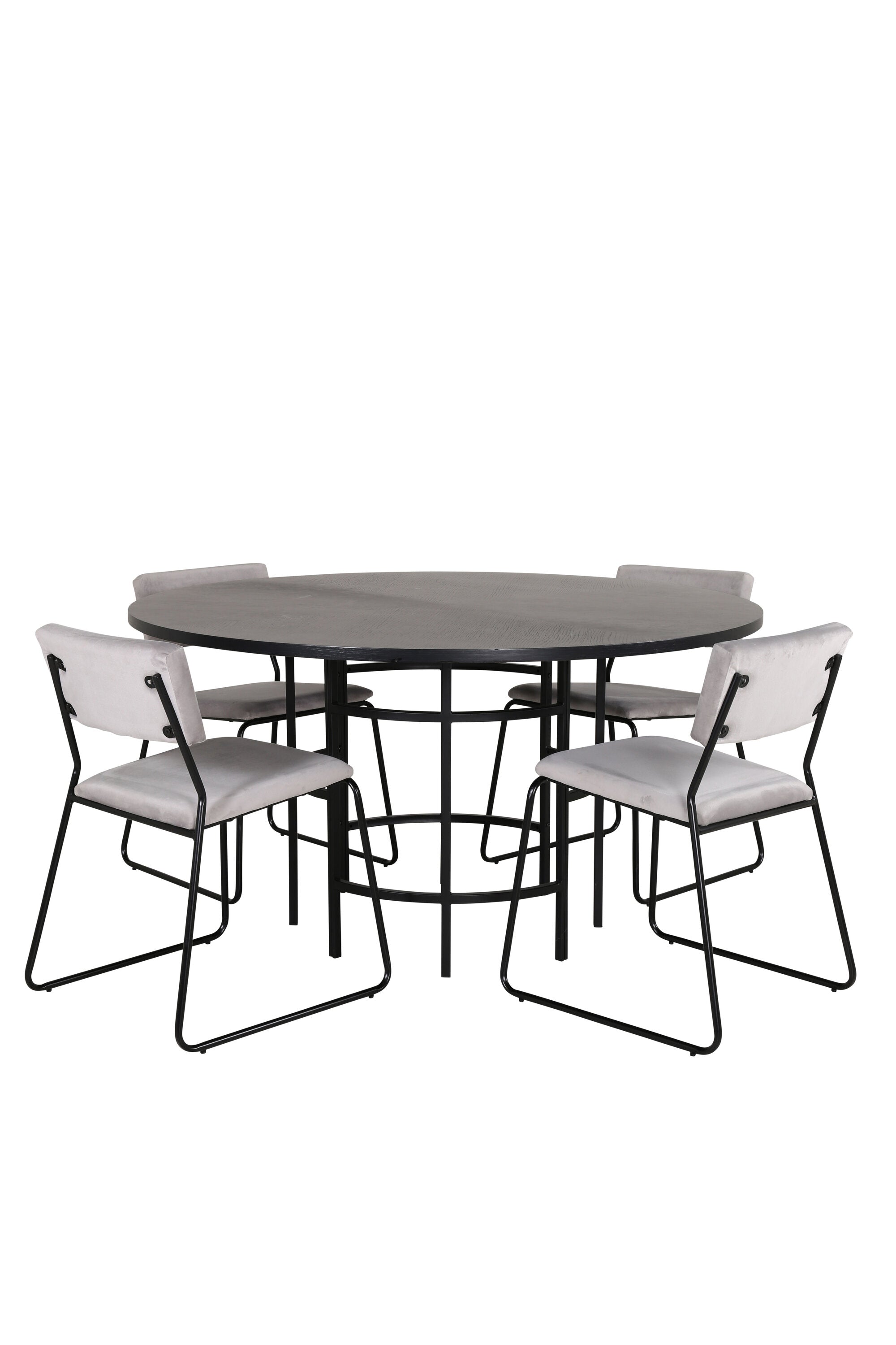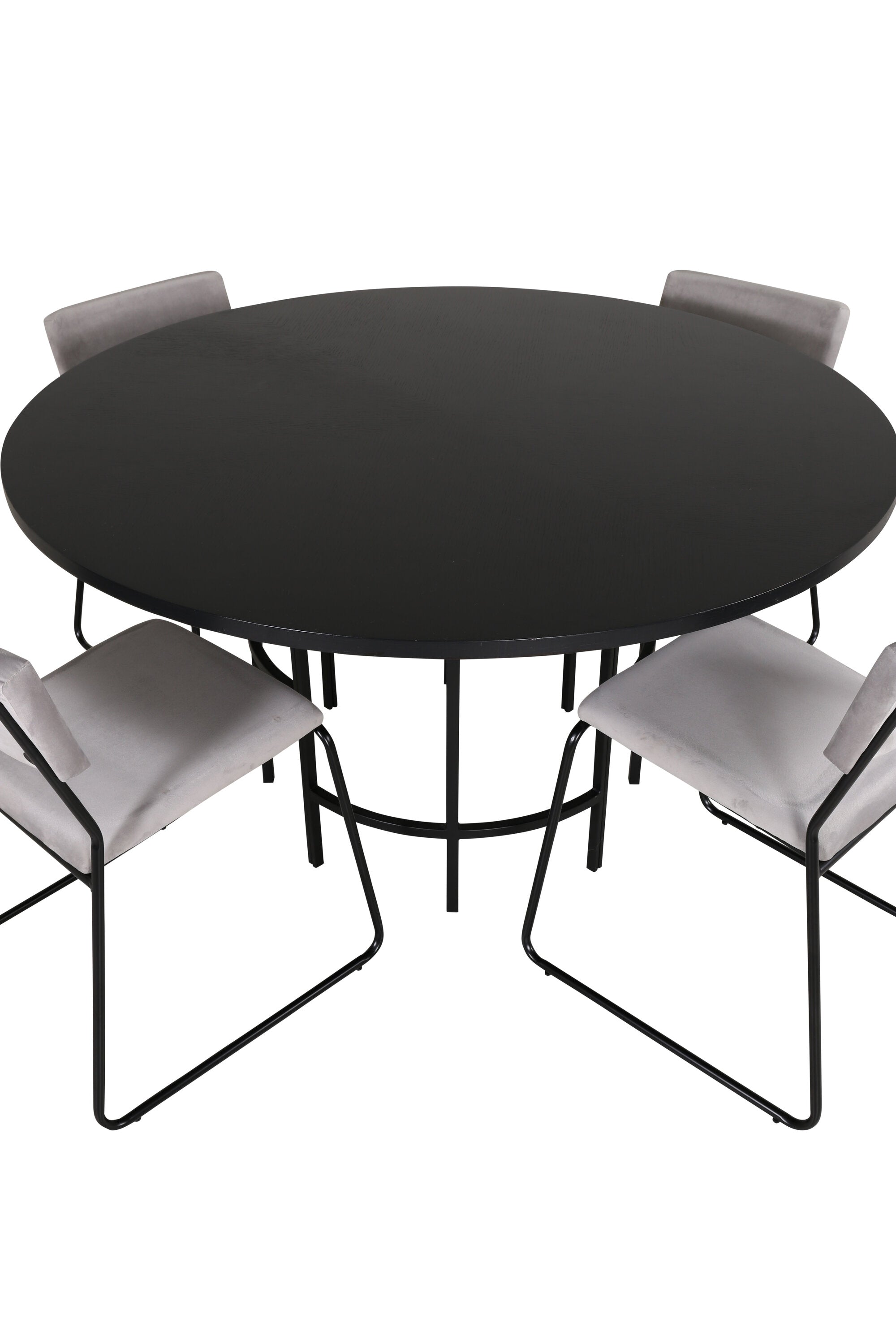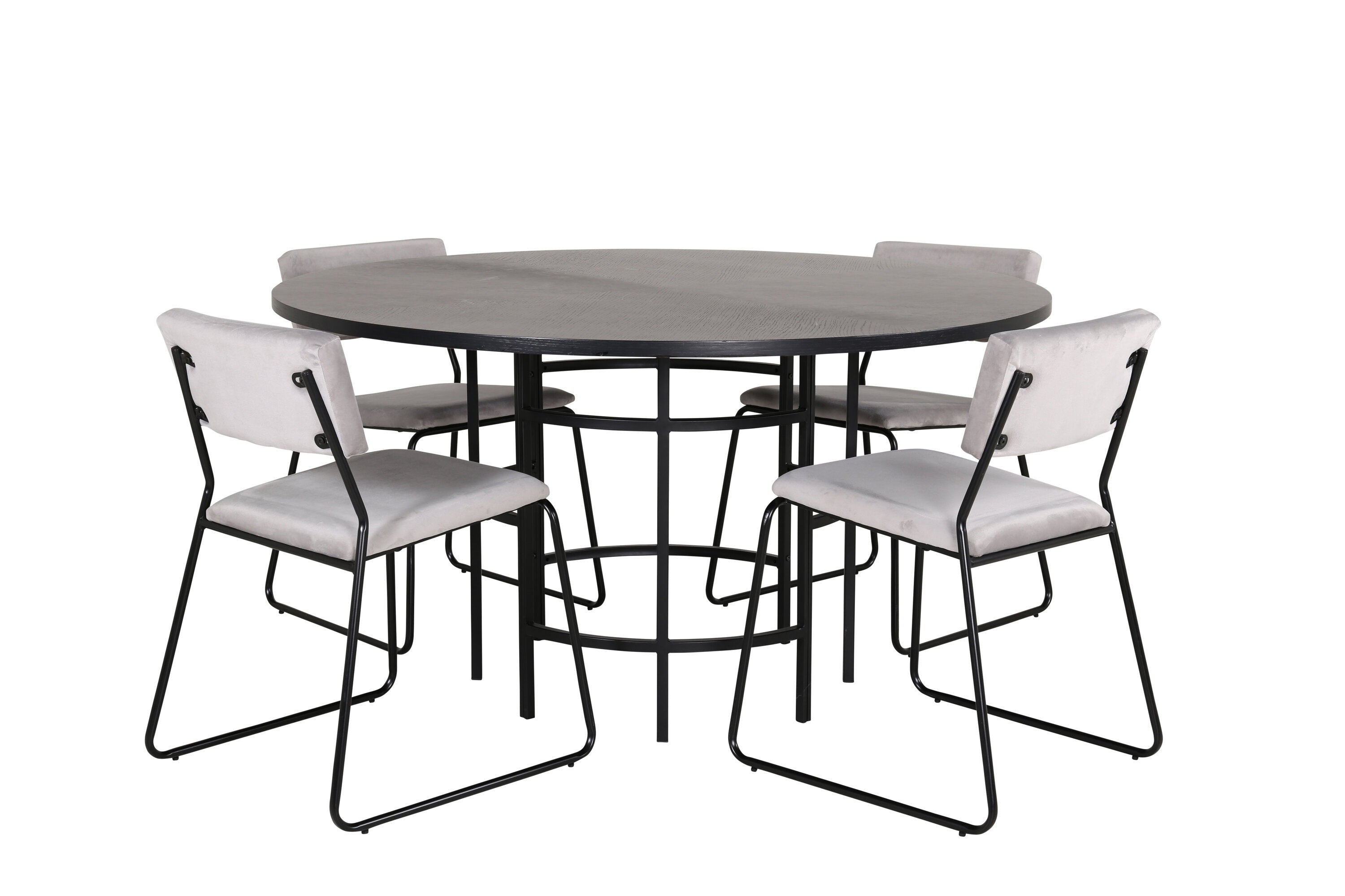Spojte industriální vzhled s minimalistickým dekorem! Jídelní stůl Copenhagen má trendový design v konzistentně černé barvě se stolovou deskou z MDF s dýhou a dekorativním kovovým podvozkem válcového tvaru. Rozměry stolu: Průměr: 140 cm, Výška: 74 cm. Zde sladěné se 4 stylovými jídelními židlemi ze série Kenth. Nohy židle jsou úzké ze železa a pohodlná sedadla ze světle šedé sametové látky. Rozměry židle: Výška: 76 cm, výška sedáku: 48,5 cm, šířka: 40 cm, hloubka: 52 cm. Vytvořte okouzlující středobod, ve kterém můžete shromáždit rodinu a přátele!