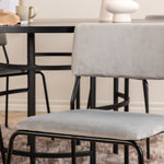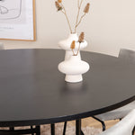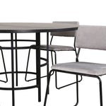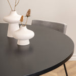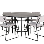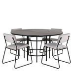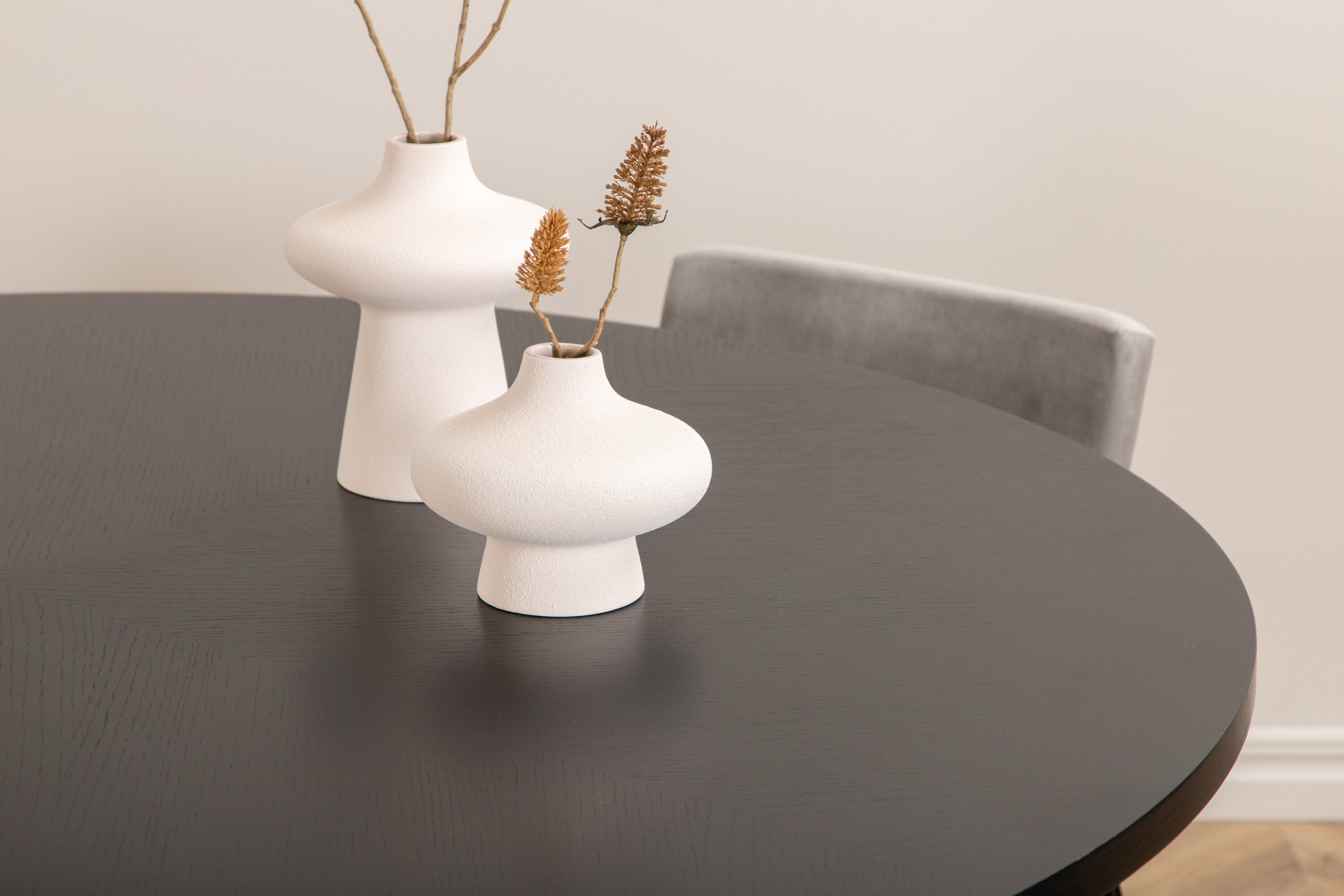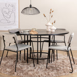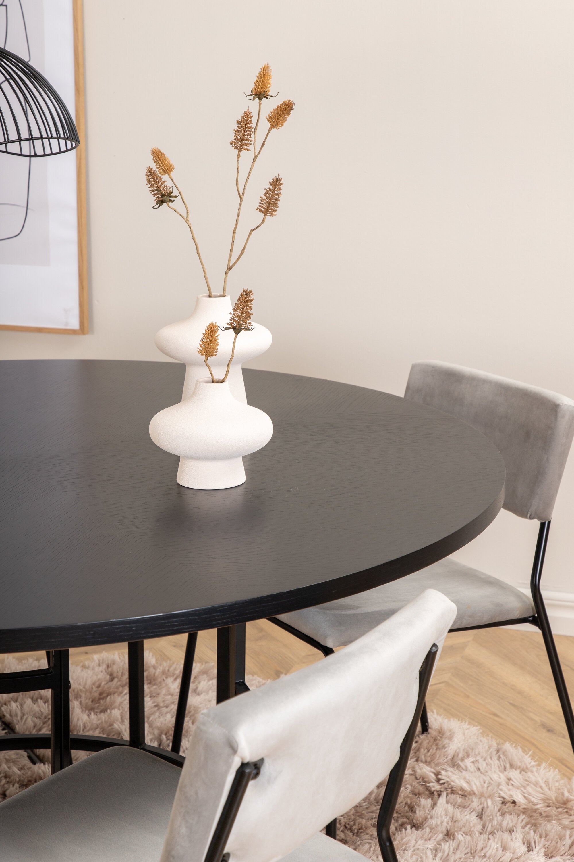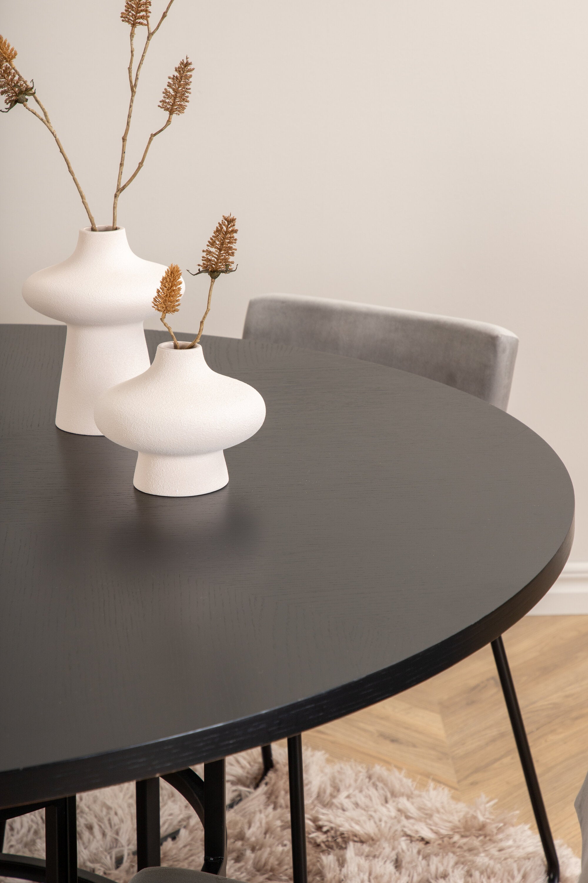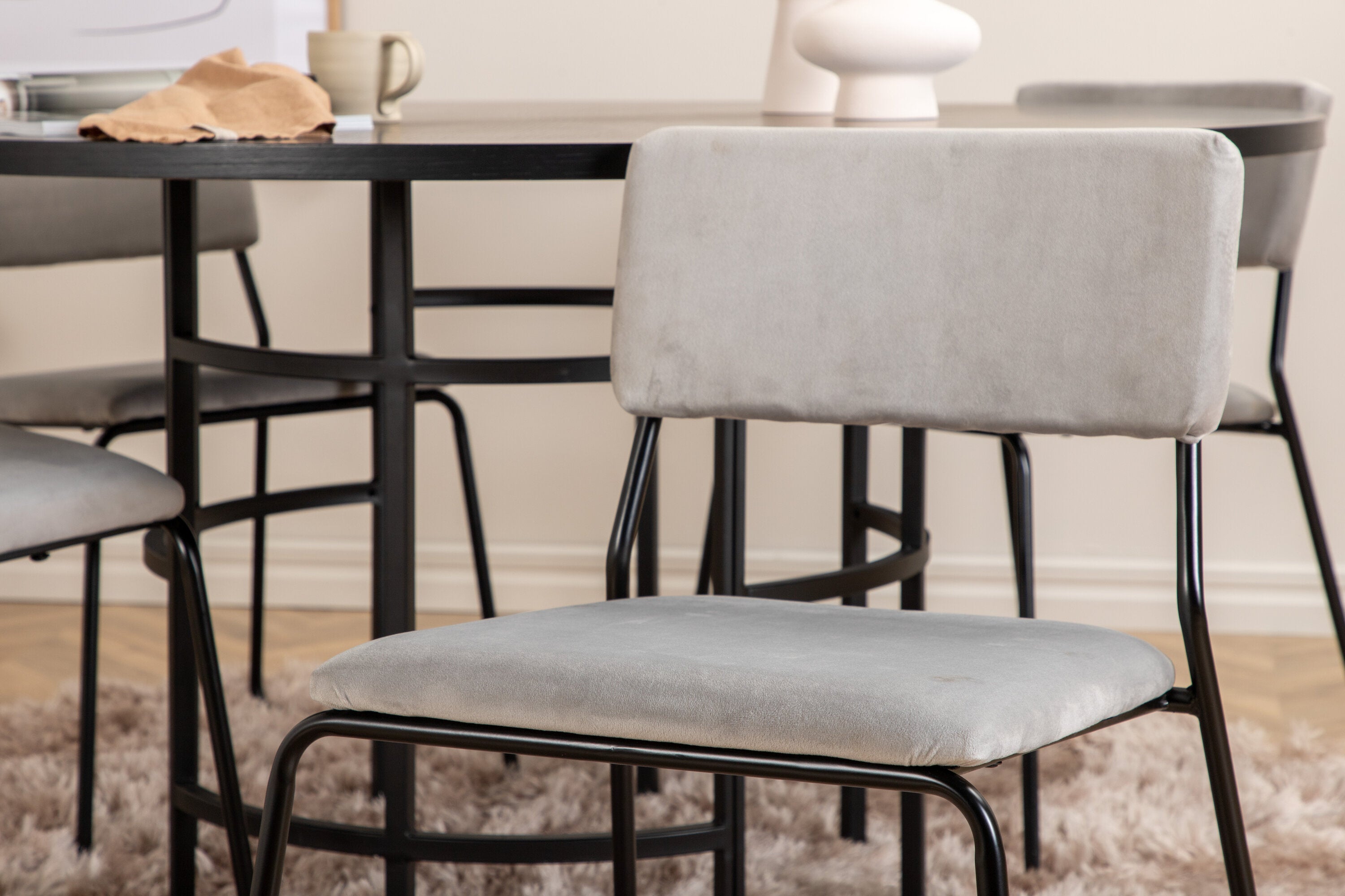 Spojte industriální vzhled s minimalistickým dekorem! Jídelní stůl Copenhagen má trendový design v konzistentně černé barvě se stolovou deskou z MDF s dýhou a dekorativním kovovým podvozkem válcového tvaru. Rozměry stolu: Průměr: 140 cm, Výška: 74 cm. Zde sladěné se 4 stylovými jídelními židlemi ze série Kenth. Nohy židle jsou úzké ze železa a pohodlná sedadla ze světle šedé sametové látky. Rozměry židle: Výška: 76 cm, výška sedáku: 48,5 cm, šířka: 40 cm, hloubka: 52 cm. Vytvořte okouzlující středobod, ve kterém můžete shromáždit rodinu a přátele!