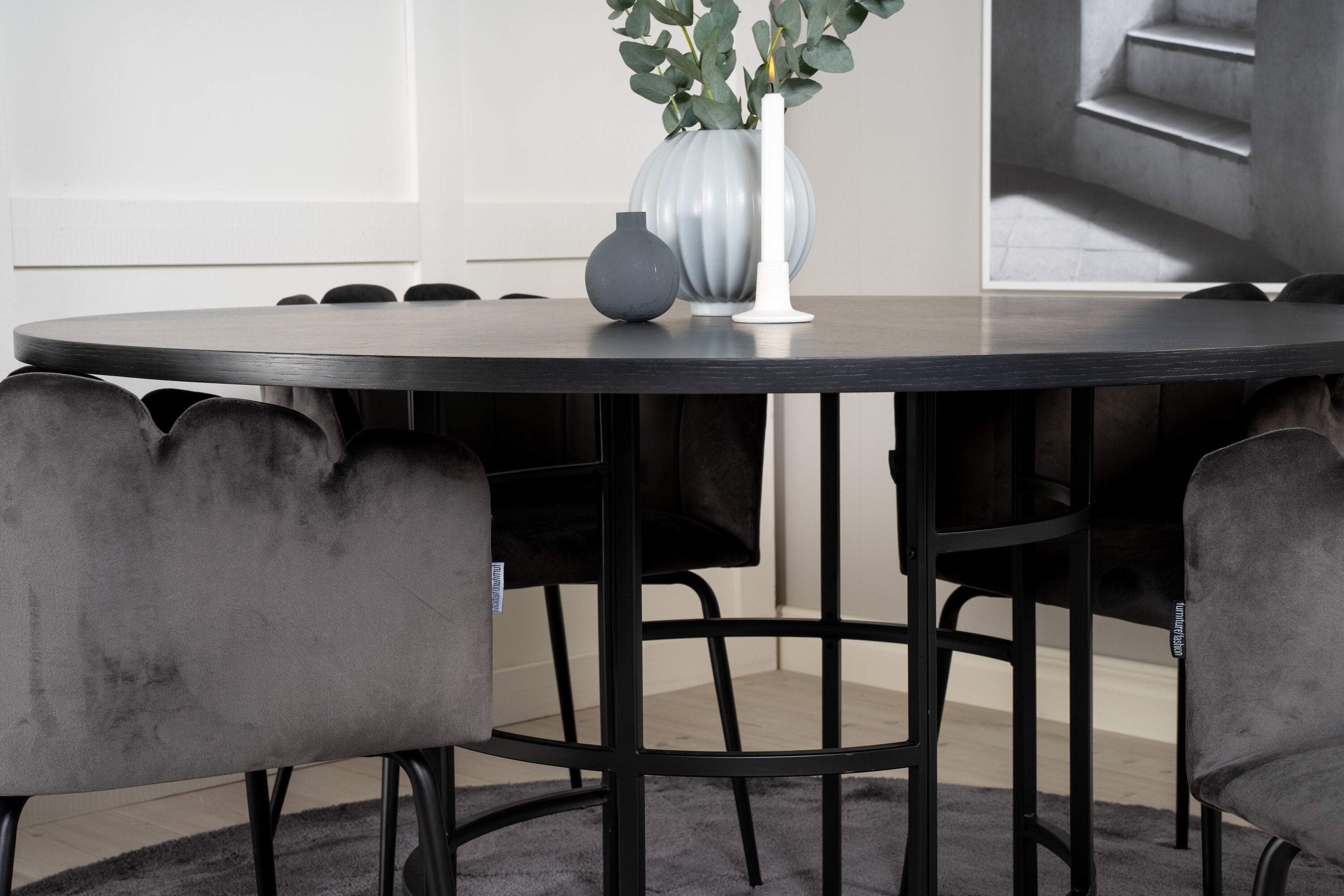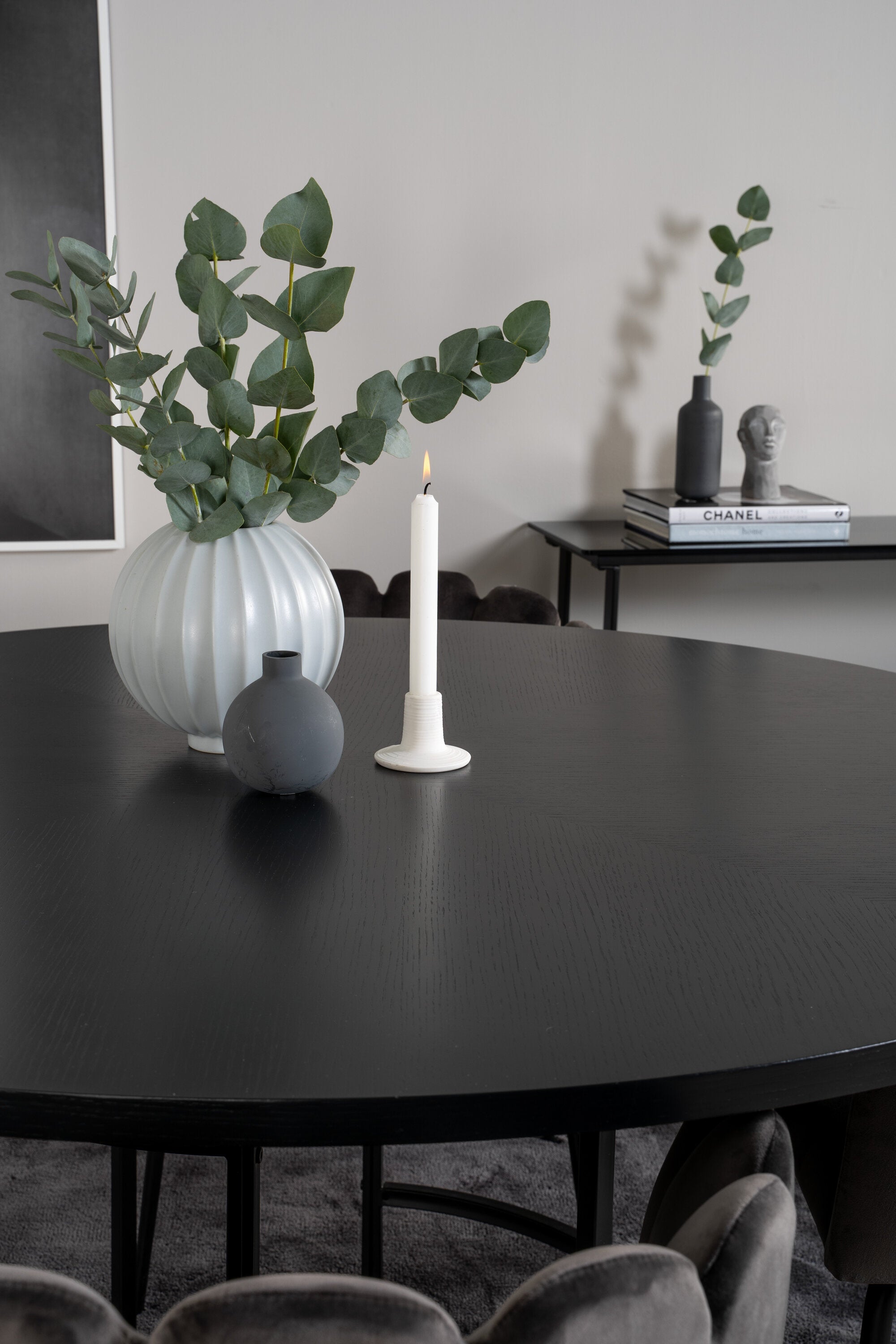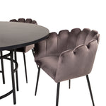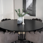 Elegantní a pompézní! Kulatá skupina potravin z kolekce Furniture Fashion. Důsledně nudný výraz, kde se šedé sametové židle setkávají s krásnou černou deskou stolu, což dodává luxusní pocit. Stůl Copenhagen spolu se sametovými židlemi ze série Limhamn.