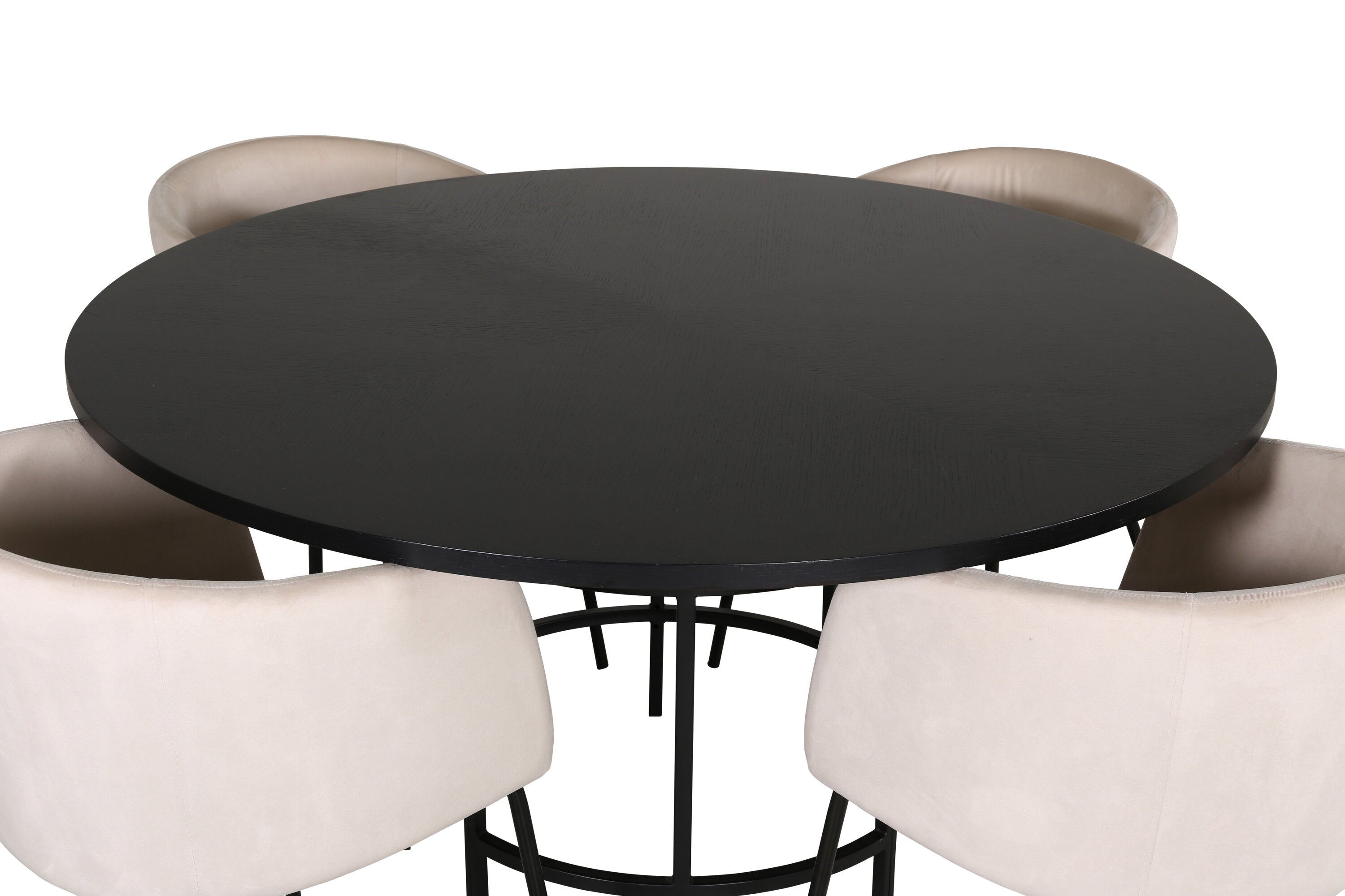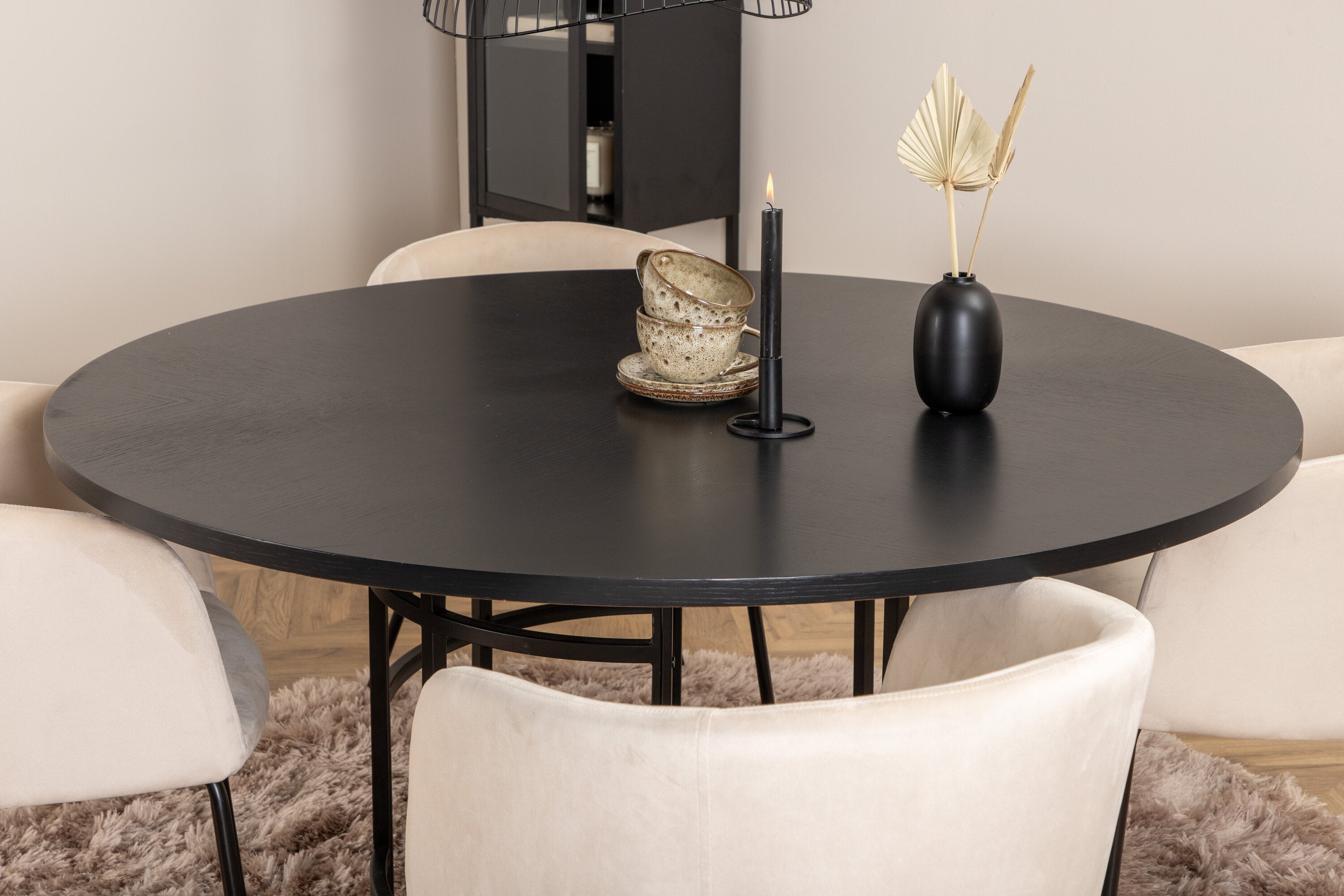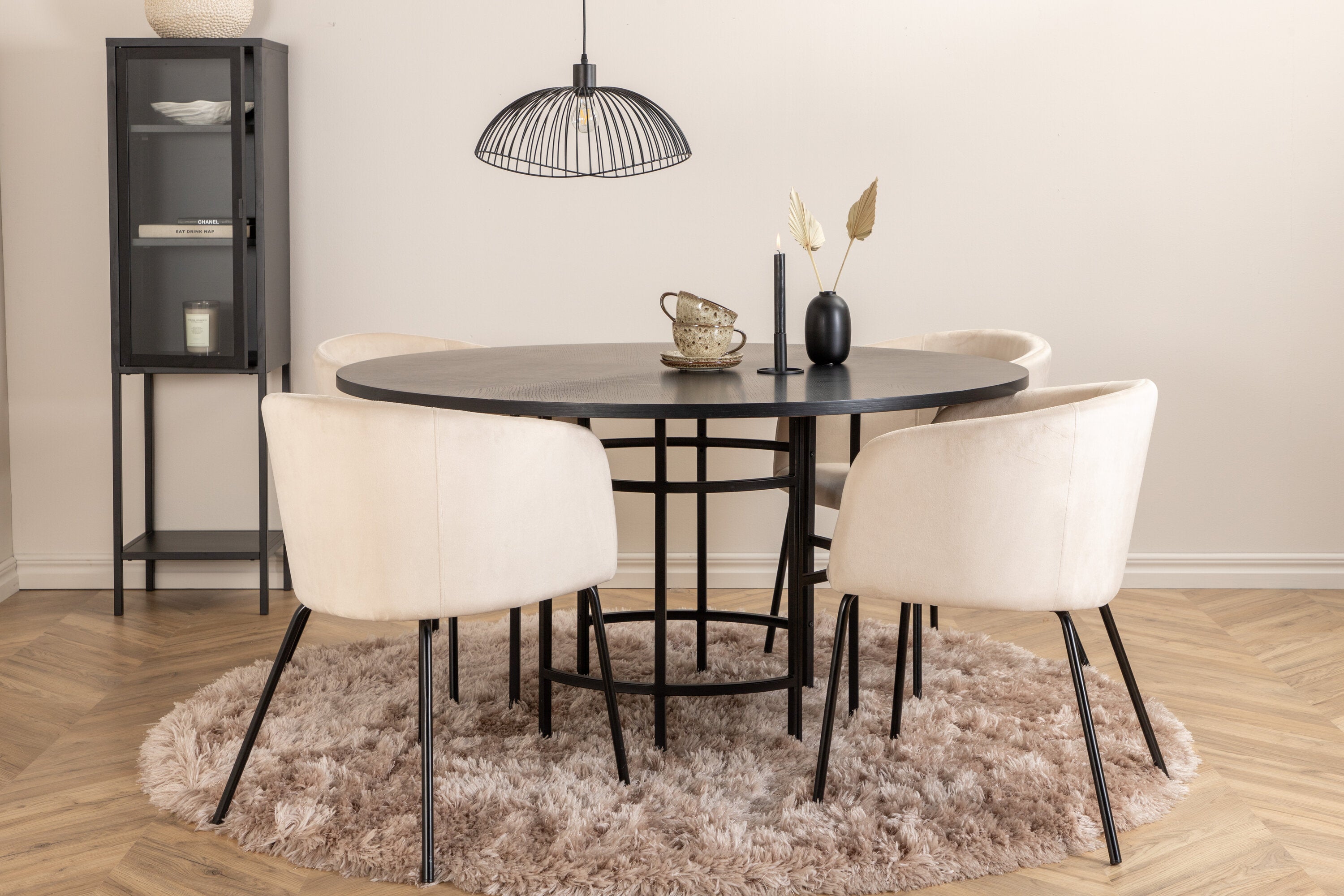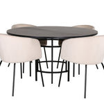 Vytvořte okouzlující středobod v srdci domova s ​​kulatou potravinovou skupinou v moderním vzhledu! Jídelní stůl Copenhagen má trendový design v konzistentně černé barvě se stolovou deskou z MDF s dýhou a dekorativním kovovým podvozkem válcového tvaru. Rozměry stolu: Průměr: 140 cm, Výška: 74 cm. Zde je sladěn se 4 jídelními židlemi Berit v luxusním designu. Židle mají pohodlný sedák z béžového sametu a stylově úzké nohy stolku ze železa. Rozměry židle: výška: 78 cm, výška sedáku: 49 cm, šířka: 55 cm, hloubka: 55 cm. Vybavte se pro příjemnou večeři!