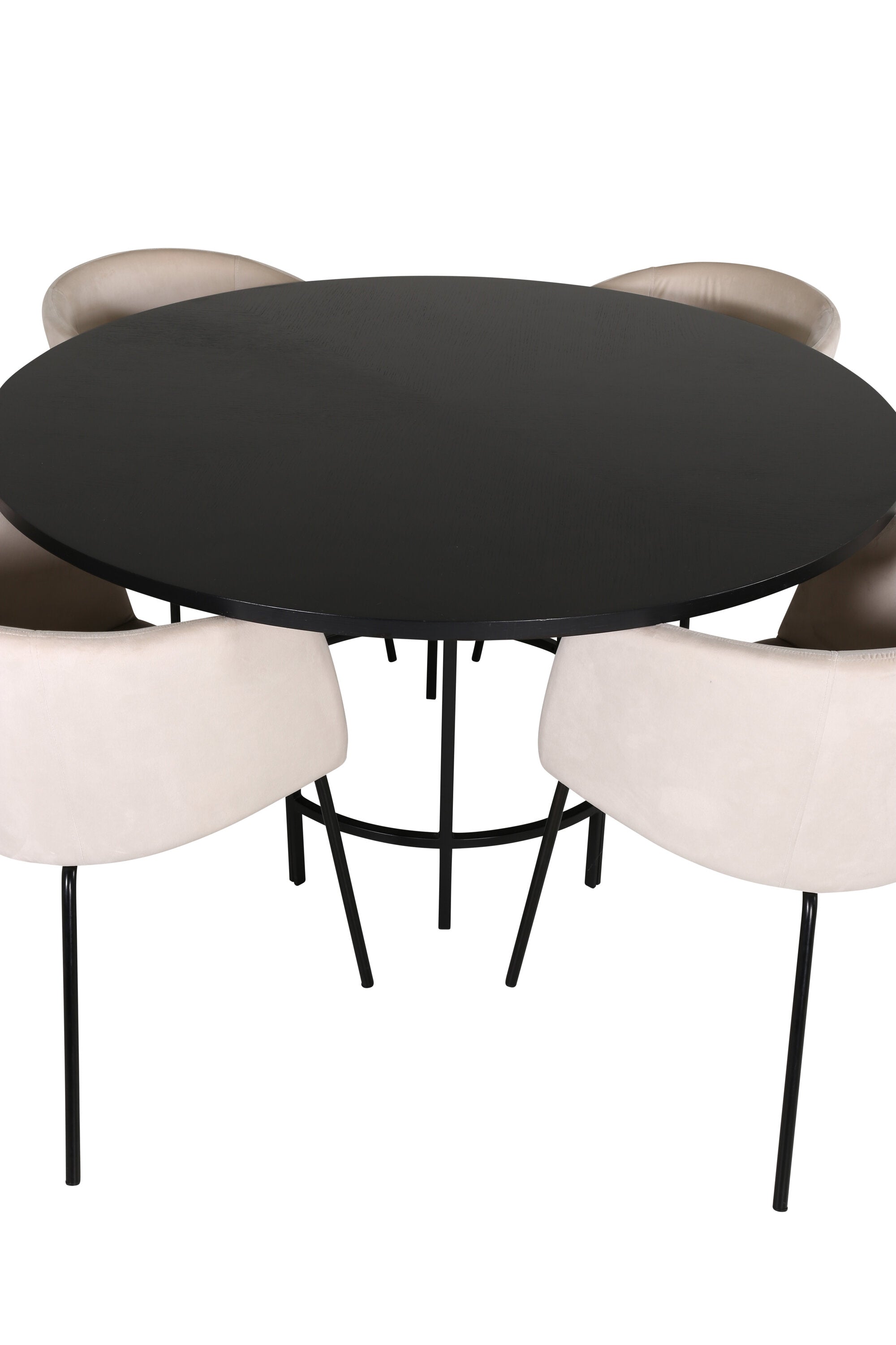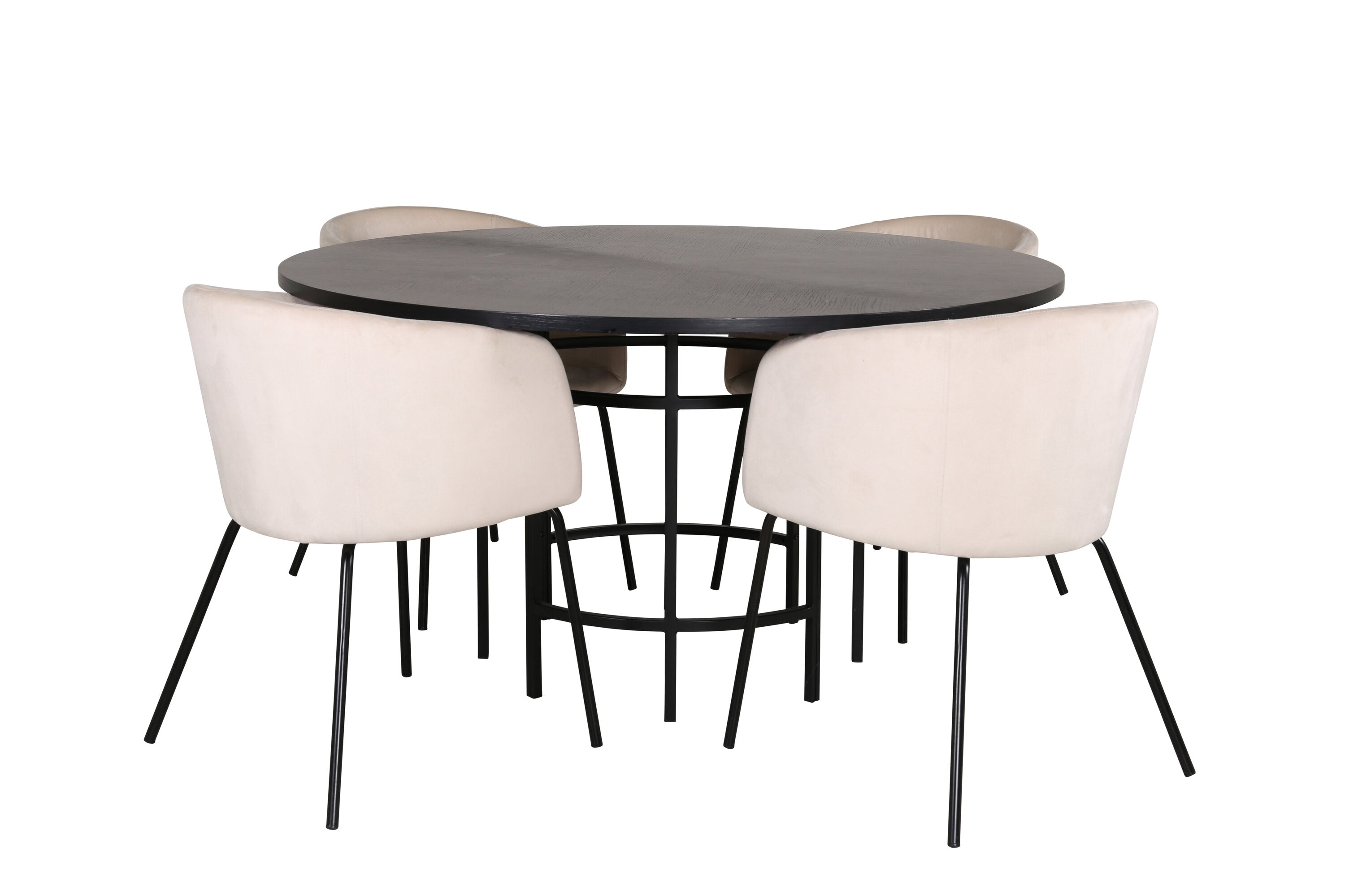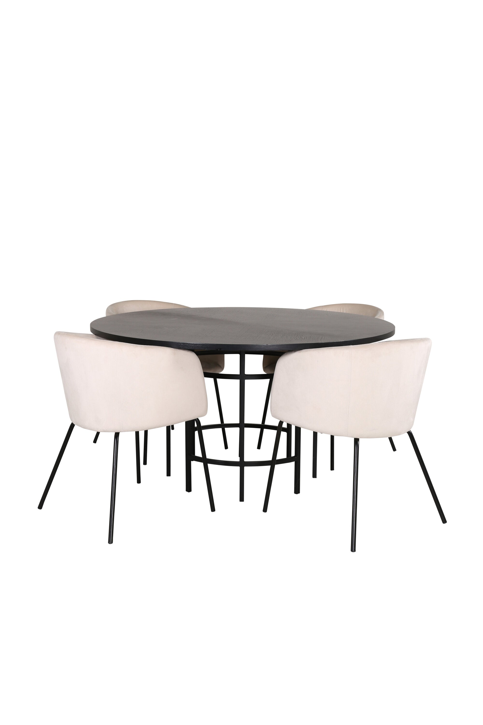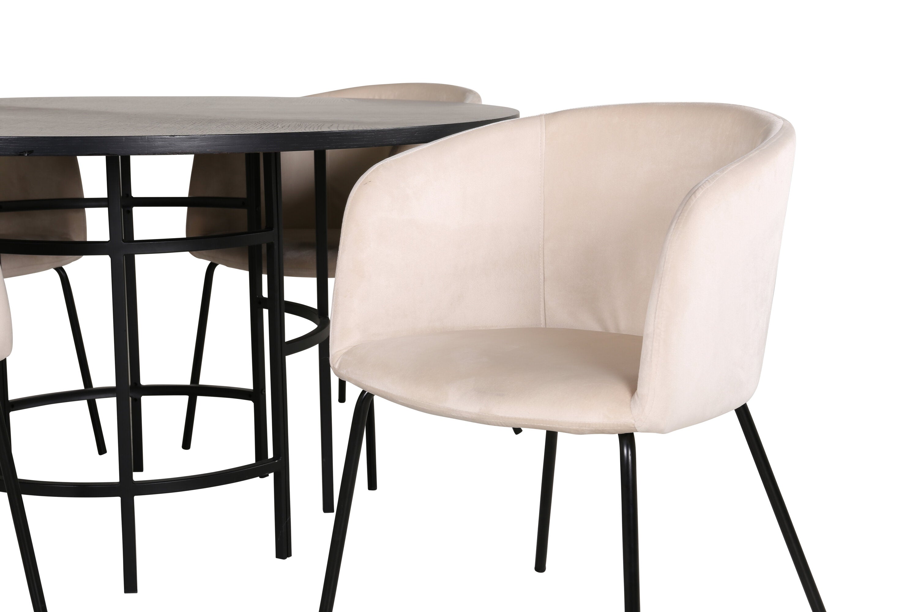 Vytvořte okouzlující středobod v srdci domova s ​​kulatou potravinovou skupinou v moderním vzhledu! Jídelní stůl Copenhagen má trendový design v konzistentně černé barvě se stolovou deskou z MDF s dýhou a dekorativním kovovým podvozkem válcového tvaru. Rozměry stolu: Průměr: 140 cm, Výška: 74 cm. Zde je sladěn se 4 jídelními židlemi Berit v luxusním designu. Židle mají pohodlný sedák z béžového sametu a stylově úzké nohy stolku ze železa. Rozměry židle: výška: 78 cm, výška sedáku: 49 cm, šířka: 55 cm, hloubka: 55 cm. Vybavte se pro příjemnou večeři!