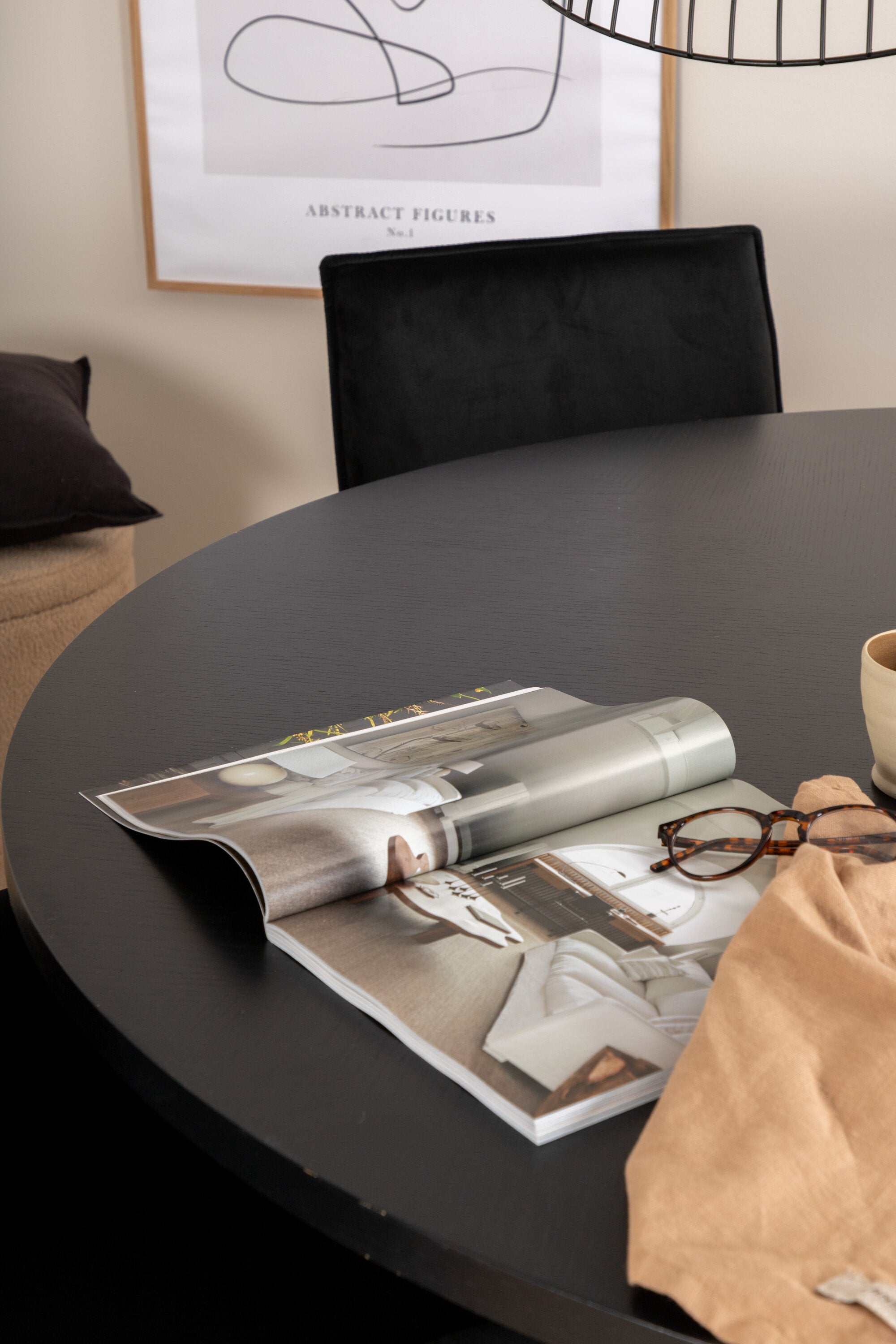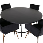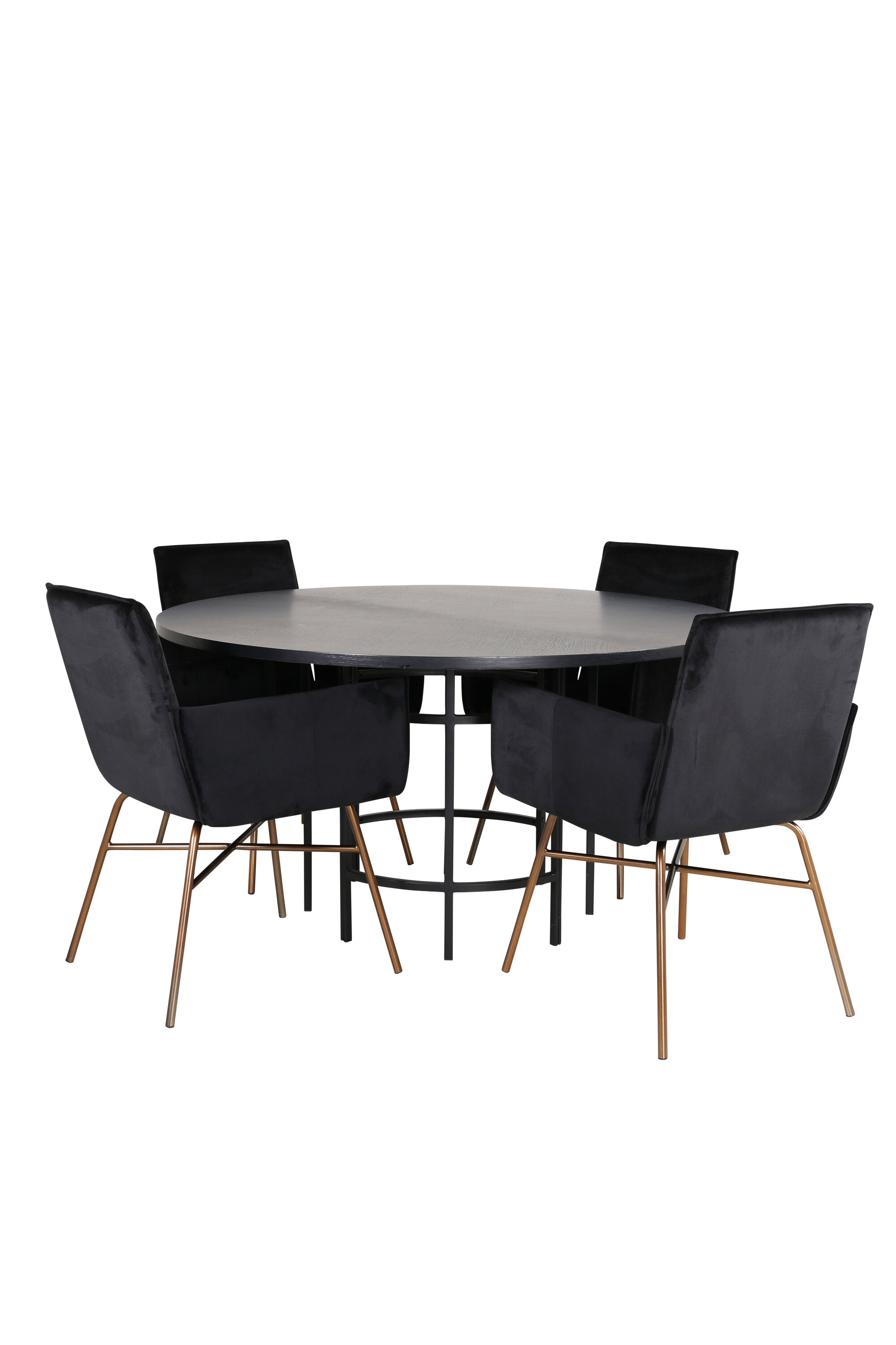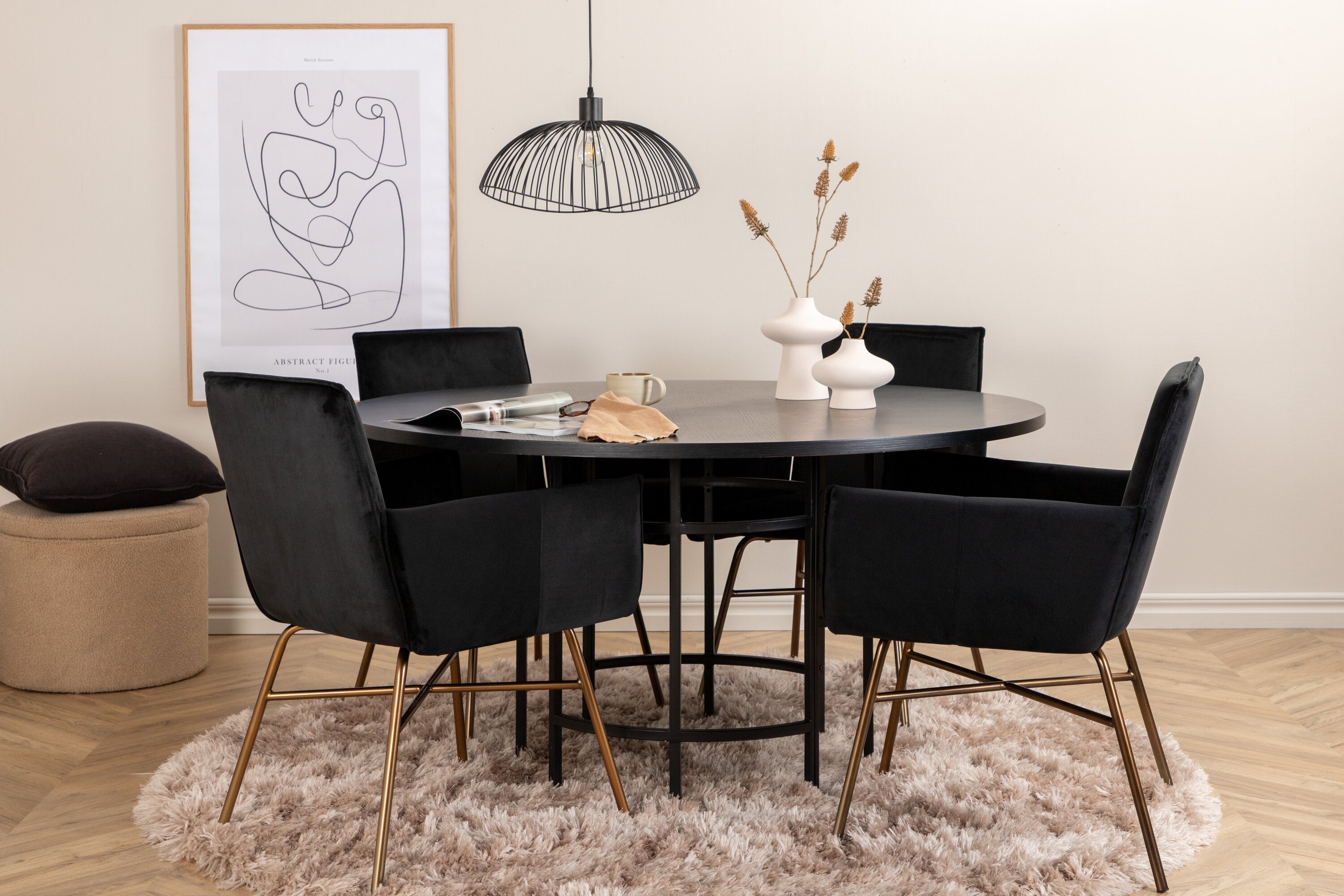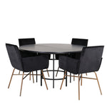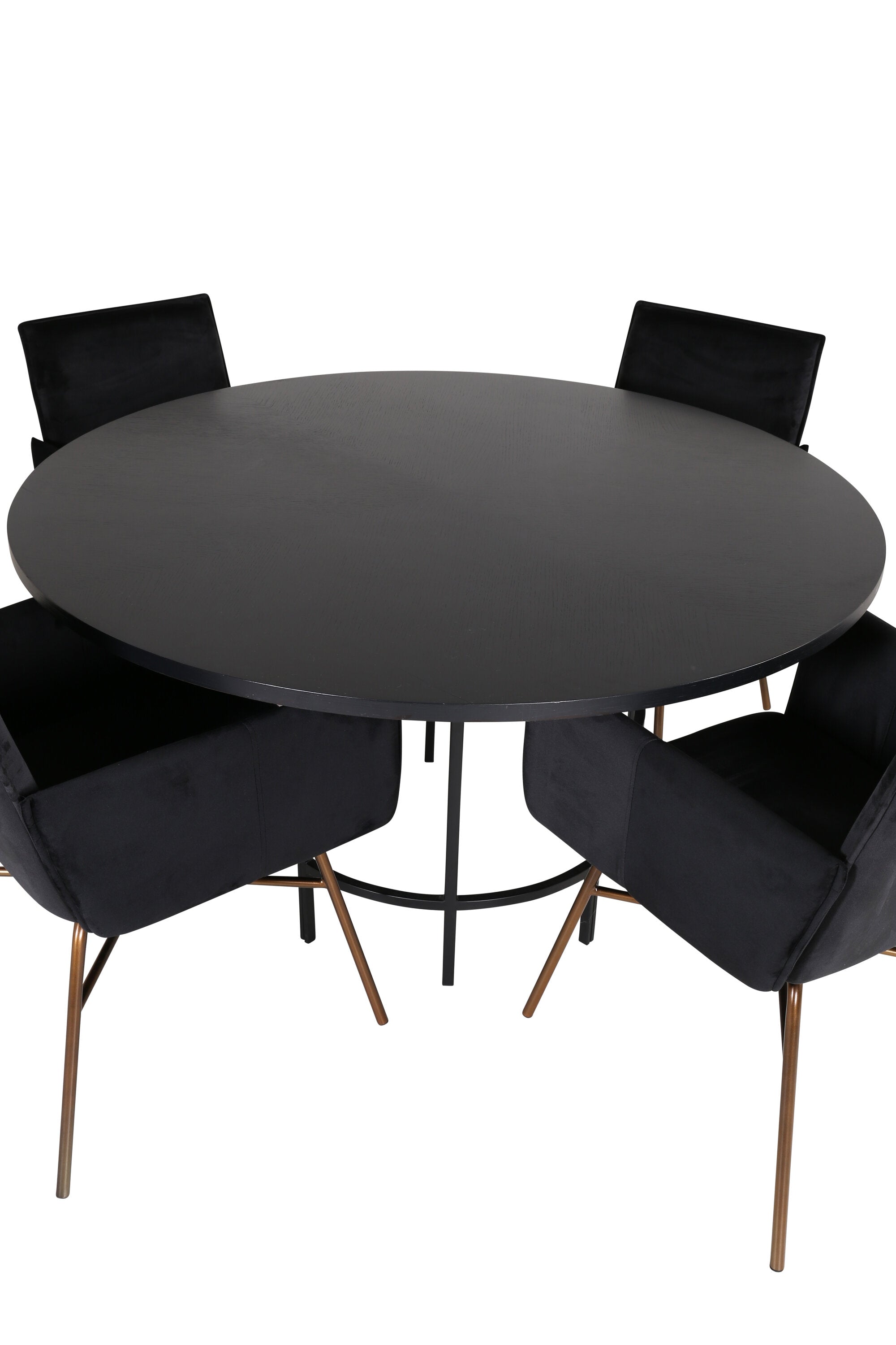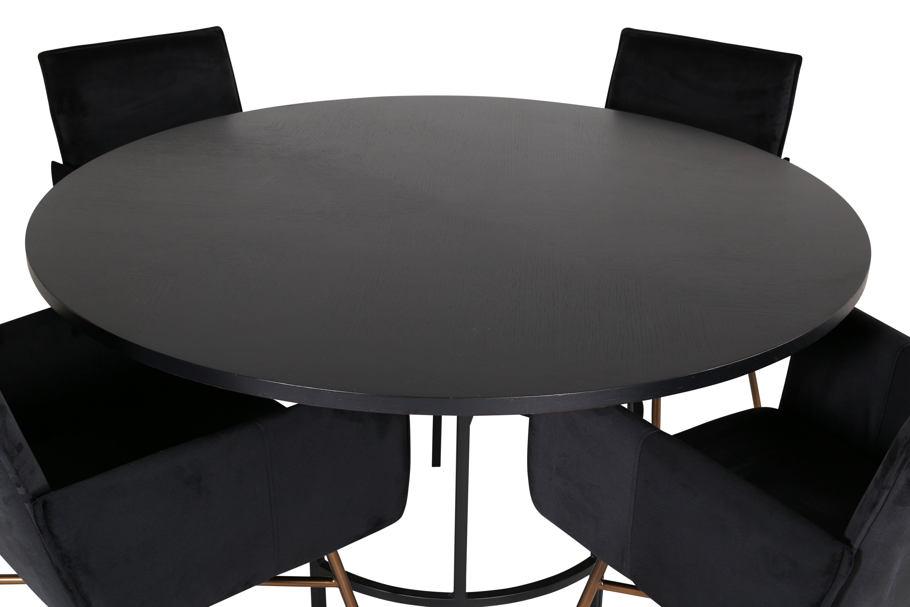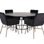 Copenhagen, náš oblíbený kulatý jídelní stůl s krásnou stolní deskou z černé MDF s dýhou a dekorativním podvozkem válcového tvaru v černém kovu. Stůl je konzistentně v elegantní černé barvě, která dodává místnosti pompézní a namyšlený výraz, ale také snadno sladíte s jiným dekorem. Rozměry stolu: Průměr: 140 cm, Výška: 74 cm. Zde je sladěn se 4 jídelními židlemi Petra v luxusním designu. Židle mají pohodlnou hloubku sedáku se sedákem z černého sametu a úzkými nohami židle z měděného železa. Rozměry židle: Výška: 87 cm, výška sedáku: 48 cm, šířka: 57 cm, hloubka: 60 cm. Příjemná skupina jídel pro všechny příležitosti!