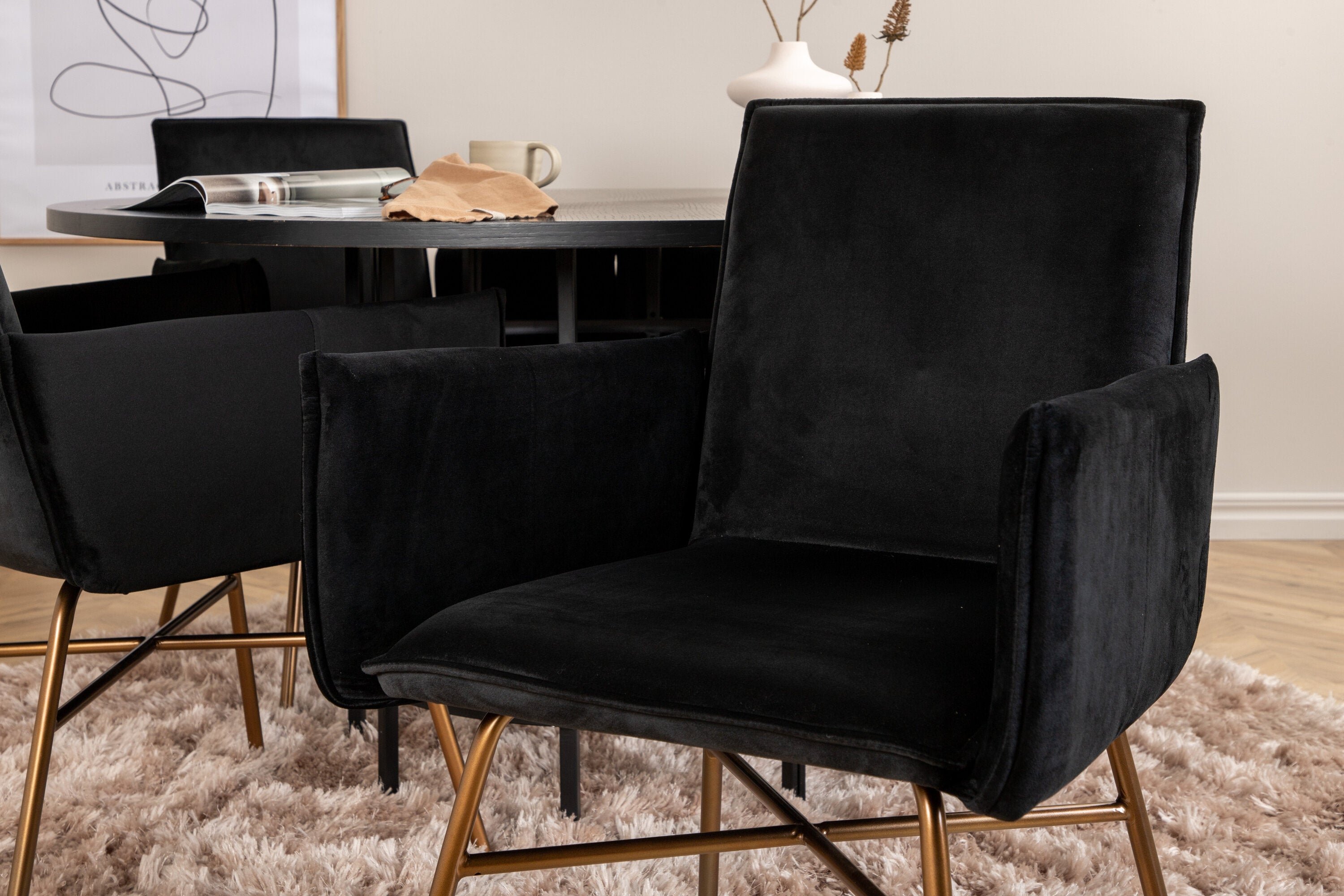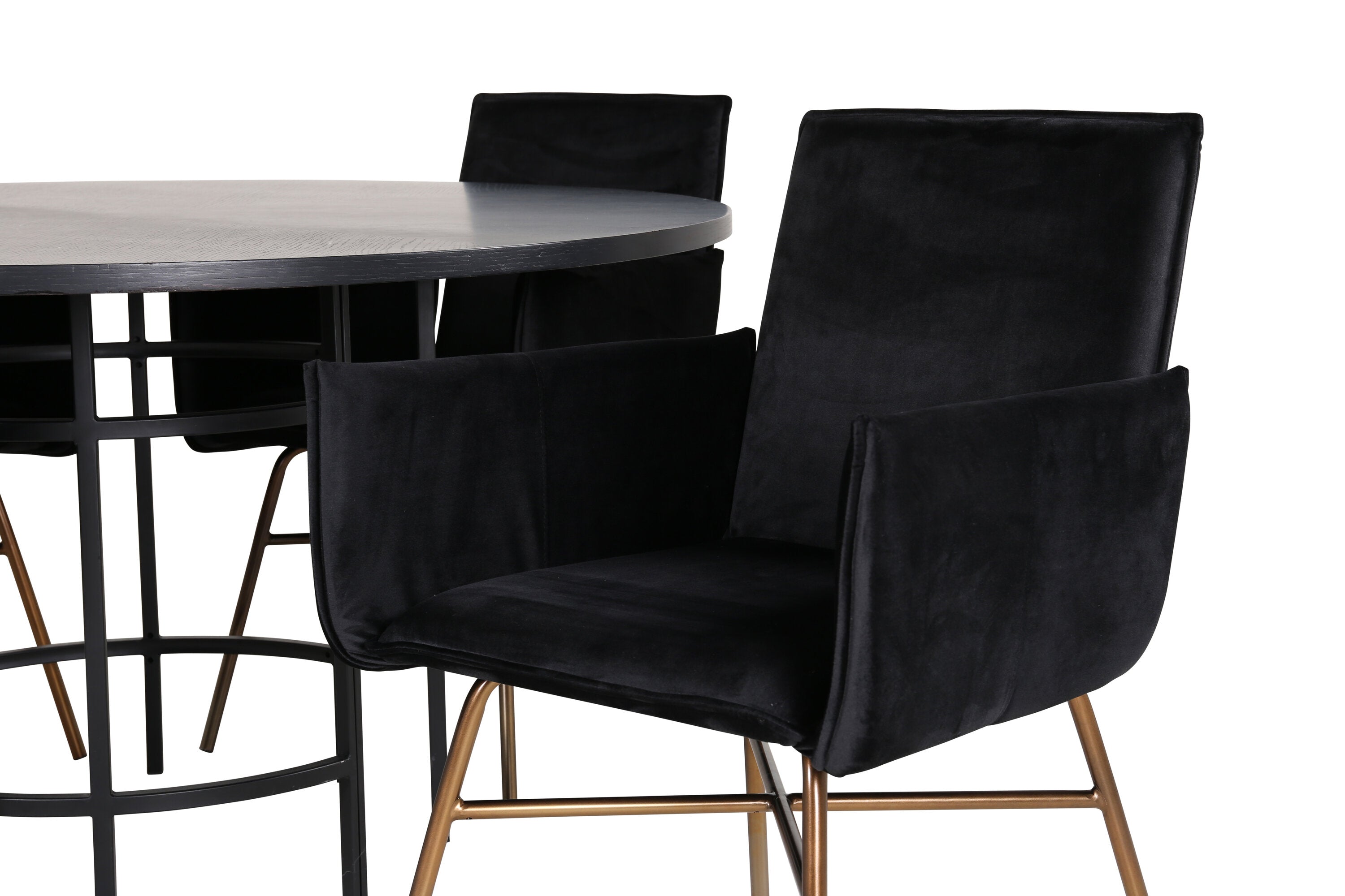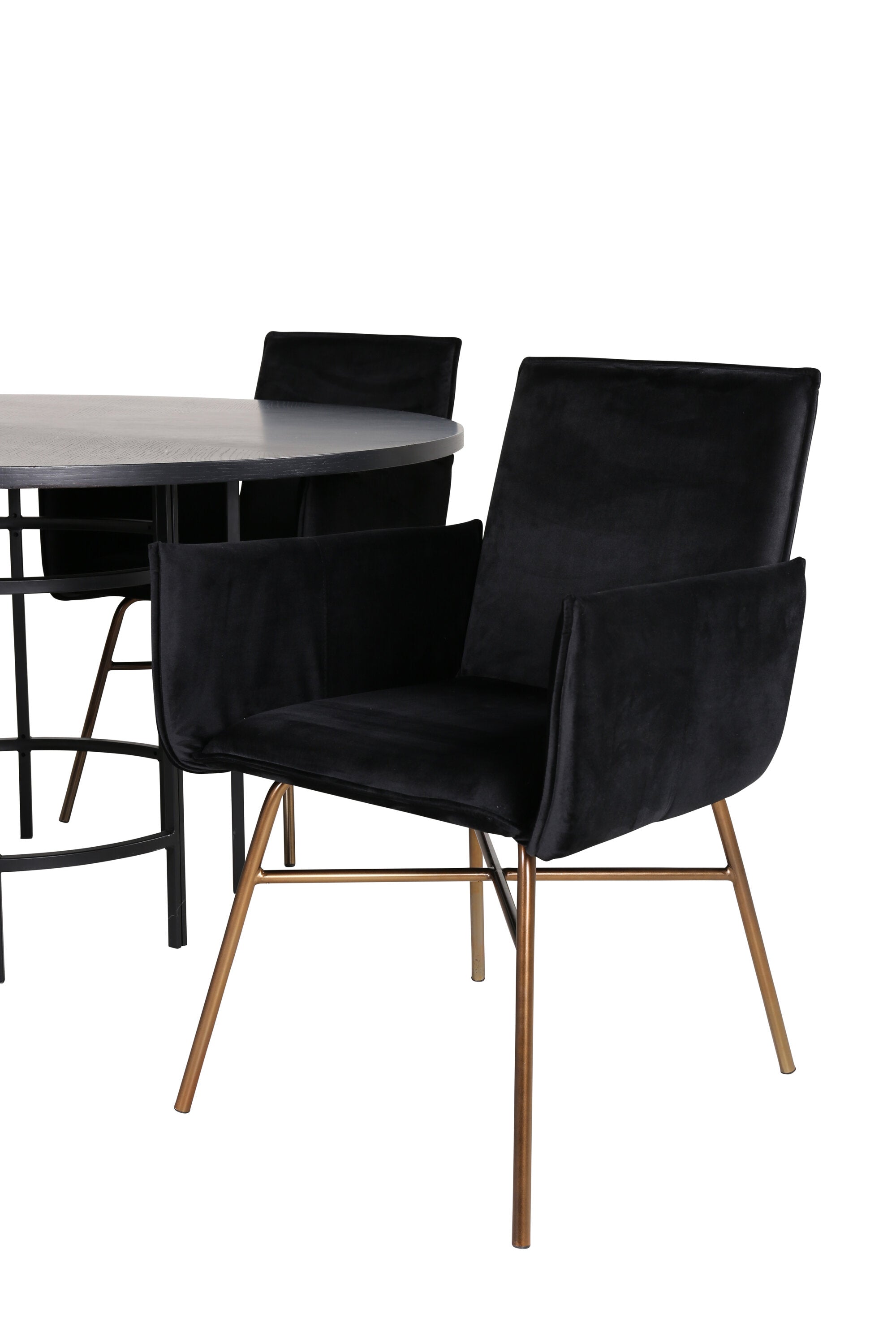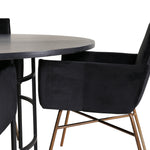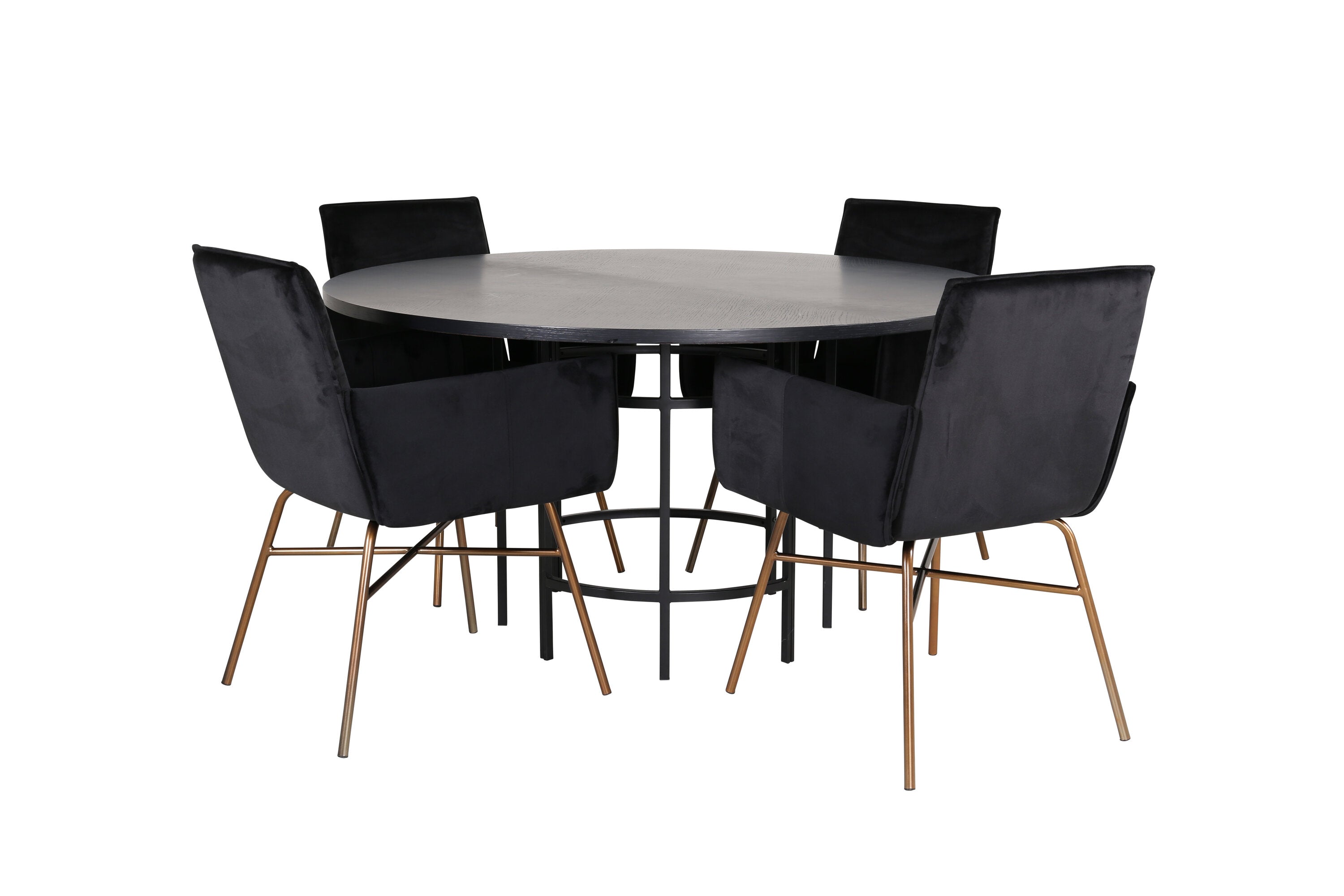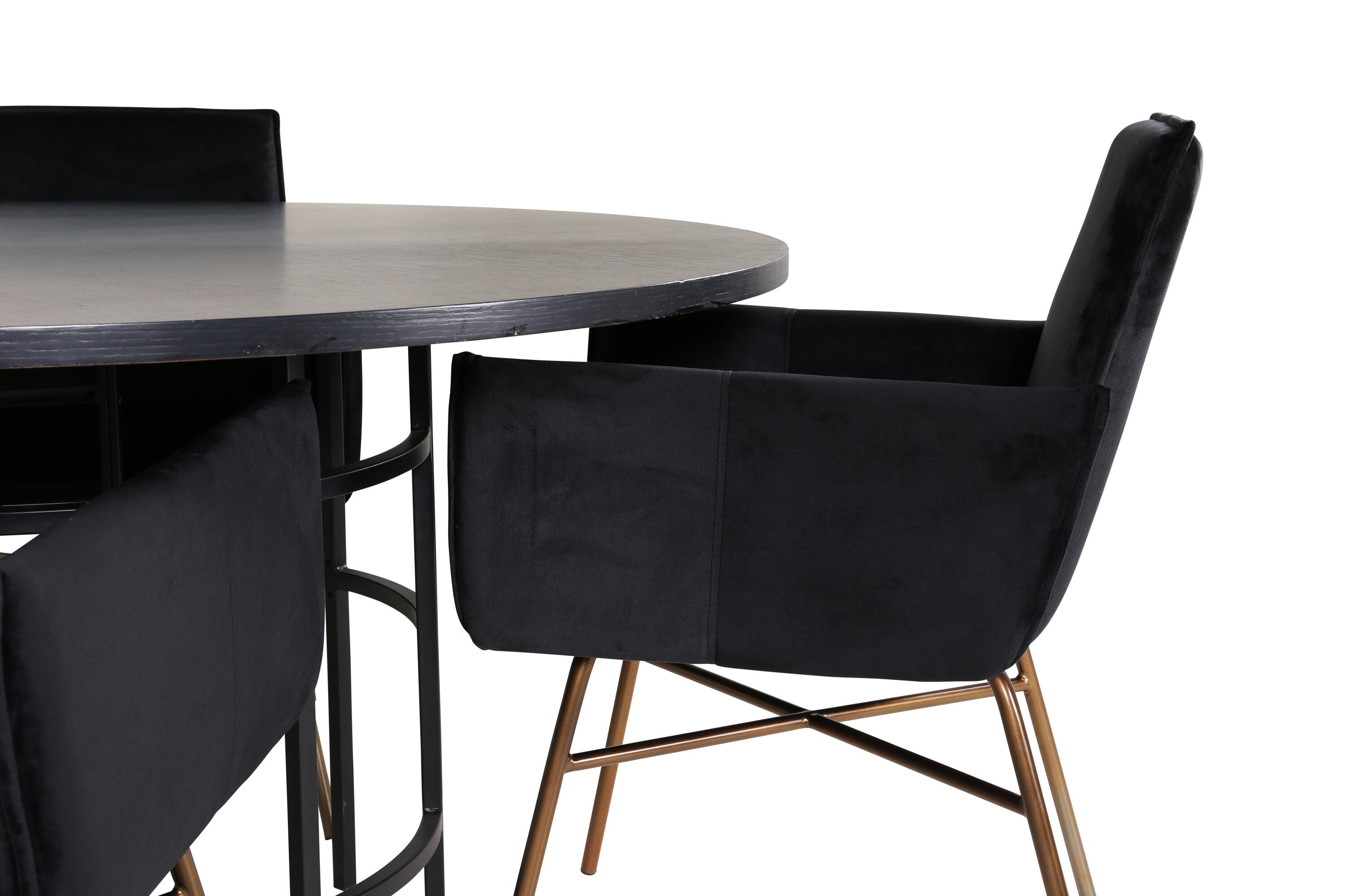 Copenhagen, náš oblíbený kulatý jídelní stůl s krásnou stolní deskou z černé MDF s dýhou a dekorativním podvozkem válcového tvaru v černém kovu. Stůl je konzistentně v elegantní černé barvě, která dodává místnosti pompézní a namyšlený výraz, ale také snadno sladíte s jiným dekorem. Rozměry stolu: Průměr: 140 cm, Výška: 74 cm. Zde je sladěn se 4 jídelními židlemi Petra v luxusním designu. Židle mají pohodlnou hloubku sedáku se sedákem z černého sametu a úzkými nohami židle z měděného železa. Rozměry židle: Výška: 87 cm, výška sedáku: 48 cm, šířka: 57 cm, hloubka: 60 cm. Příjemná skupina jídel pro všechny příležitosti!
