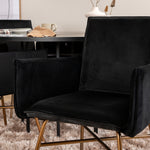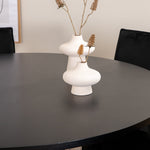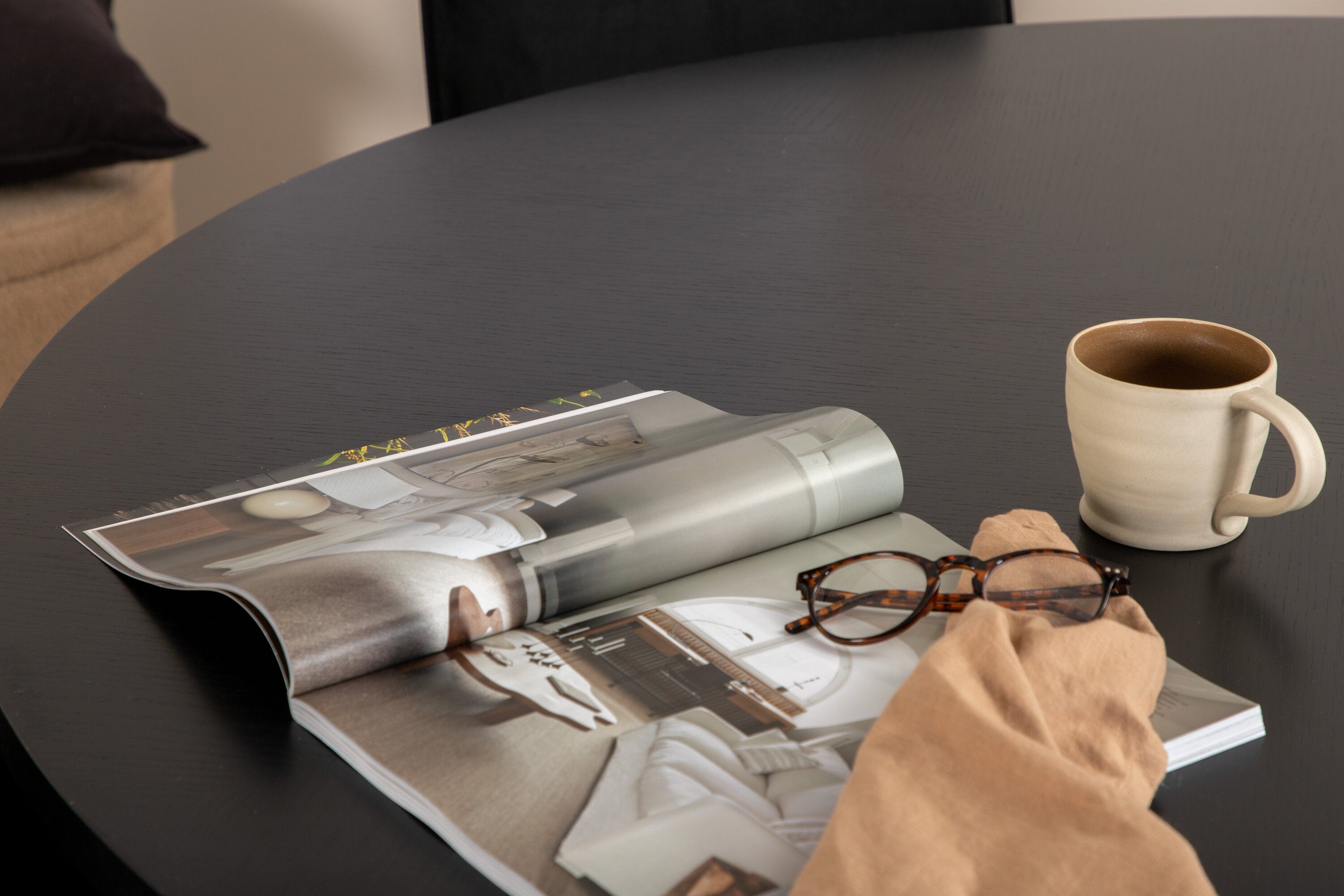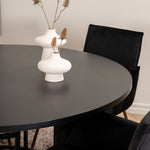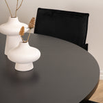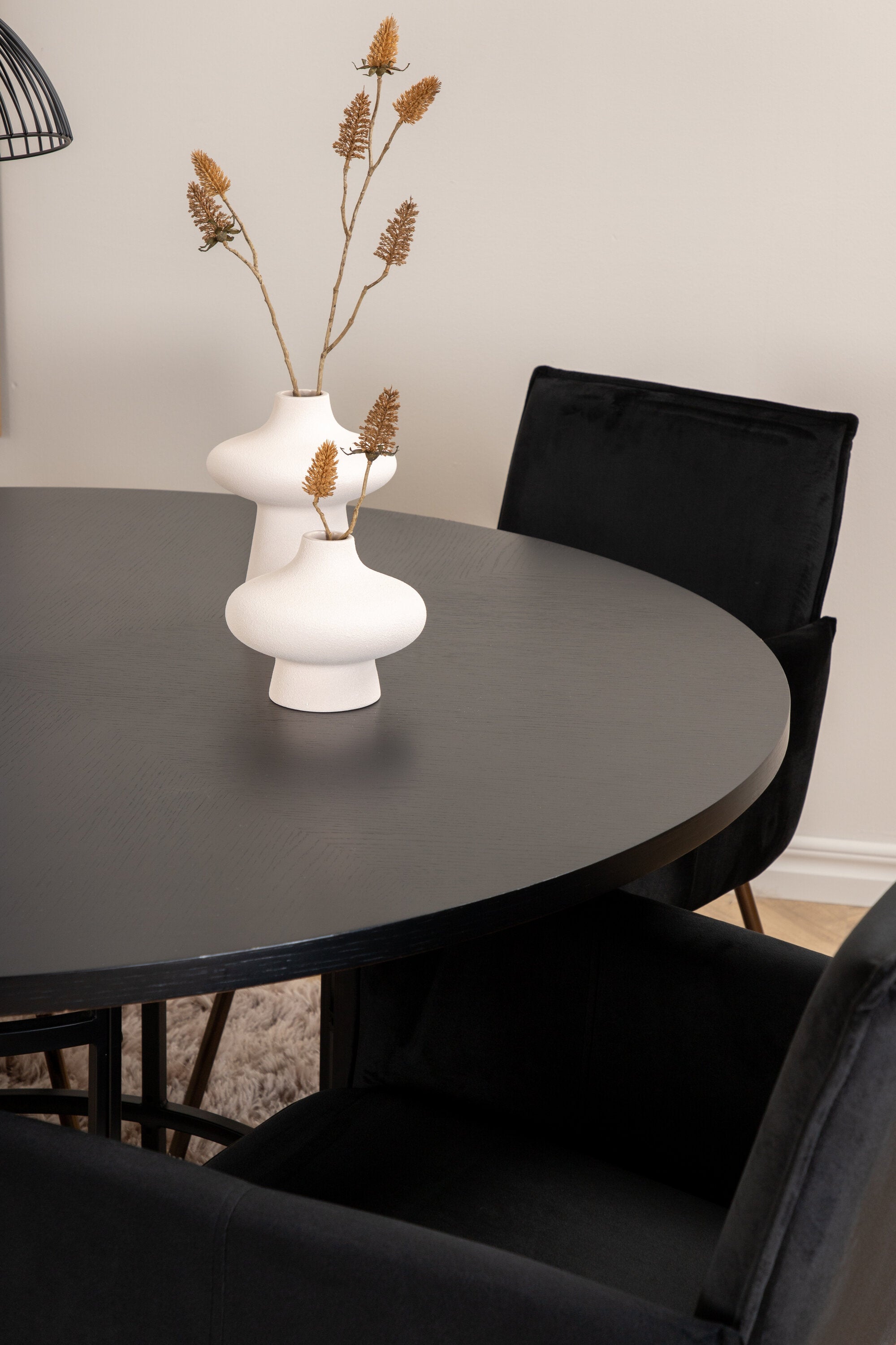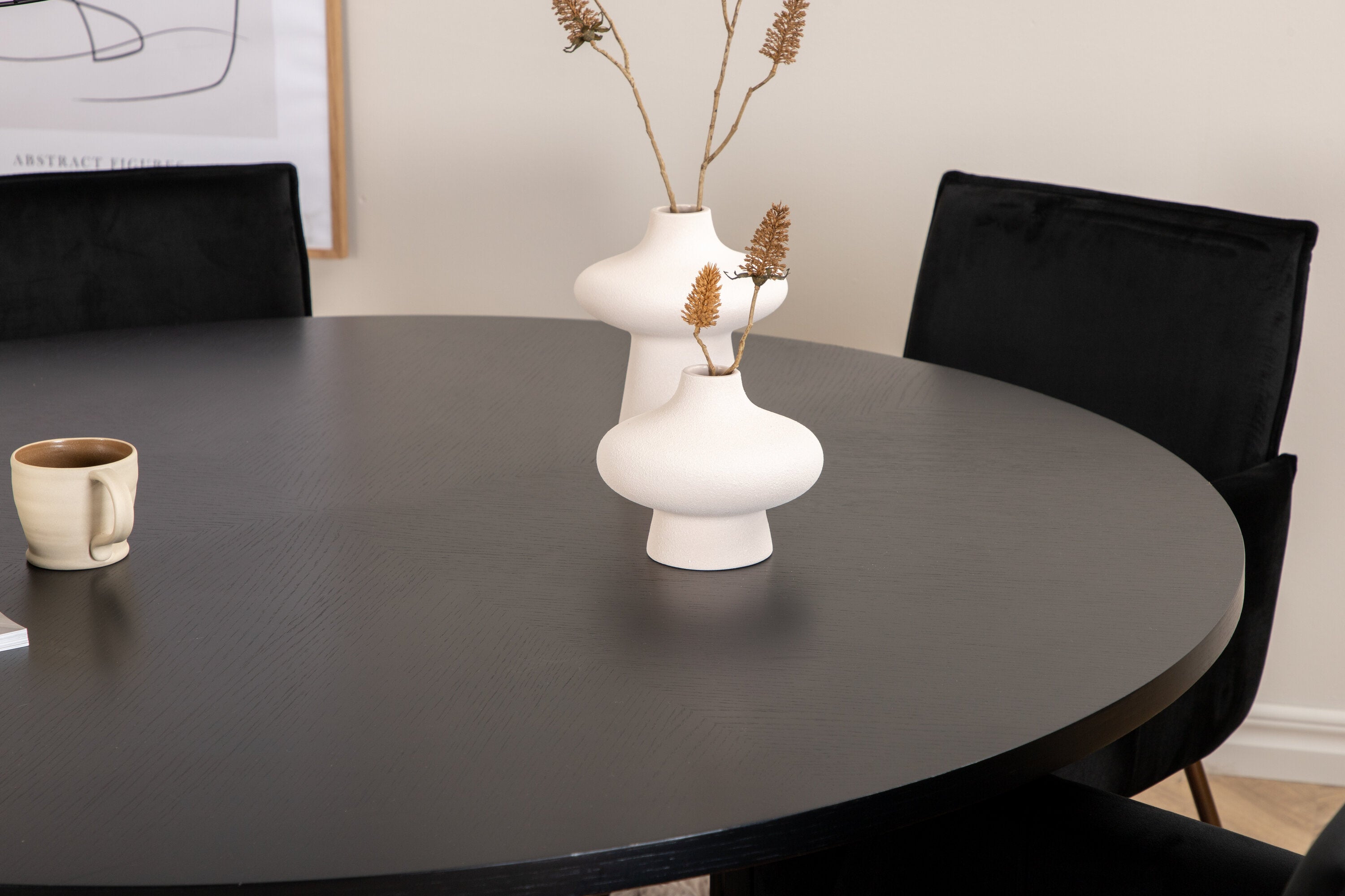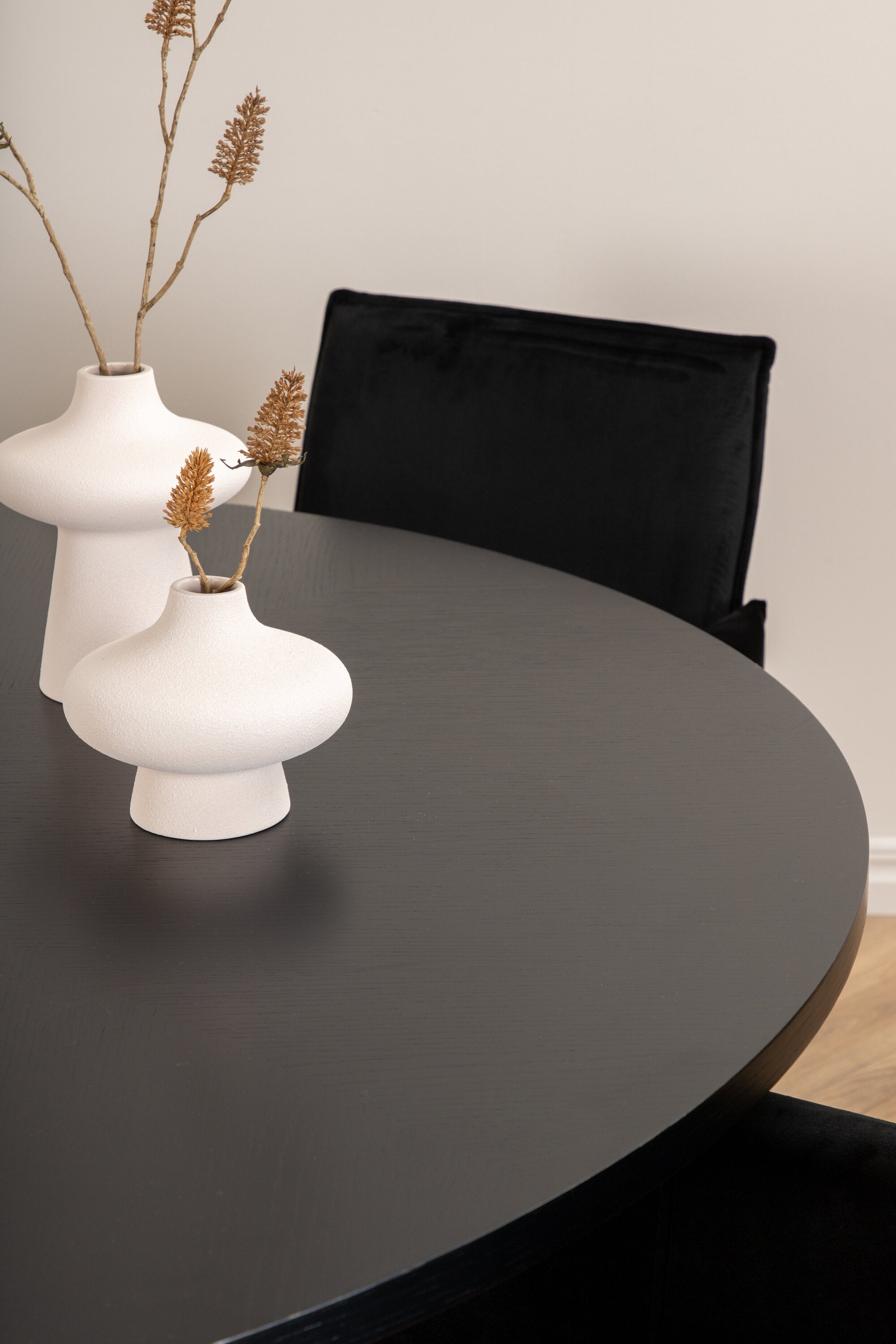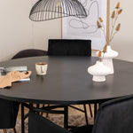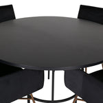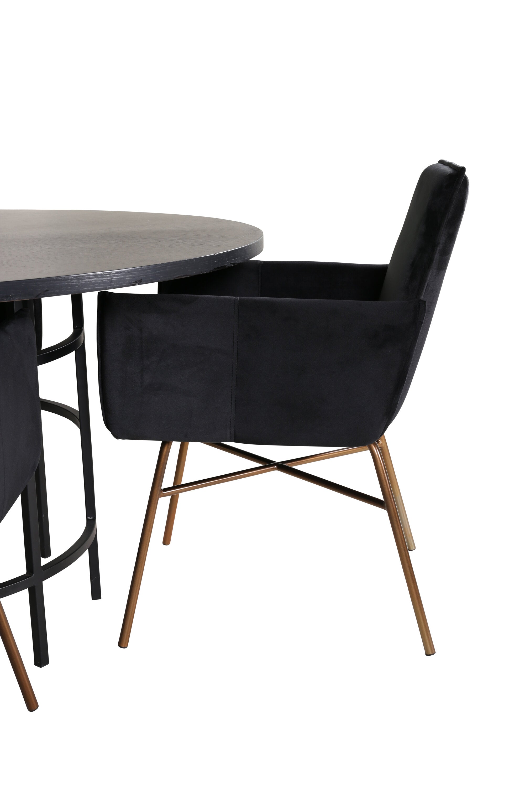 Copenhagen, náš oblíbený kulatý jídelní stůl s krásnou stolní deskou z černé MDF s dýhou a dekorativním podvozkem válcového tvaru v černém kovu. Stůl je konzistentně v elegantní černé barvě, která dodává místnosti pompézní a namyšlený výraz, ale také snadno sladíte s jiným dekorem. Rozměry stolu: Průměr: 140 cm, Výška: 74 cm. Zde je sladěn se 4 jídelními židlemi Petra v luxusním designu. Židle mají pohodlnou hloubku sedáku se sedákem z černého sametu a úzkými nohami židle z měděného železa. Rozměry židle: Výška: 87 cm, výška sedáku: 48 cm, šířka: 57 cm, hloubka: 60 cm. Příjemná skupina jídel pro všechny příležitosti!