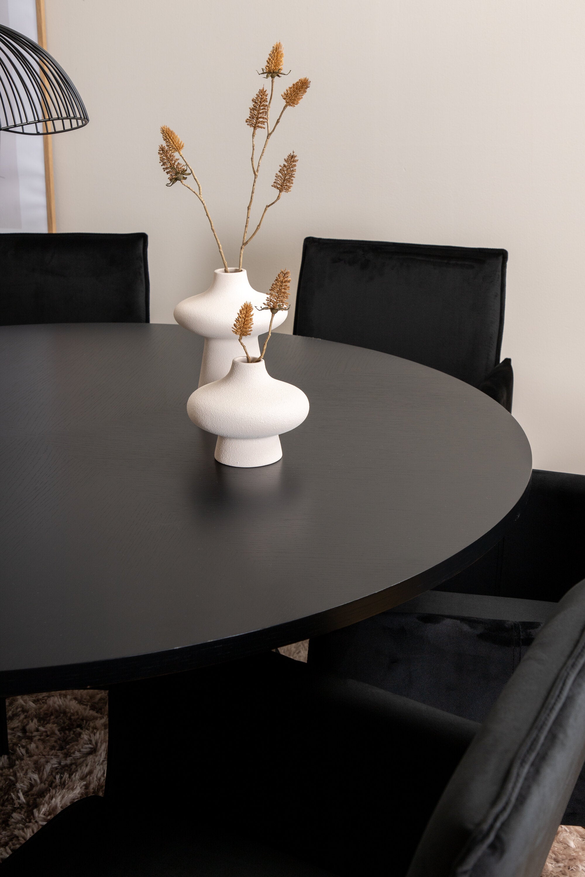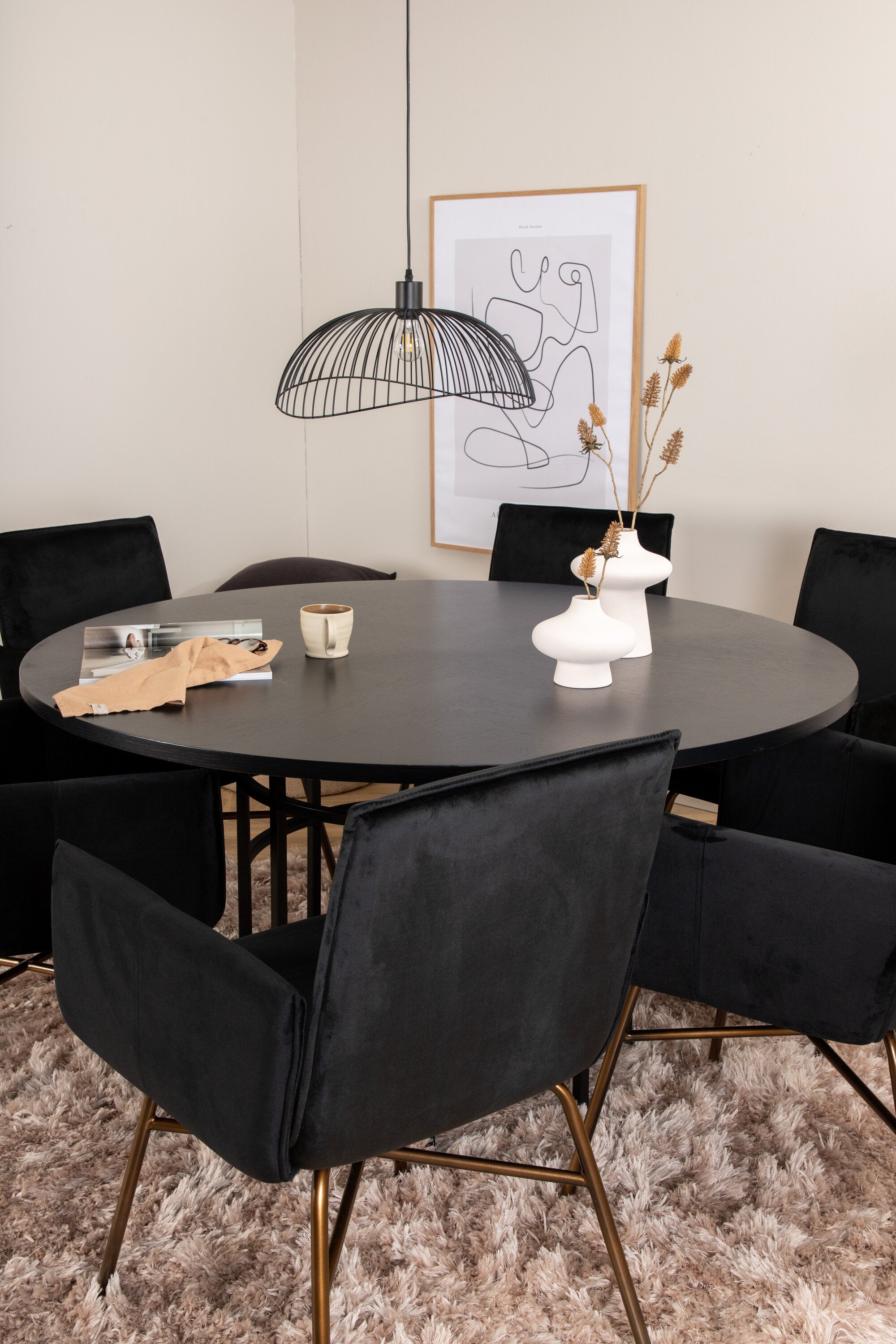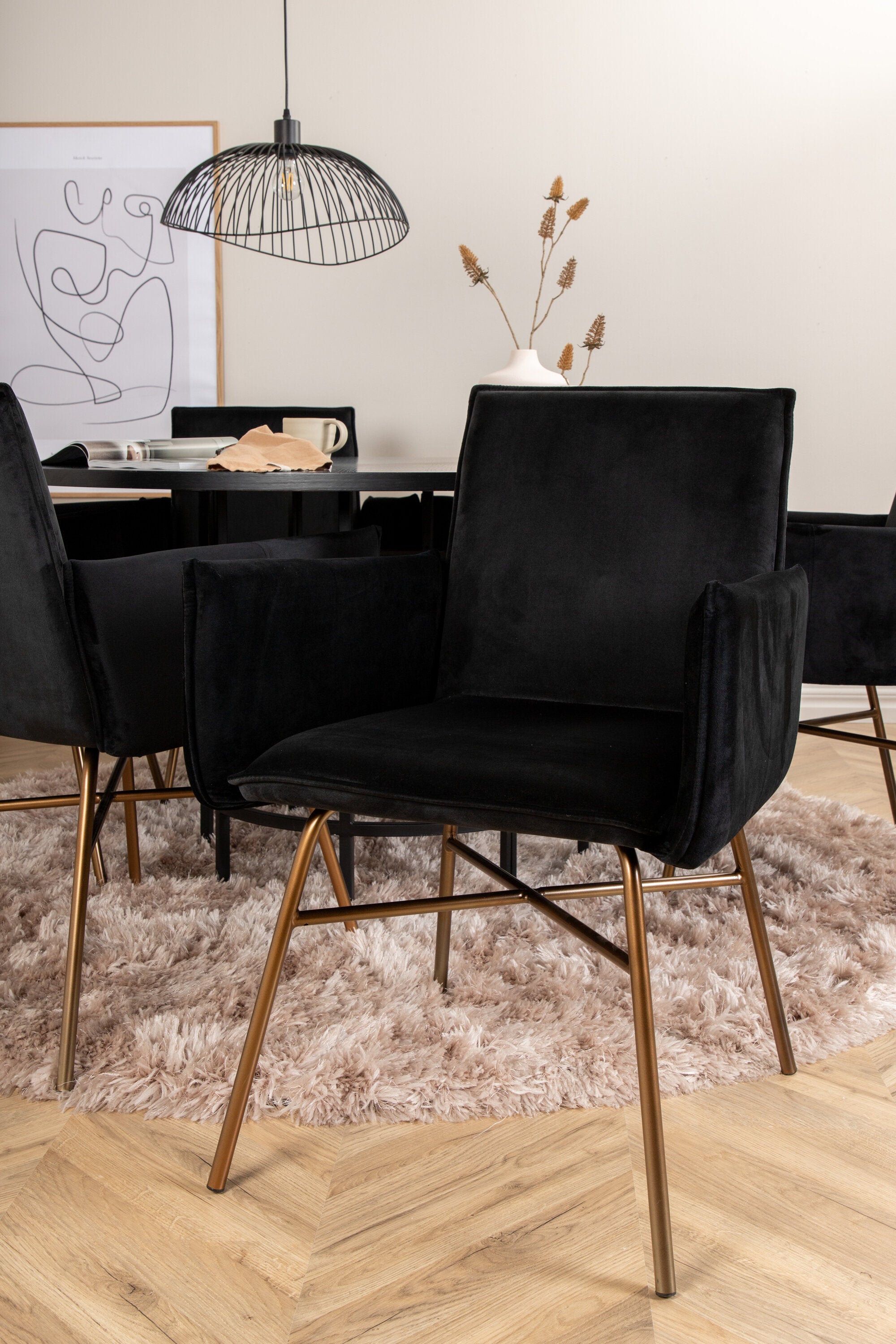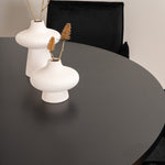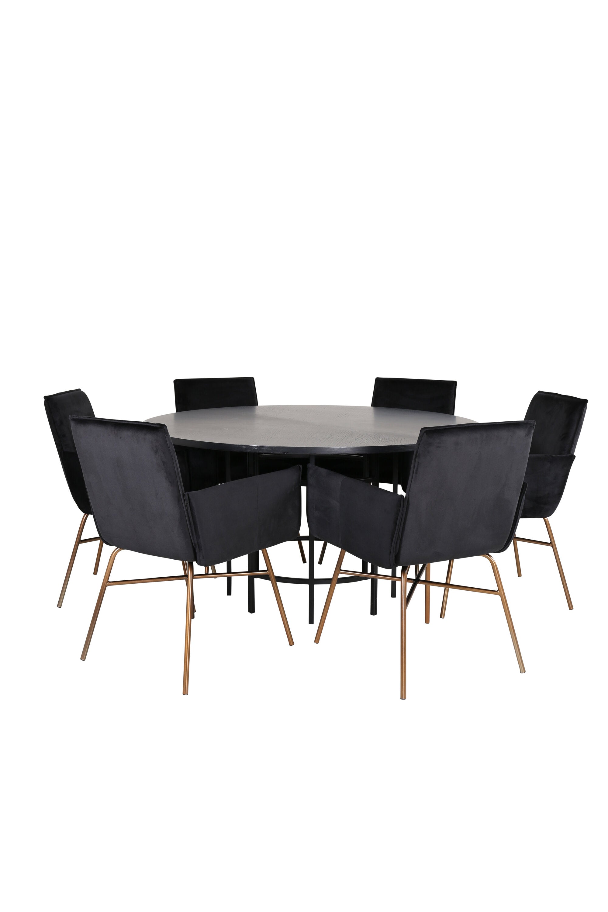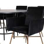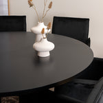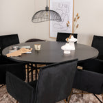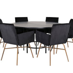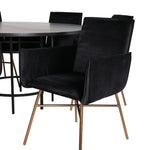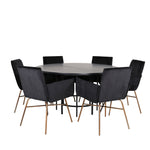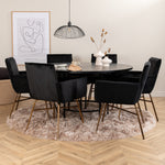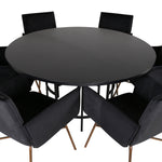 Copenhagen, náš oblíbený kulatý jídelní stůl s krásnou stolní deskou z černé MDF s dýhou a dekorativním podvozkem válcového tvaru v černém kovu. Stůl je konzistentně v elegantní černé barvě, která dodává místnosti pompézní a namyšlený výraz, ale také snadno sladíte s jiným dekorem. Rozměry stolu: Průměr: 140 cm, Výška: 74 cm. Zde je sladěn s 6 jídelními židlemi Petra v luxusním designu. Židle mají pohodlnou hloubku sedáku se sedákem z černého sametu a úzkými nohami židle z měděného železa. Rozměry židle: Výška: 87 cm, výška sedáku: 48 cm, šířka: 57 cm, hloubka: 60 cm. Příjemná skupina jídel pro všechny příležitosti!
