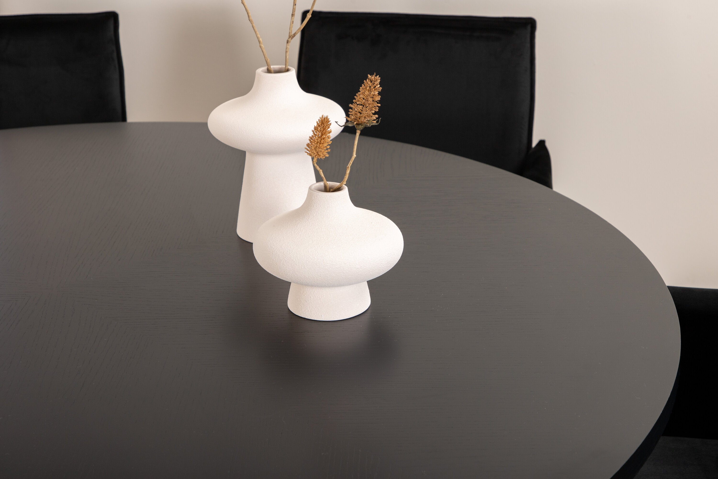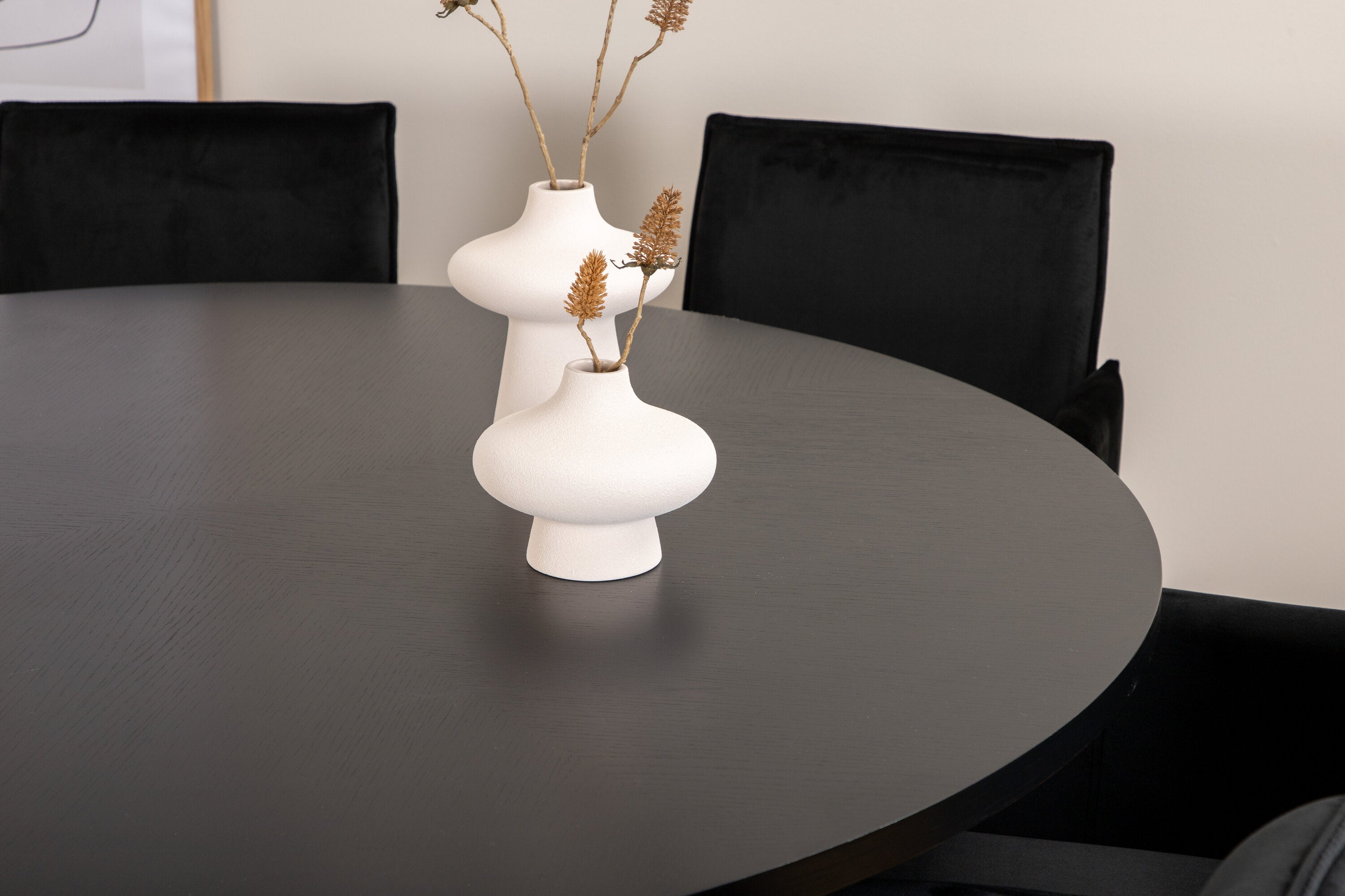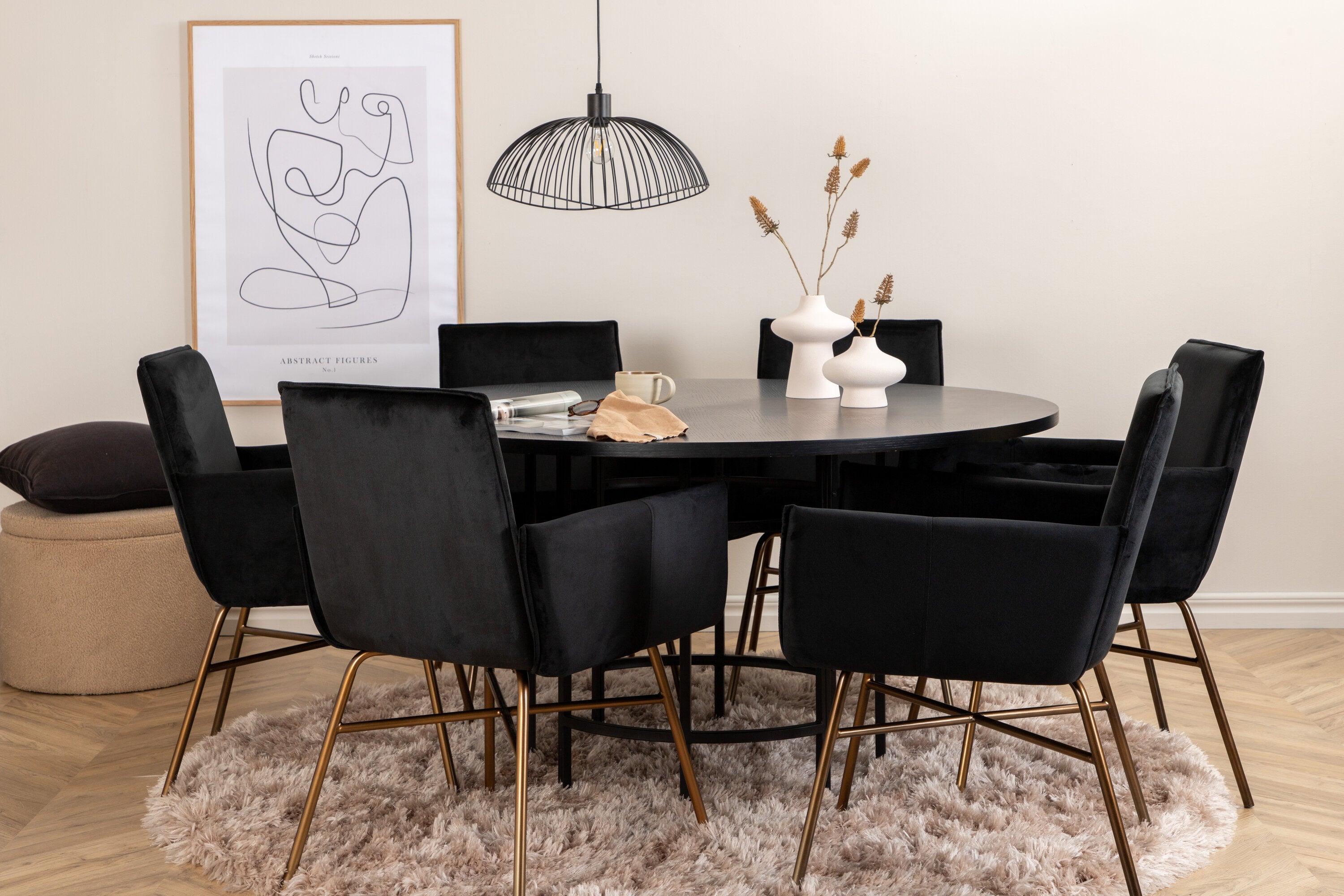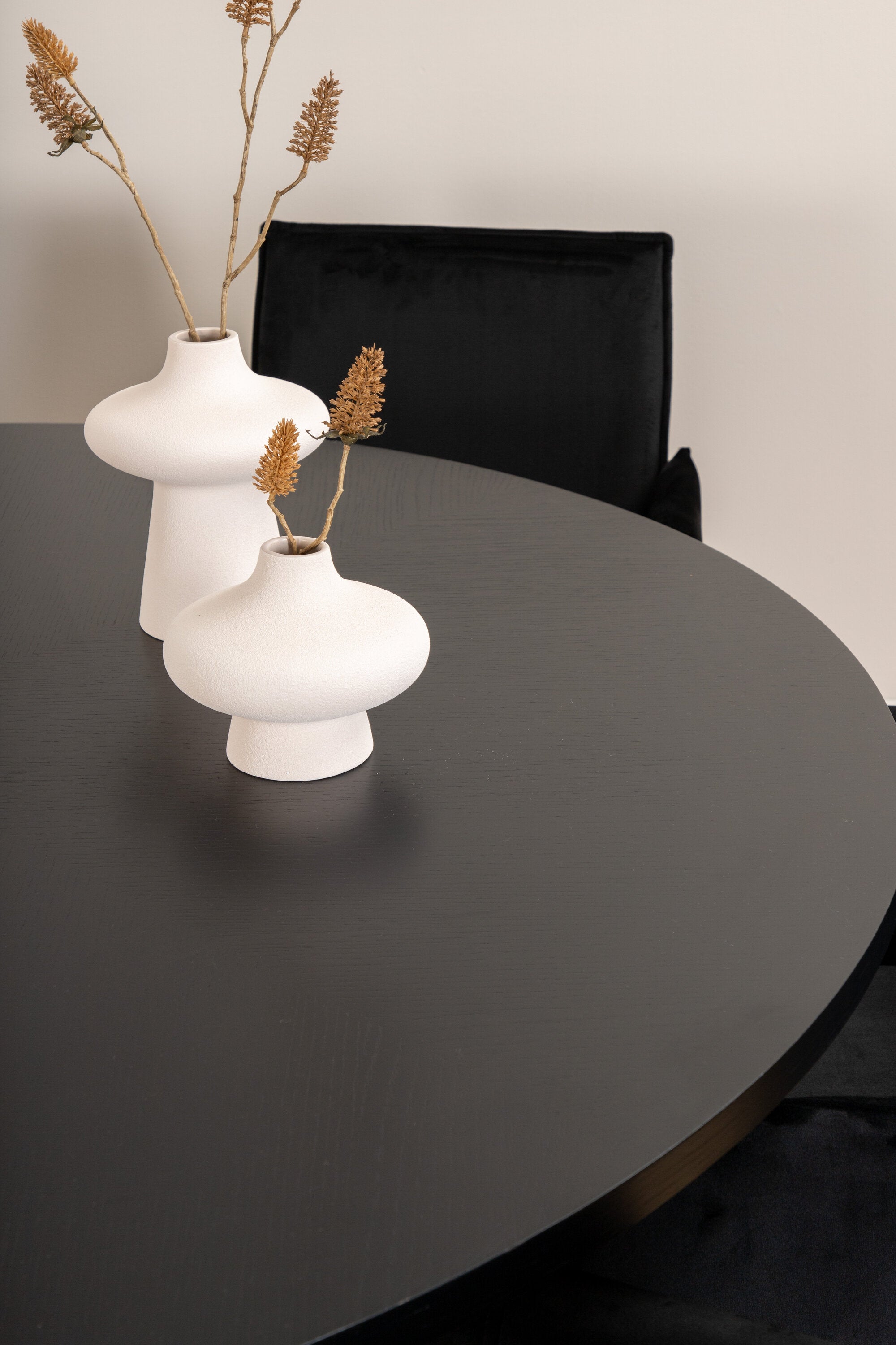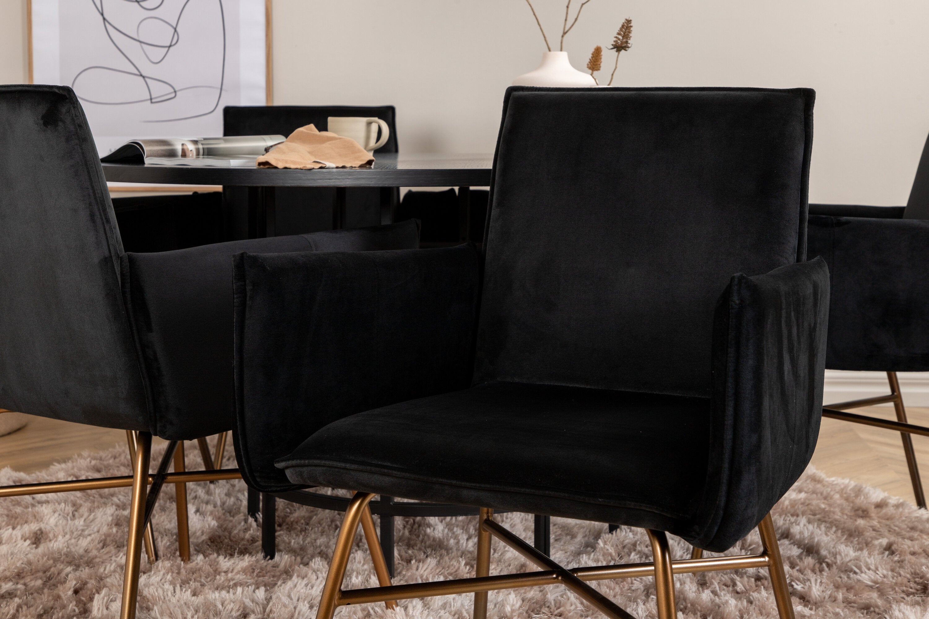 Copenhagen, náš oblíbený kulatý jídelní stůl s krásnou stolní deskou z černé MDF s dýhou a dekorativním podvozkem válcového tvaru v černém kovu. Stůl je konzistentně v elegantní černé barvě, která dodává místnosti pompézní a namyšlený výraz, ale také snadno sladíte s jiným dekorem. Rozměry stolu: Průměr: 140 cm, Výška: 74 cm. Zde je sladěn s 6 jídelními židlemi Petra v luxusním designu. Židle mají pohodlnou hloubku sedáku se sedákem z černého sametu a úzkými nohami židle z měděného železa. Rozměry židle: Výška: 87 cm, výška sedáku: 48 cm, šířka: 57 cm, hloubka: 60 cm. Příjemná skupina jídel pro všechny příležitosti!