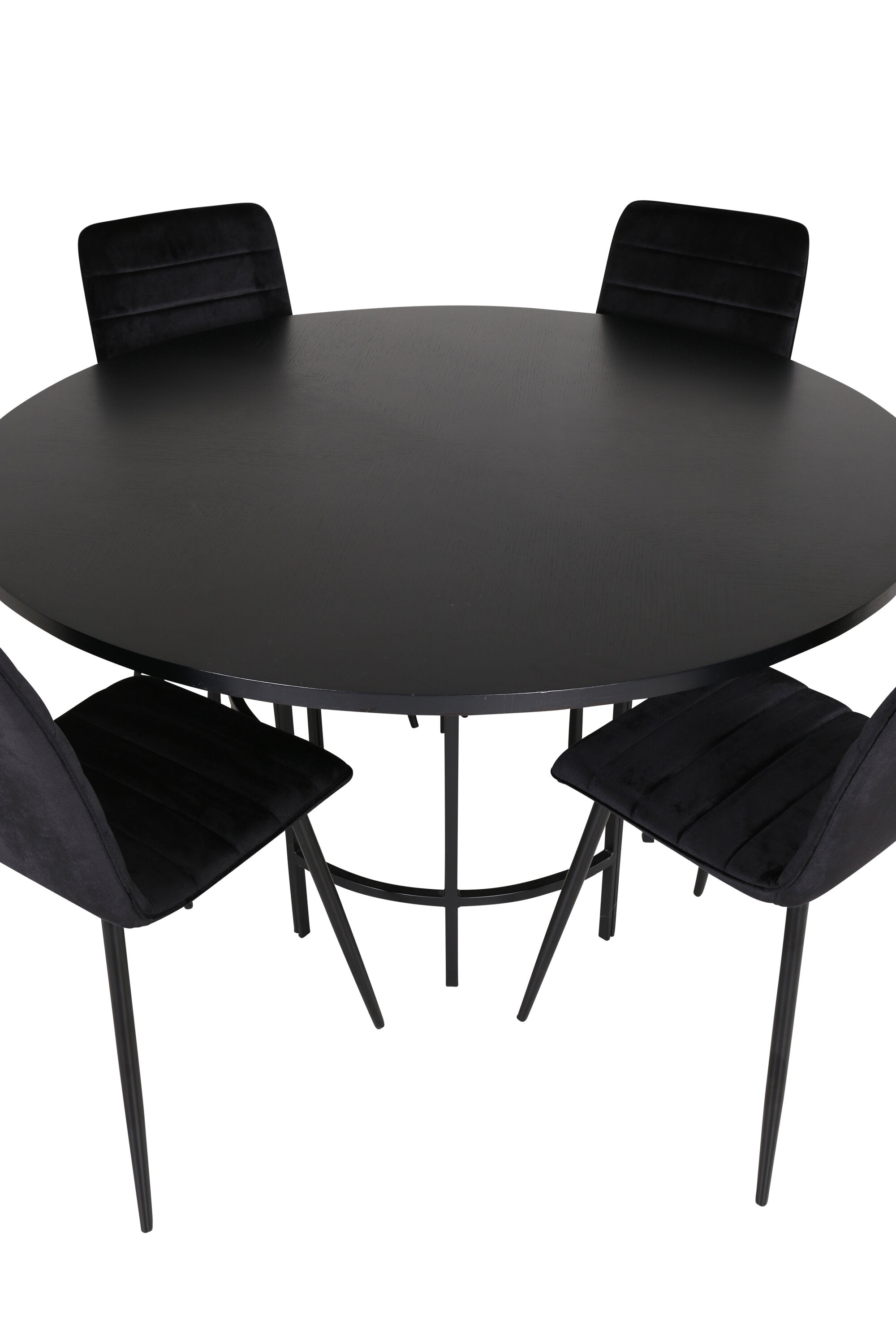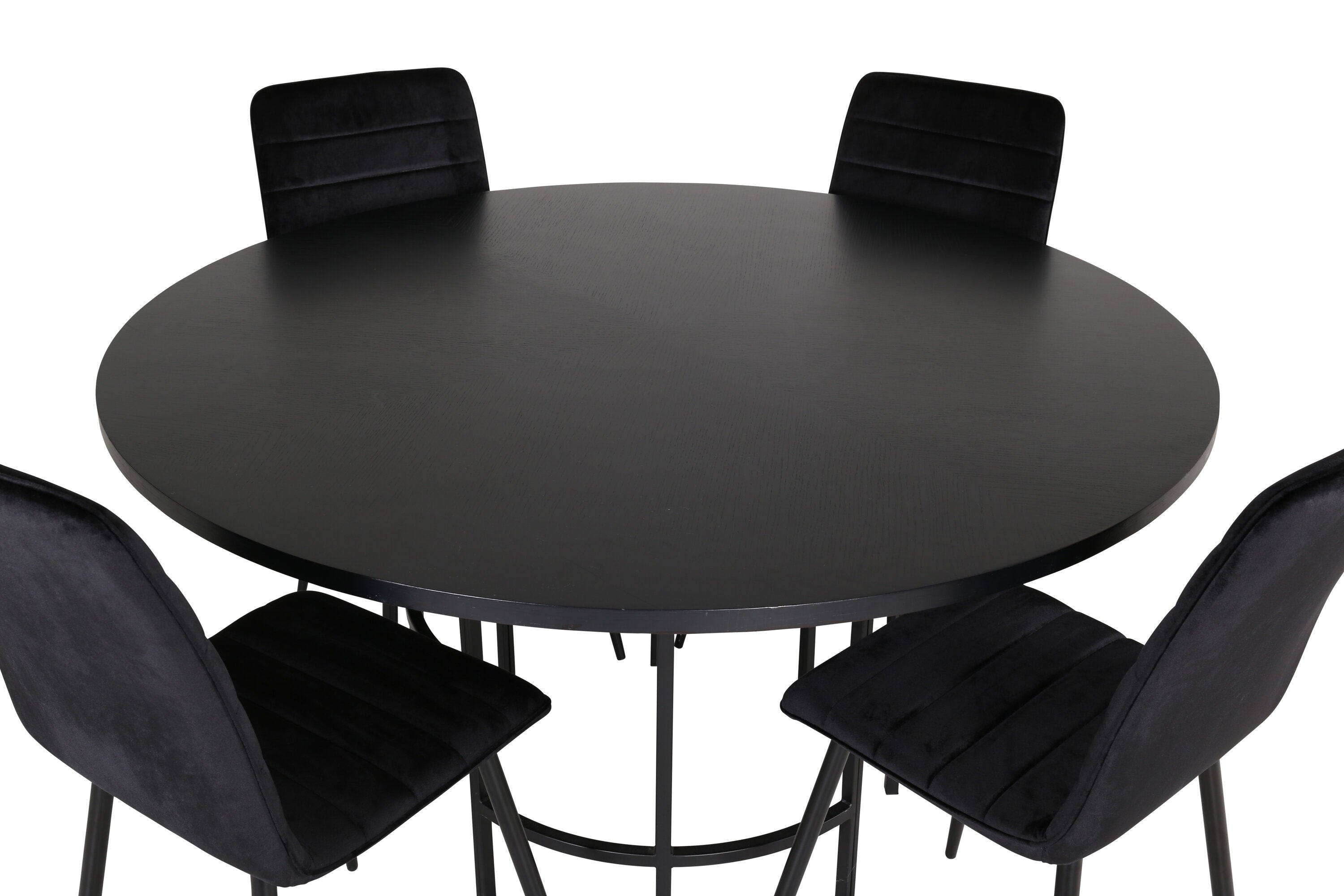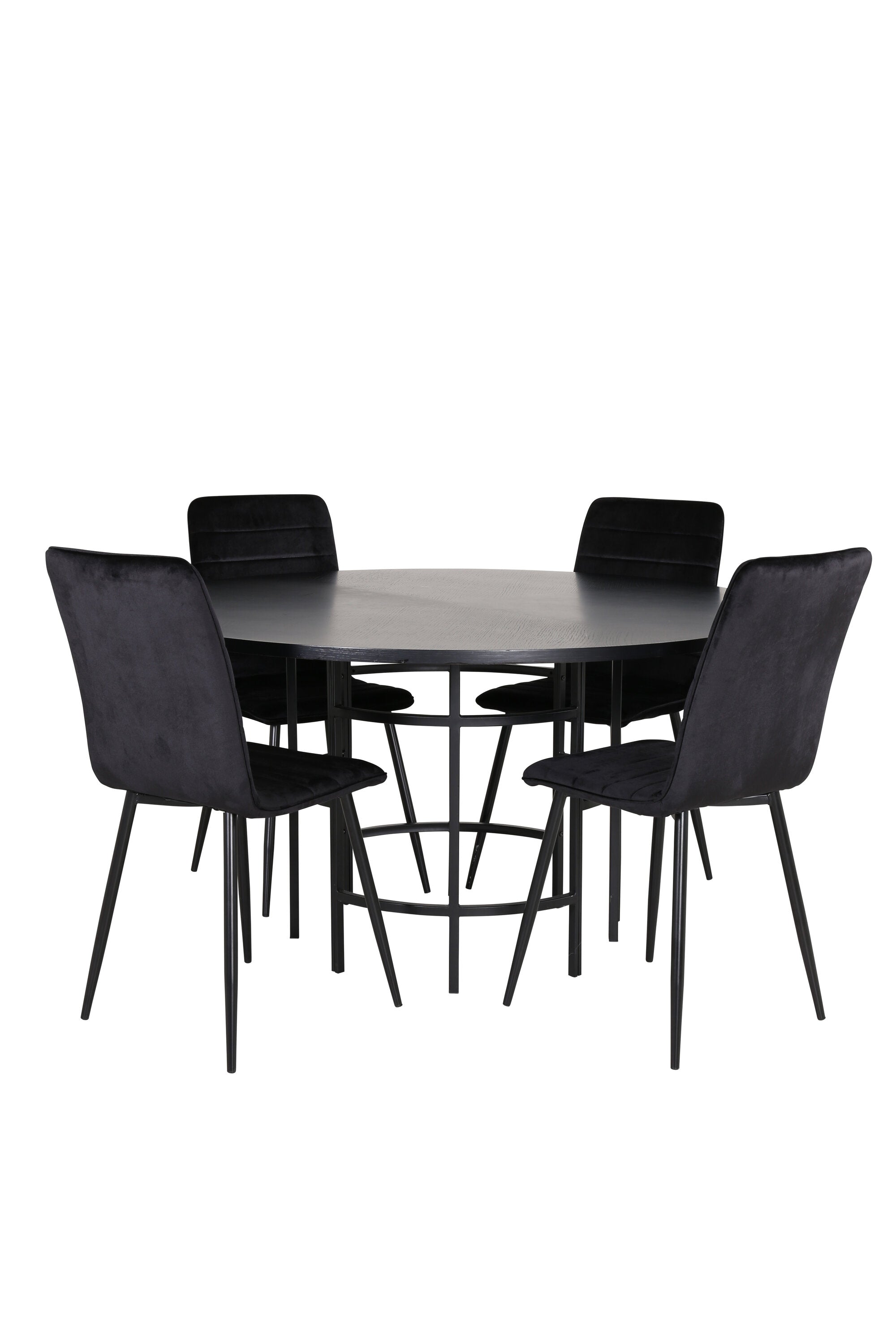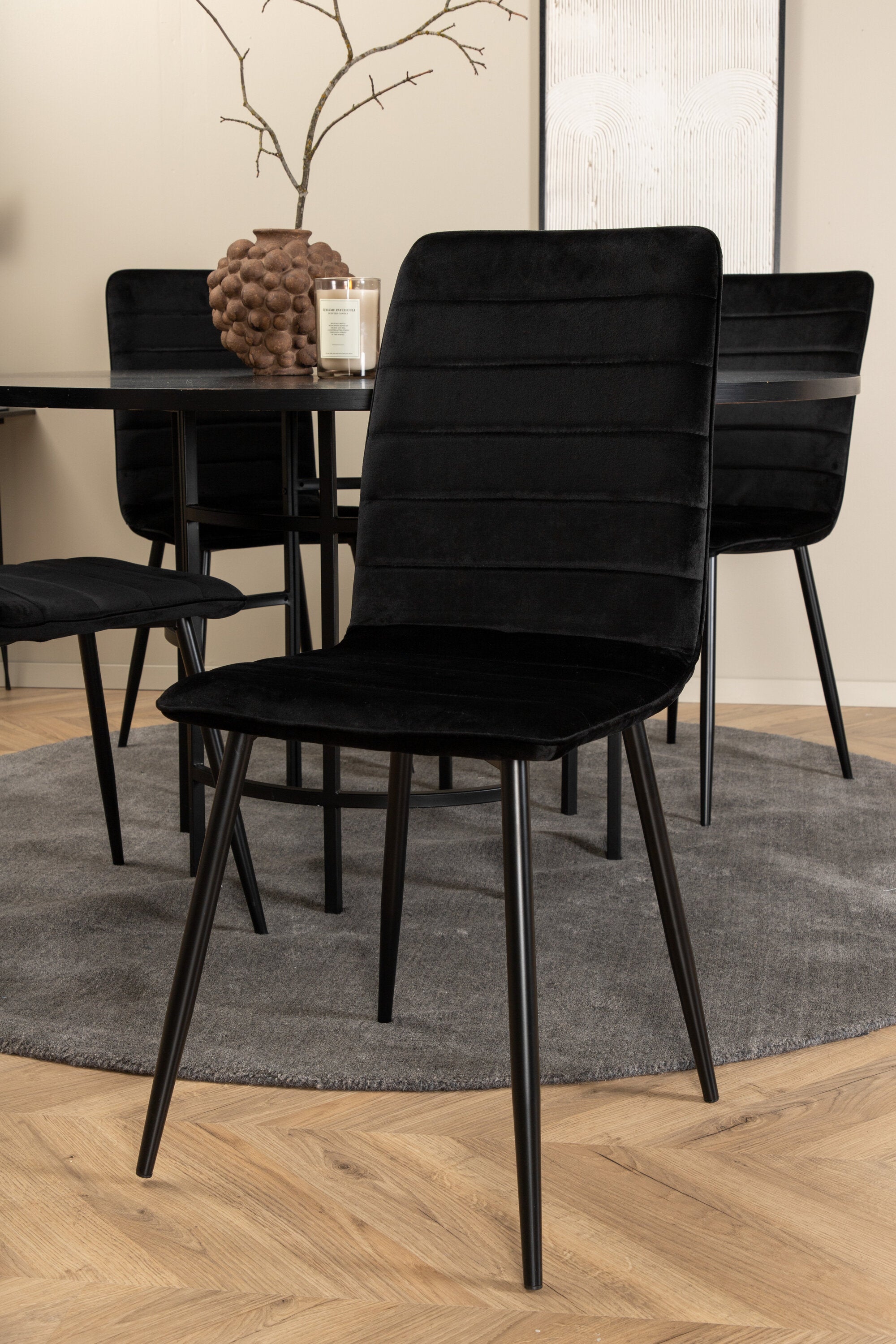 Stylové, pompézní a lákavé – skupina jídel, která má pro každého pravdu! Jídelní stůl Copenhagen má trendový design v konzistentně černé barvě se stolovou deskou z MDF s dýhou a dekorativním kovovým podvozkem válcového tvaru. Rozměry stolu: Průměr: 140 cm, Výška: 74 cm. Zde spolu se 4 luxusními jídelními židlemi Windu v rovném provedení. Nohy židle jsou z černého železa a sedadla z lahodné černé sametové látky. Rozměry židle: Výška: 94 cm, výška sedáku: 47 cm, šířka: 43 cm, hloubka: 49 cm. Pohodlně se usaďte a pozvěte na mnoho příjemných jídel!