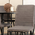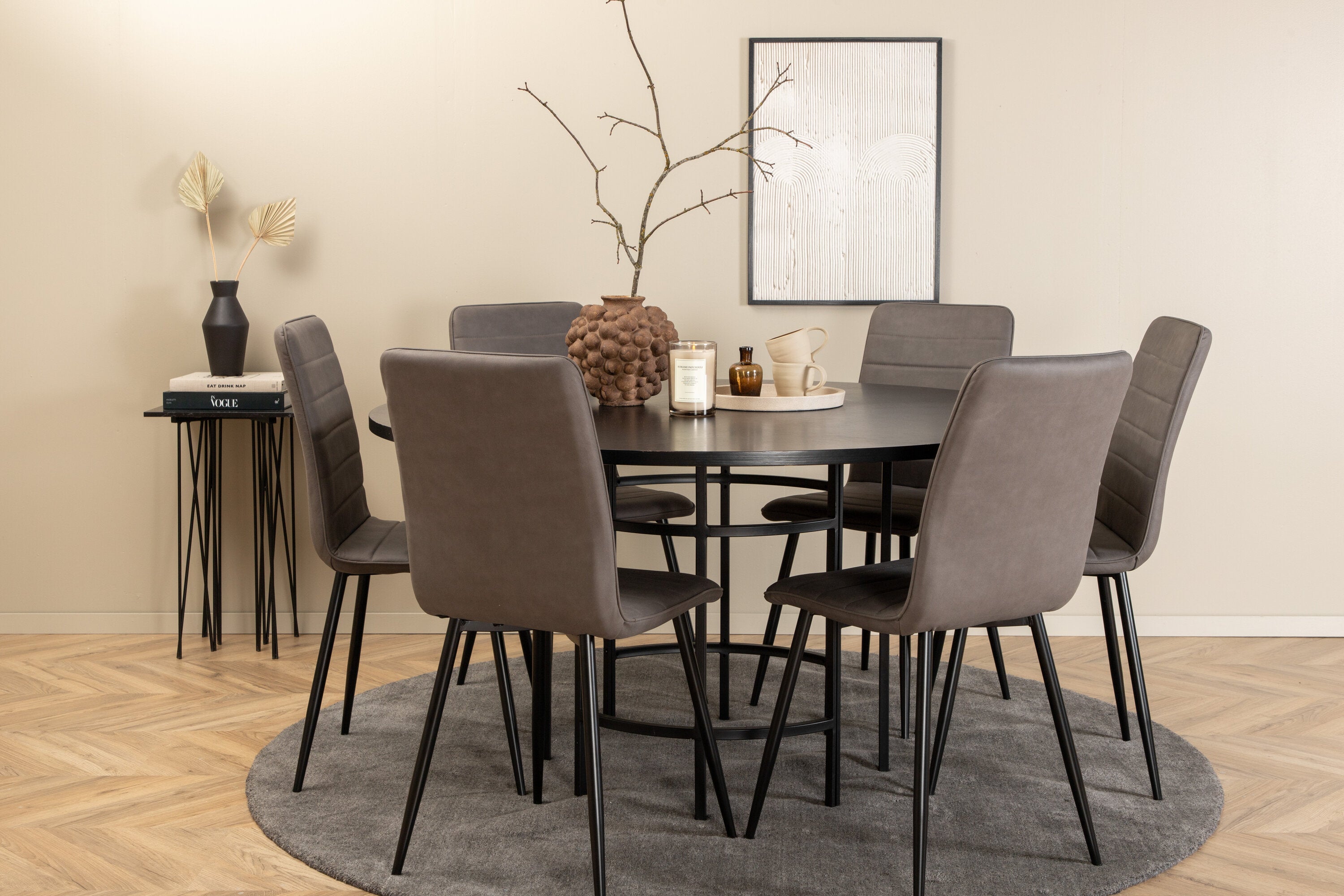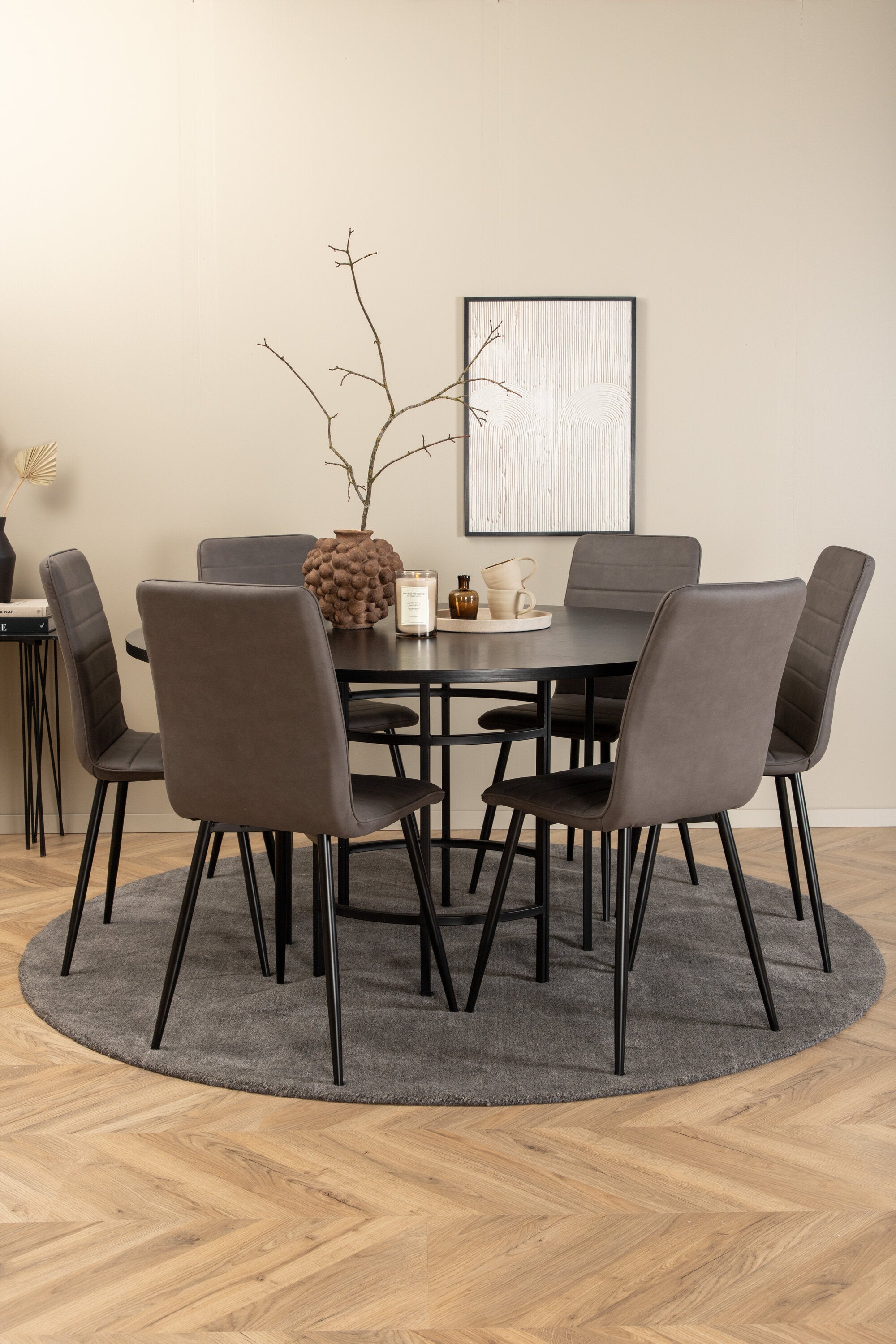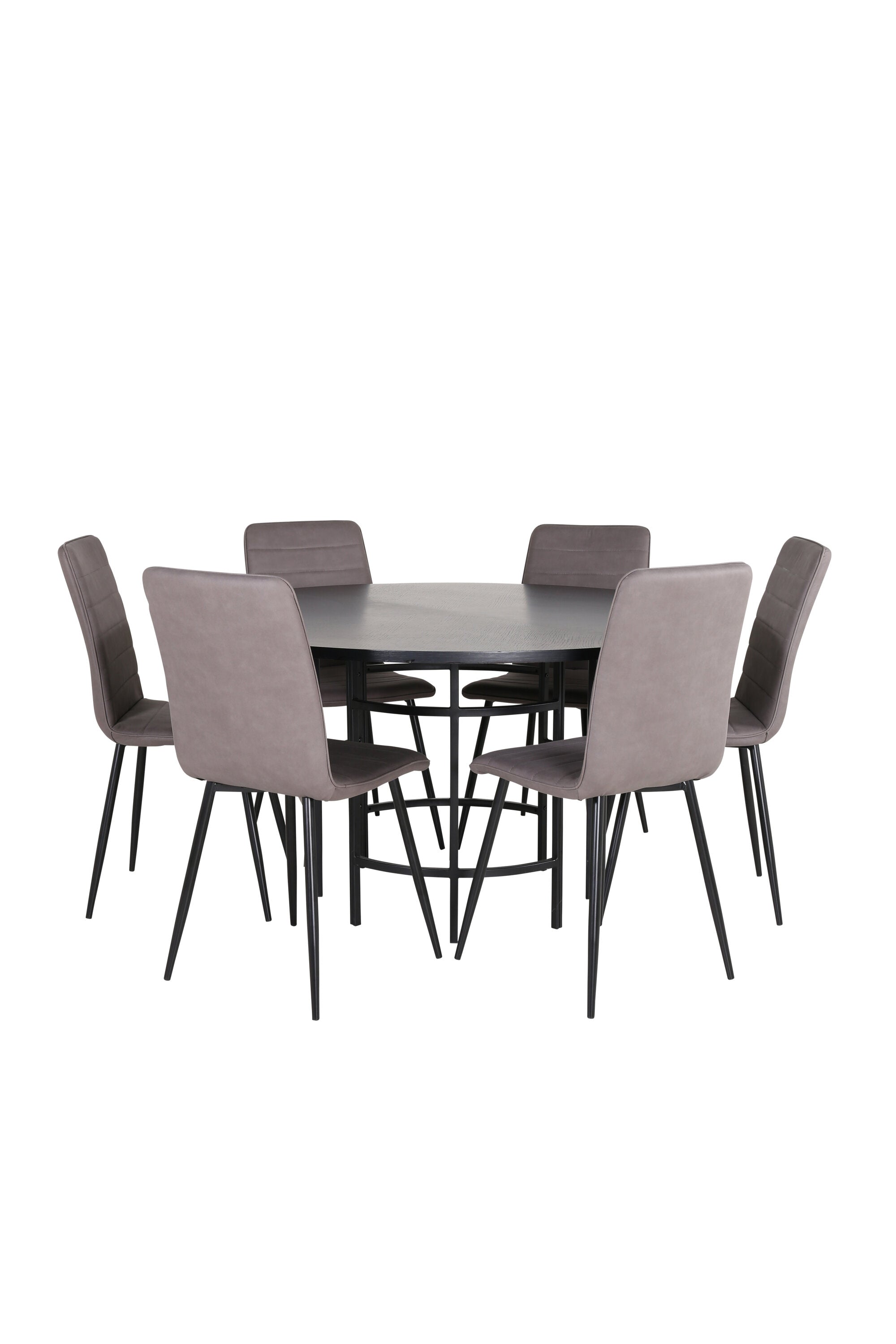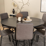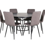 Stylové, pompézní a lákavé – skupina jídel, která má pro každého pravdu! Jídelní stůl Copenhagen má trendový design v konzistentně černé barvě se stolovou deskou z MDF s dýhou a dekorativním kovovým podvozkem válcového tvaru. Rozměry stolu: Průměr: 140 cm, Výška: 74 cm. Zde spolu s 6 luxusními jídelními židlemi Windu v rovném provedení. Nohy židle jsou z černého železa a sedák z šedého mikrovlákna. Rozměry židle: Výška: 94 cm, výška sedáku: 47 cm, šířka: 43 cm, hloubka: 49 cm. Pohodlně se usaďte a pozvěte na mnoho příjemných jídel!