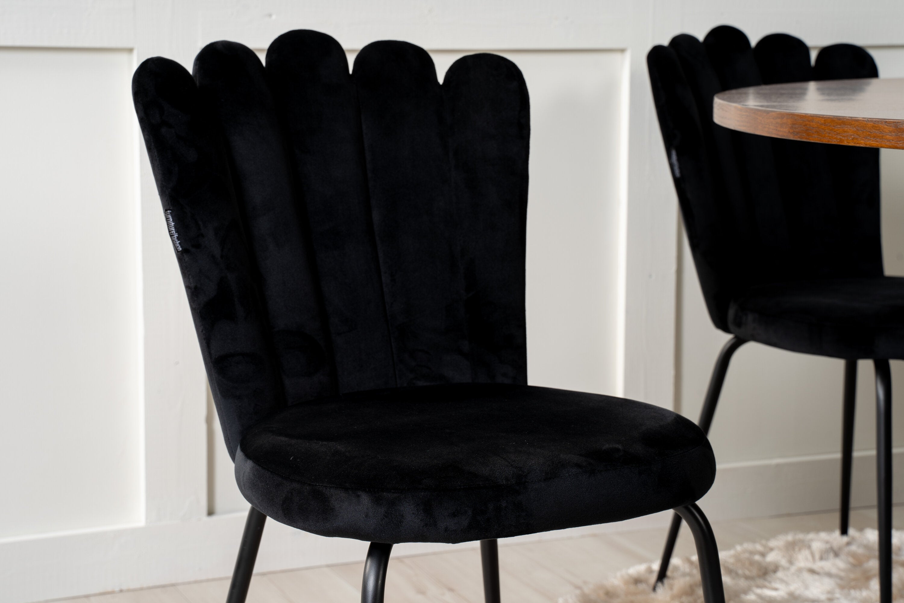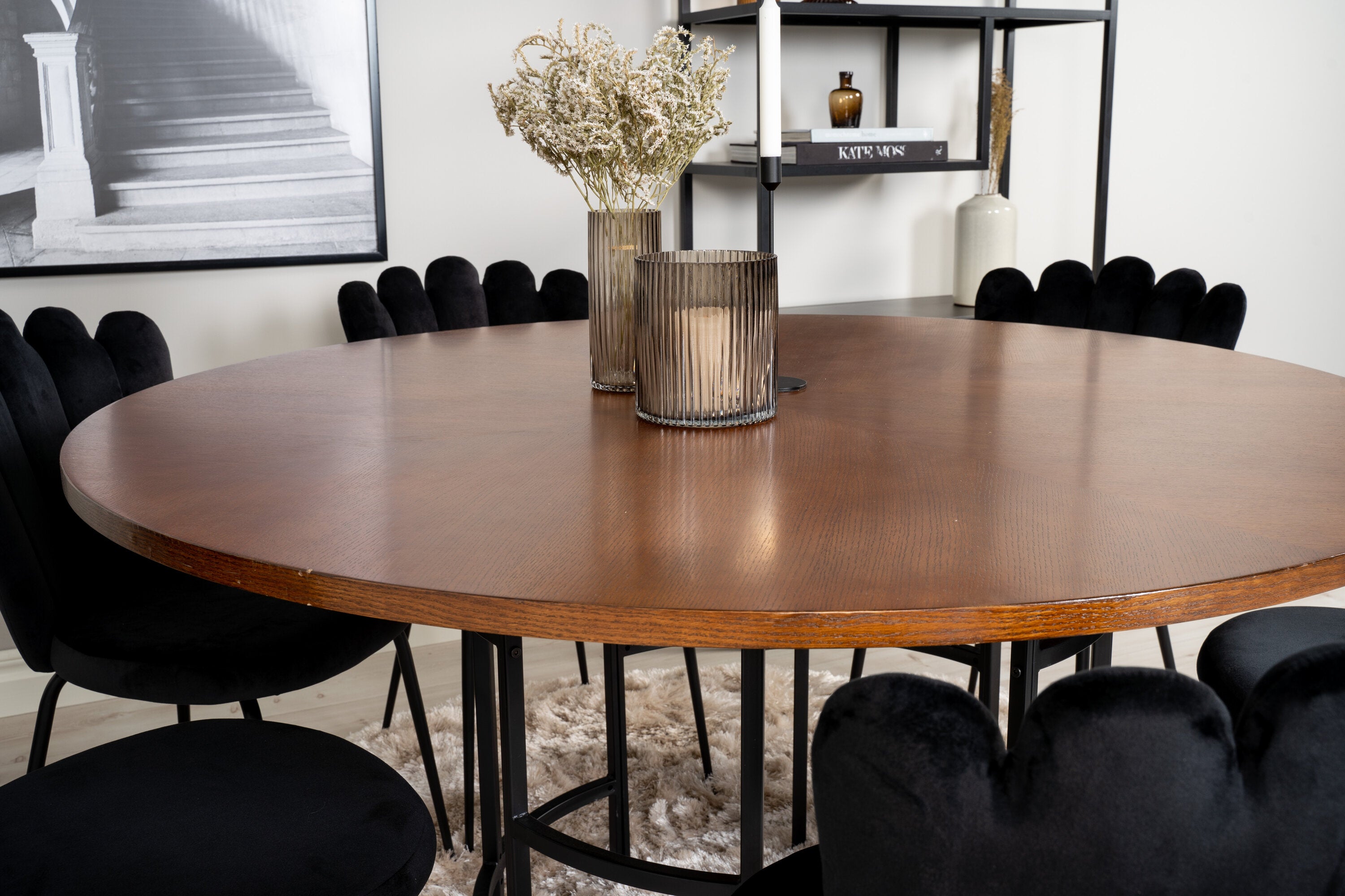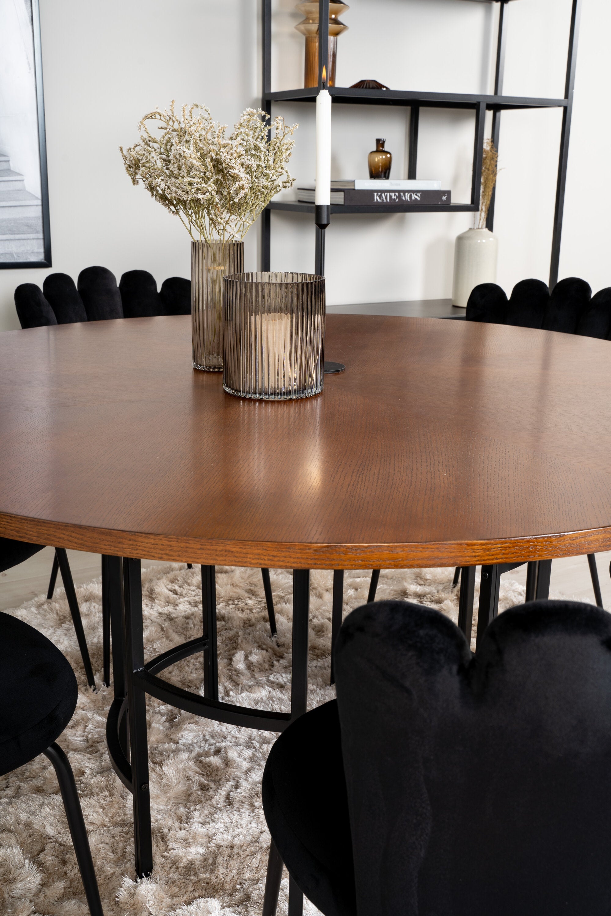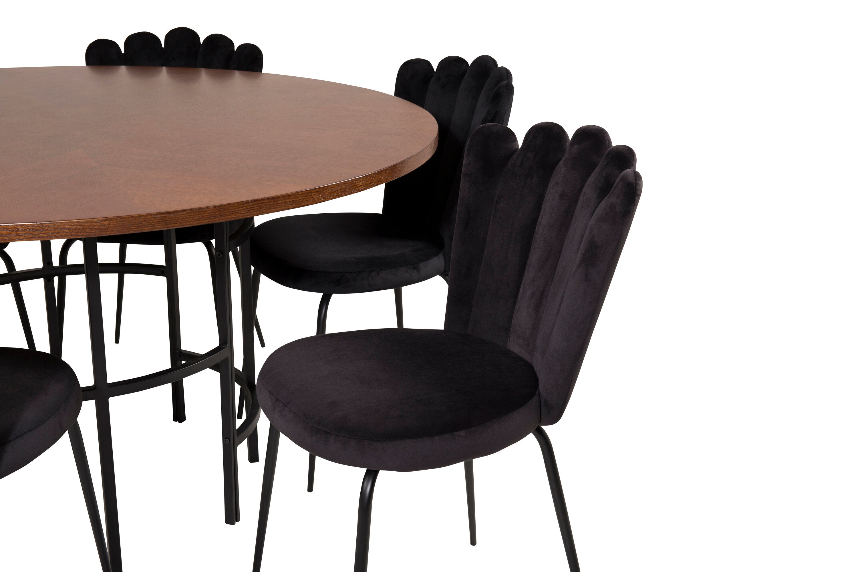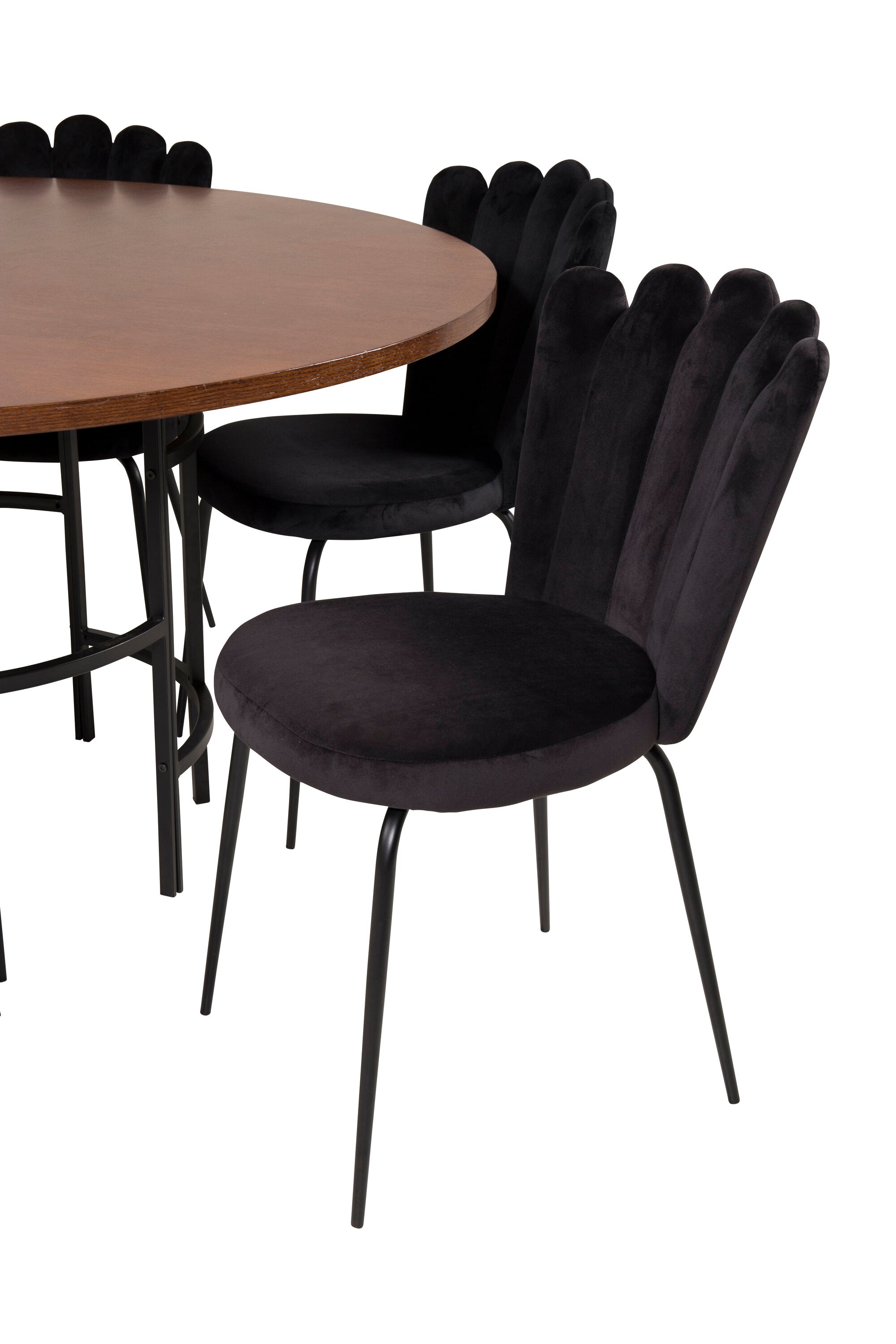 Elegantní a pompézní! Kulatá skupina potravin z kolekce Furniture Fashion. V celém černém výrazu, kde se sametové židle setkávají s deskou stolu připomínající tmavé dřevo, což dodává luxusní pocit. Stůl Copenhagen spolu se sametovými židlemi v černé barvě ze série Limhamn. Zde je místo pro mnohé - pozvěte na pěkné rodinné večeře!