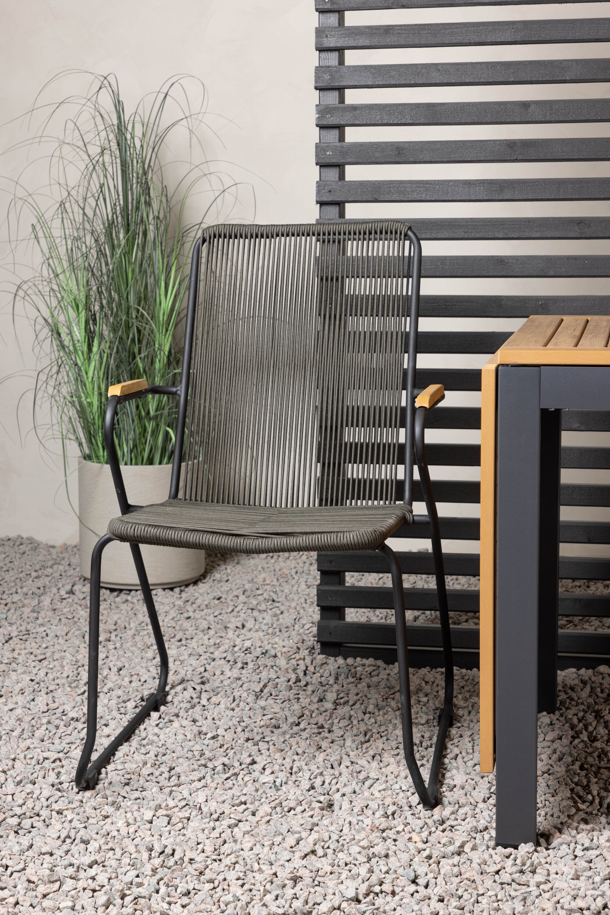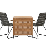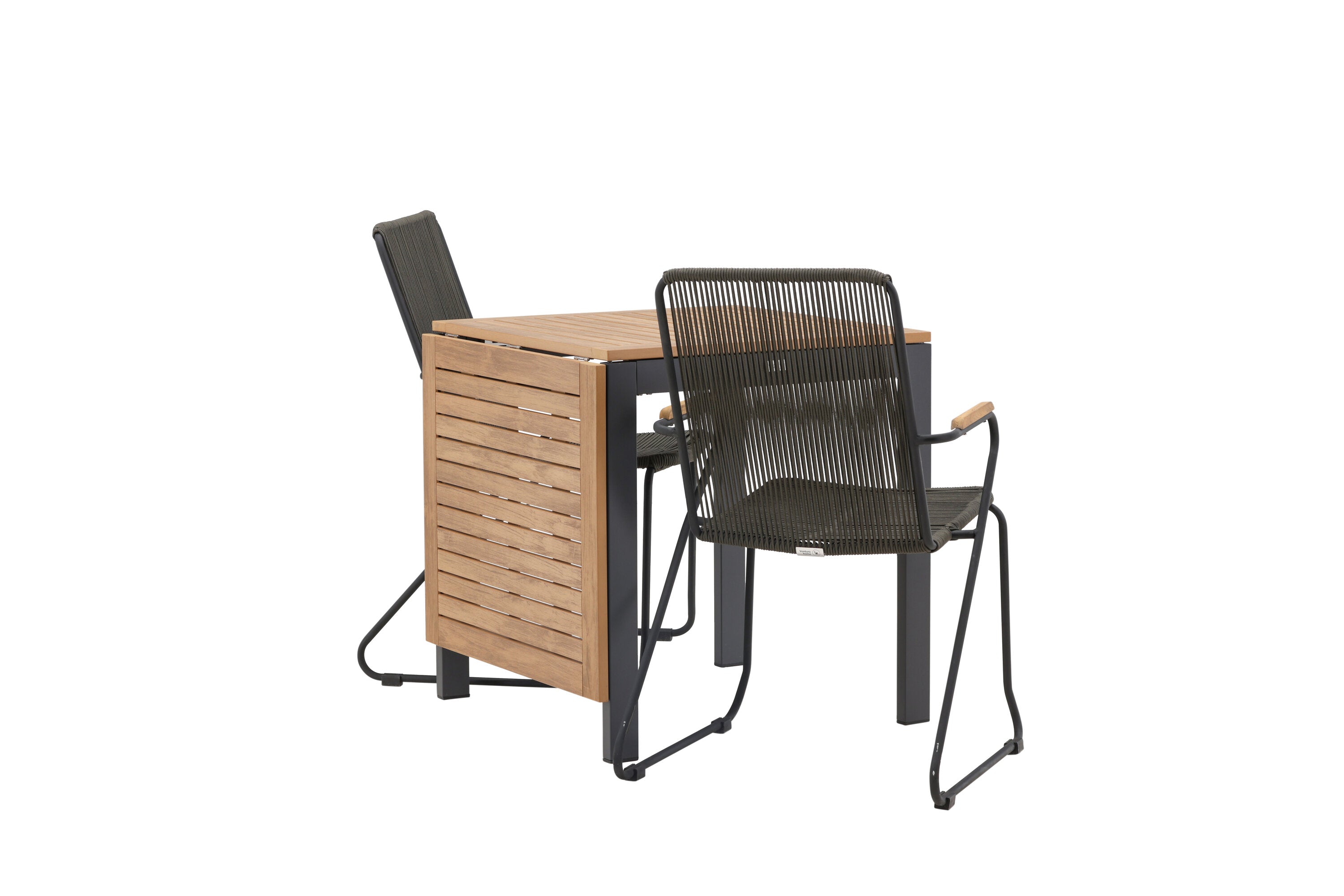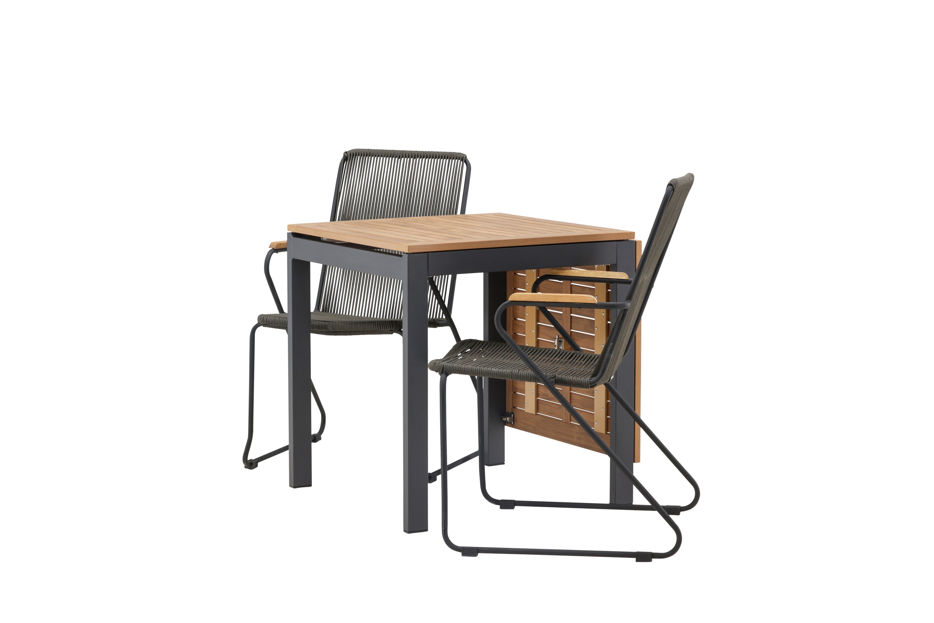Pijte si toto léto kávu venku! Kavárenský stůl Diego je stejně chytrý jako stylový s deskou v hnědém aintwoodu a nohami v černém hliníku. Stůl má také jednoduchou konstrukci, která umožňuje snadné skládání nástavných desek po stranách. Zde společně se 2 šedými jídelními židlemi ze série Bois. Židle má sedák z odolného šedého lana a úzký rám z černé oceli. Perfektní jídelní skupina na malý balkon! Rozměry stolu: 130/70x70cm.