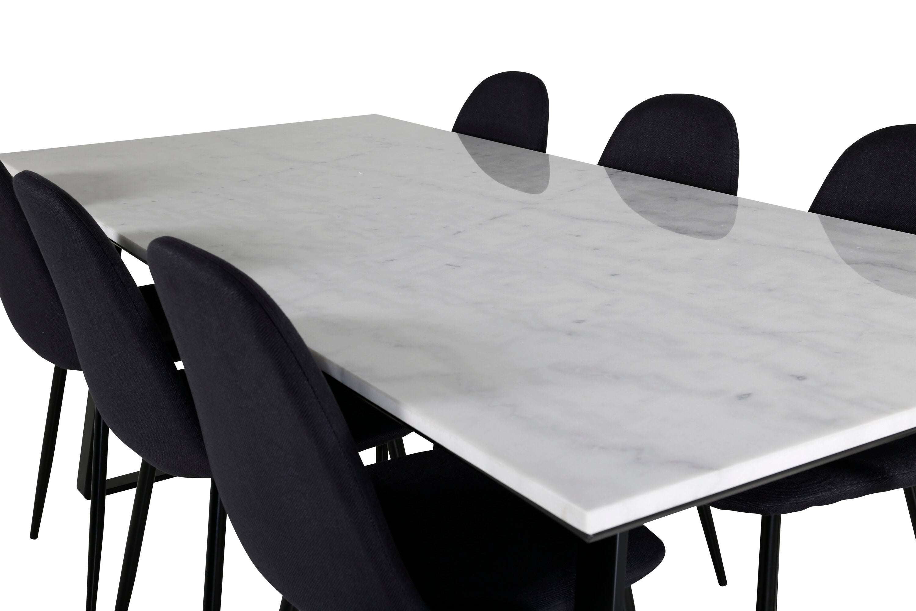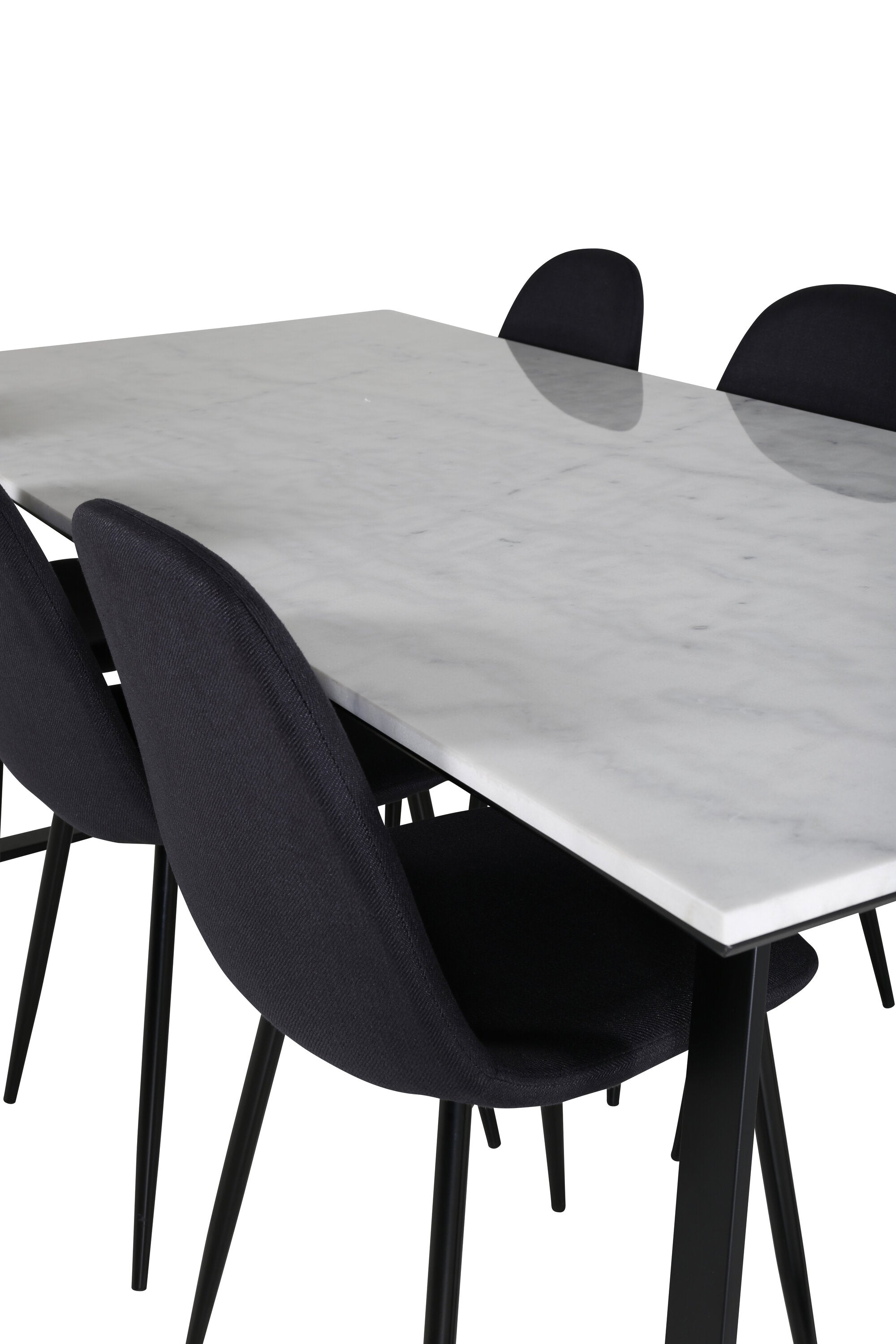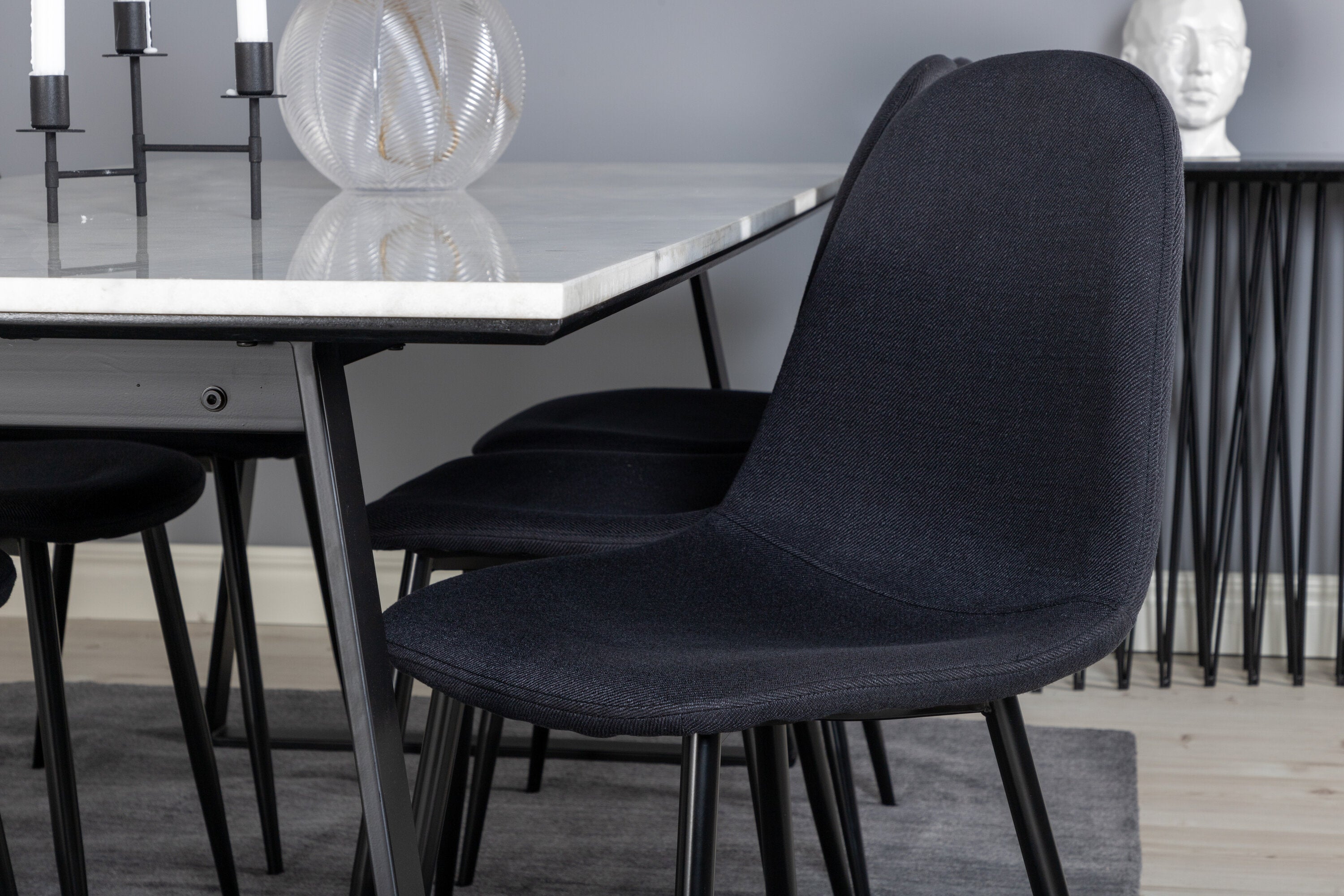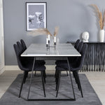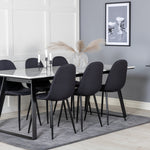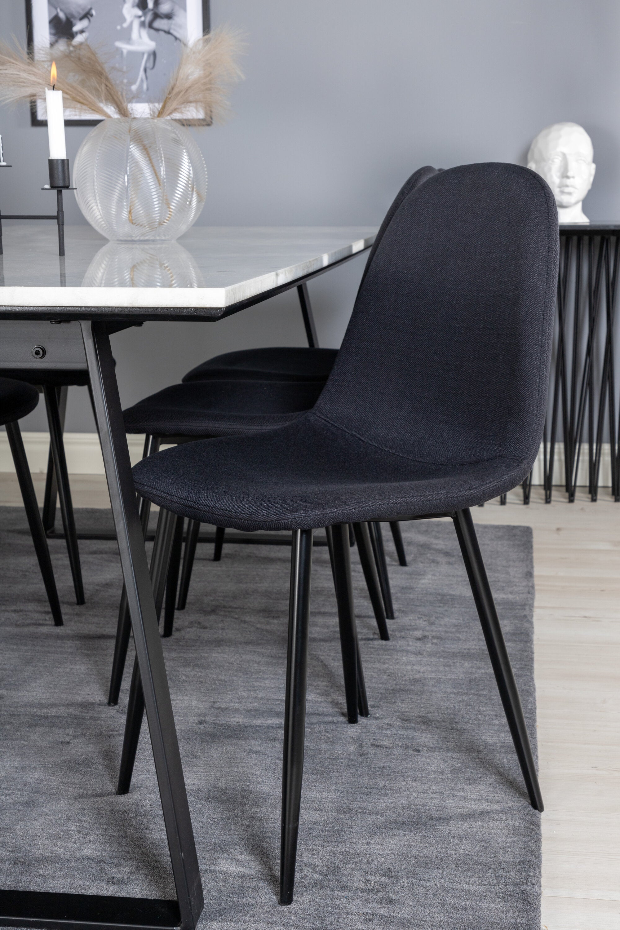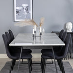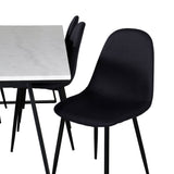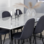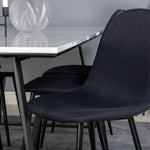 Jednoduché černé jídelní židle Polar jsou sladěny s jídelním stolem Estelle v krásném mramoru. Skupina potravin, která časem zaručeně obstojí!