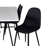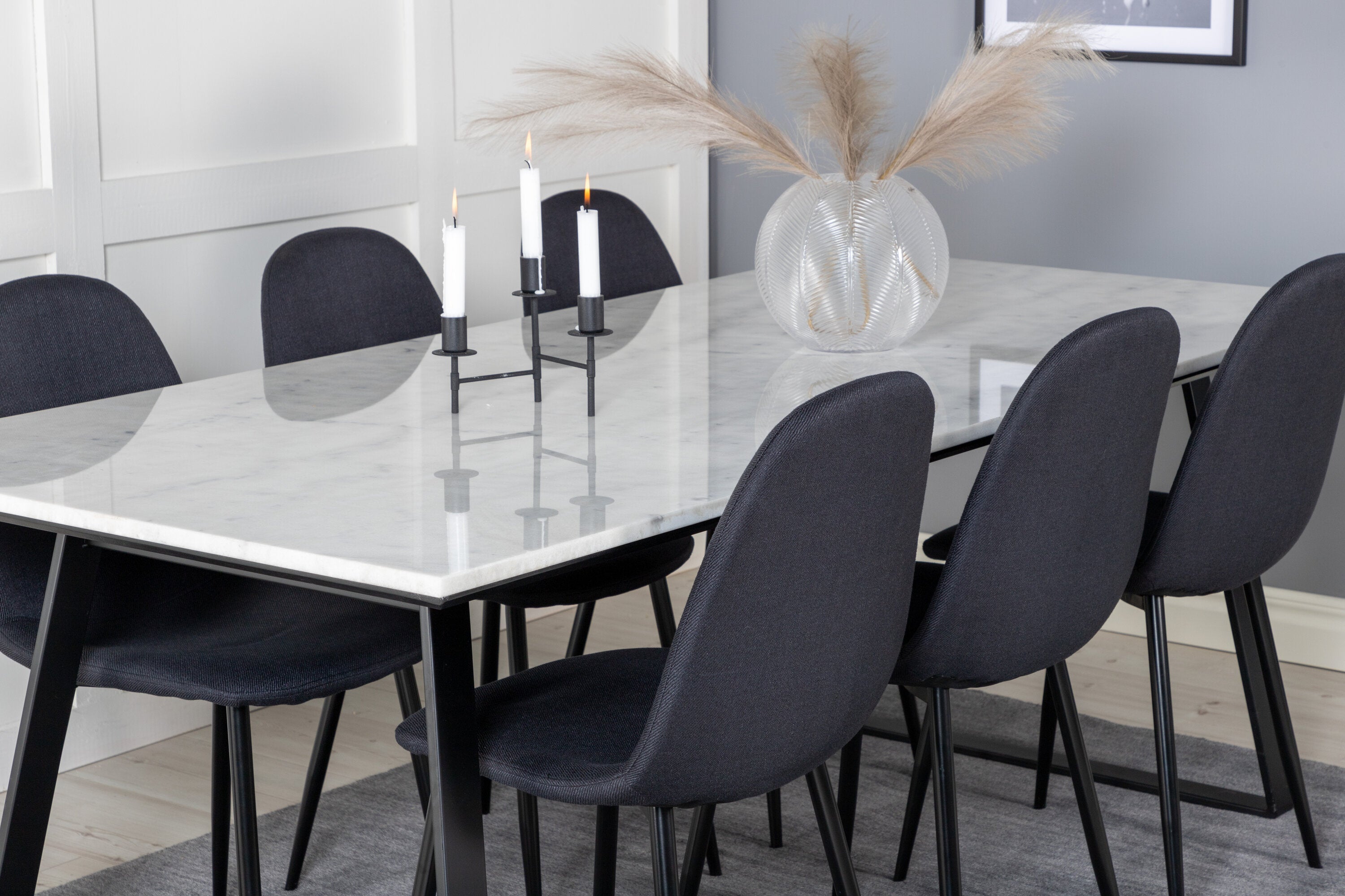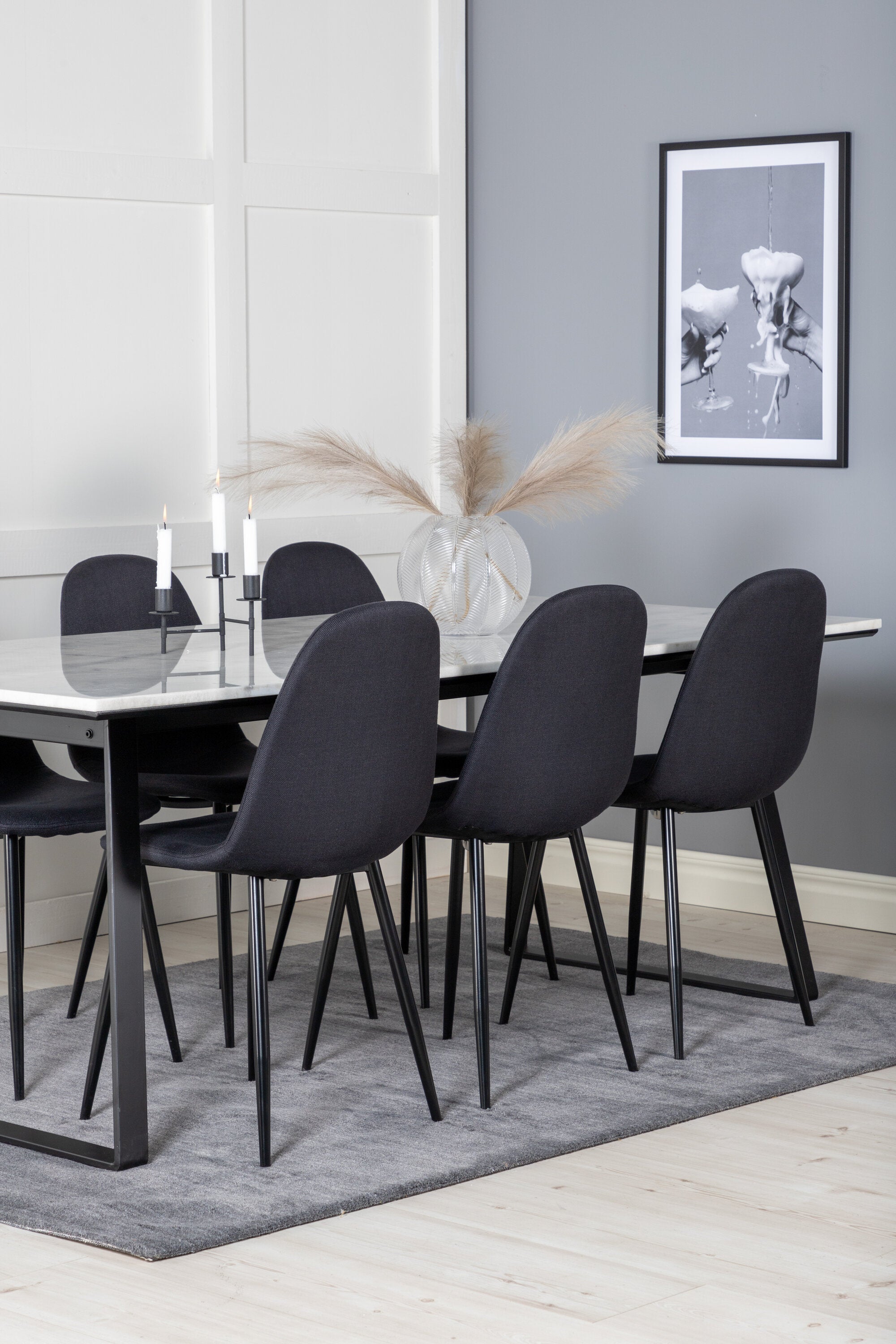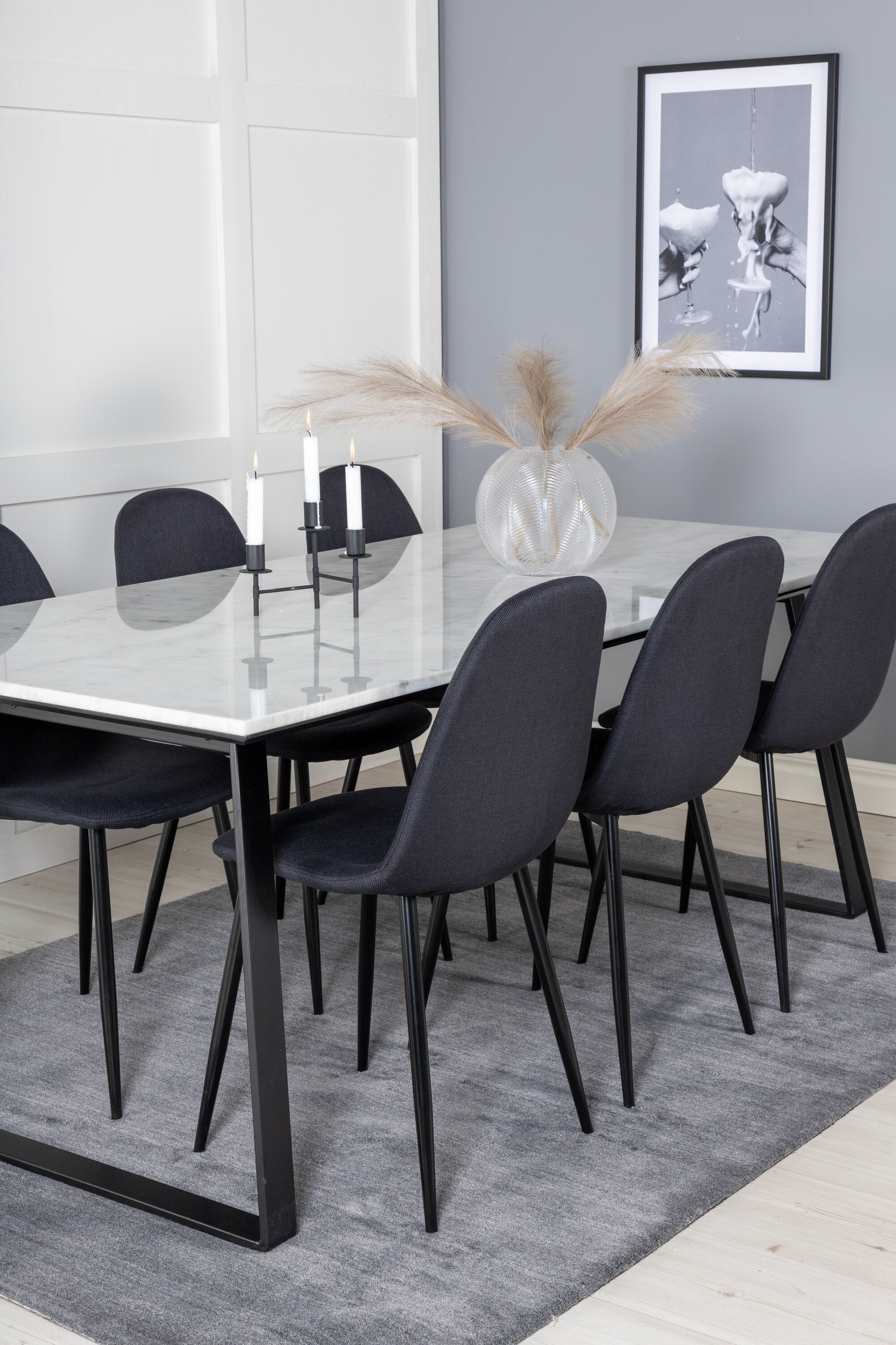 Jednoduché černé jídelní židle Polar jsou sladěny s jídelním stolem Estelle v krásném mramoru. Skupina potravin, která časem zaručeně obstojí!