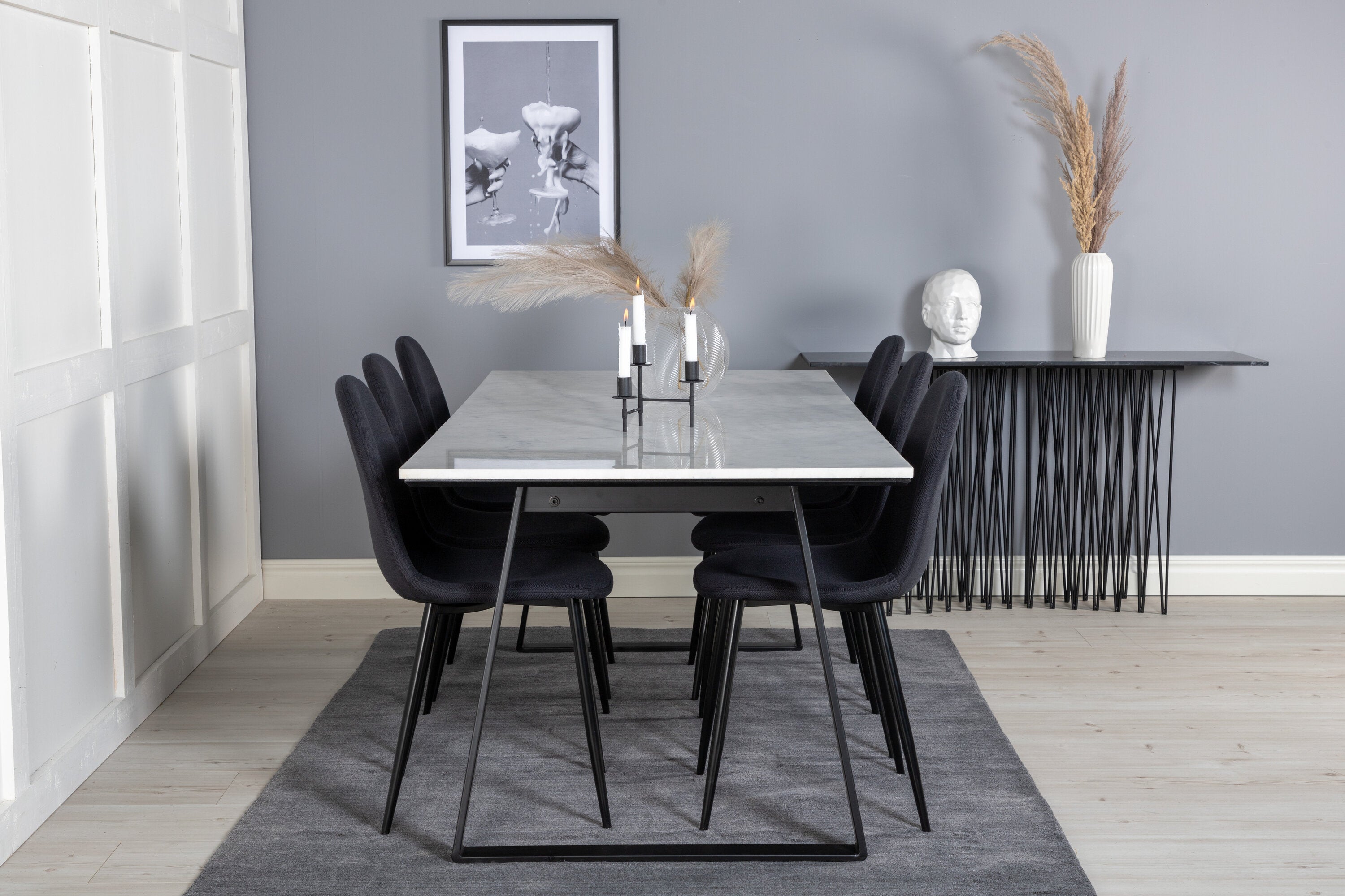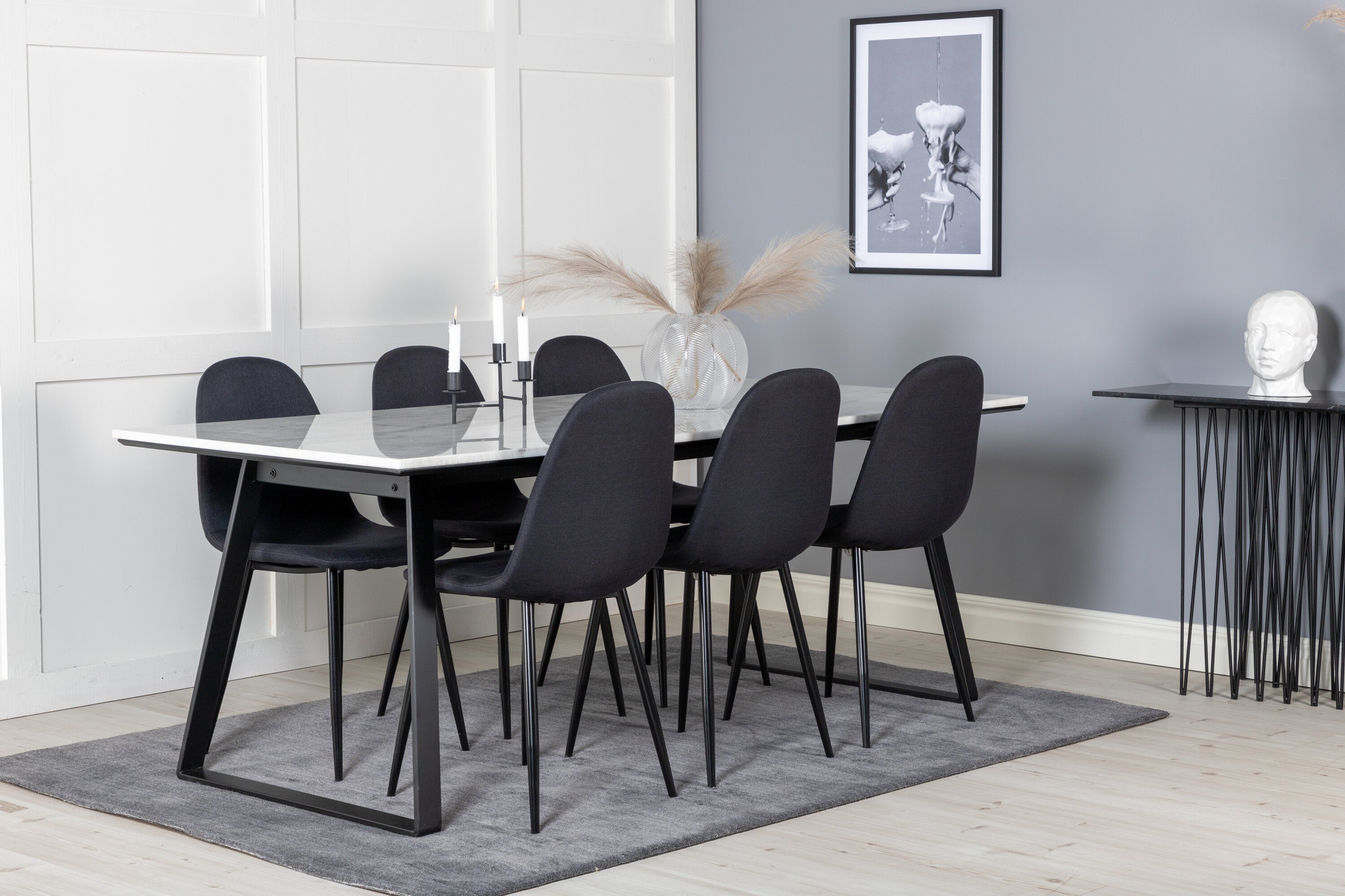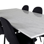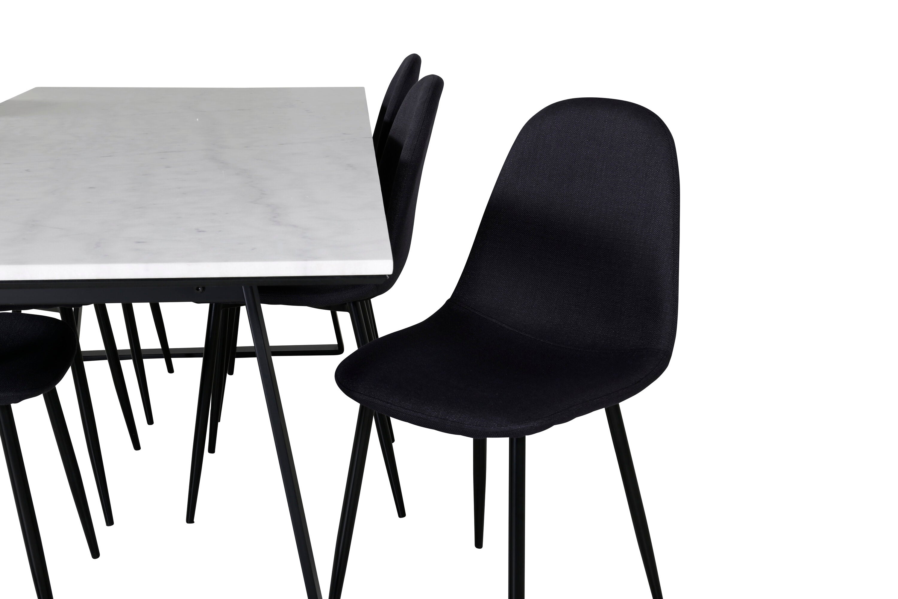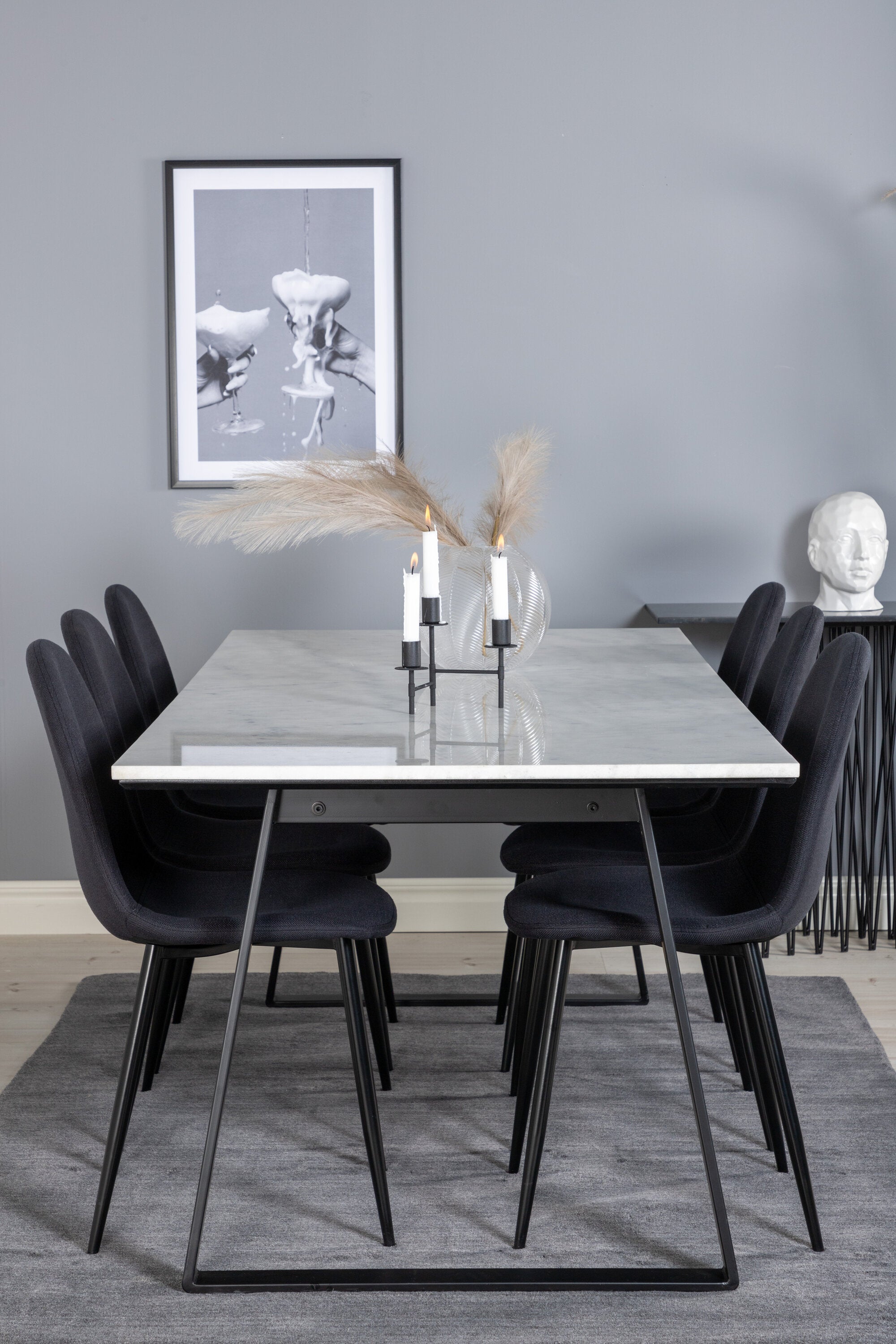 Jednoduché černé jídelní židle Polar jsou sladěny s jídelním stolem Estelle v krásném mramoru. Skupina potravin, která časem zaručeně obstojí!