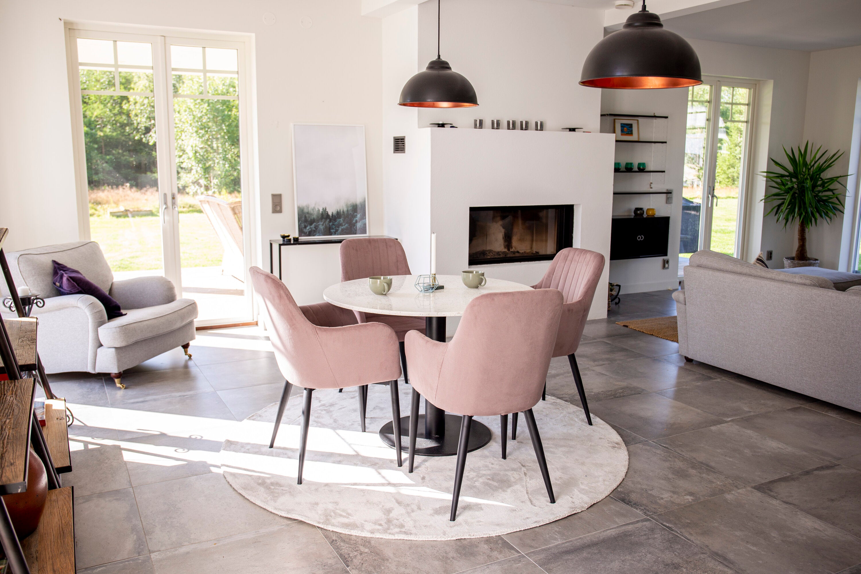 Estelle, krásný mramorový stůl, který se zde kombinuje s pohodlnými růžovými jídelními židlemi Comfort. Vytvořte něco úhledného a společenského - zde můžete dlouho posedět a užít si společnost dobrých přátel!