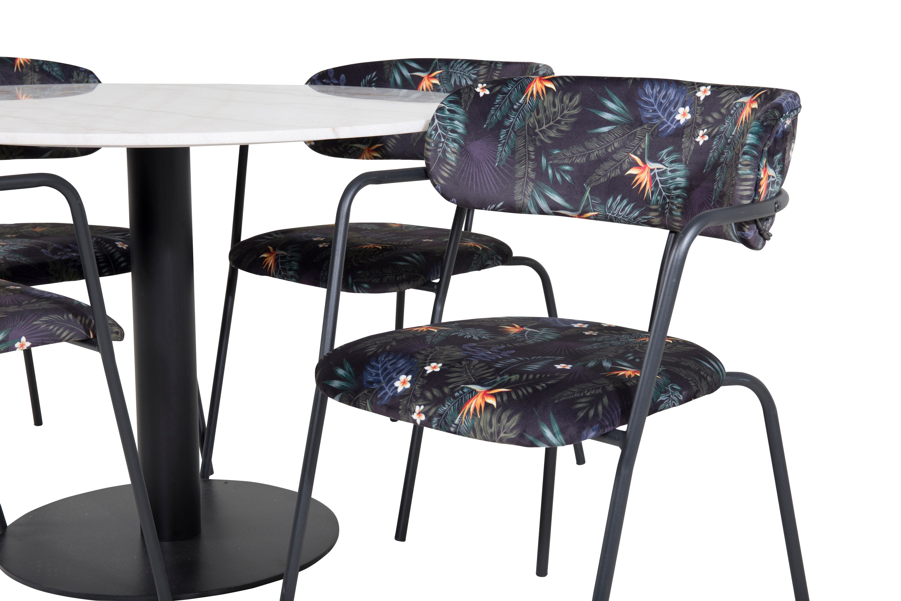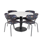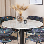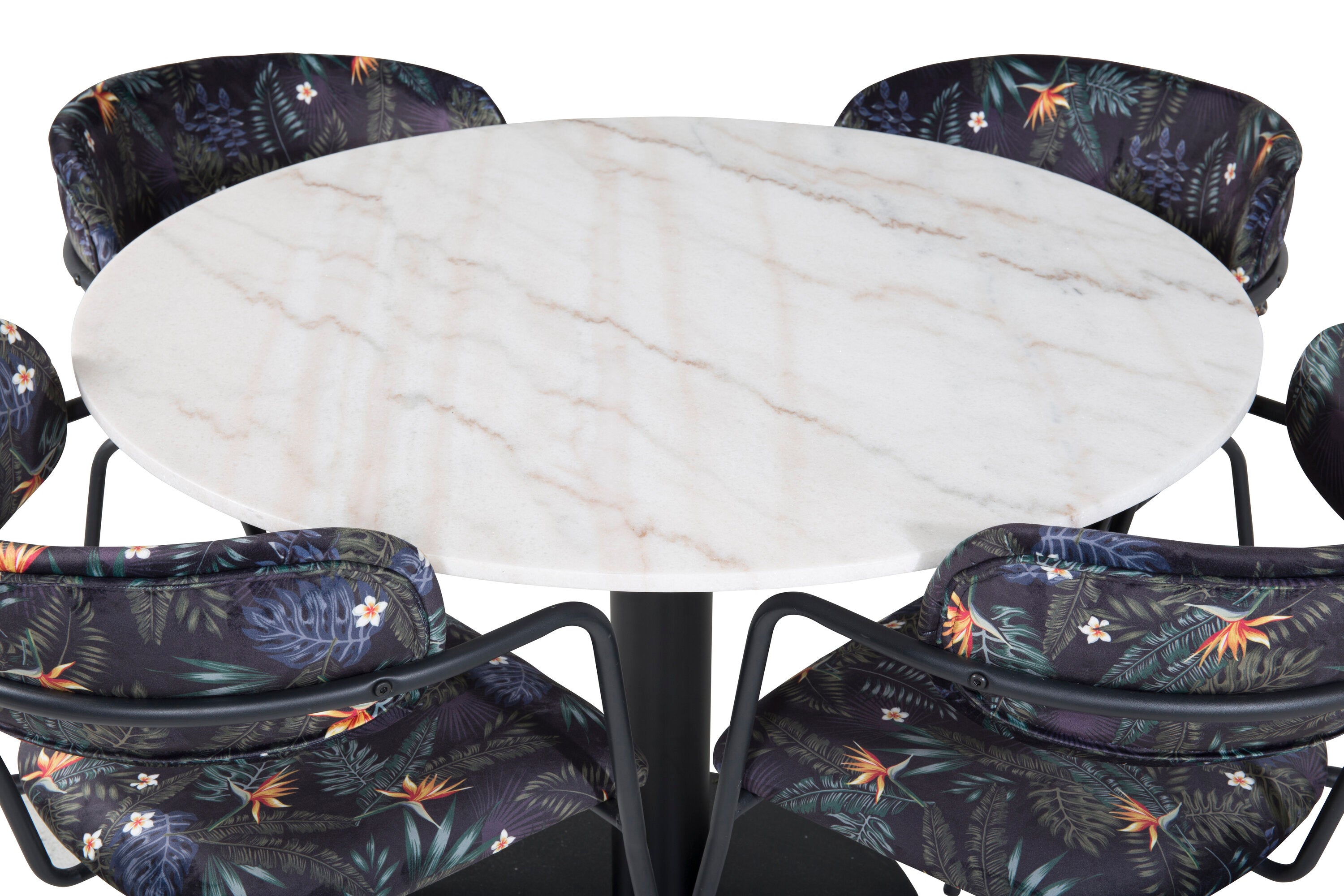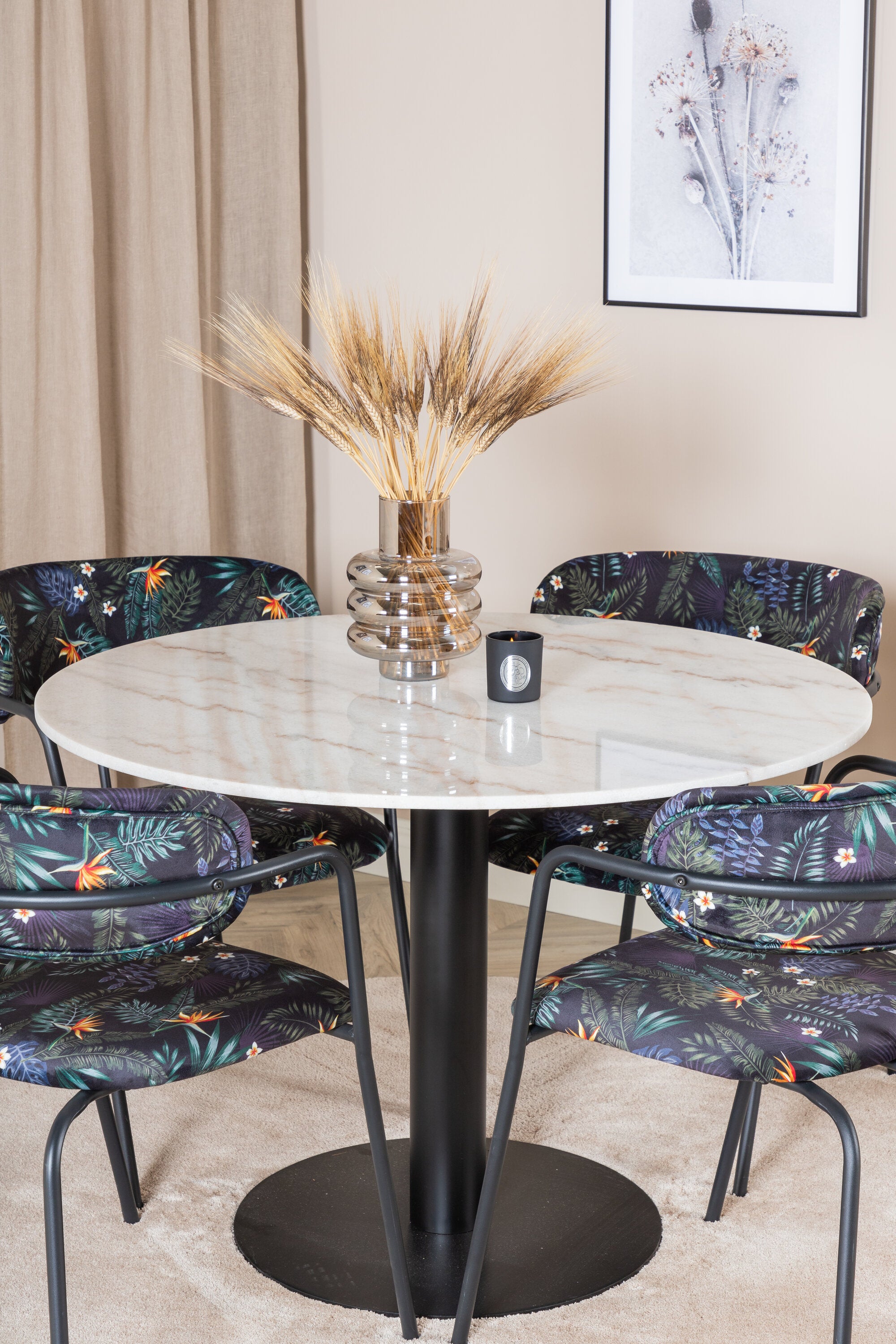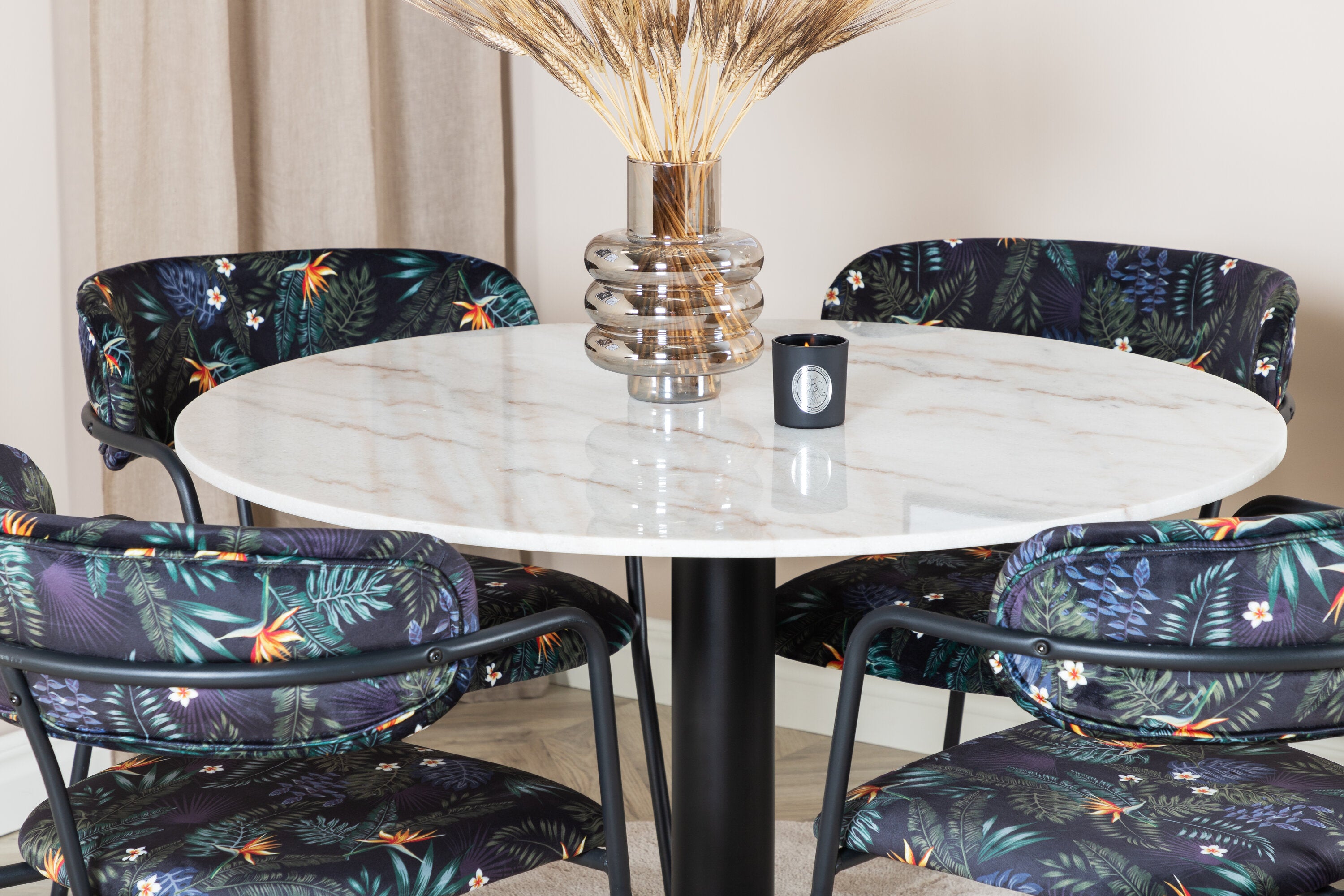 Jídelní stůl Estelle v krásném mramoru spolu s pohodlnými jídelními židlemi s černým květinovým vzorem ze série Arrow - perfektní kombinace pro ty, kteří chtějí trendy skupinu jídel!