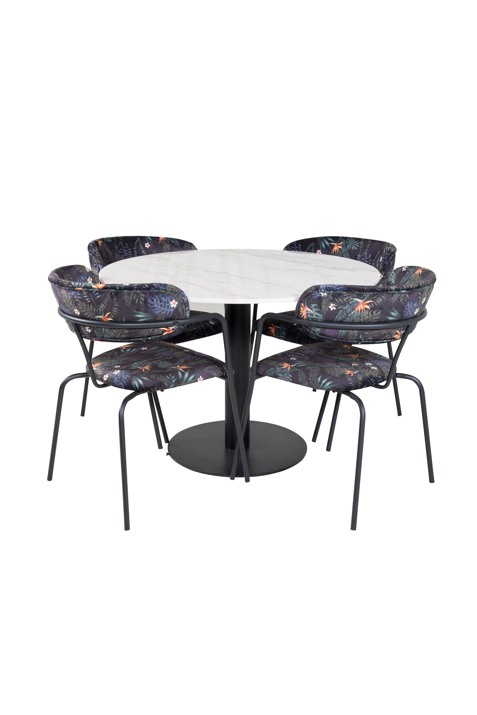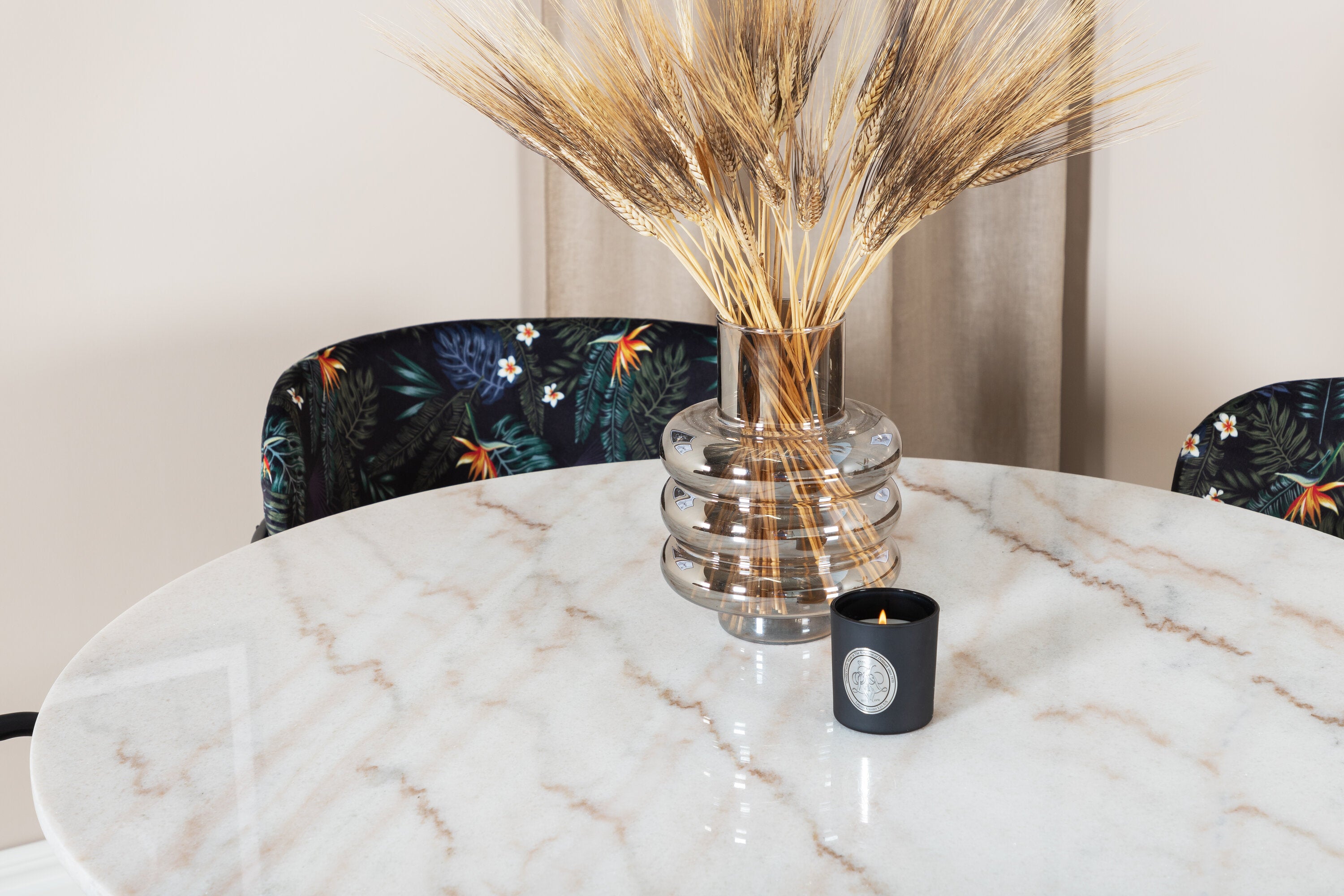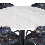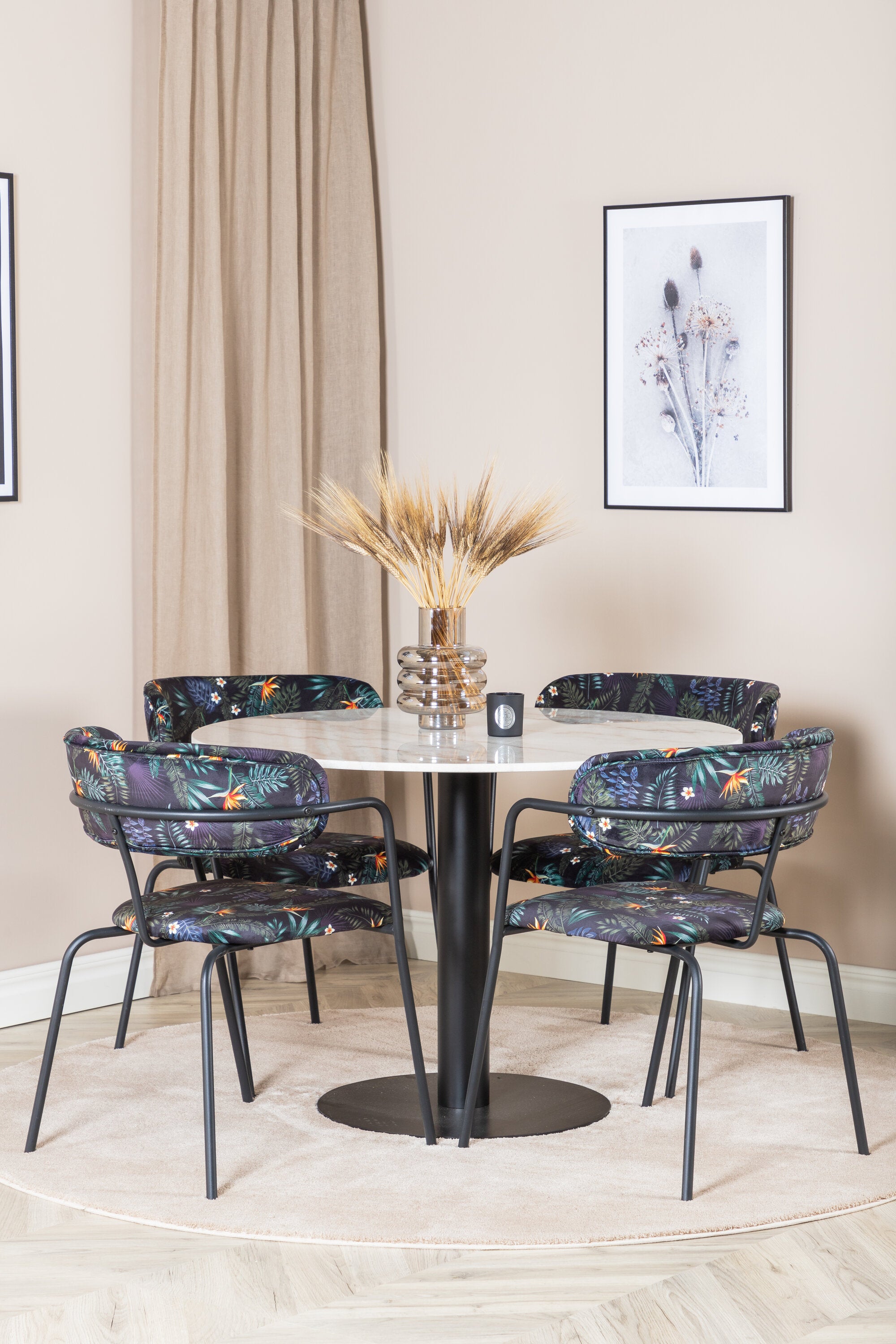 Jídelní stůl Estelle v krásném mramoru spolu s pohodlnými jídelními židlemi s černým květinovým vzorem ze série Arrow - perfektní kombinace pro ty, kteří chtějí trendy skupinu jídel!