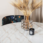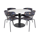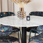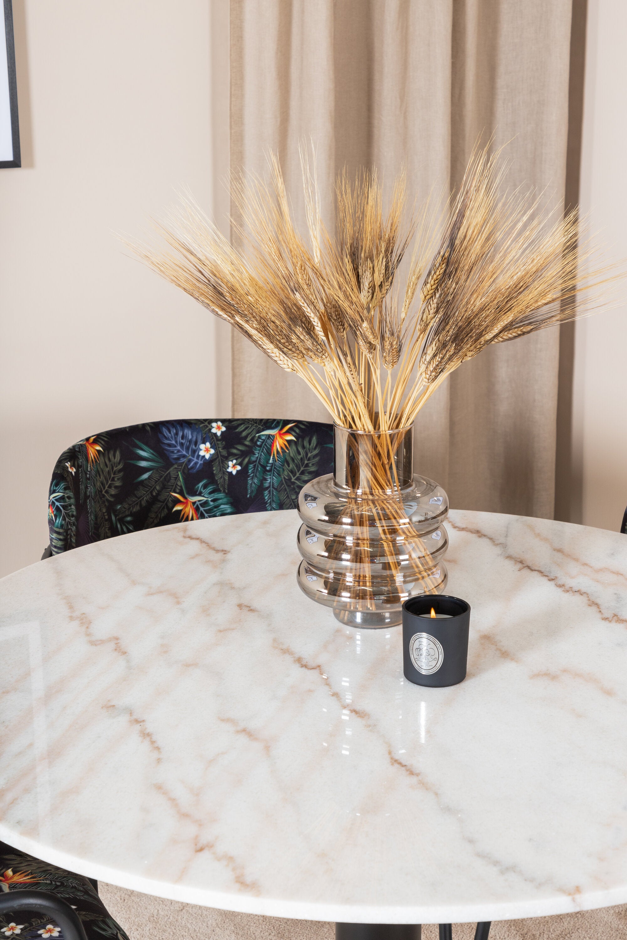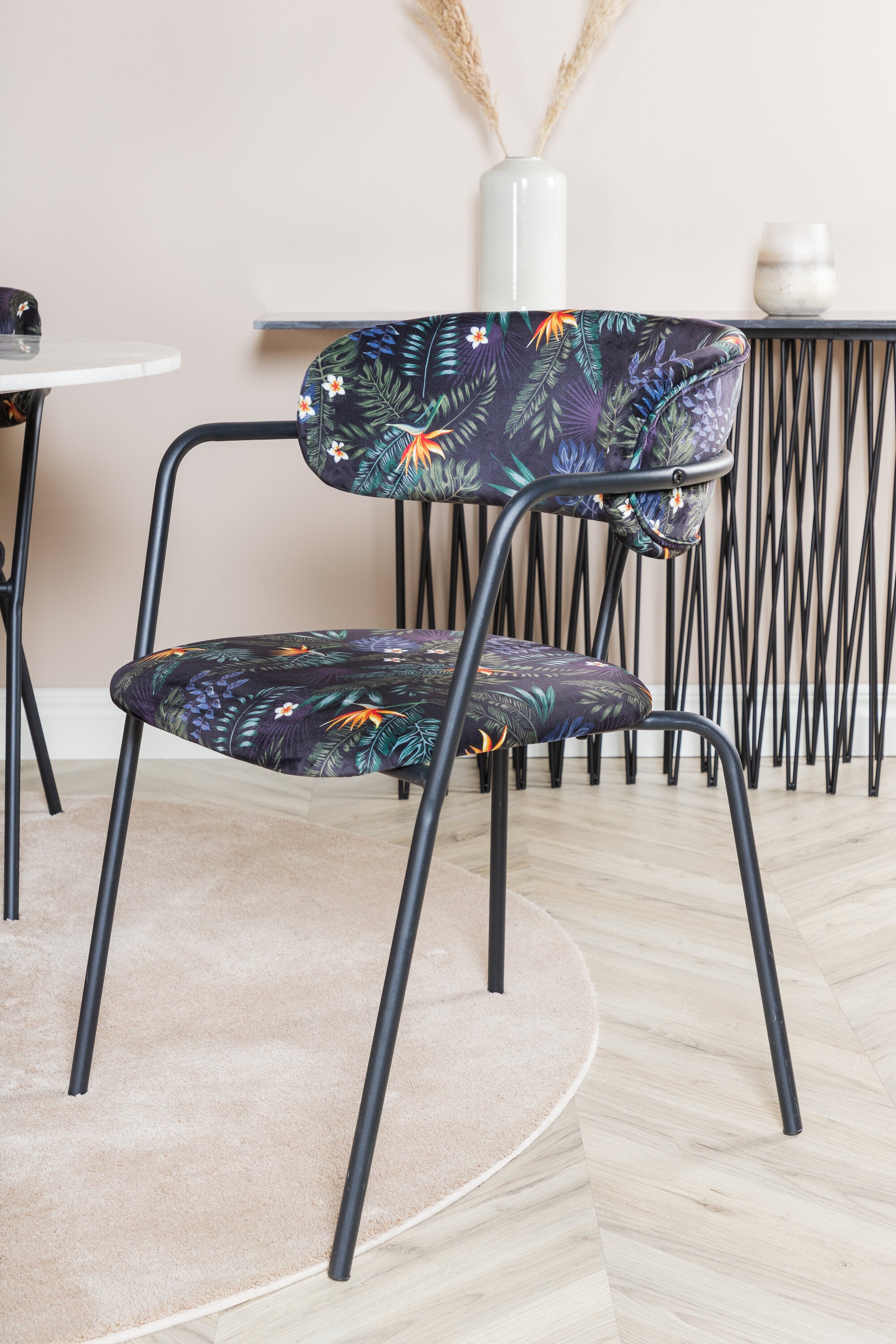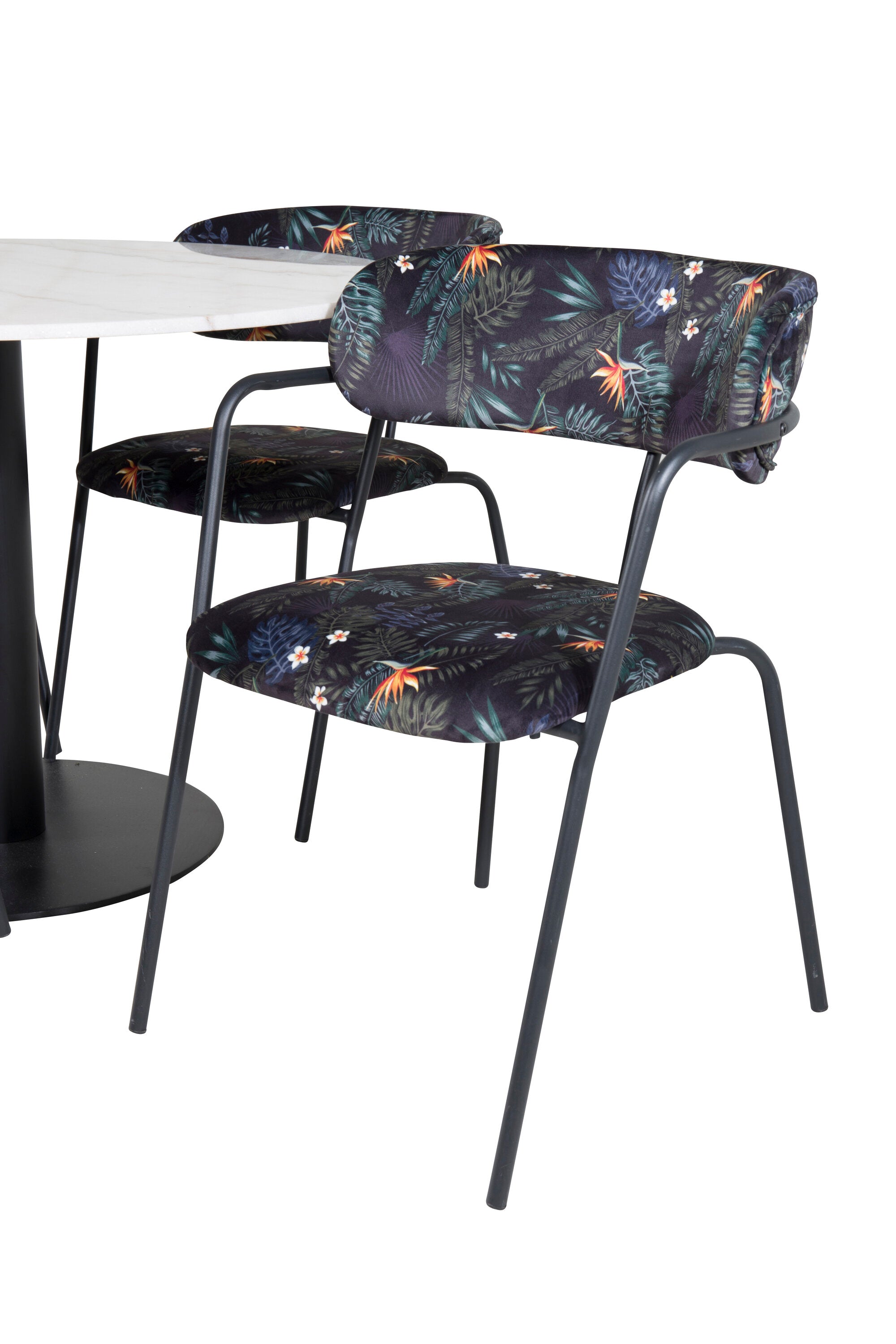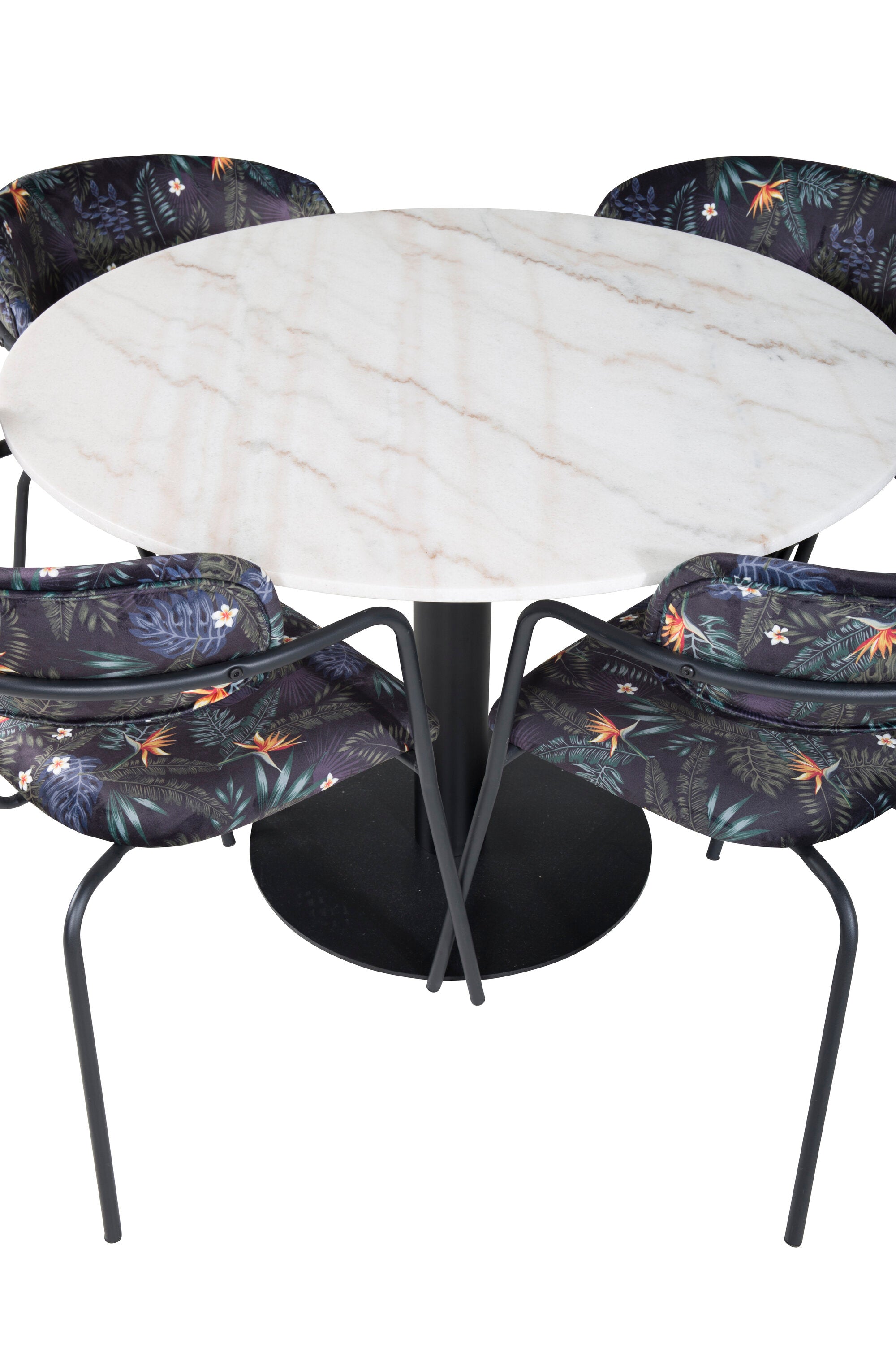 Jídelní stůl Estelle v krásném mramoru spolu s pohodlnými jídelními židlemi s černým květinovým vzorem ze série Arrow - perfektní kombinace pro ty, kteří chtějí trendy skupinu jídel!