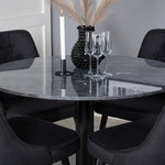 Jídelní stůl Estelle s deskou z krásného mramoru spolu s krásnými židlemi ze série Velvet. Židle jsou robustní a dobře rostlé - zde můžete dlouho sedět a užívat si společnost dobrých přátel!