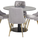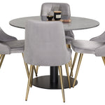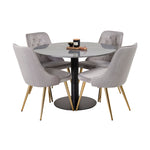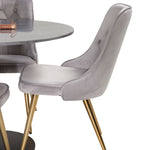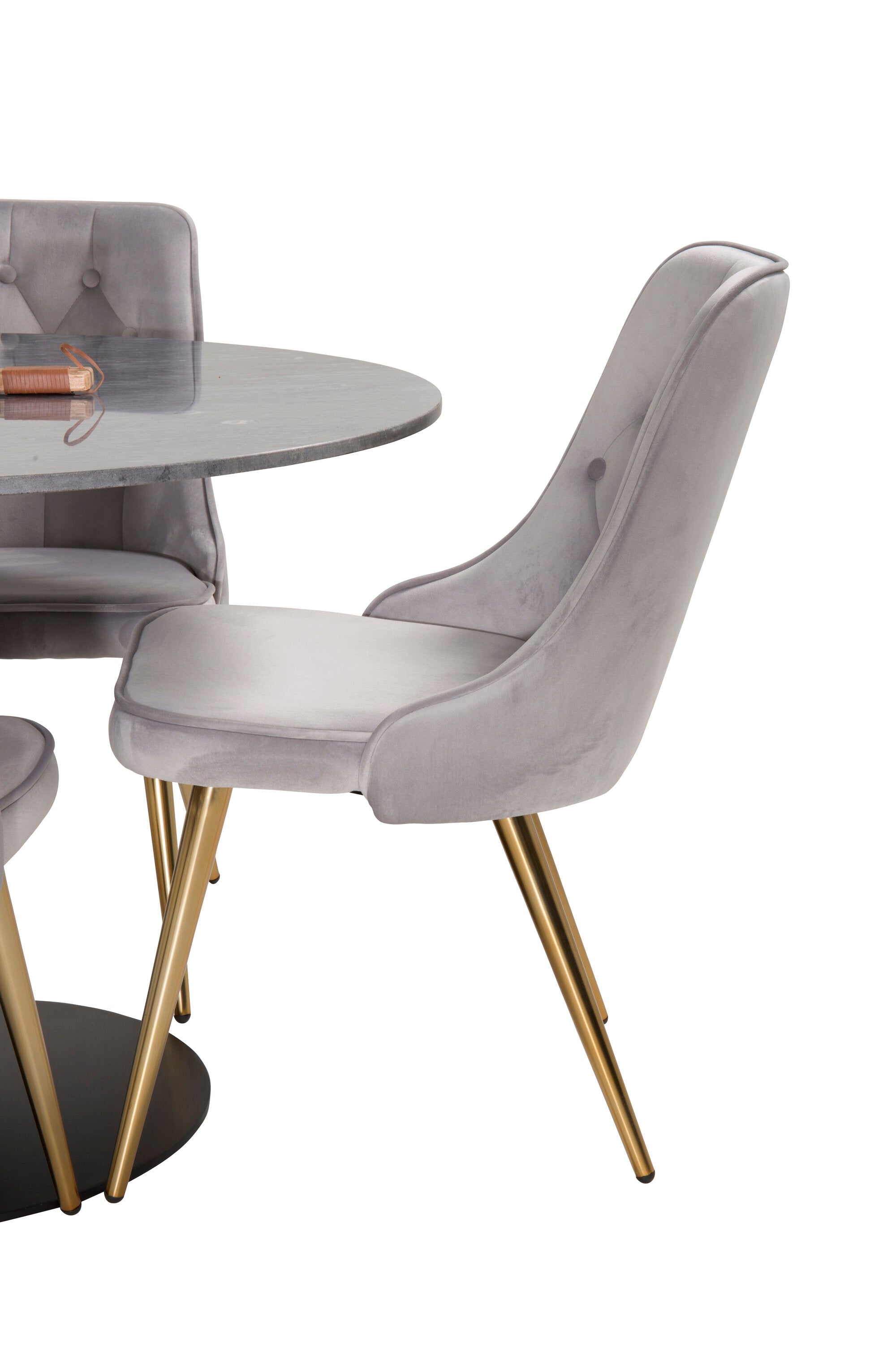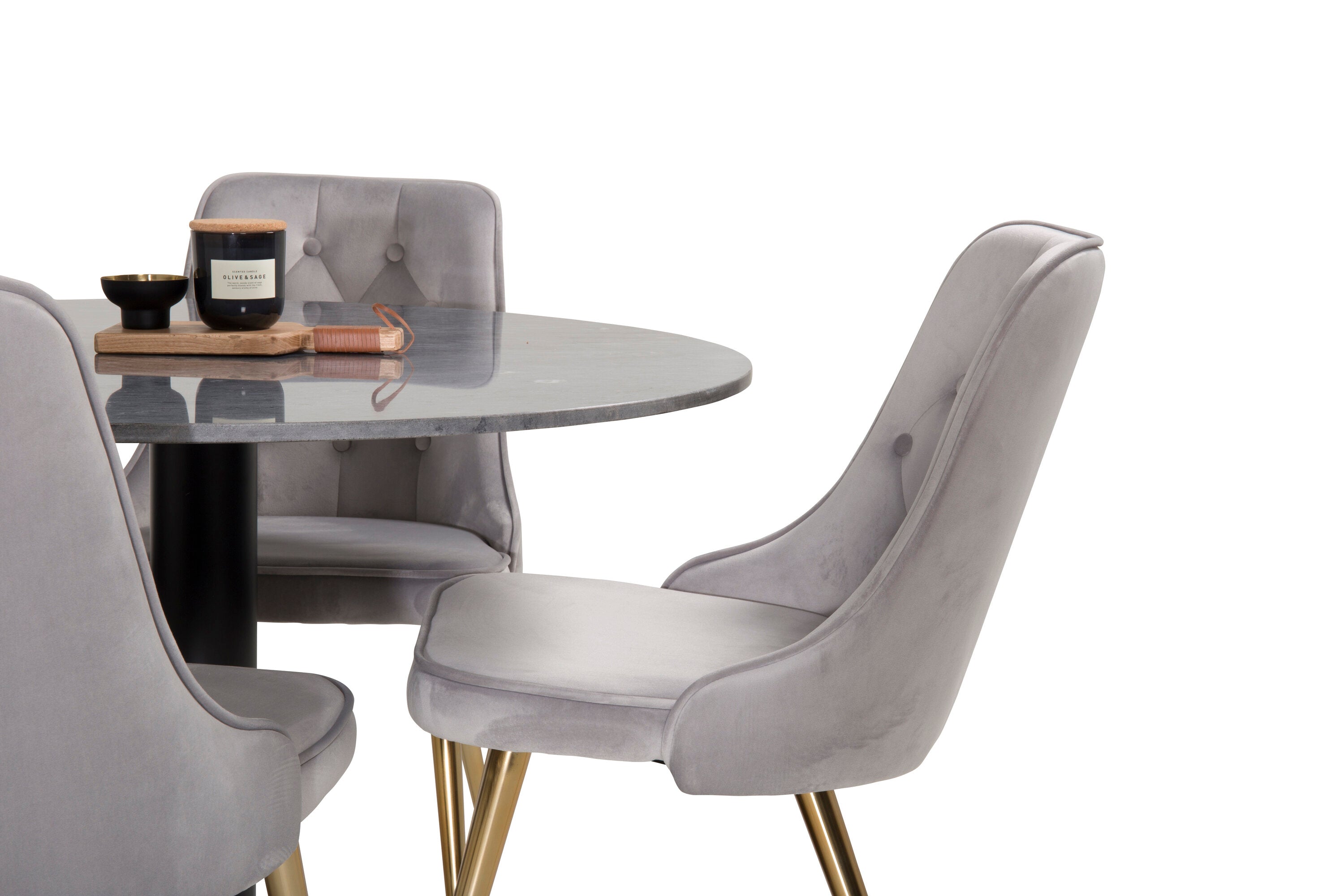 Jídelní stůl Estelle ve štíhlém designu spolu s šedými jídelními židlemi Velvet - perfektní kombinace pro ty, kteří chtějí trendy skupinu jídel. Vysoký komfort sezení křesel zve k dlouhým a úžasným chvilkám společenského života!