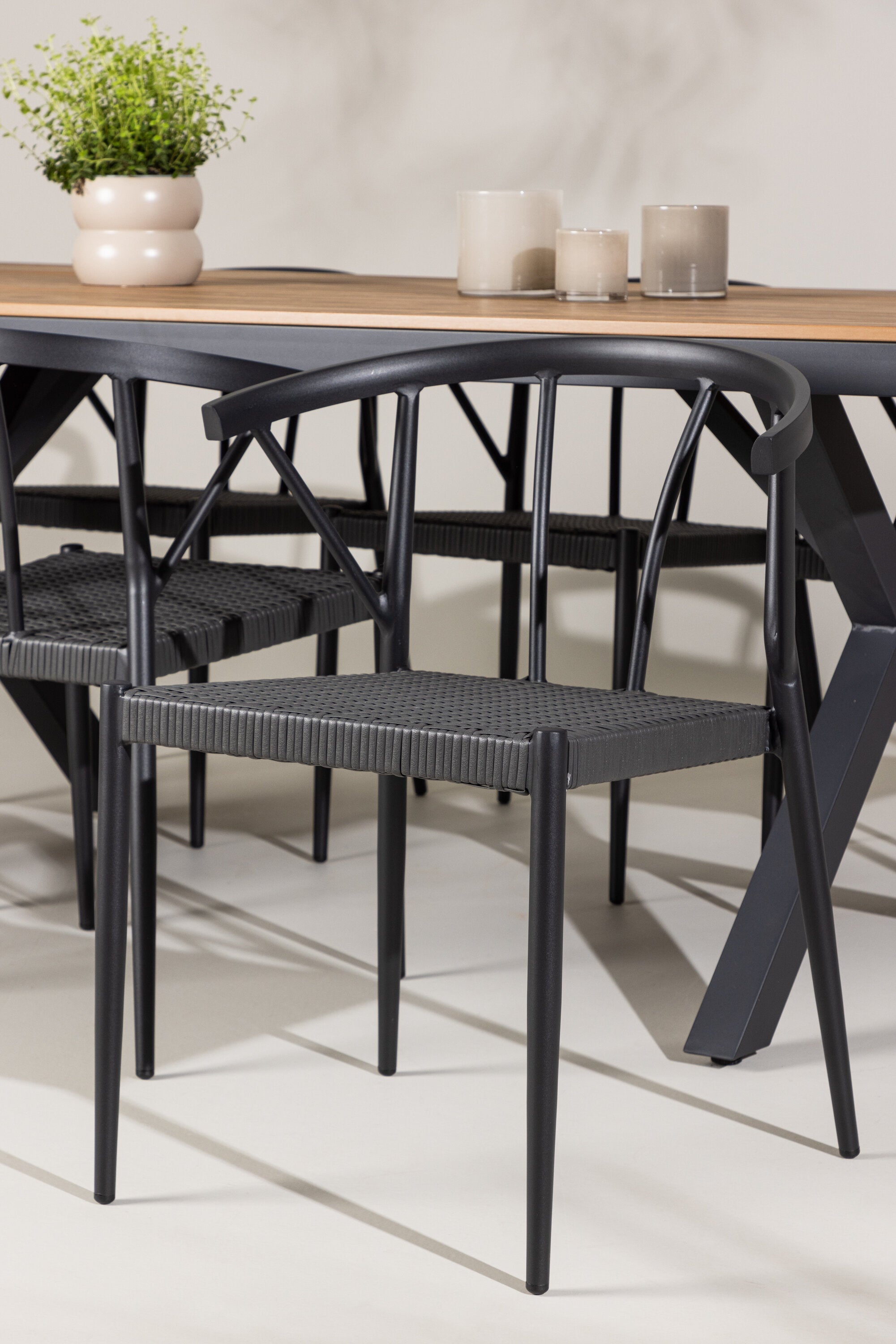 Židle pojmenované Stina jsou perfektním doplňkem ke stolu Garcia. Tyto židle vyrobené z odolného proutěného materiálu v sofistikovaném černém odstínu nabízejí pohodlí i styl. Se šesti židlemi, které jsou součástí sady, můžete snadno přivítat rodinu a přátele na příjemné venkovní večeře a setkání.