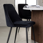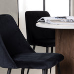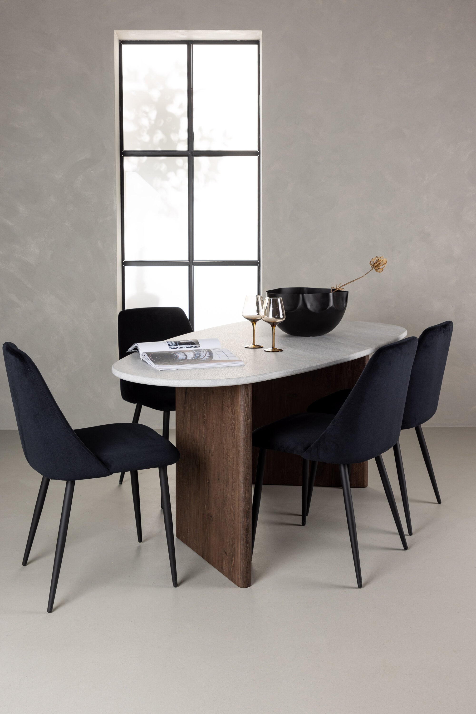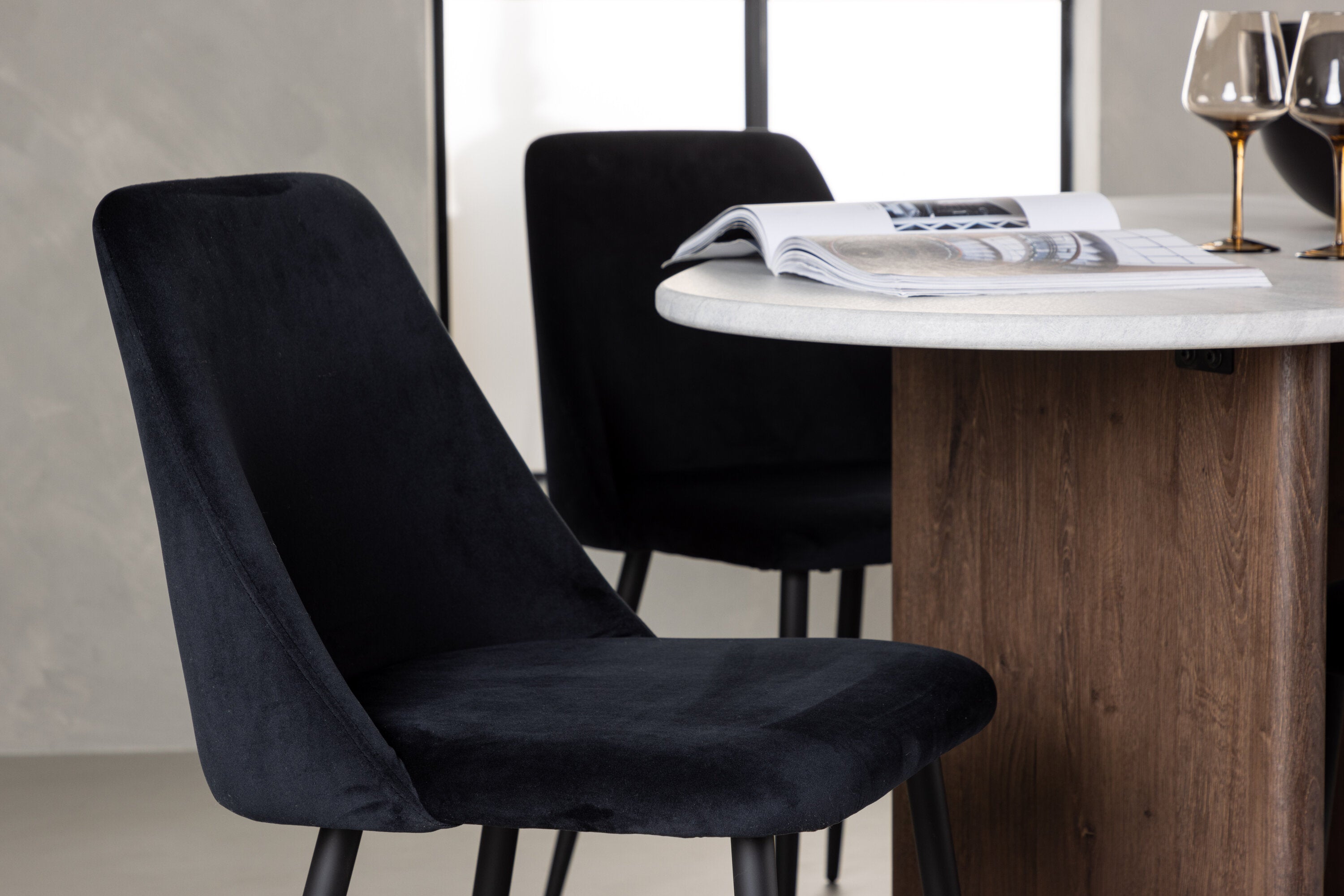 Zde jsme jídelní stůl spárovali s černými jídelními židlemi ze série Night. Se svými plně čalouněnými sedadly z černé sametové látky a odpovídajícími černými nohami židle dodává Night do vašeho obývacího pokoje pocit luxusu a exkluzivity. Každé jídlo se stane oslavou!