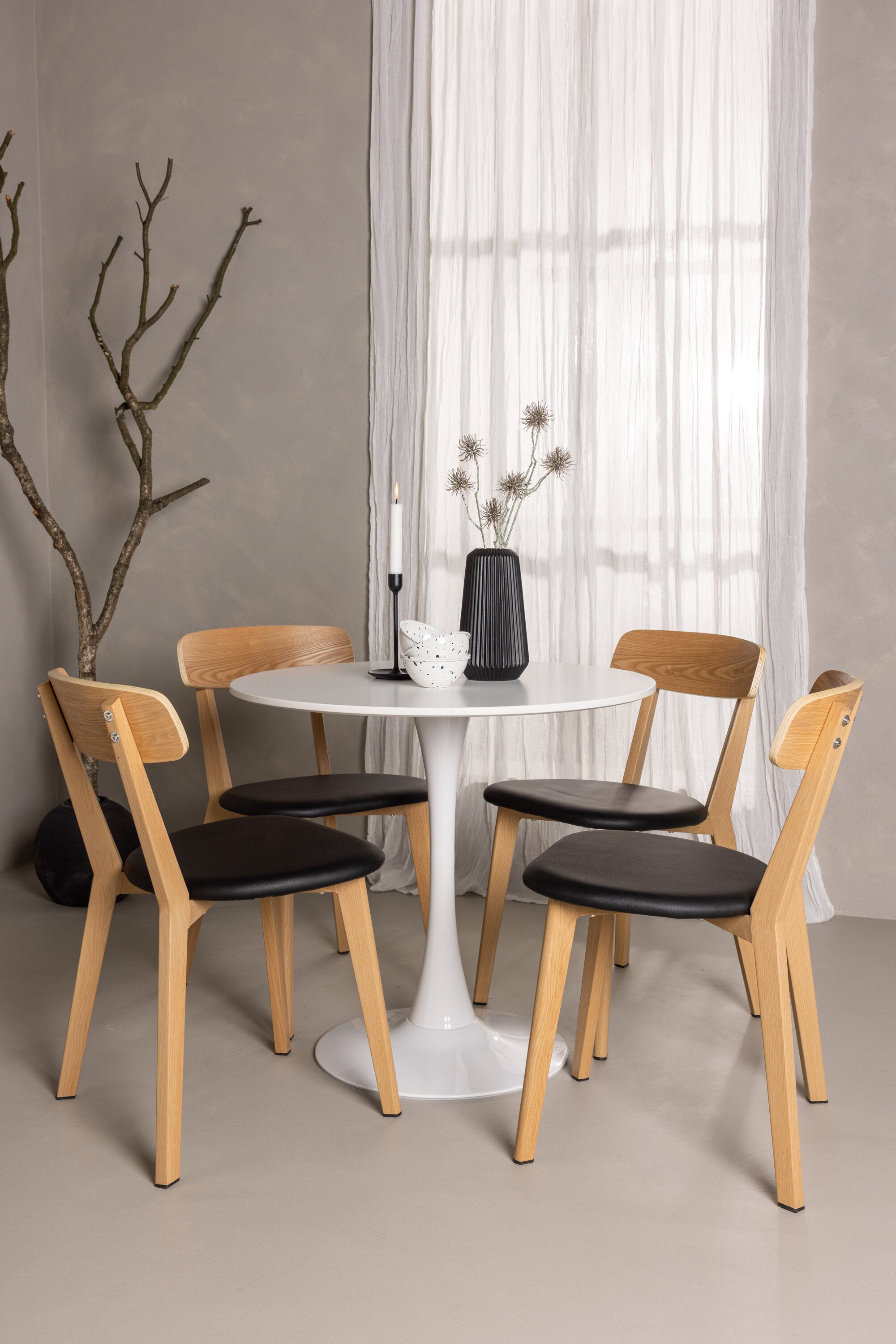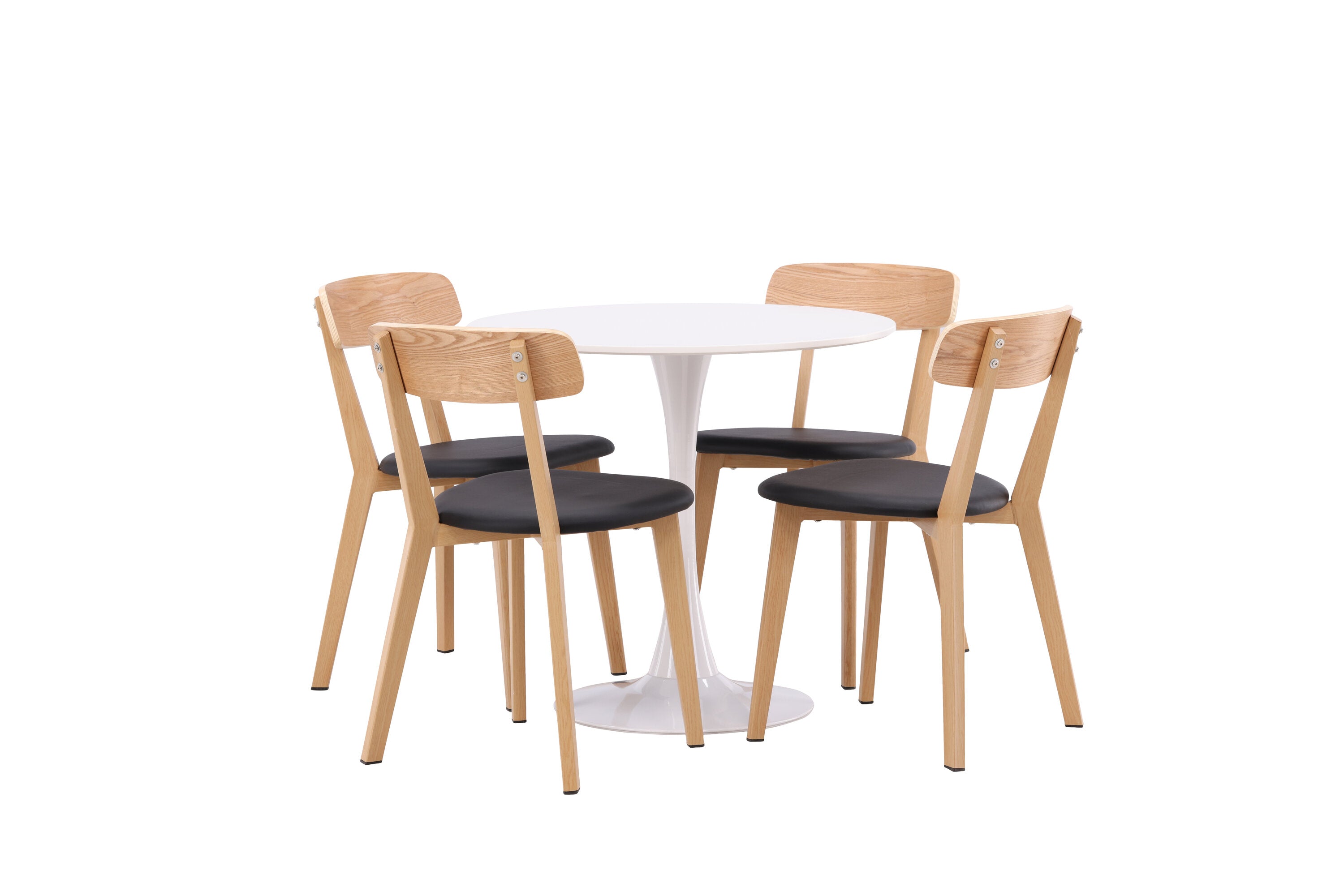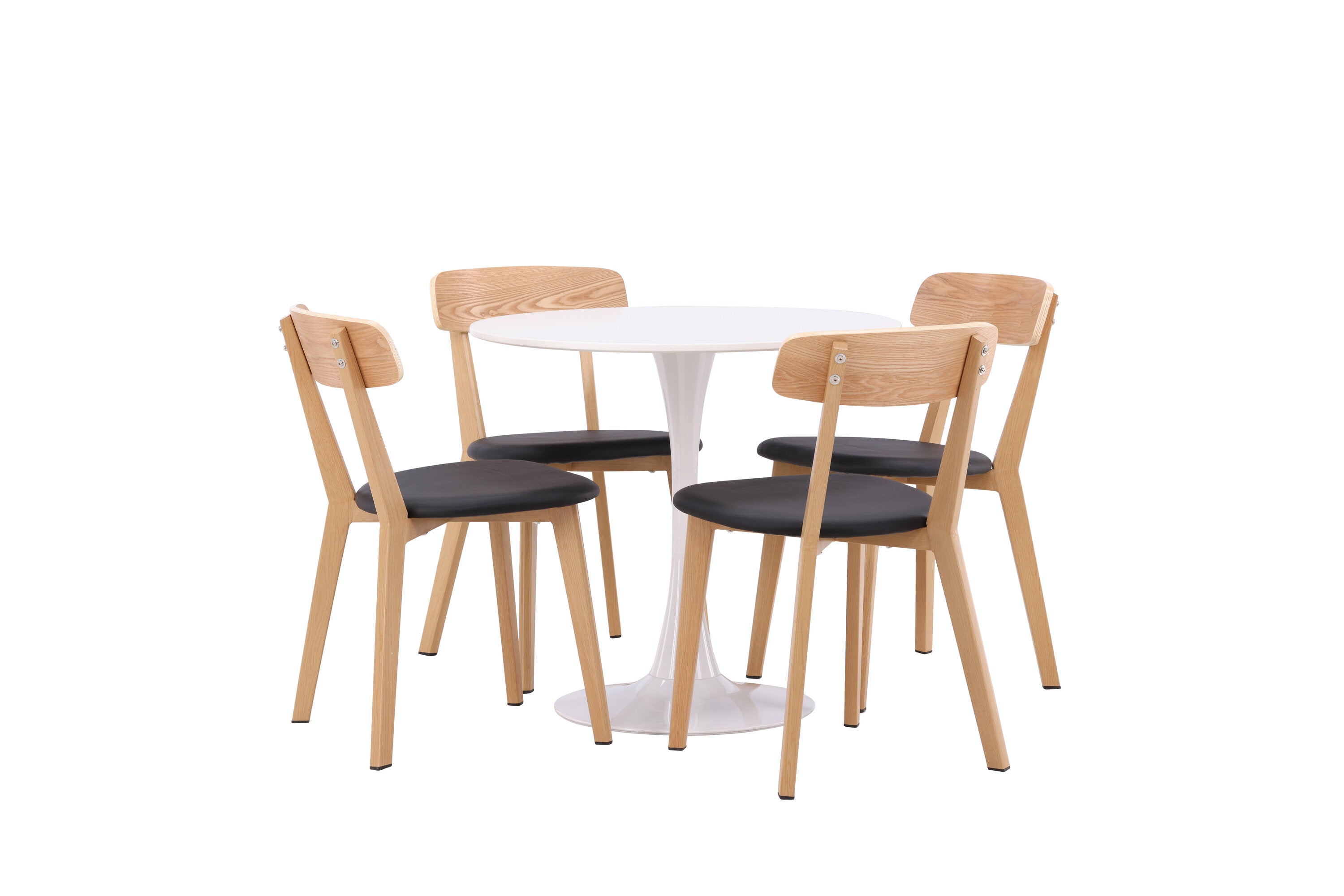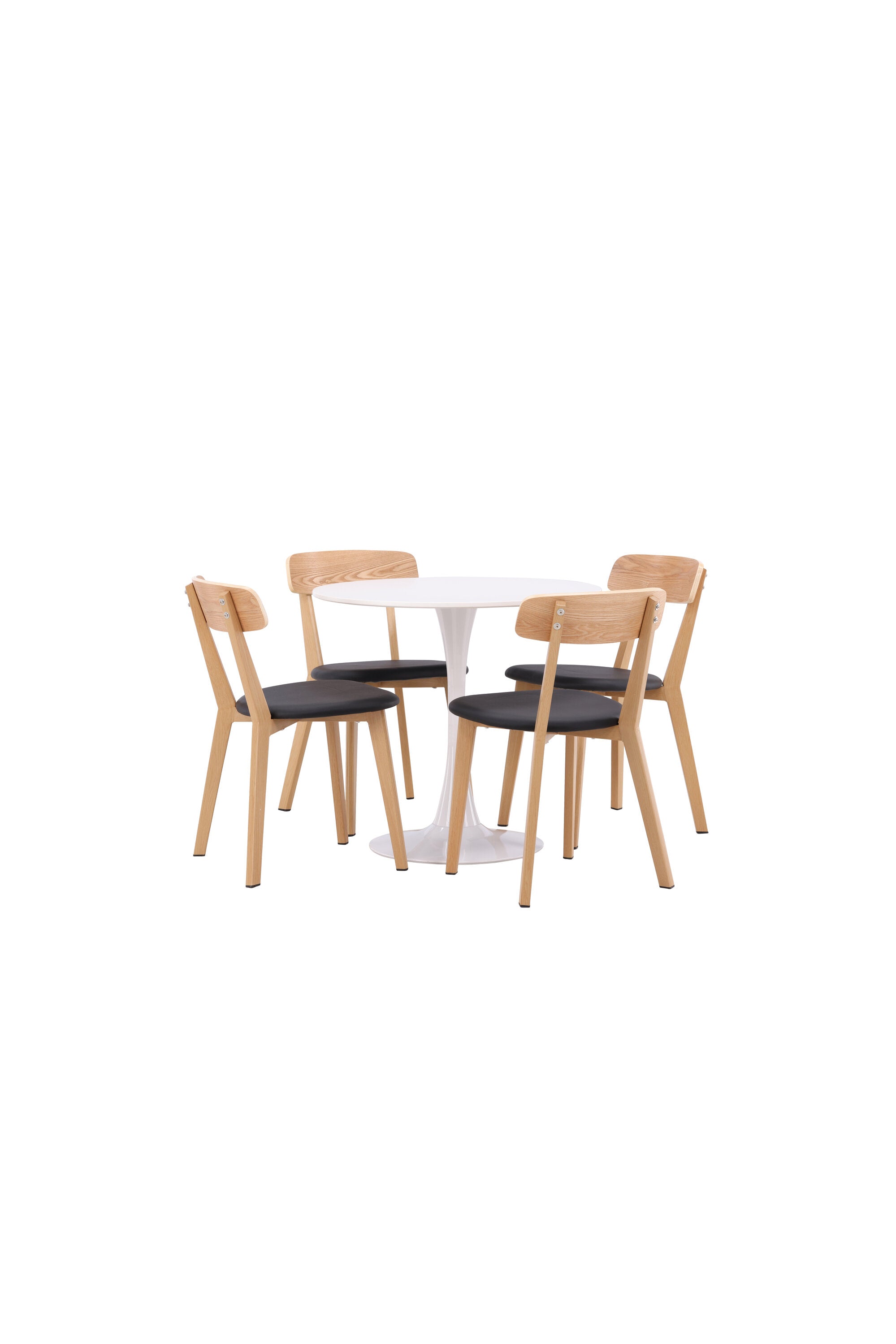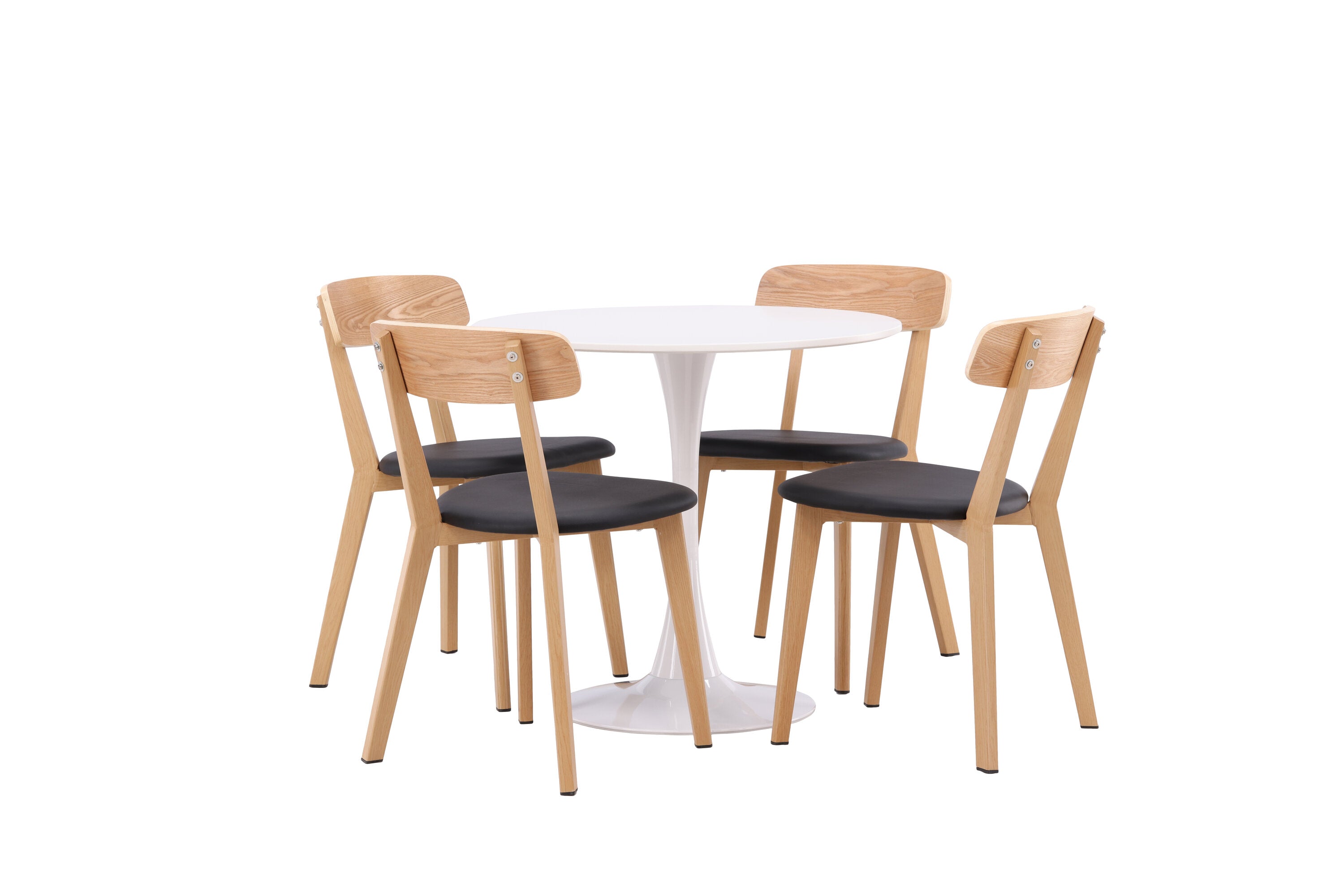 Stůl Hamden stojí ve výšce 75 cm a má průměr 80 ​​cm, díky čemuž je kompaktní a všestranný. Bílá stolní deska poskytuje pocit lehkosti a svěžesti, zatímco židle Sanjos s rámem v přírodní barvě a černým sedákem nabízejí silný kontrast a přispívají k nadčasovému stylu.
