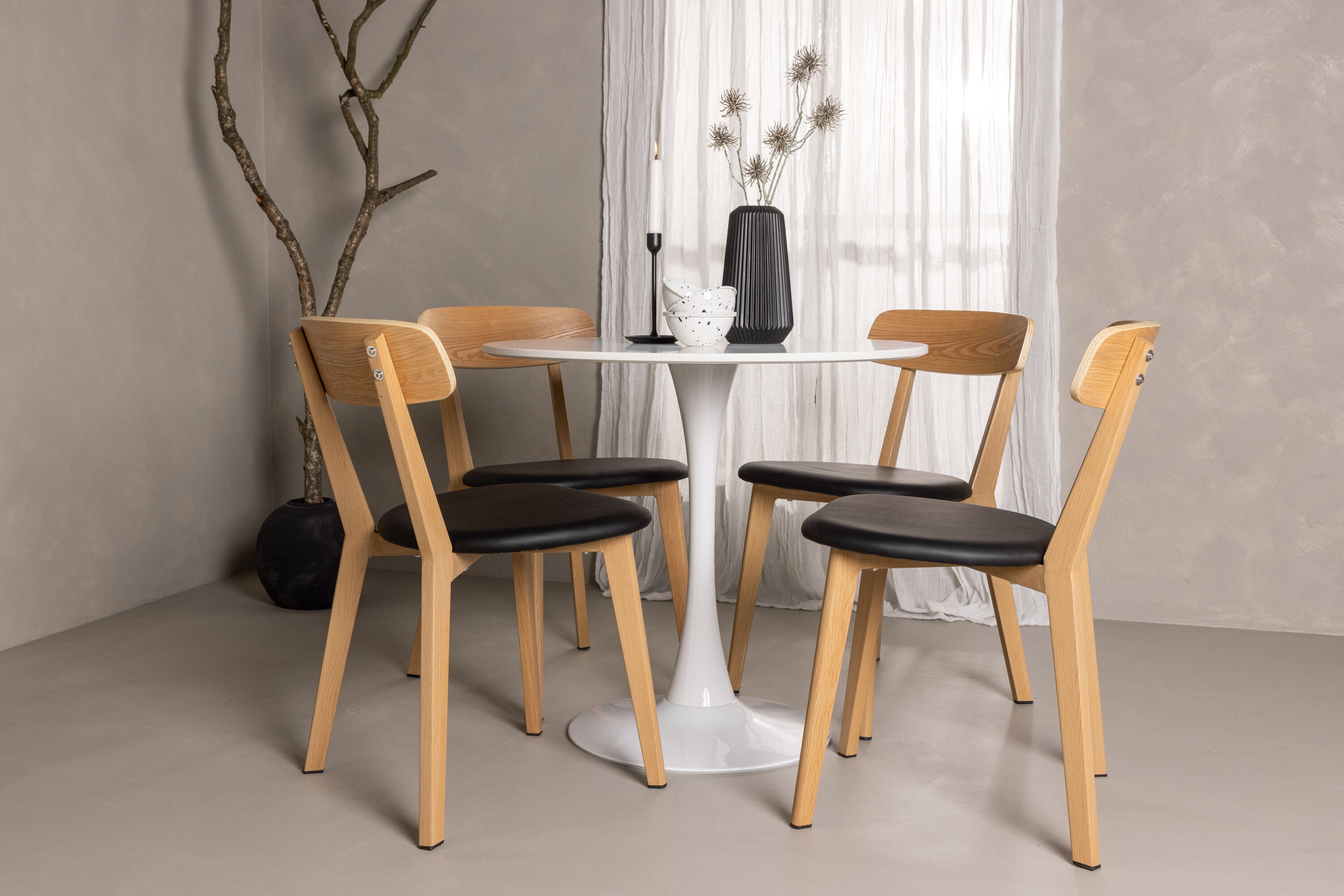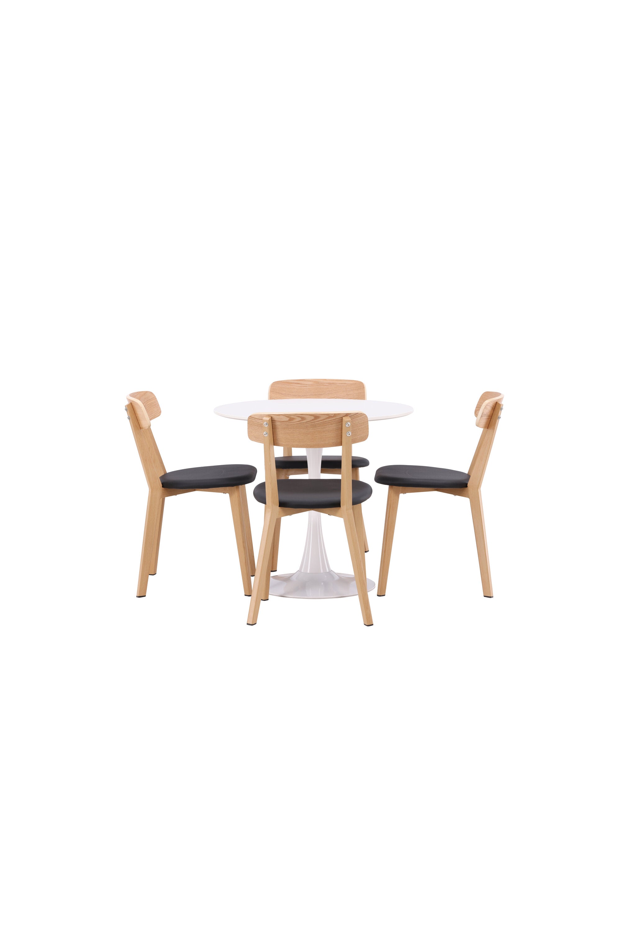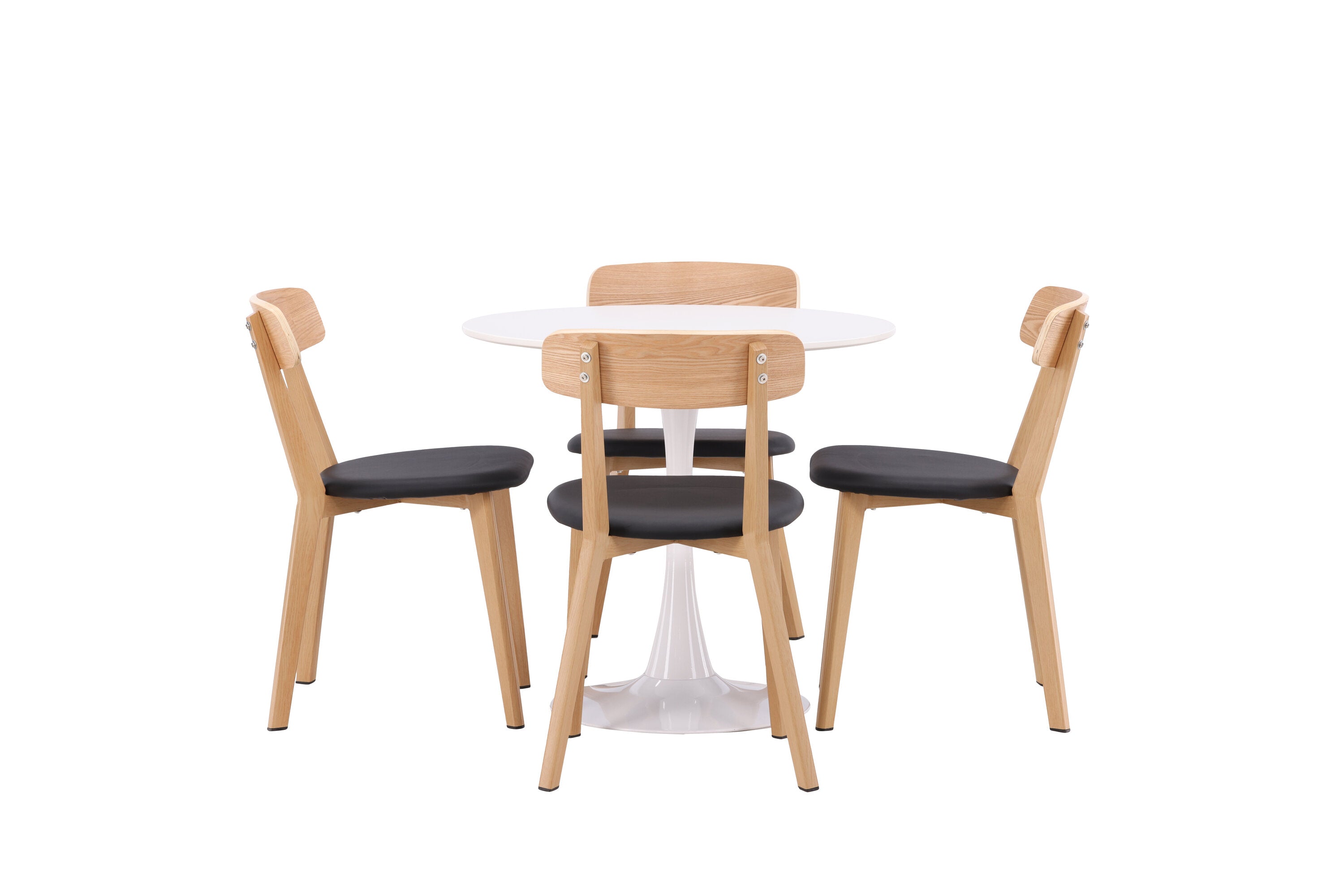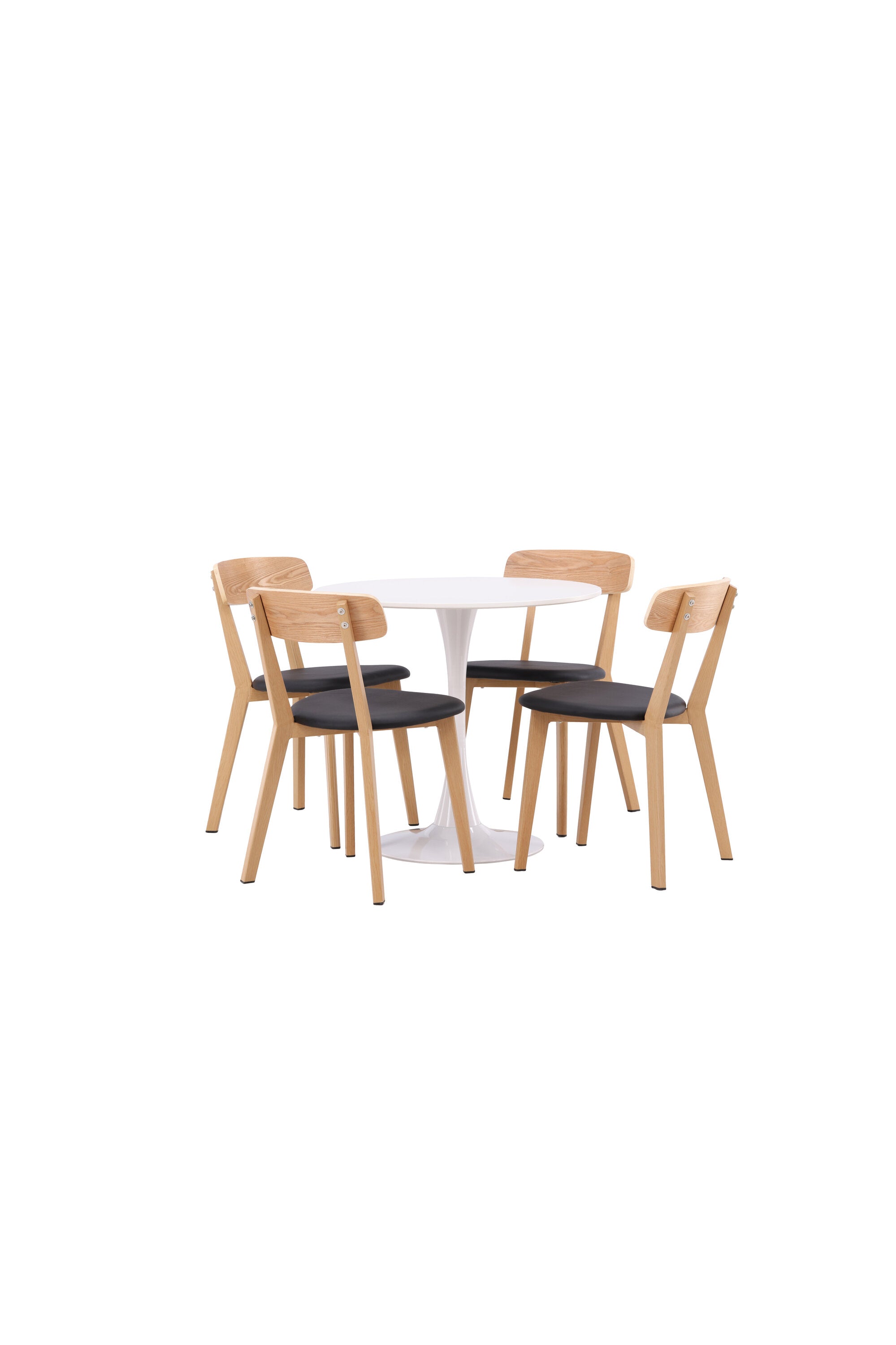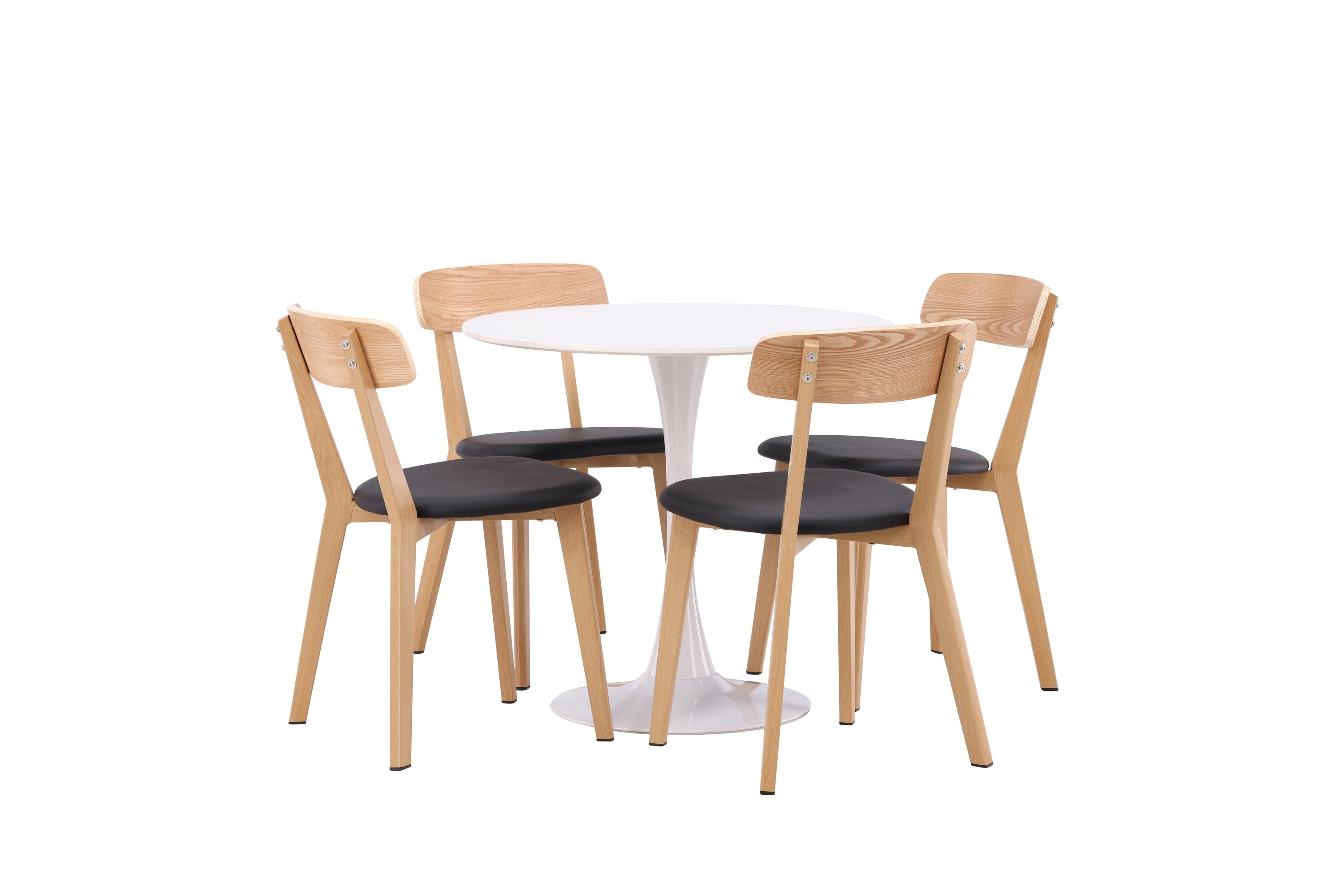 Stůl Hamden stojí ve výšce 75 cm a má průměr 80 ​​cm, díky čemuž je kompaktní a všestranný. Bílá stolní deska poskytuje pocit lehkosti a svěžesti, zatímco židle Sanjos s rámem v přírodní barvě a černým sedákem nabízejí silný kontrast a přispívají k nadčasovému stylu.