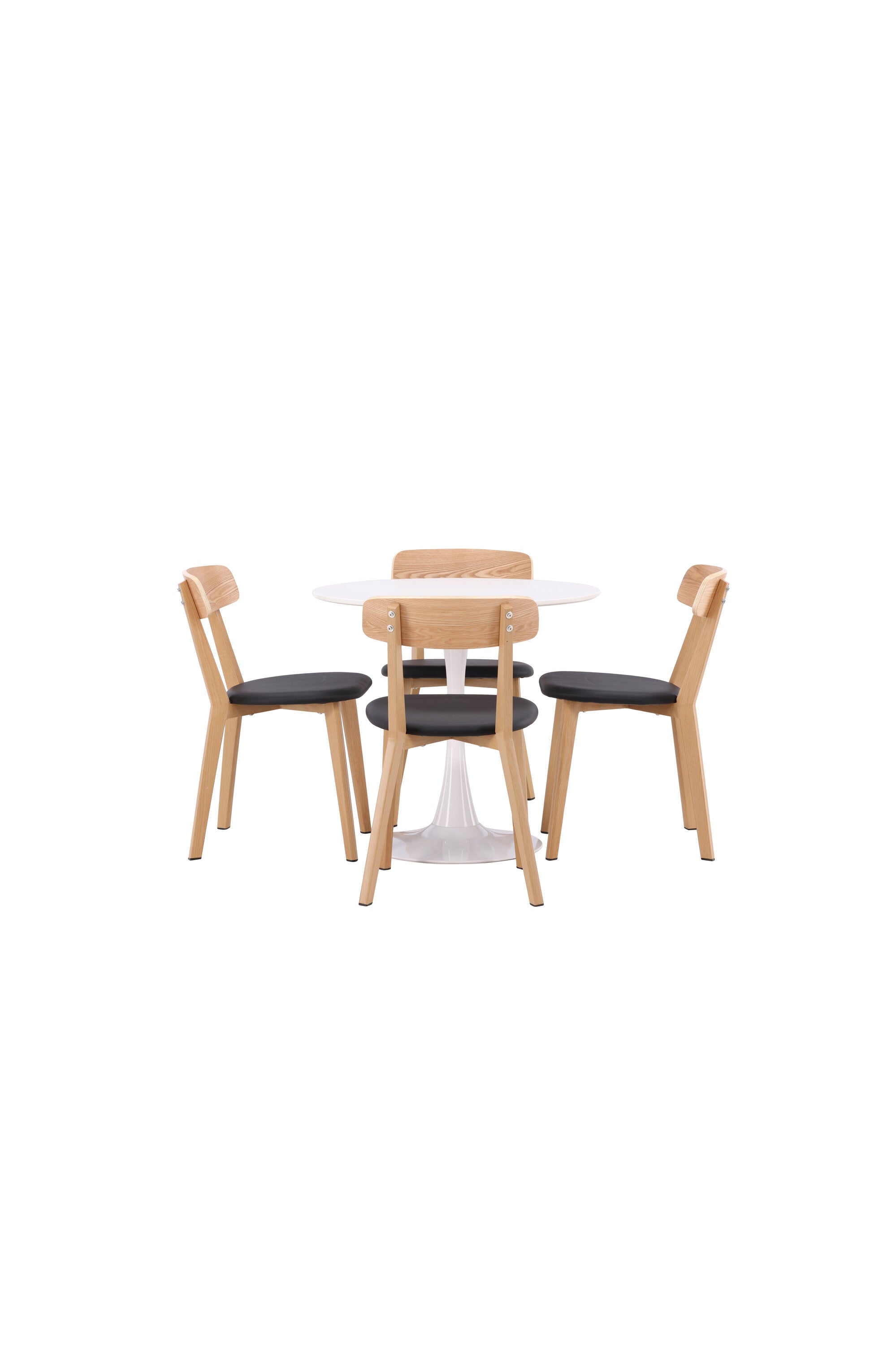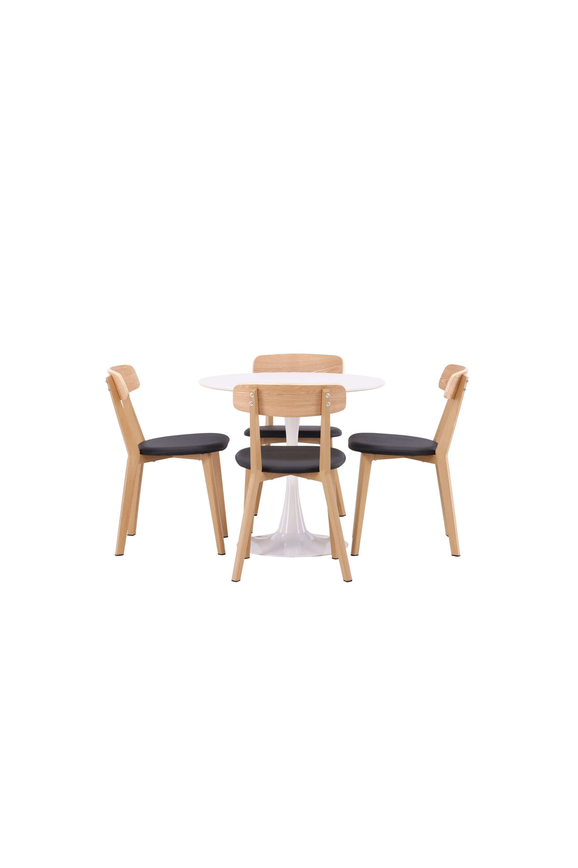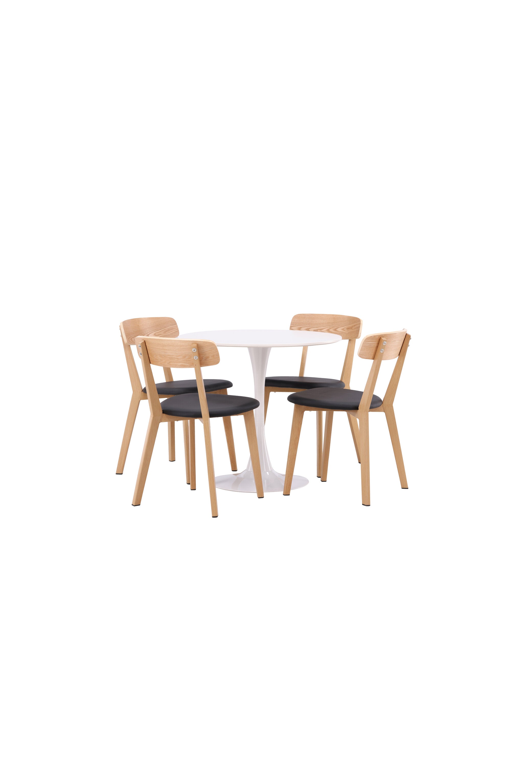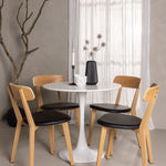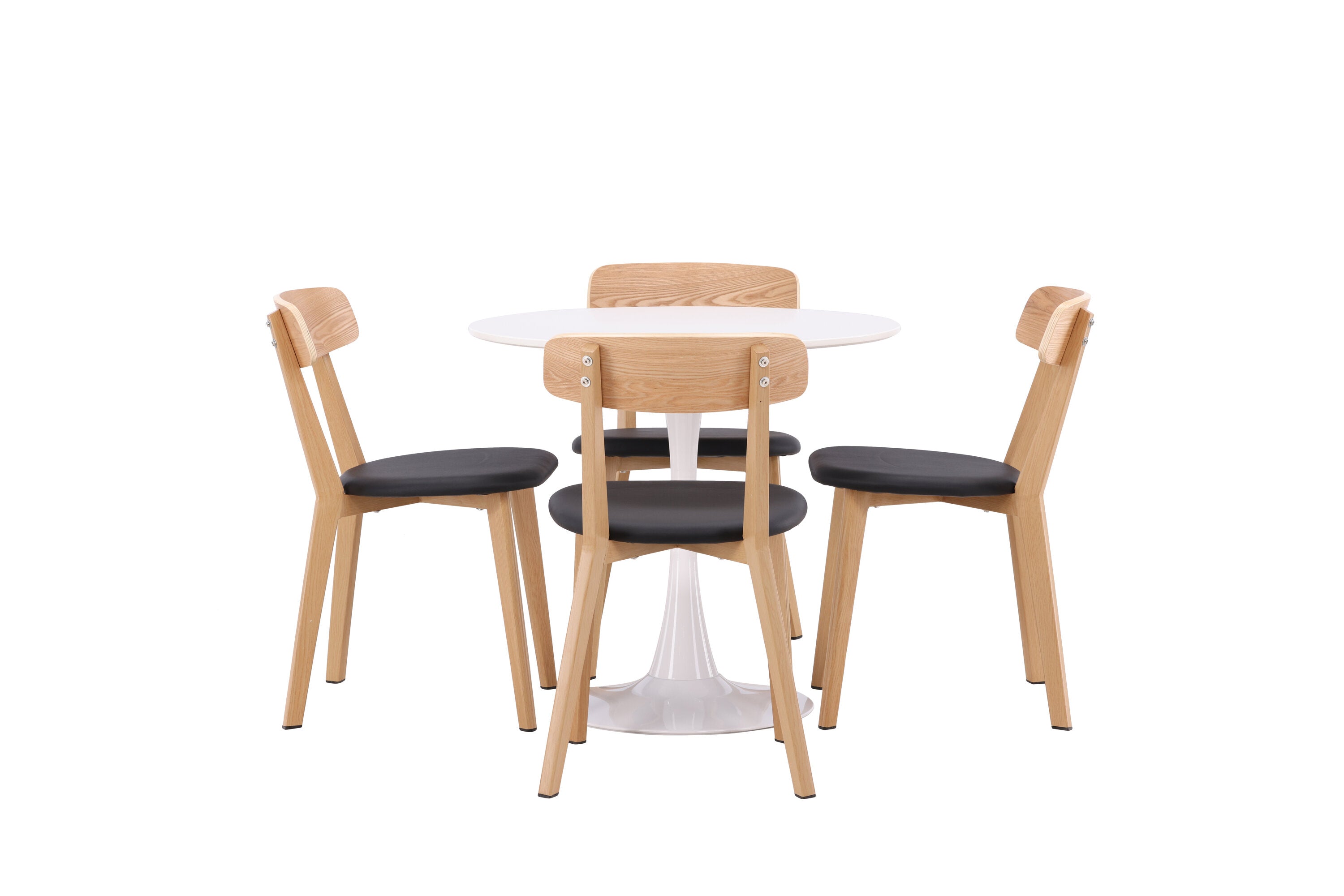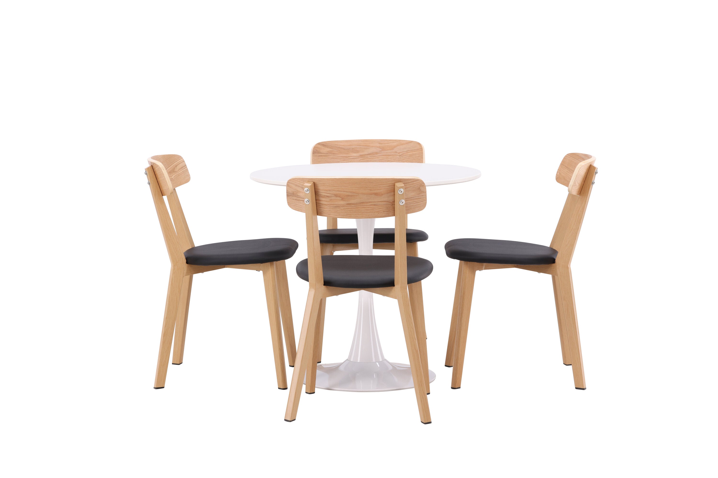 Stůl Hamden stojí ve výšce 75 cm a má průměr 80 ​​cm, díky čemuž je kompaktní a všestranný. Bílá stolní deska poskytuje pocit lehkosti a svěžesti, zatímco židle Sanjos s rámem v přírodní barvě a černým sedákem nabízejí silný kontrast a přispívají k nadčasovému stylu.