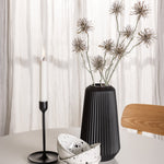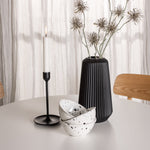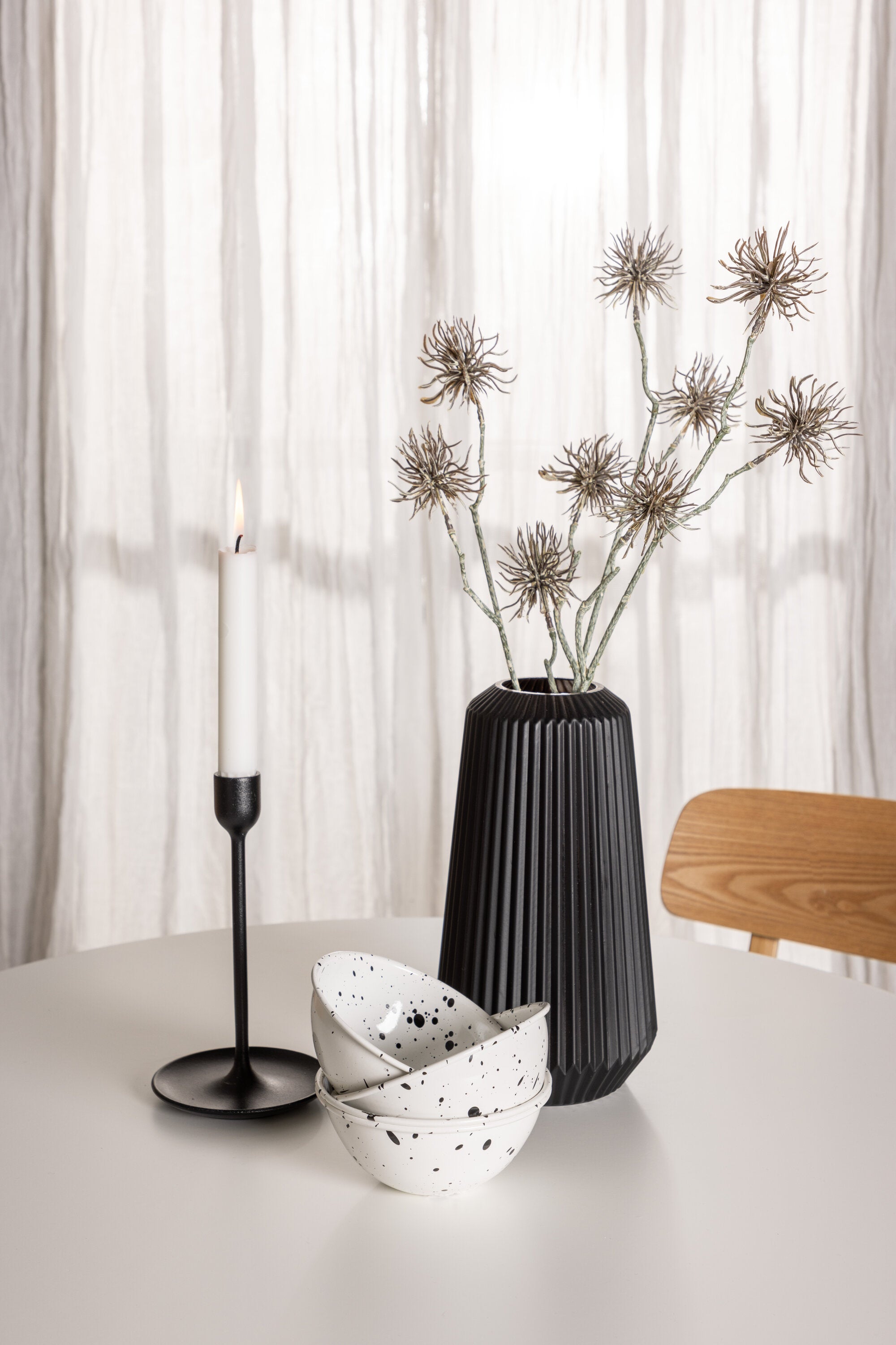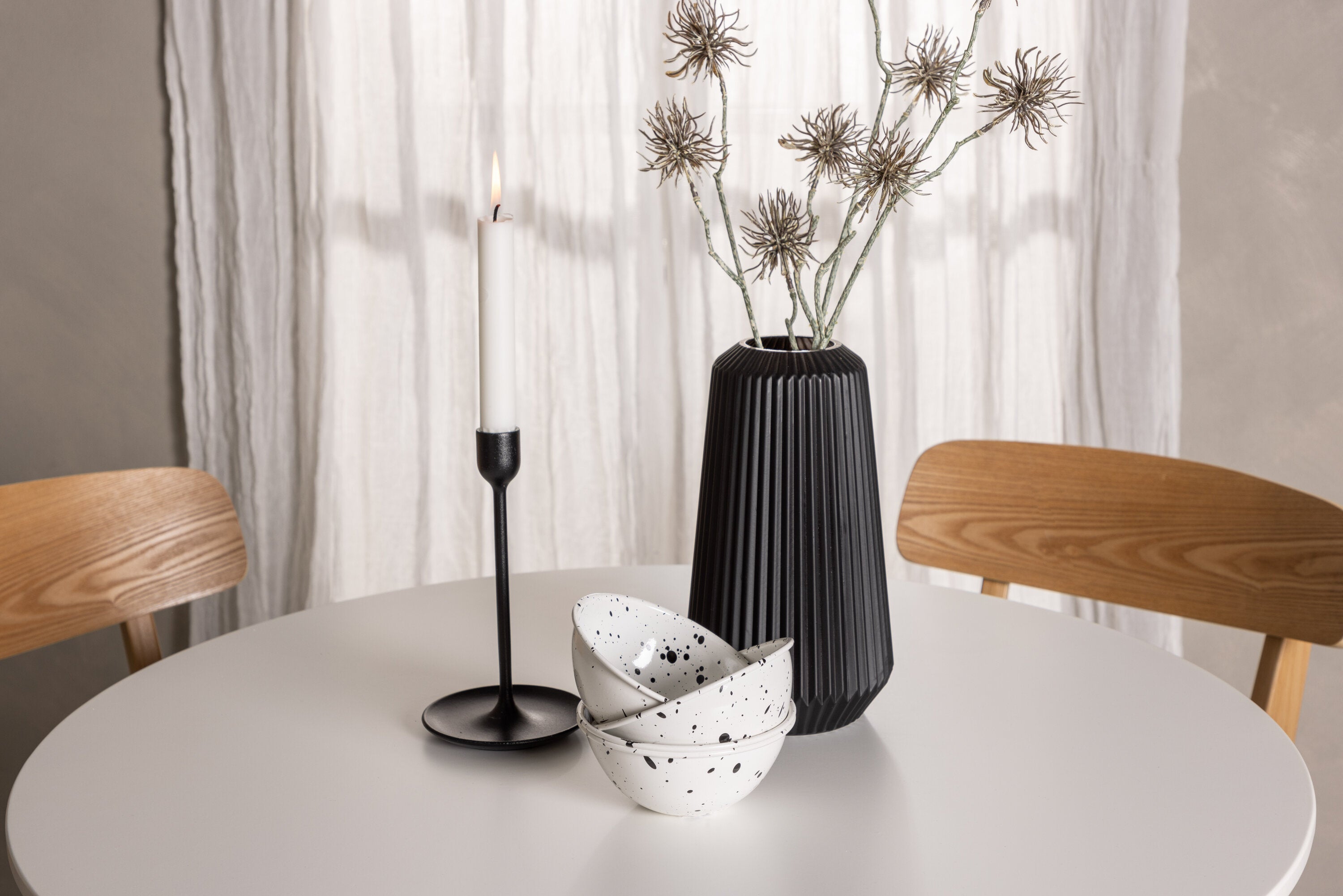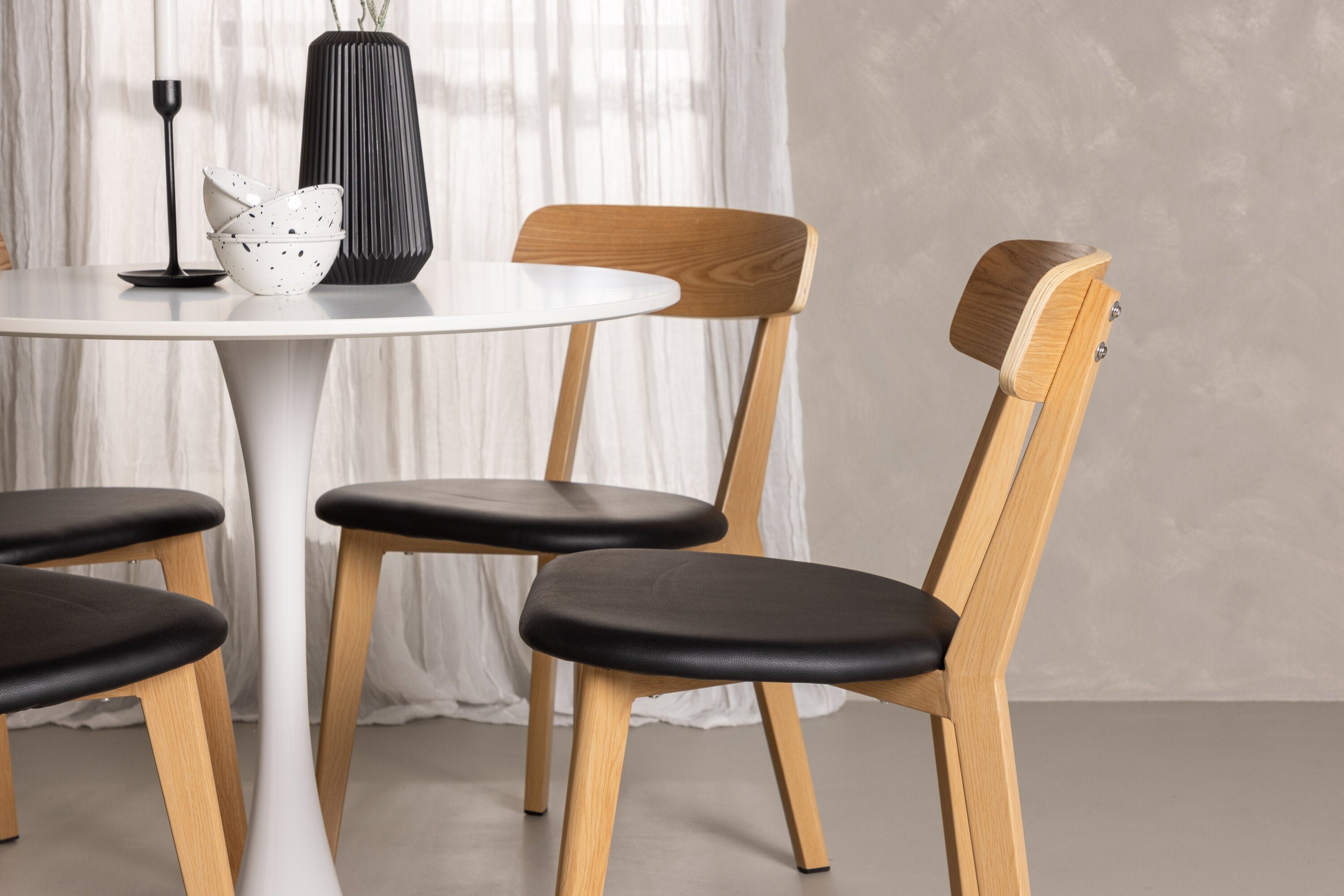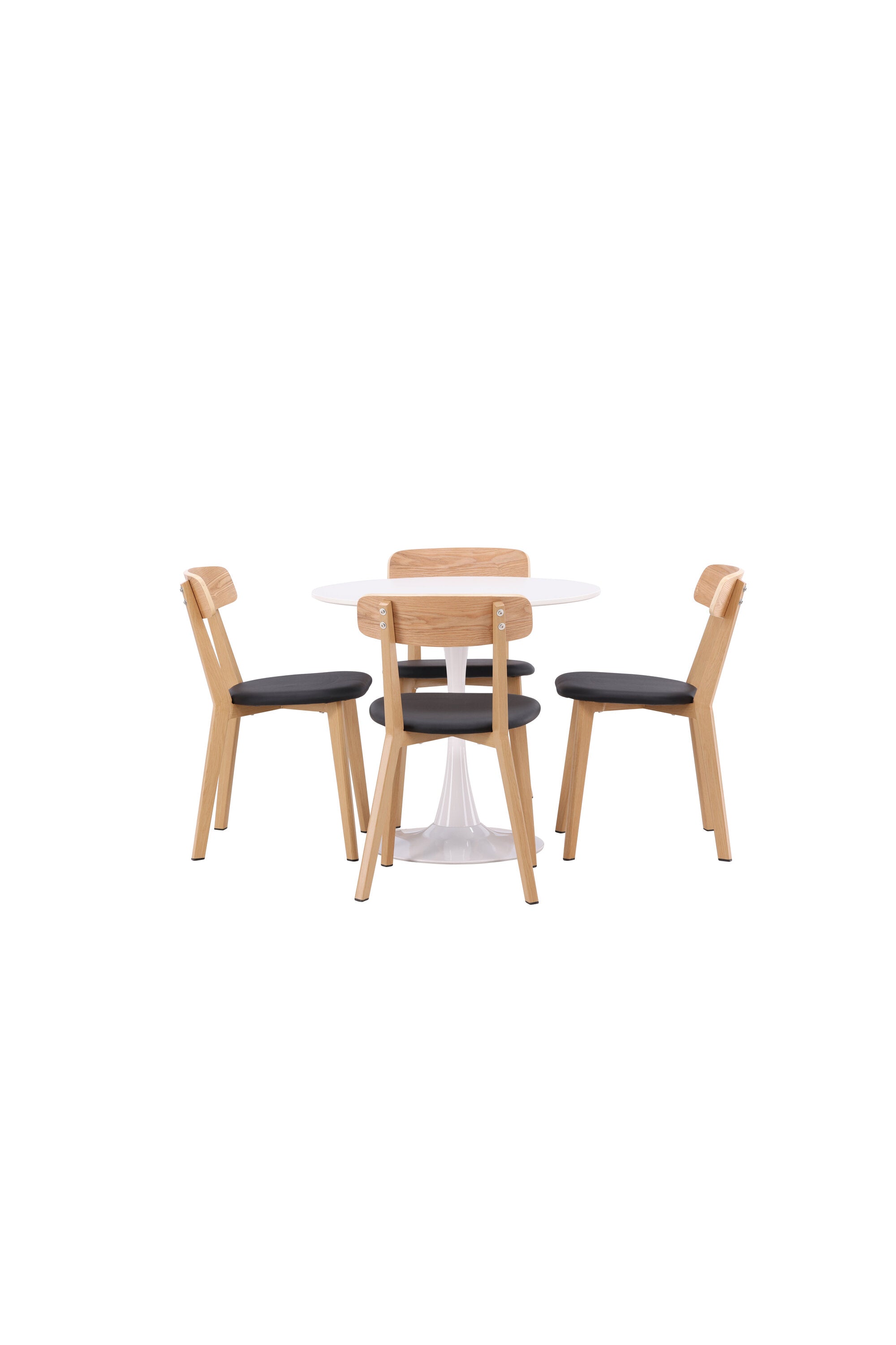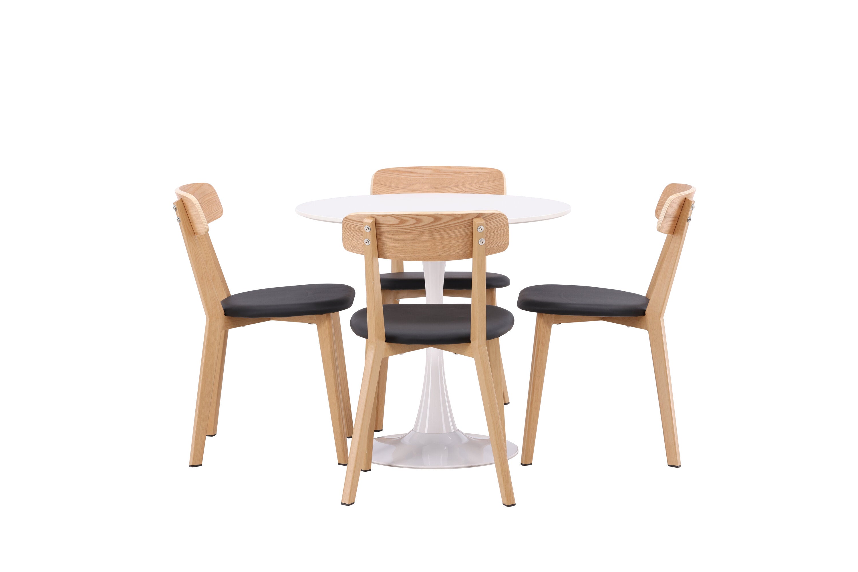Stůl Hamden stojí ve výšce 75 cm a má průměr 80 ​​cm, díky čemuž je kompaktní a všestranný. Bílá stolní deska poskytuje pocit lehkosti a svěžesti, zatímco židle Sanjos s rámem v přírodní barvě a černým sedákem nabízejí silný kontrast a přispívají k nadčasovému stylu.
