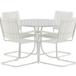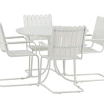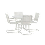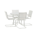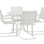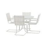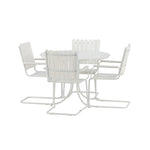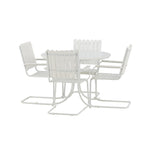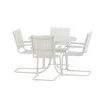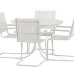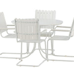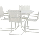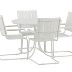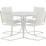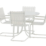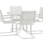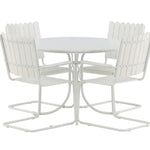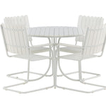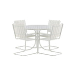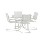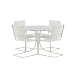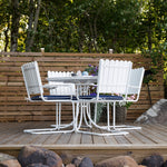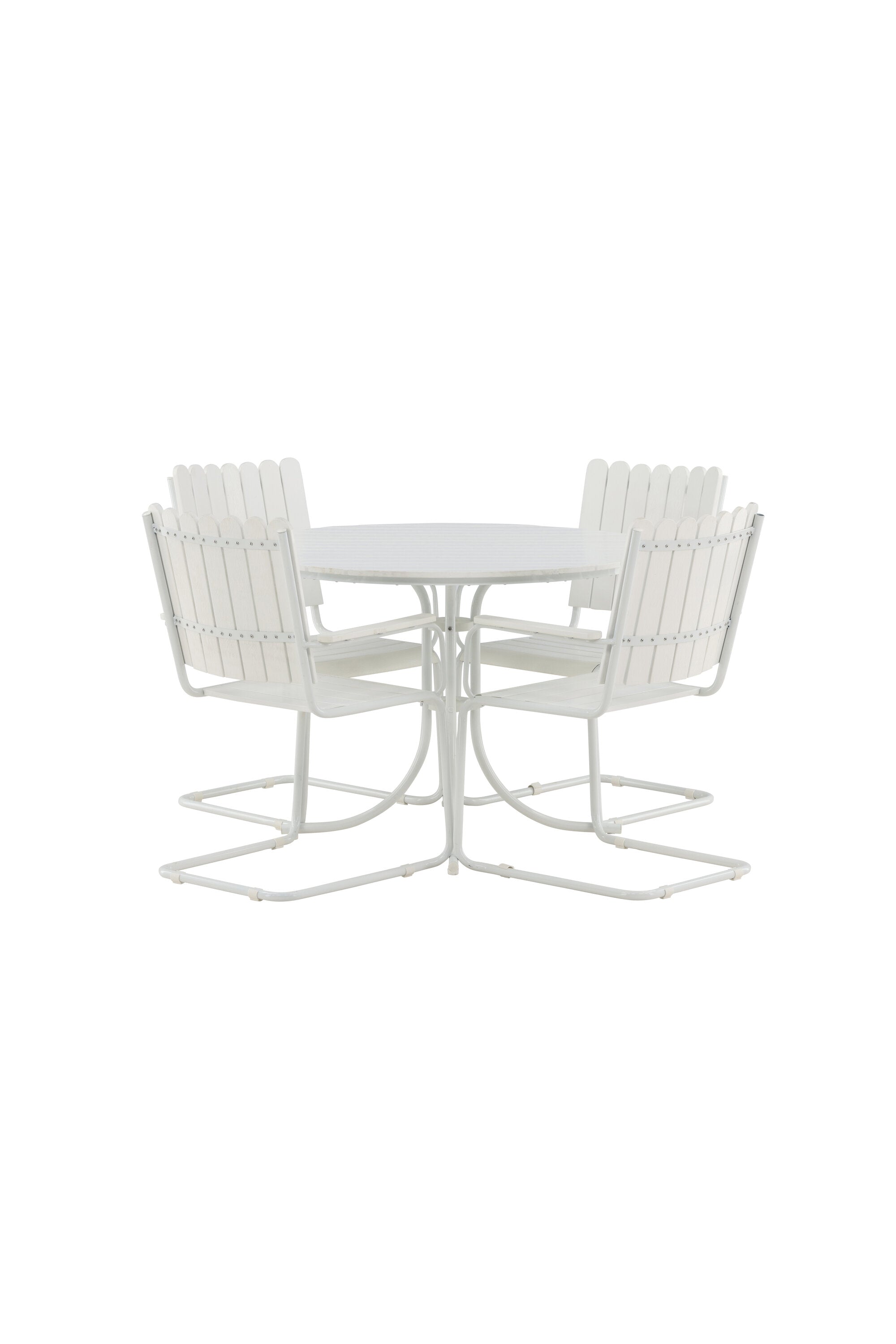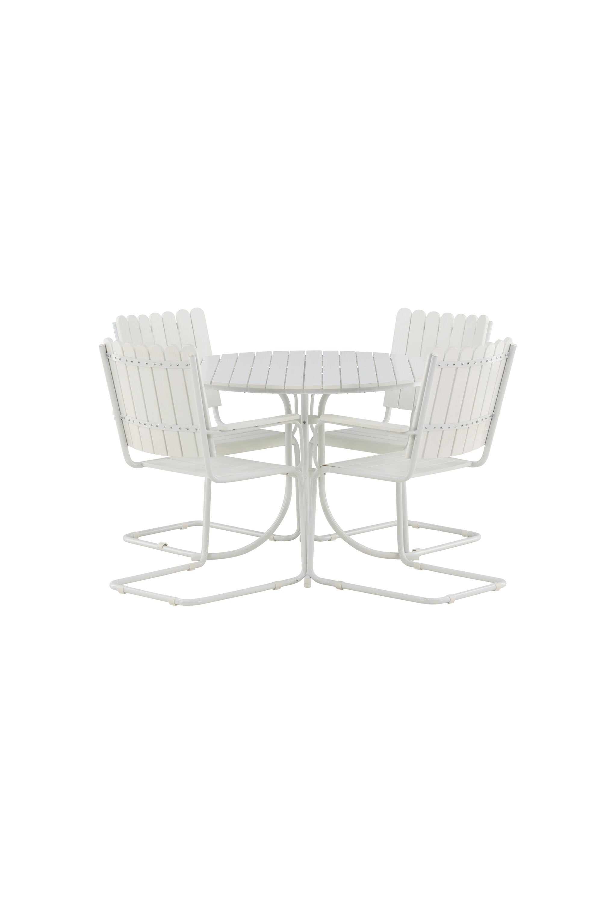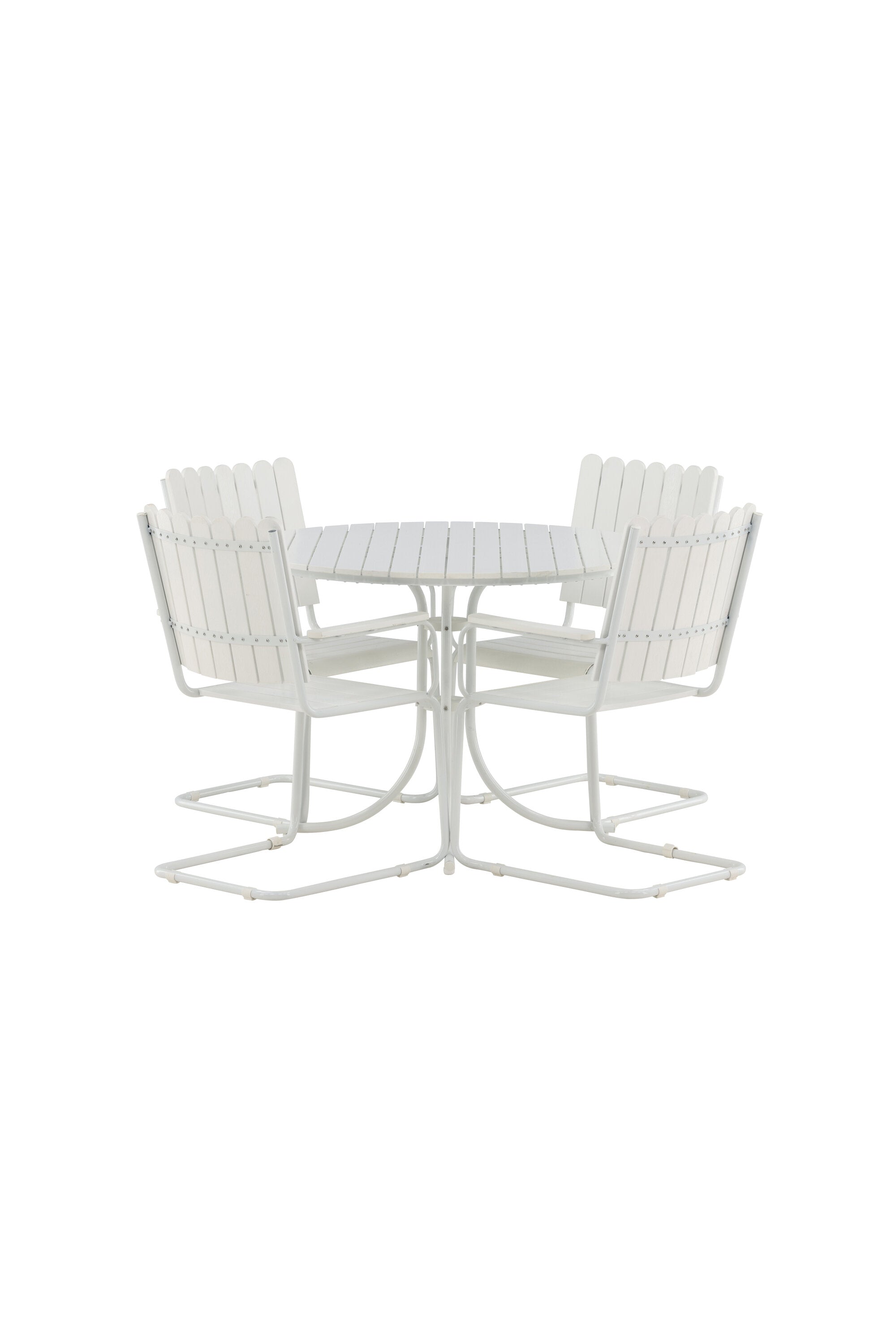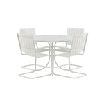 Skupina jídel s kulatým stolem a čtyřmi židlemi, které se snadno houpou. Materiály židlí a stolu jsou ocel a dřevo Aintwood.